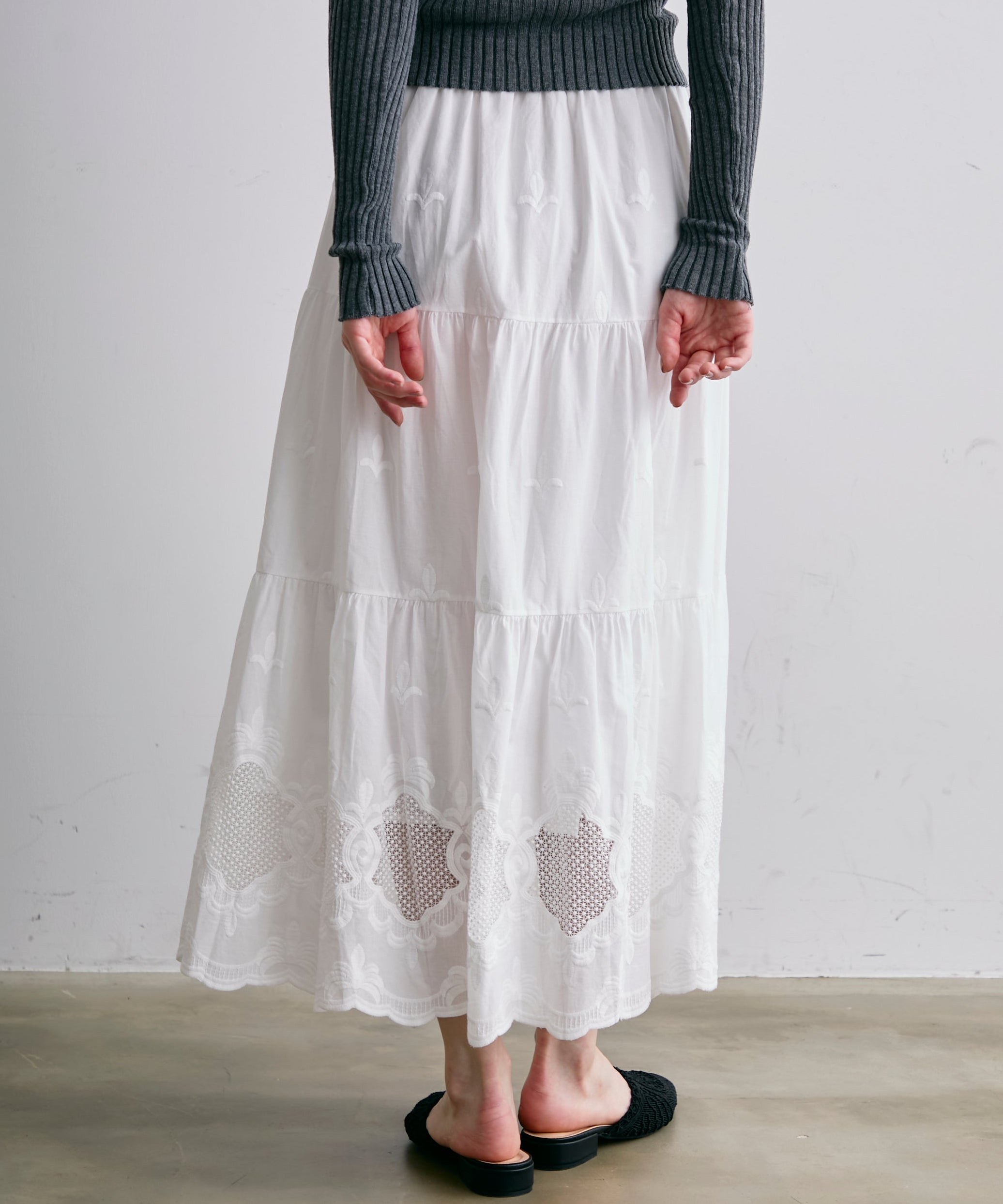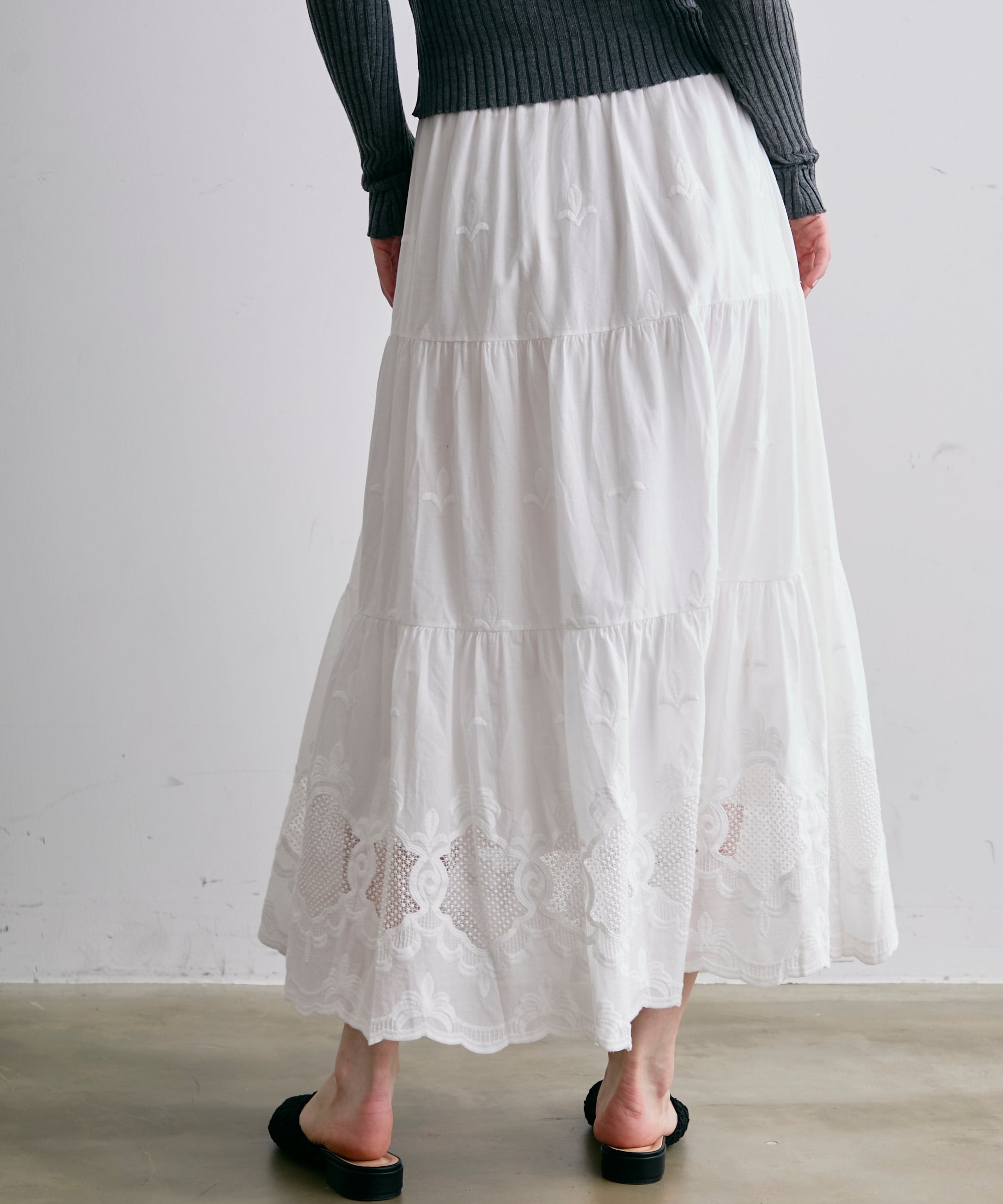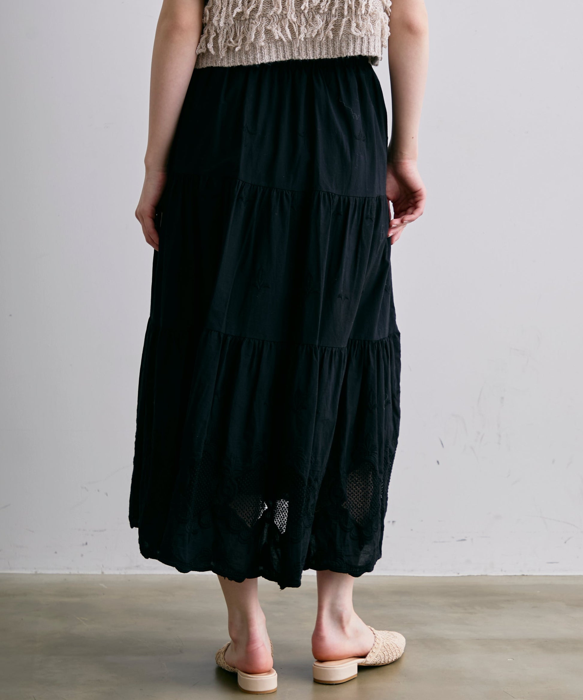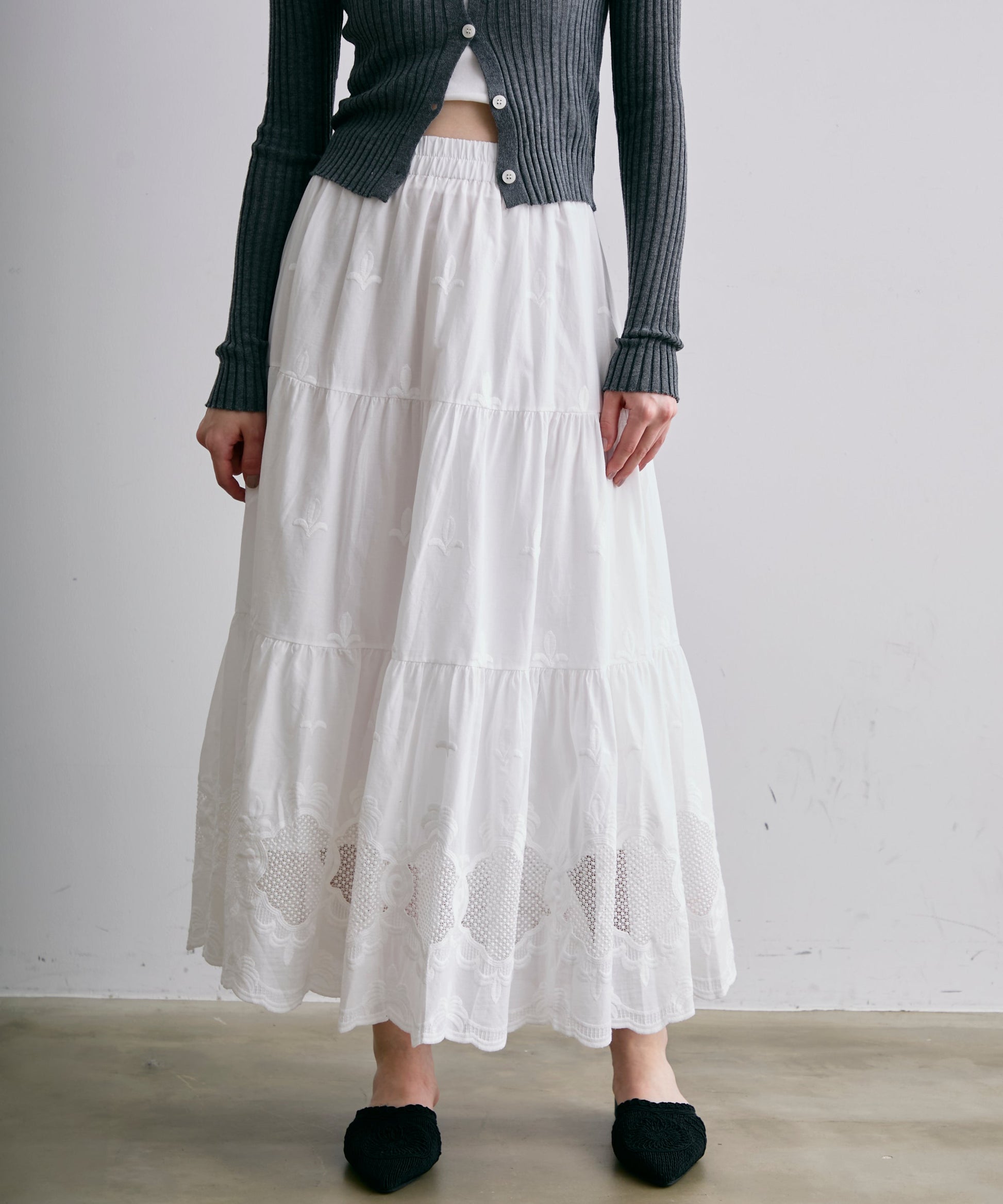 繊細なレース刺繍を贅沢にあしらったティアードロングスカート。