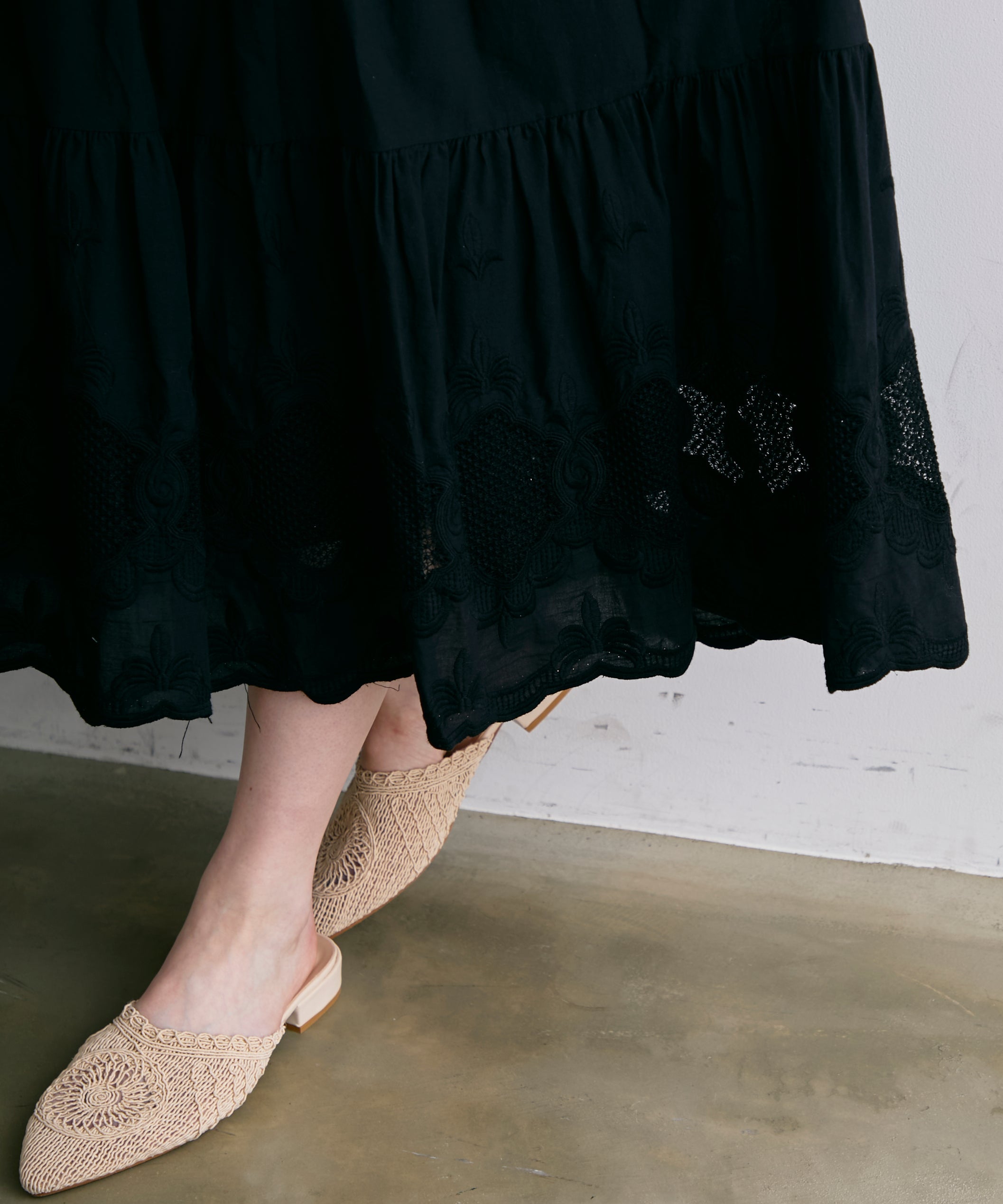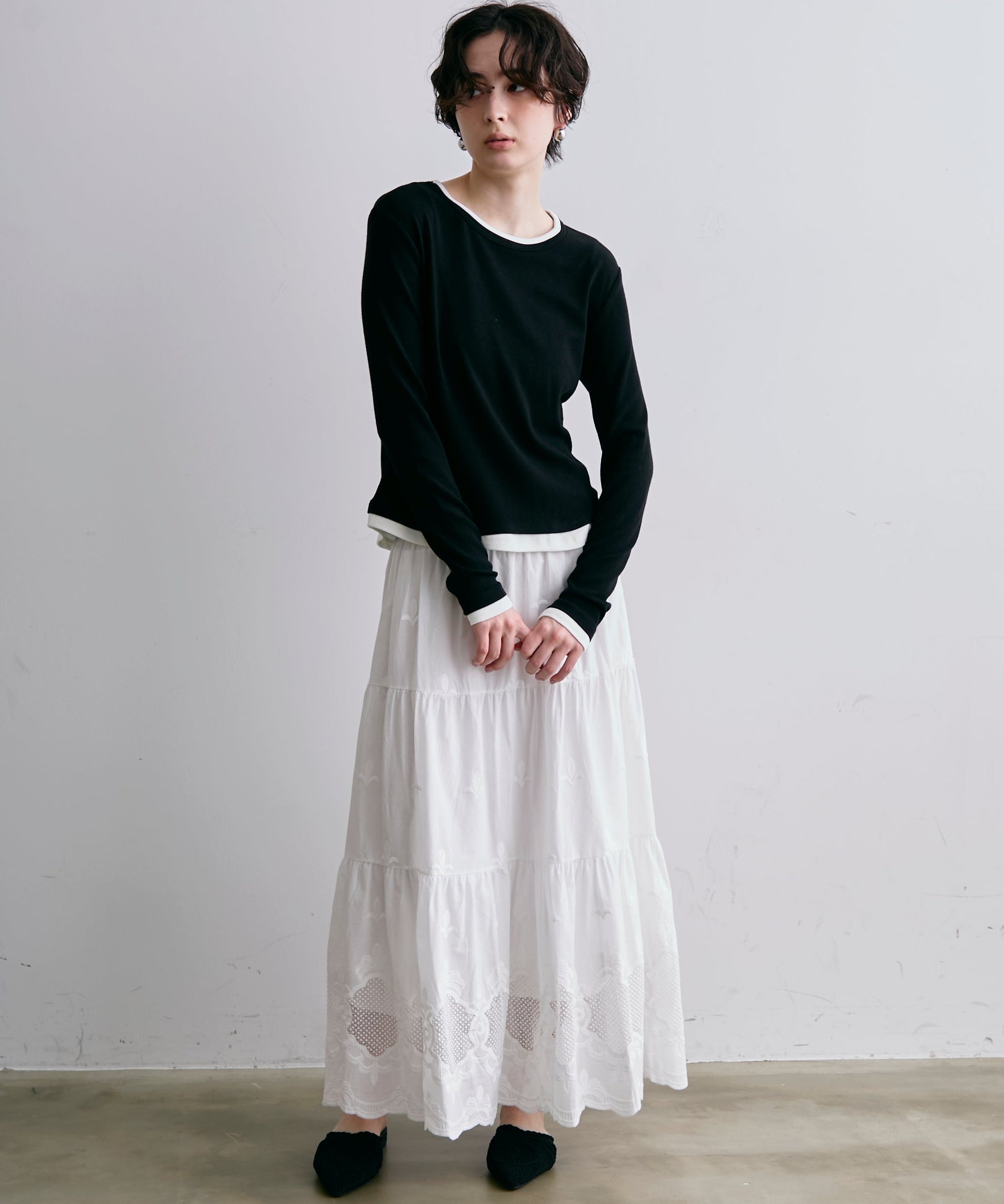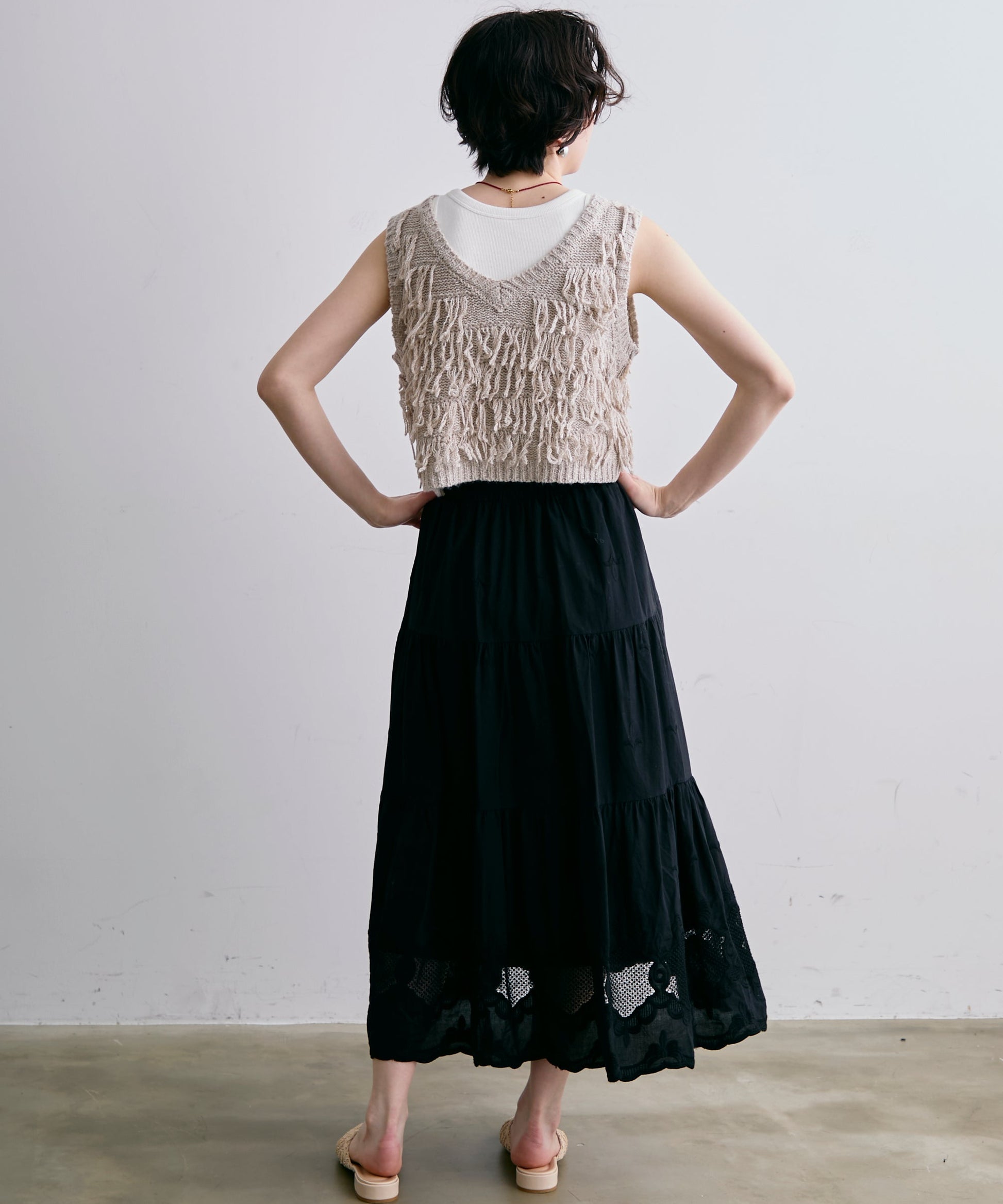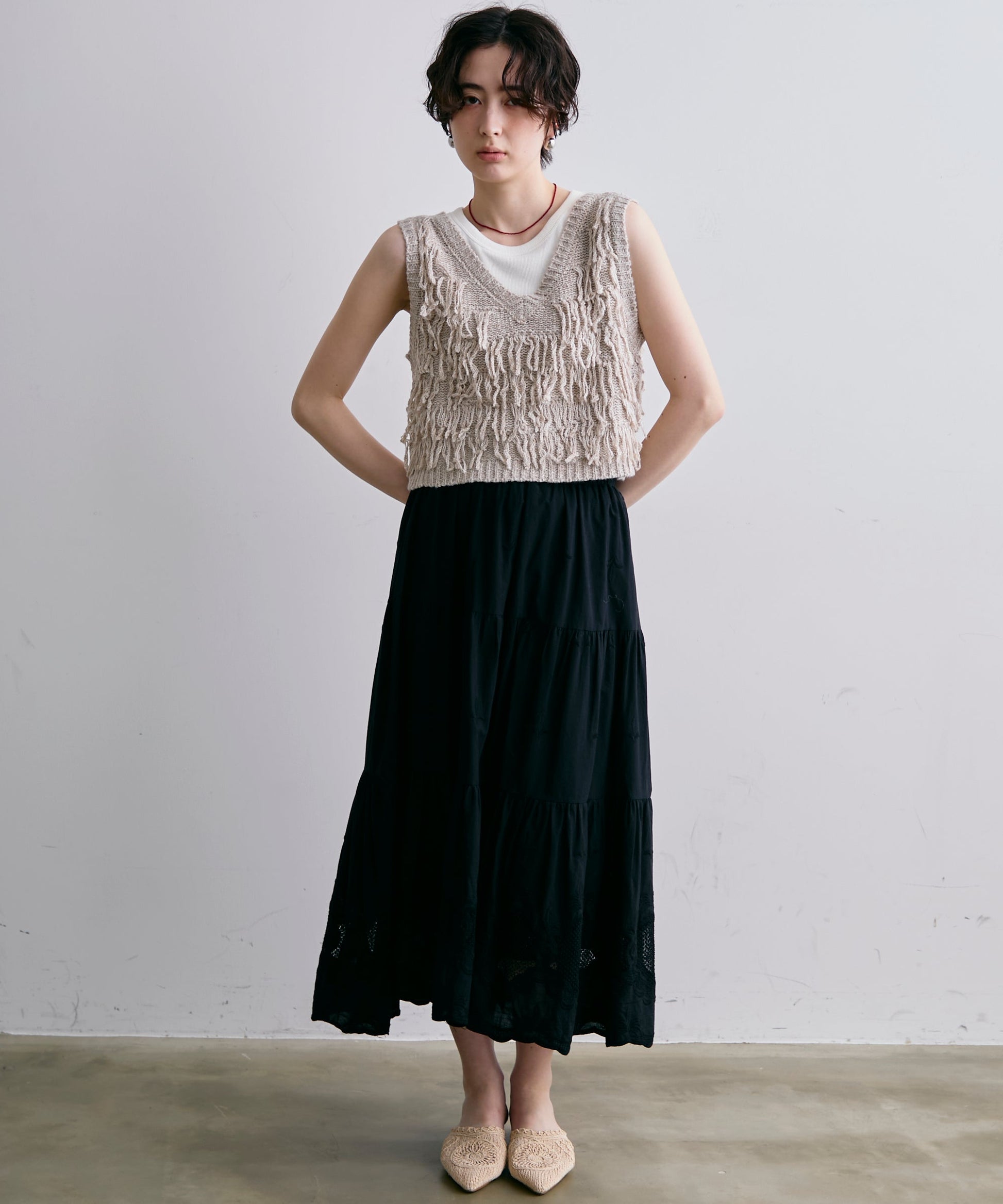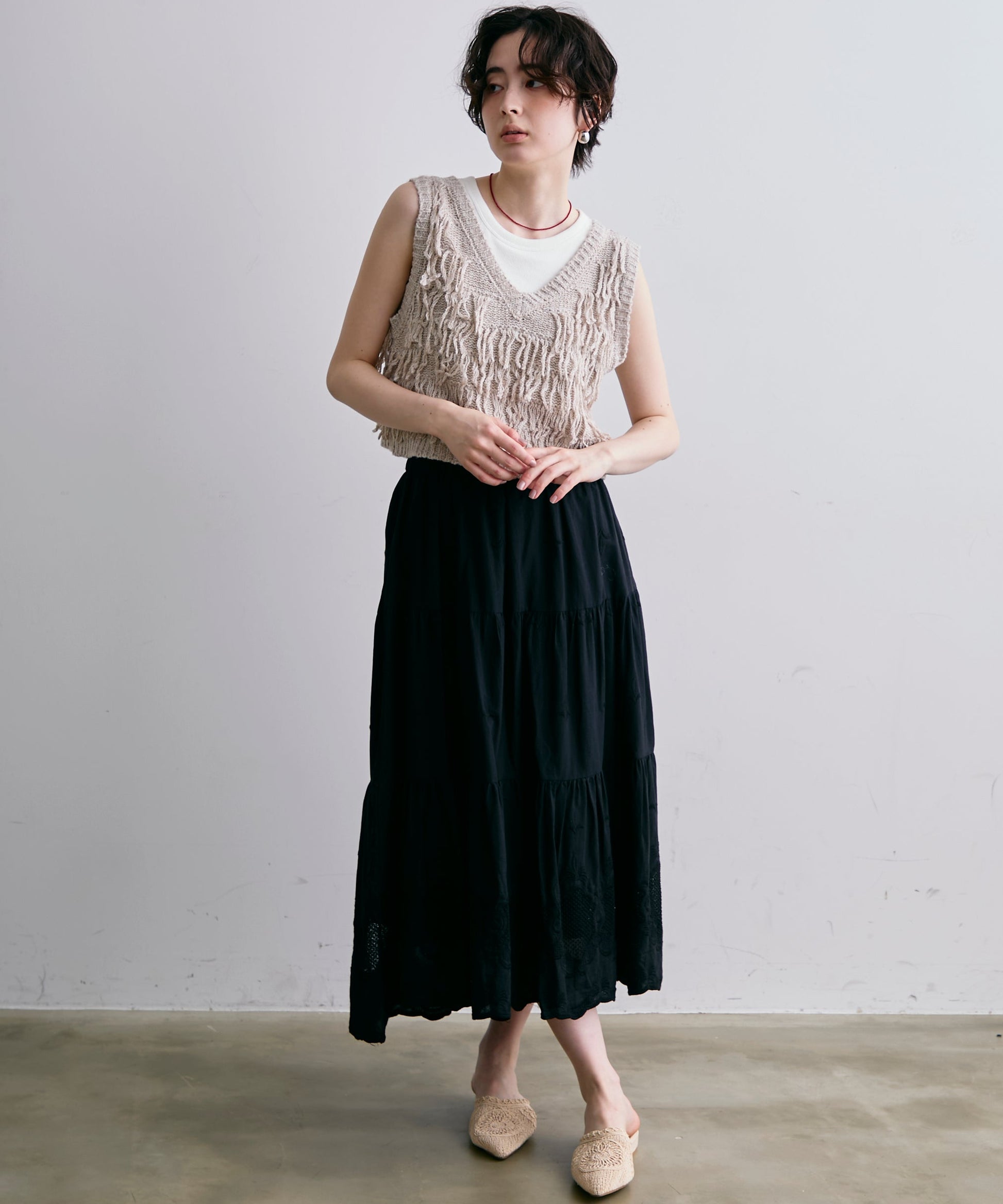 繊細なレース刺繍を贅沢にあしらったティアードロングスカート。