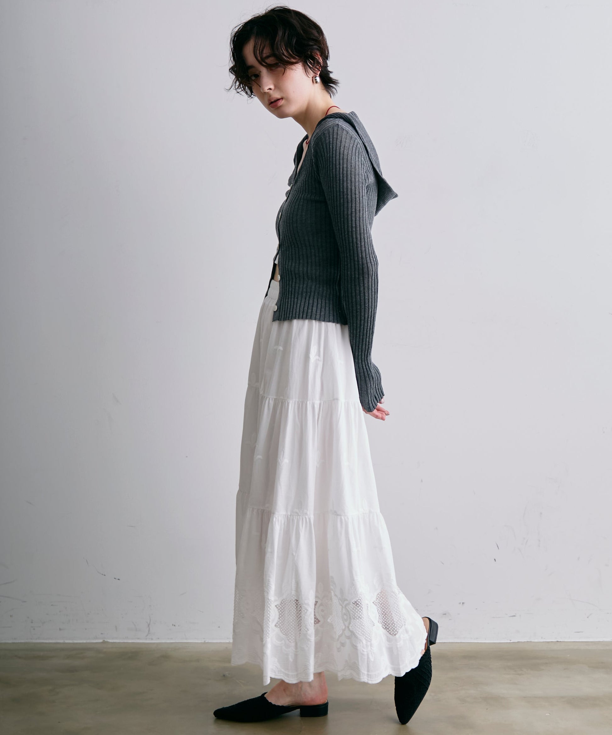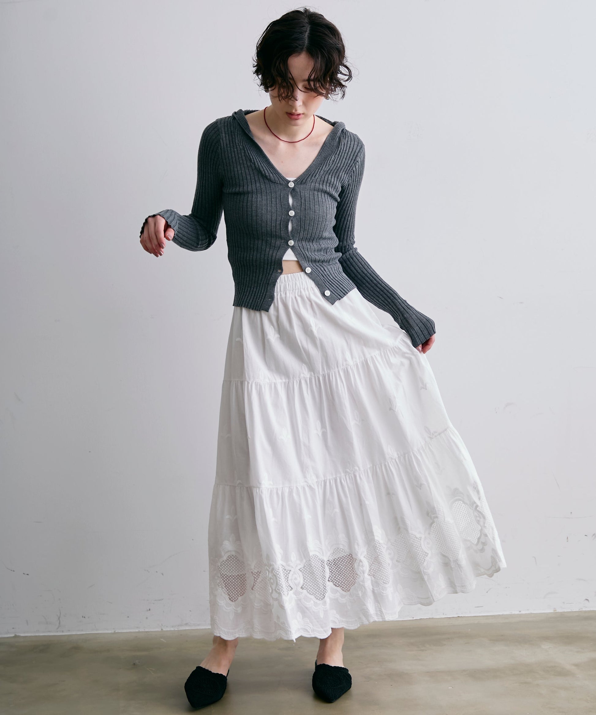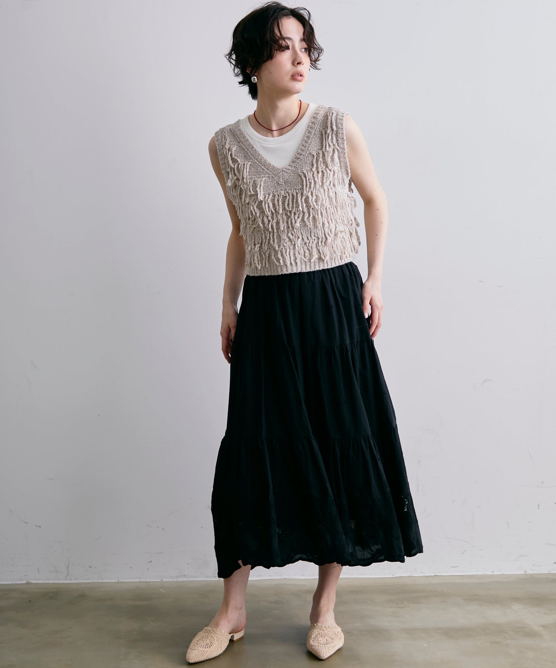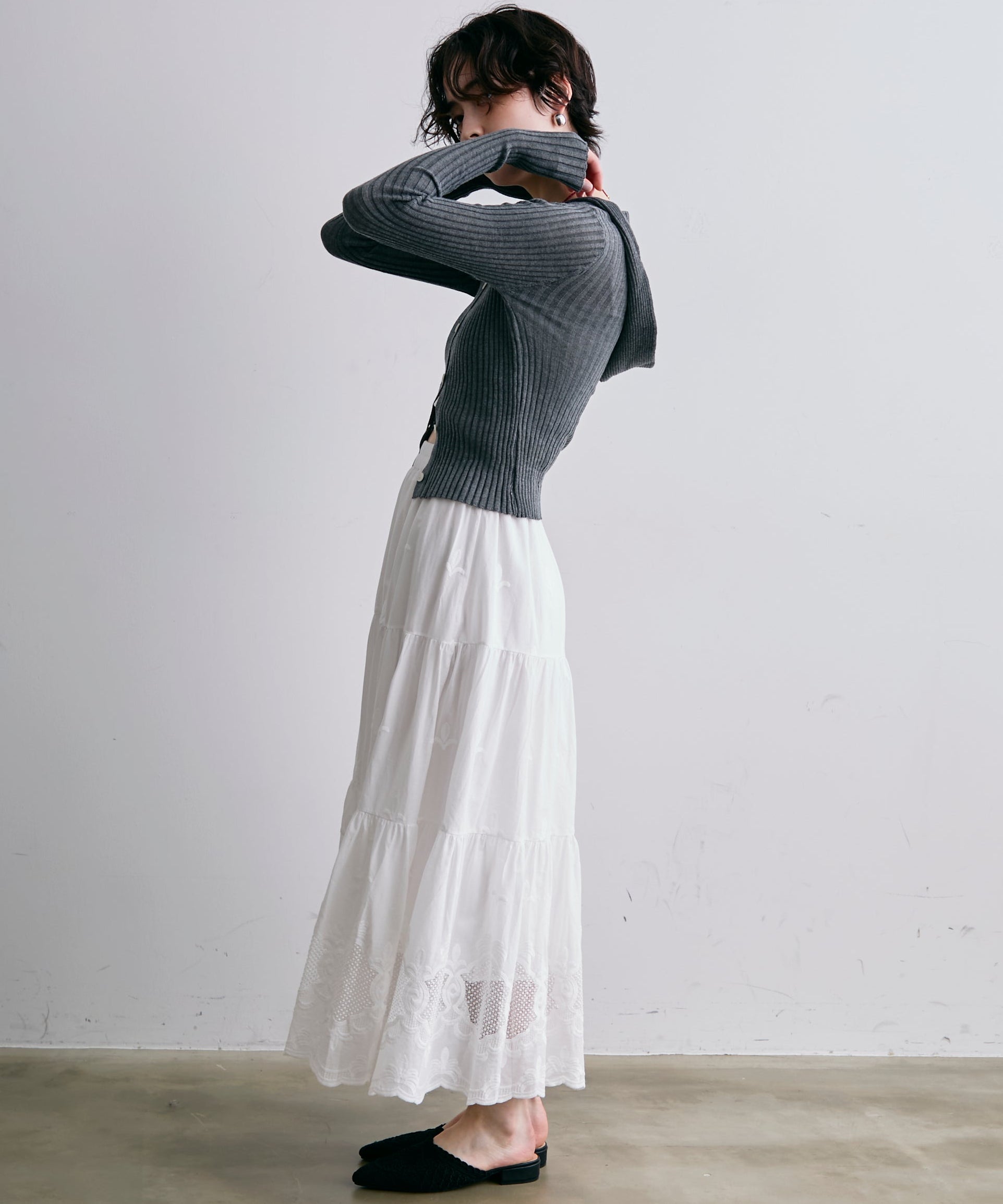 繊細なレース刺繍を贅沢にあしらったティアードロングスカート。