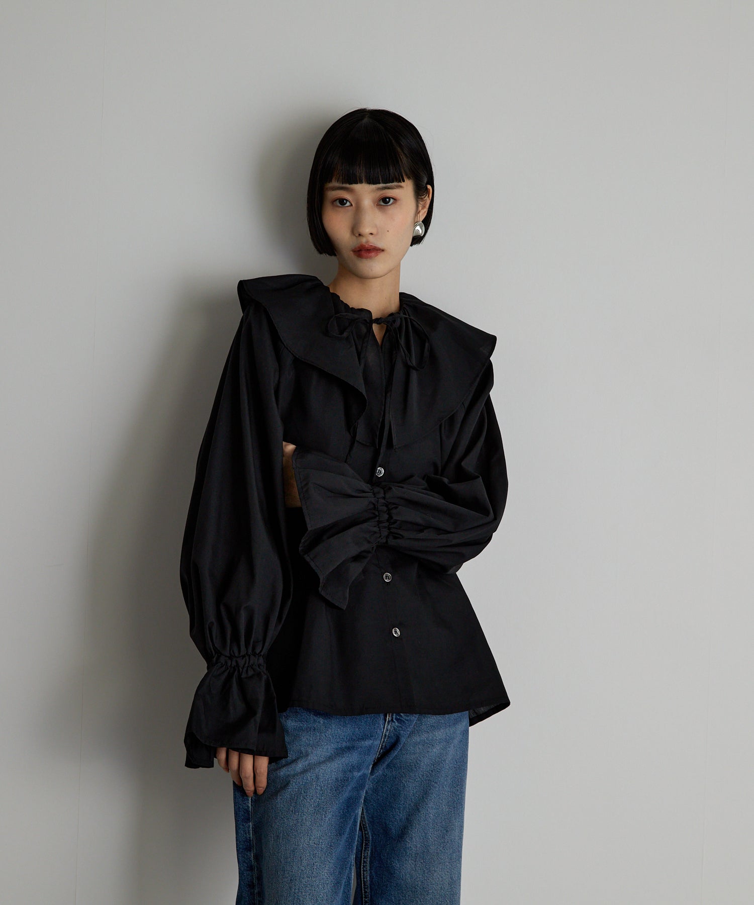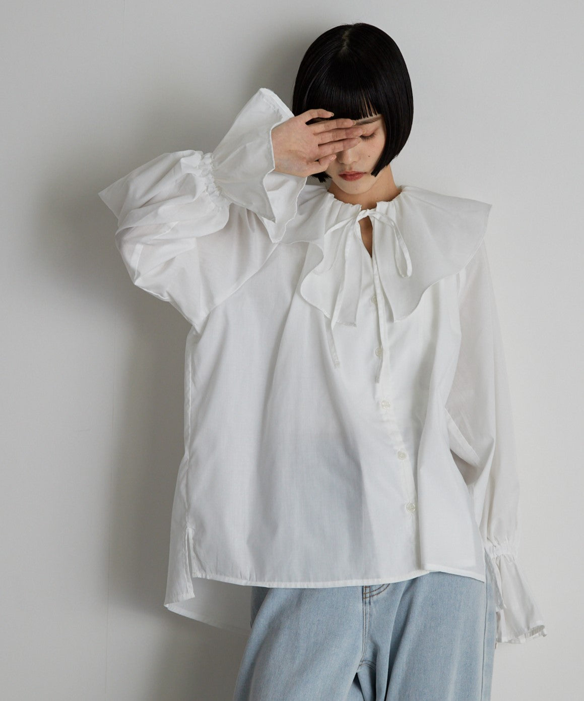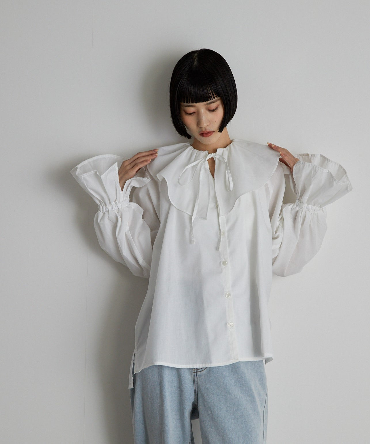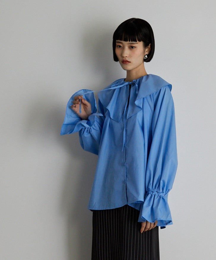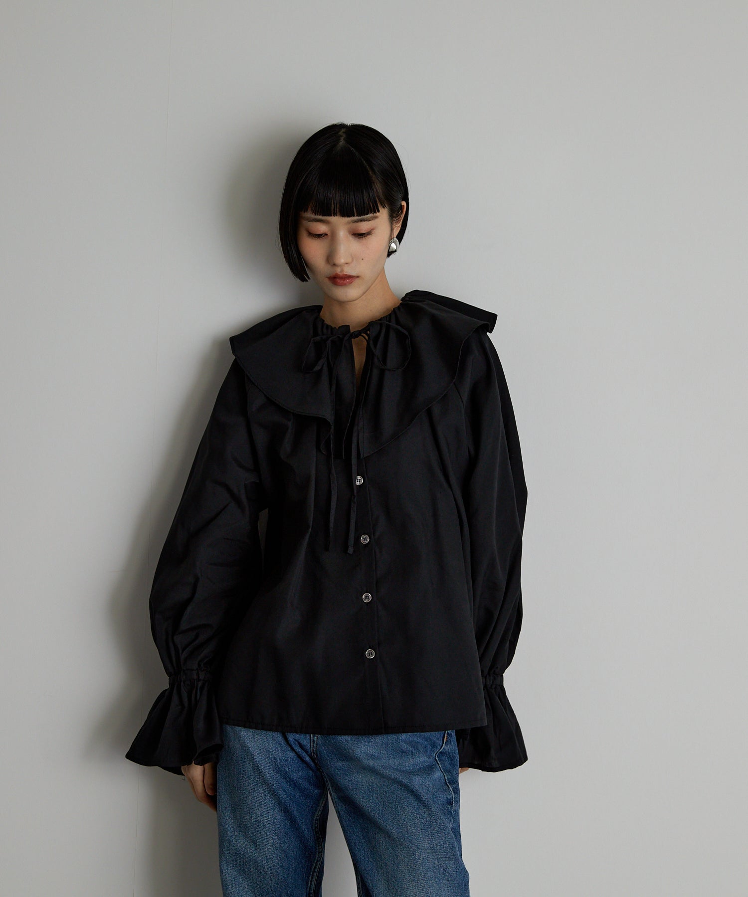 大きな襟のフリルとリボンタイが特徴的で、クラシカルかつフェミニンな雰囲気を演出しています。ボリュームのある袖口もポイントで、全体的に軽やかで華やかな印象を与えています。アウター、ニットなどのアイテムとのレイヤード使いにも◎