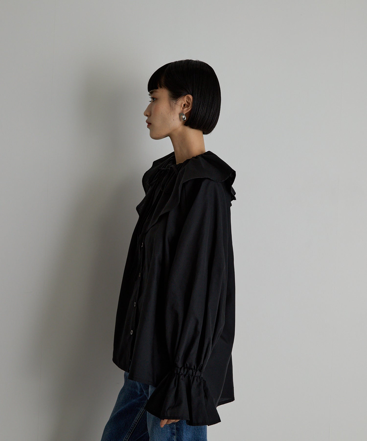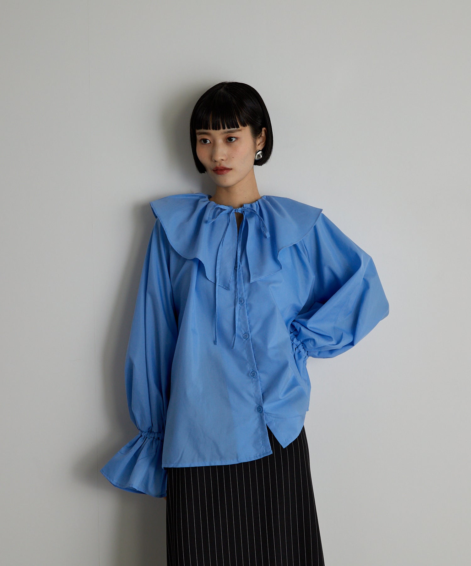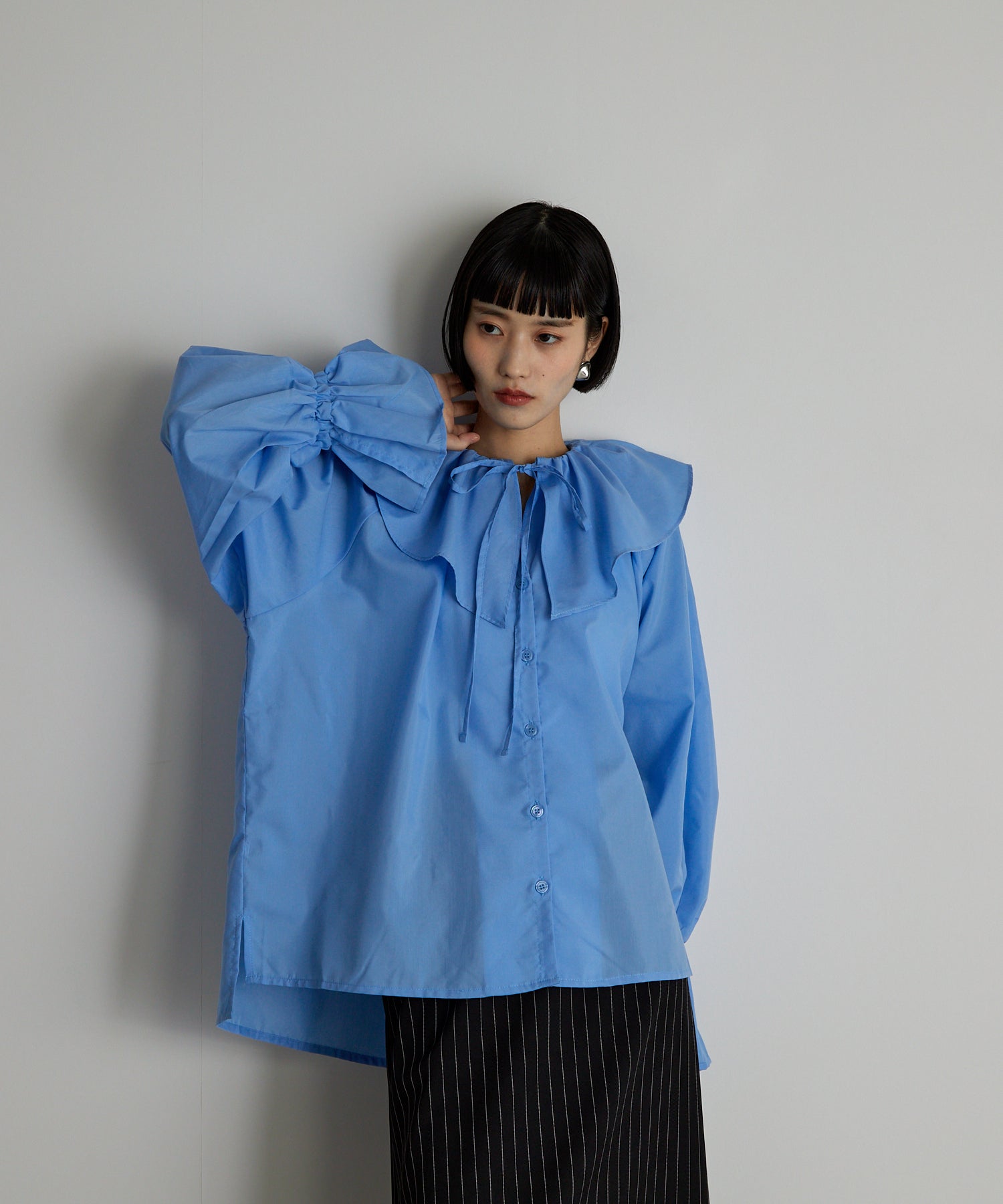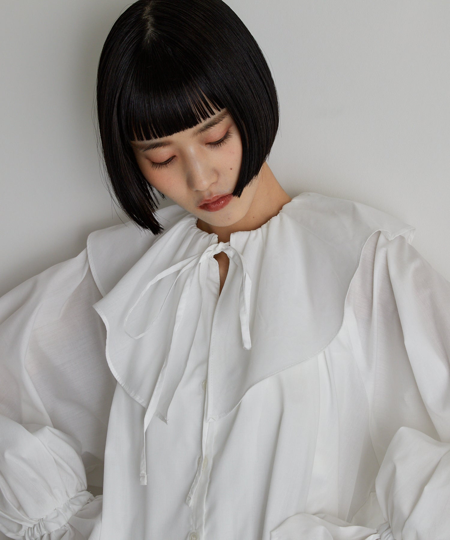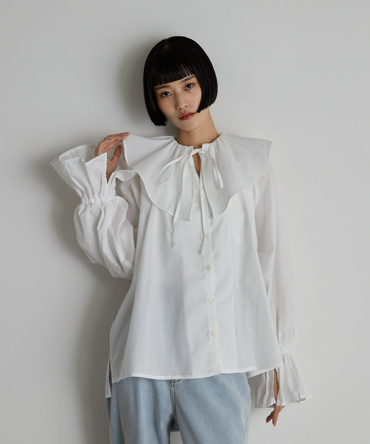 大きな襟のフリルとリボンタイが特徴的で、クラシカルかつフェミニンな雰囲気を演出しています。ボリュームのある袖口もポイントで、全体的に軽やかで華やかな印象を与えています。アウター、ニットなどのアイテムとのレイヤード使いにも◎