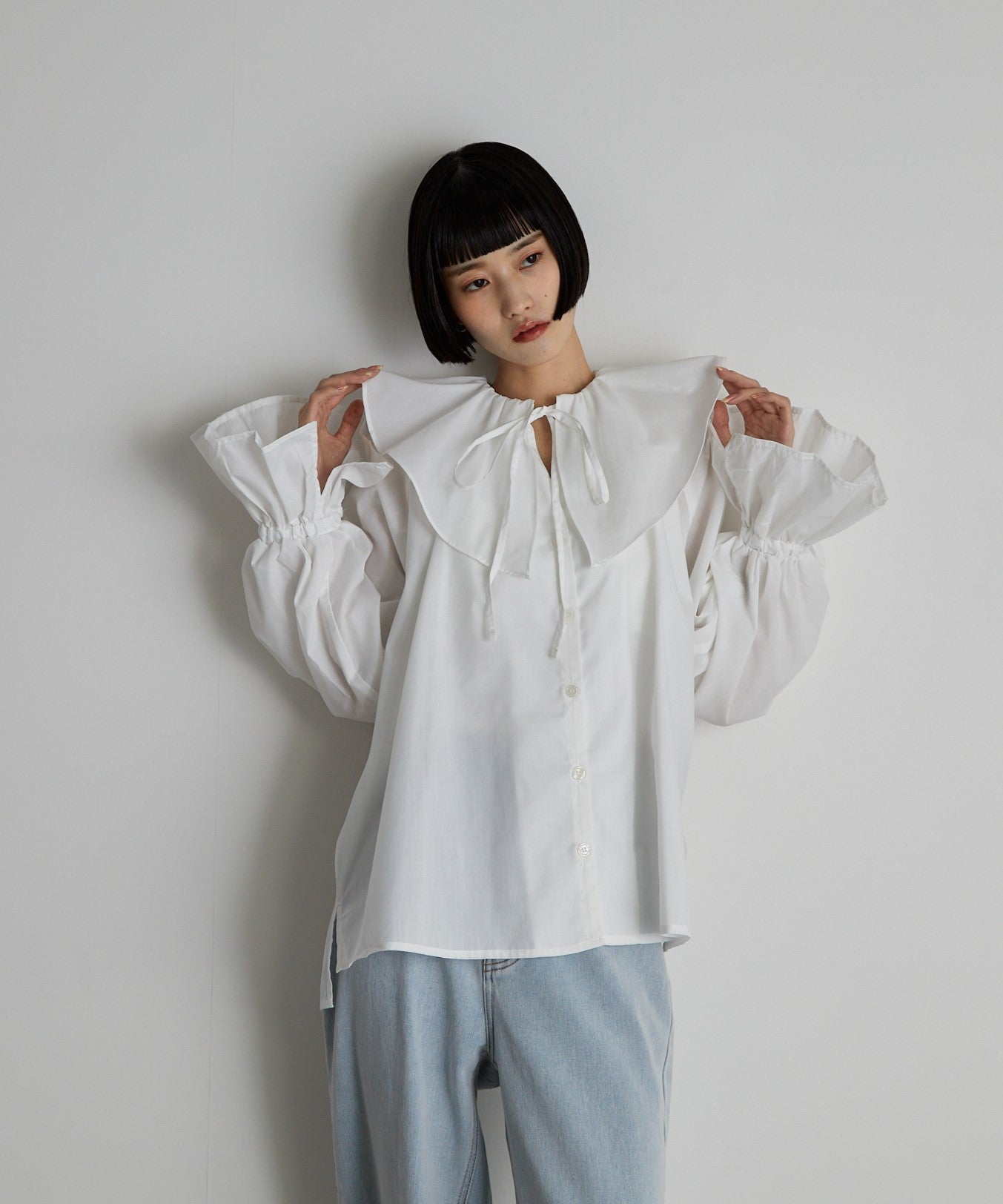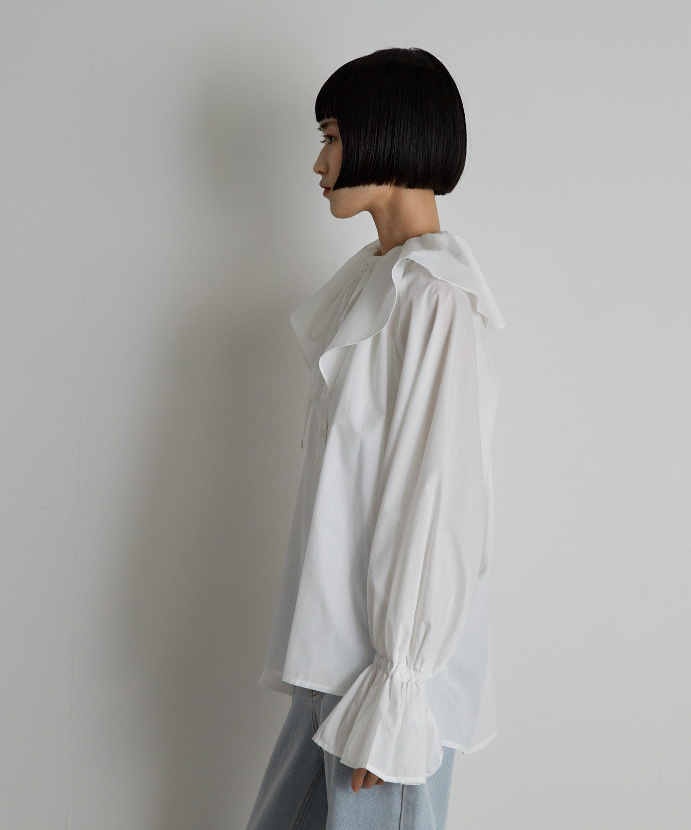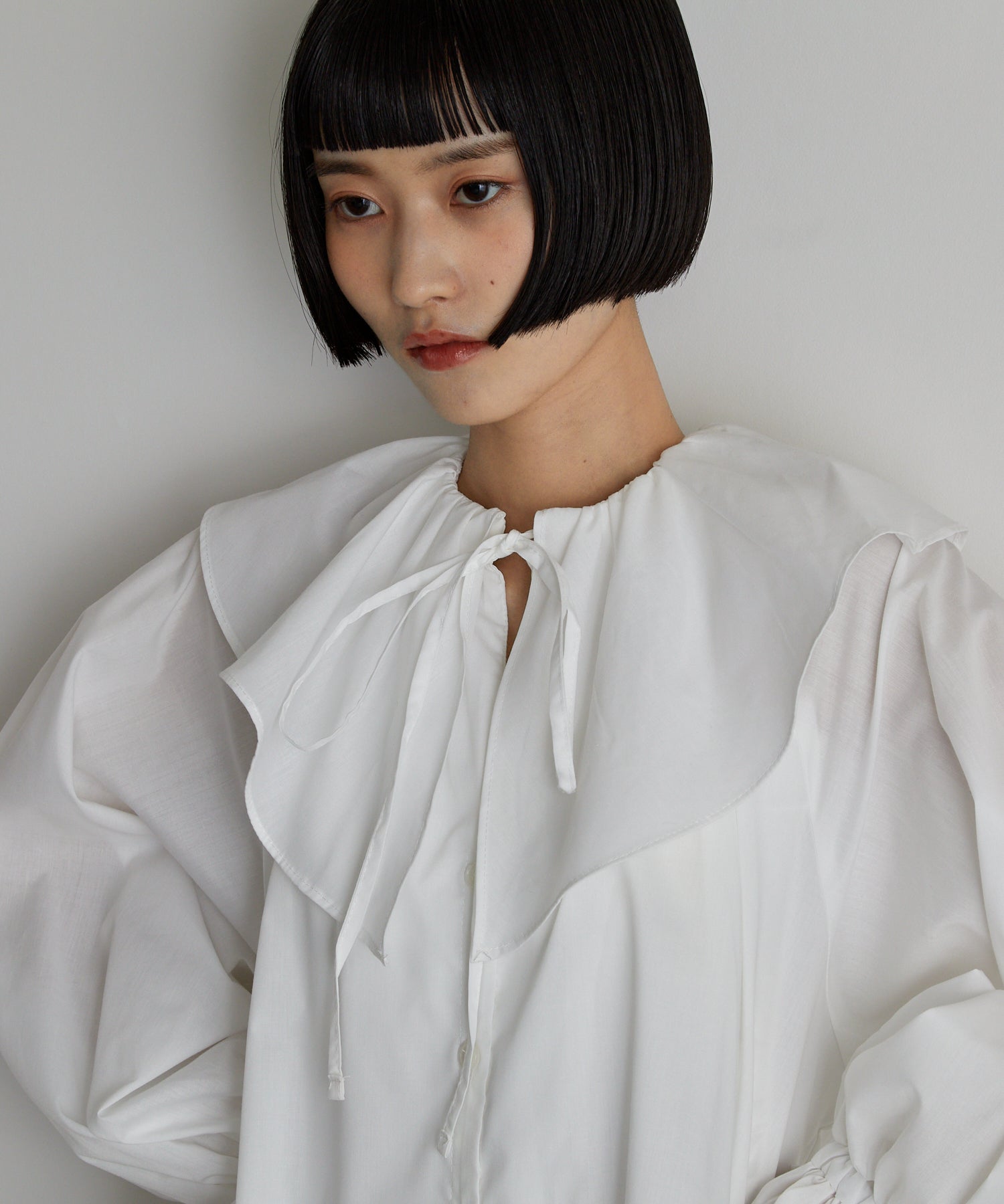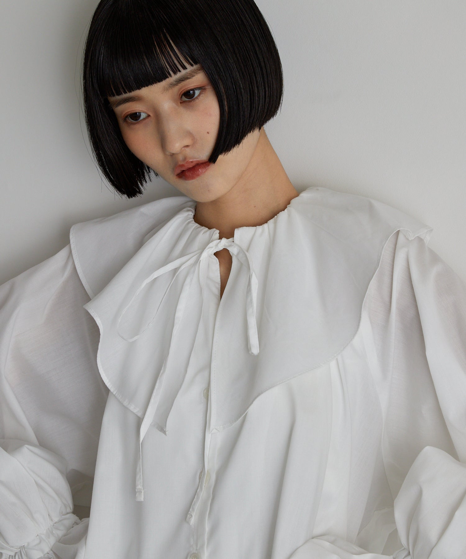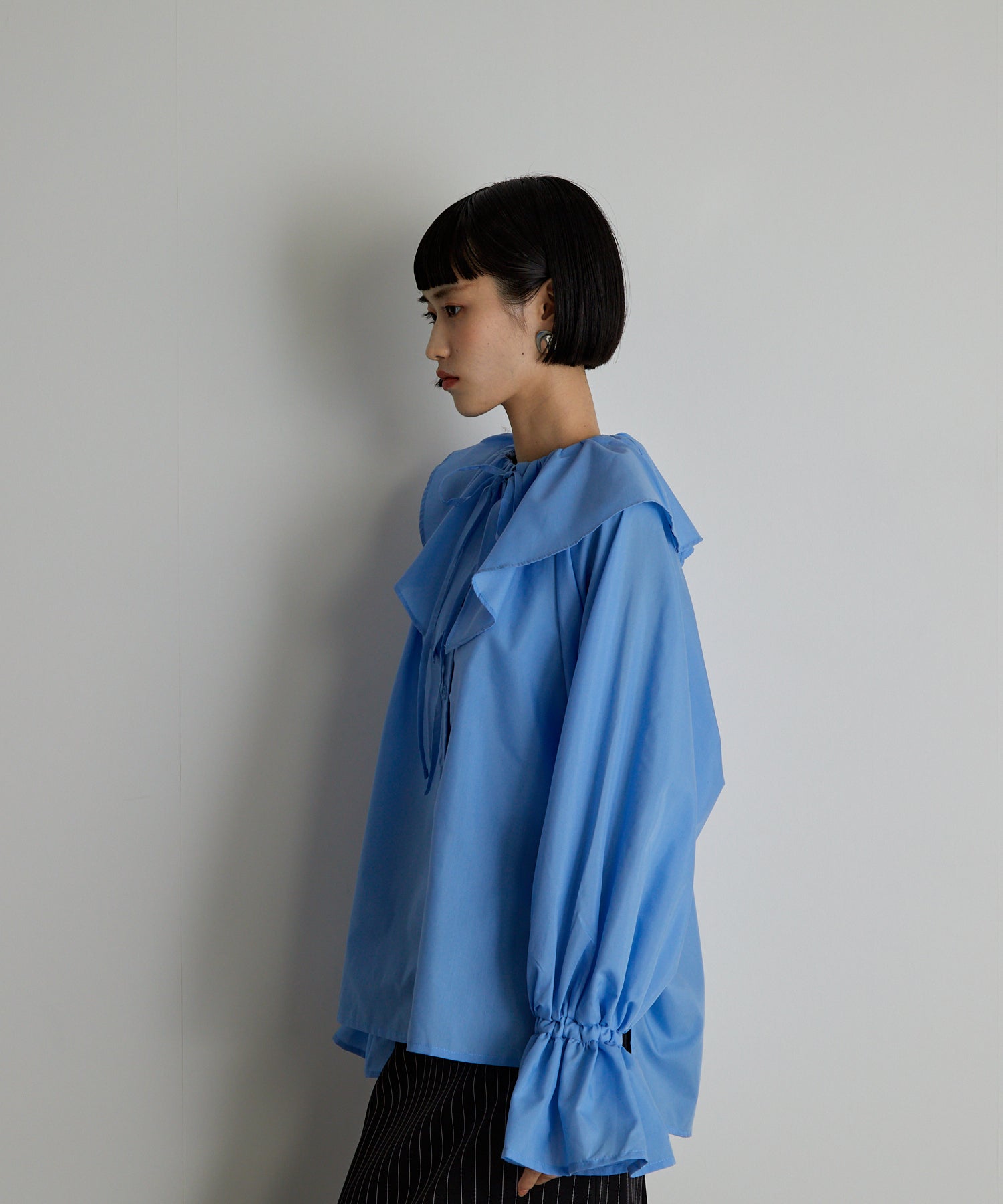 大きな襟のフリルとリボンタイが特徴的で、クラシカルかつフェミニンな雰囲気を演出しています。ボリュームのある袖口もポイントで、全体的に軽やかで華やかな印象を与えています。アウター、ニットなどのアイテムとのレイヤード使いにも◎