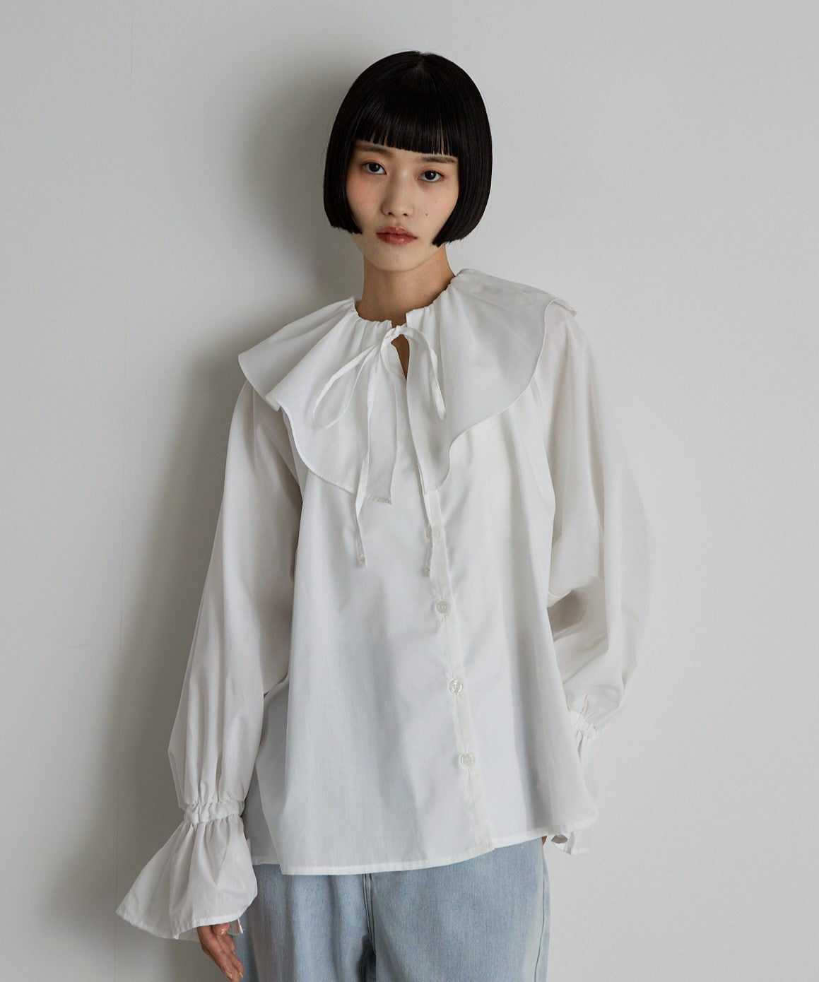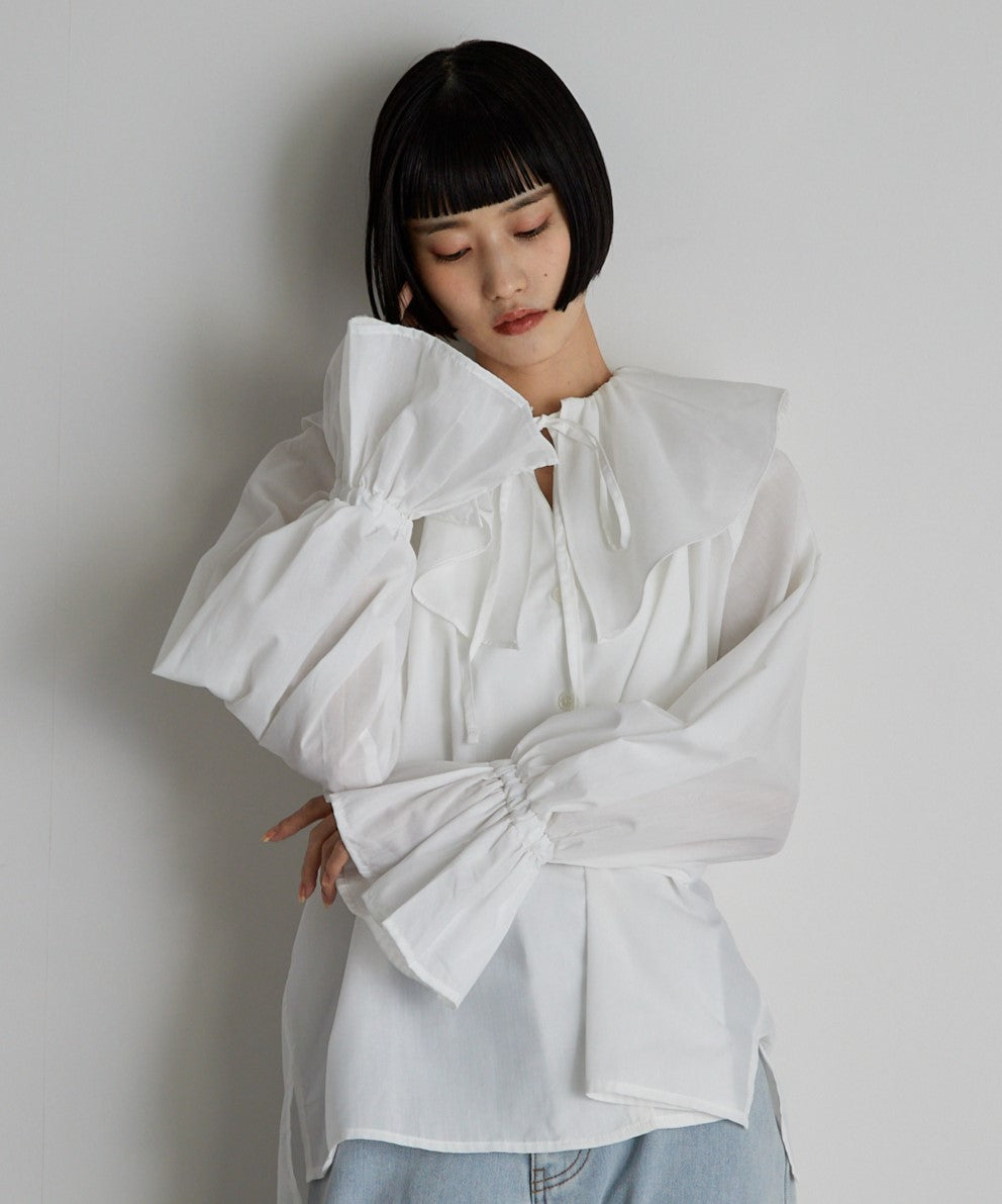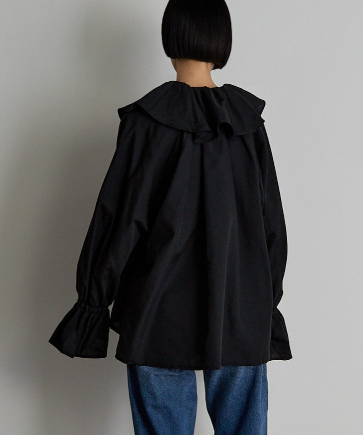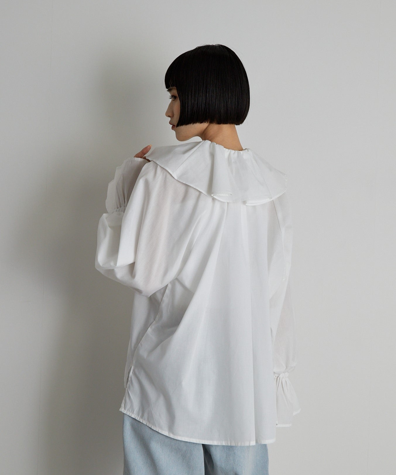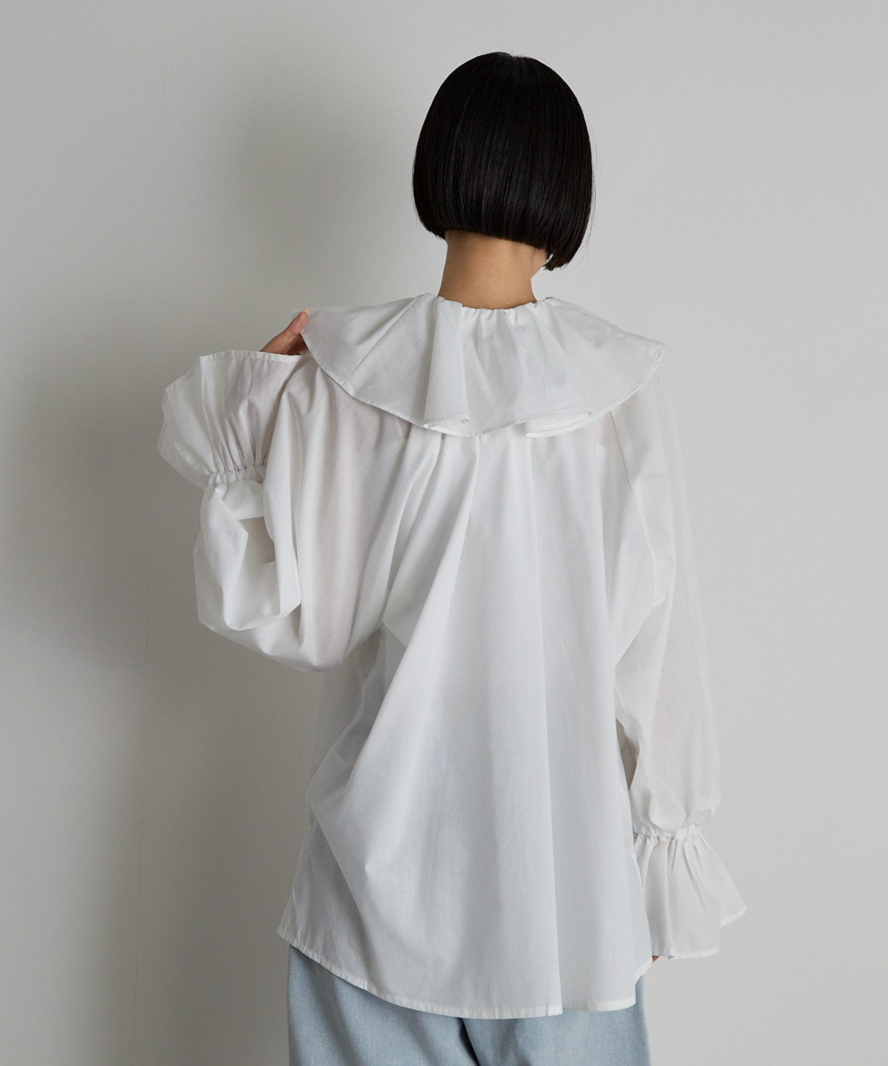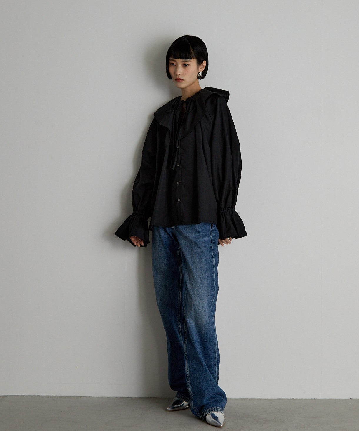 大きな襟のフリルとリボンタイが特徴的で、クラシカルかつフェミニンな雰囲気を演出しています。ボリュームのある袖口もポイントで、全体的に軽やかで華やかな印象を与えています。アウター、ニットなどのアイテムとのレイヤード使いにも◎