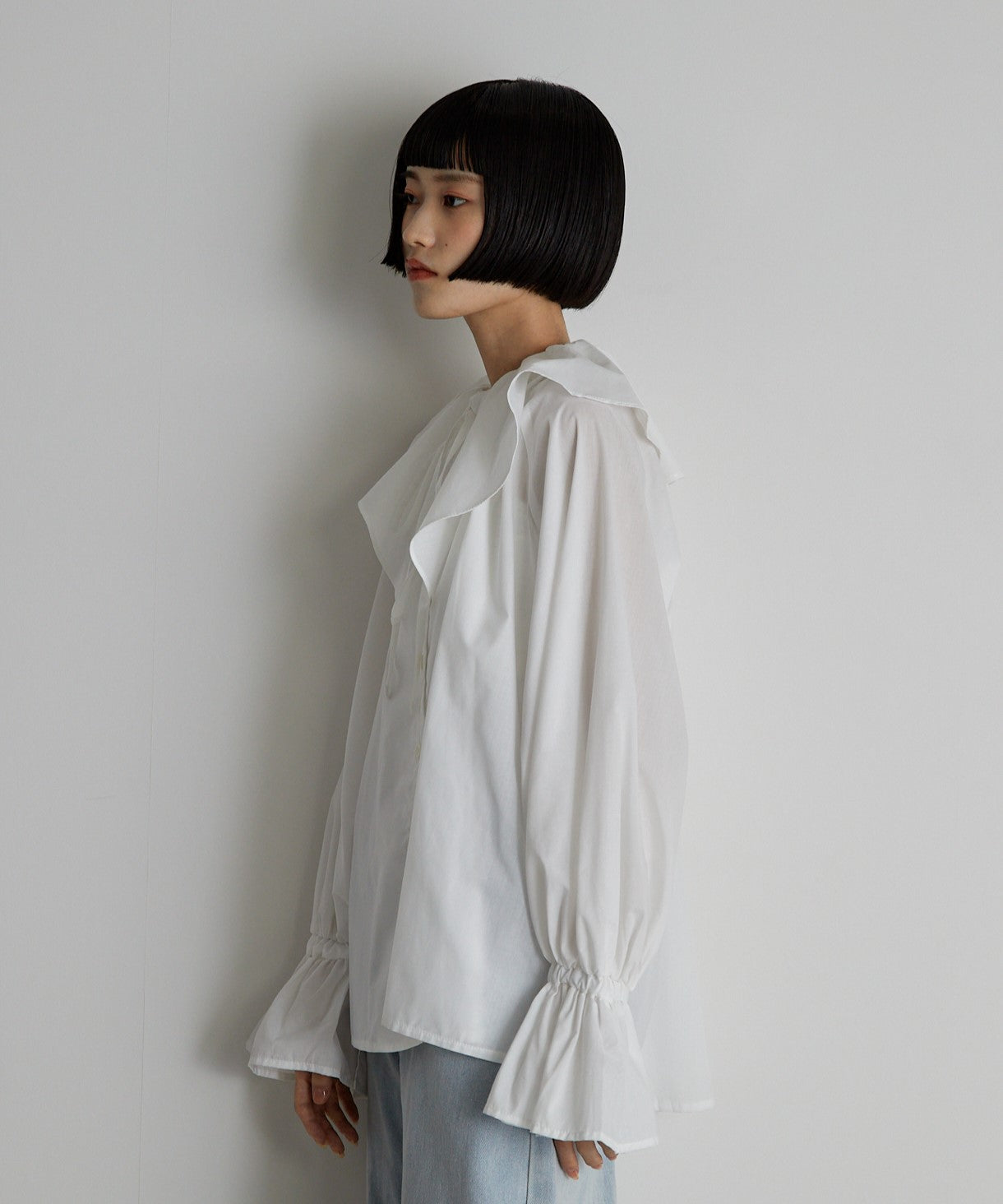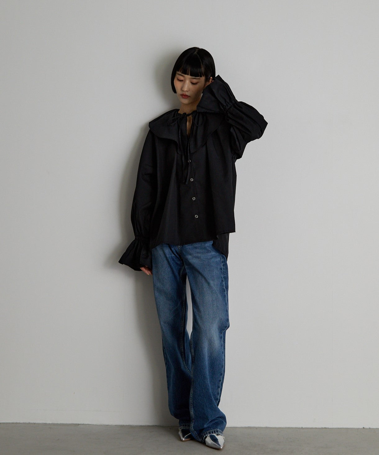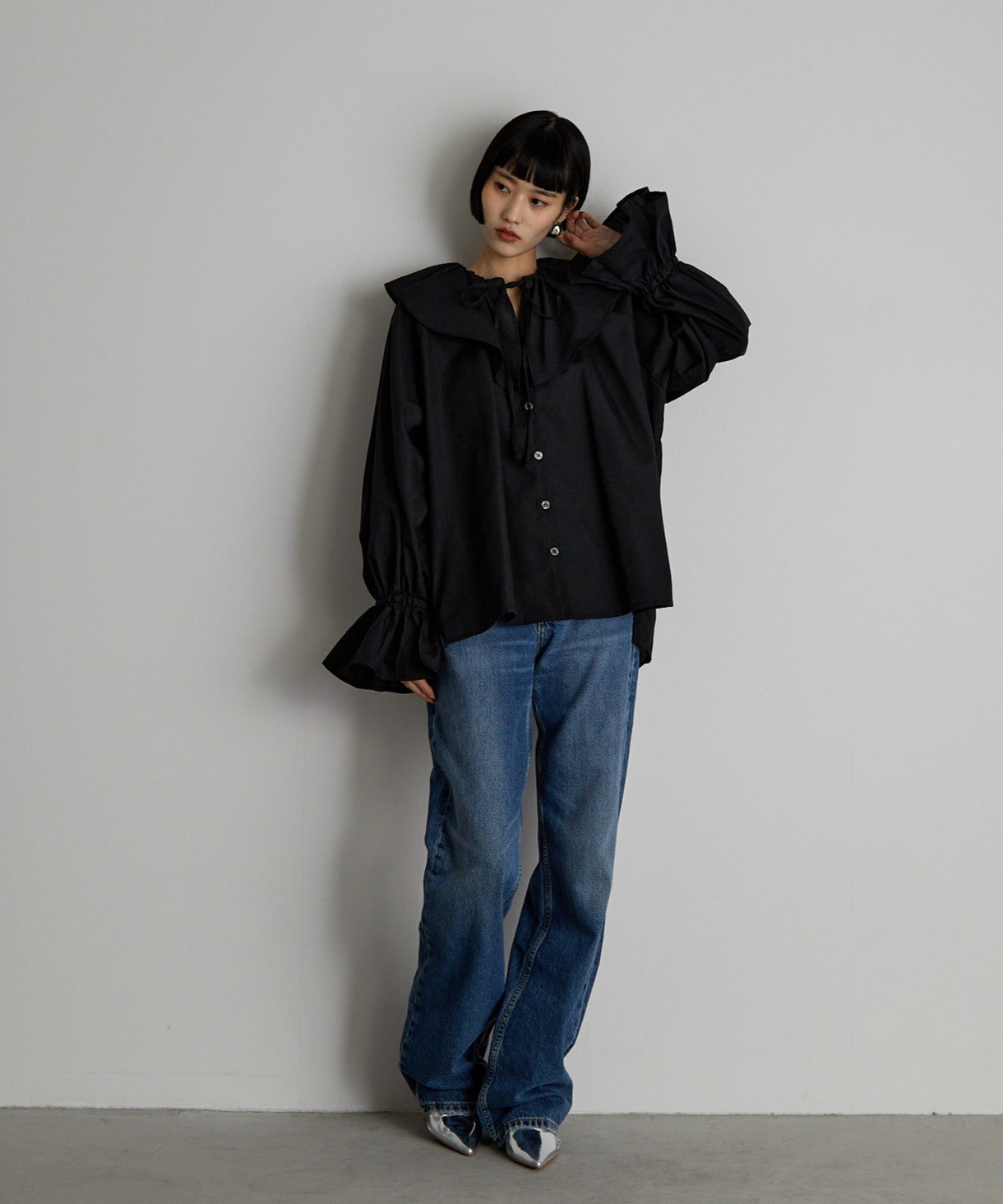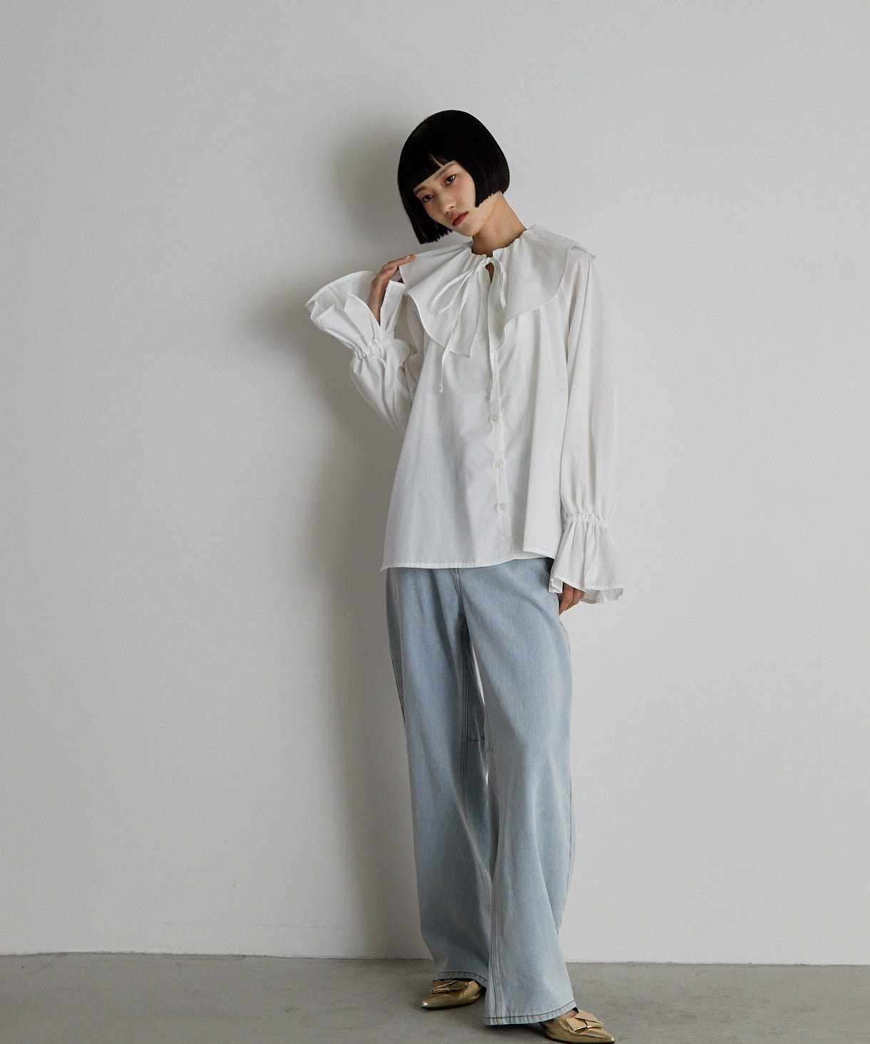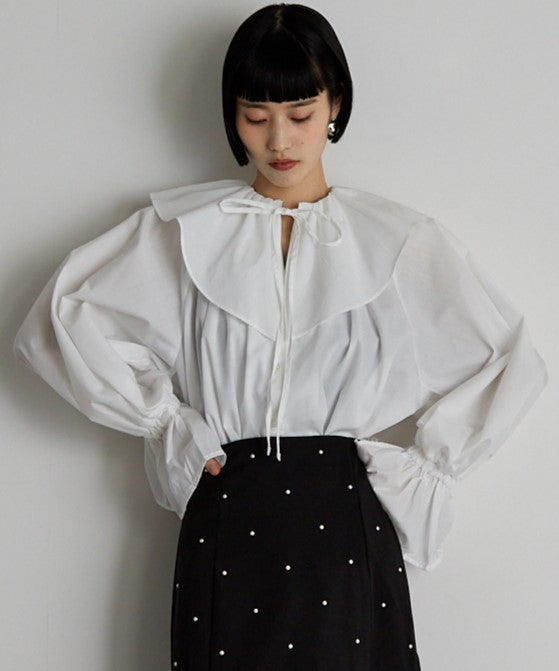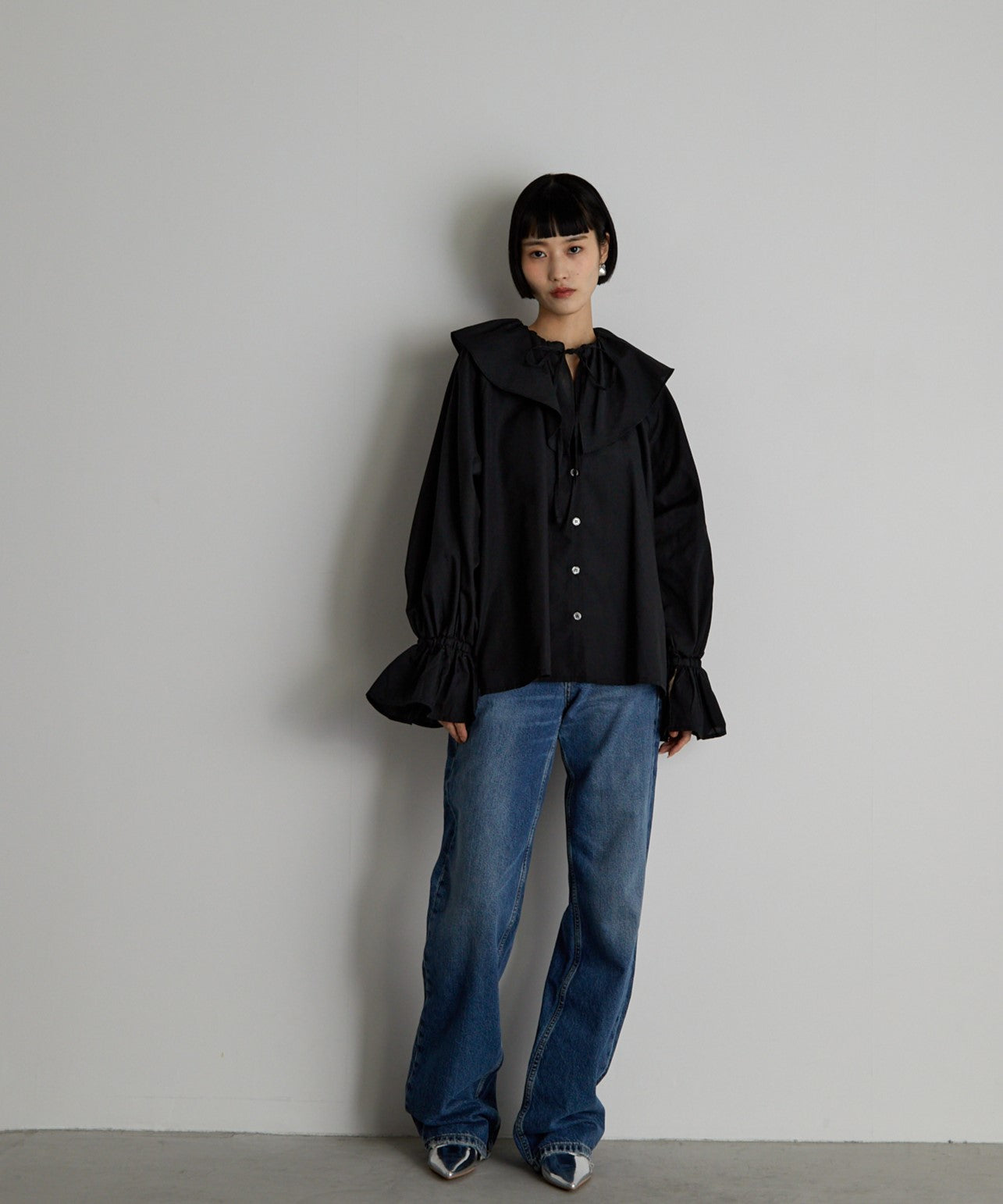 大きな襟のフリルとリボンタイが特徴的で、クラシカルかつフェミニンな雰囲気を演出しています。ボリュームのある袖口もポイントで、全体的に軽やかで華やかな印象を与えています。アウター、ニットなどのアイテムとのレイヤード使いにも◎