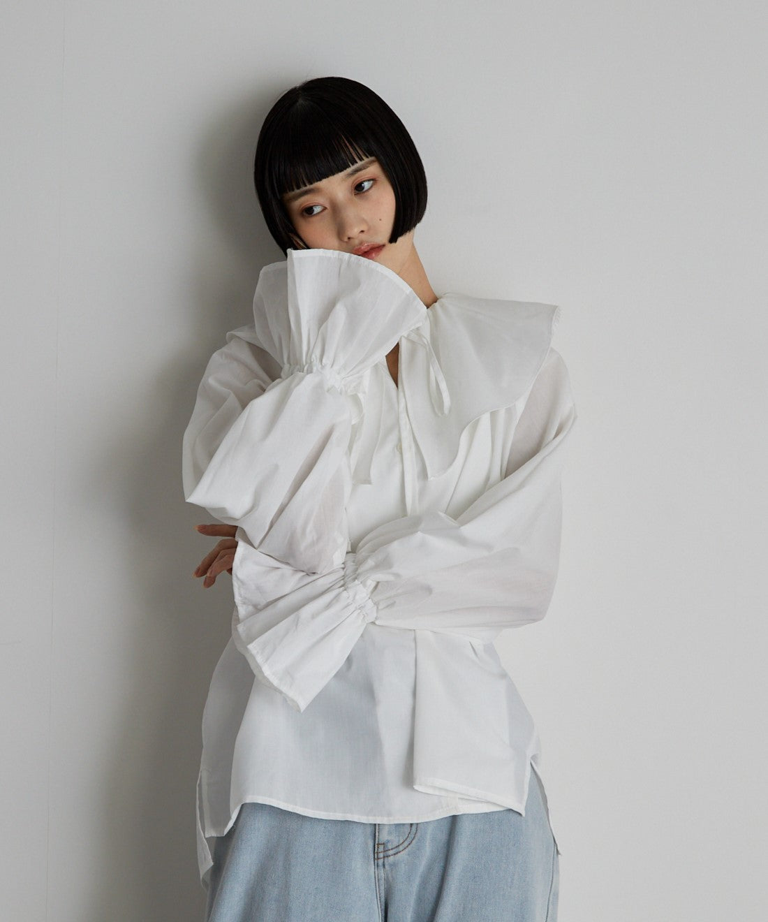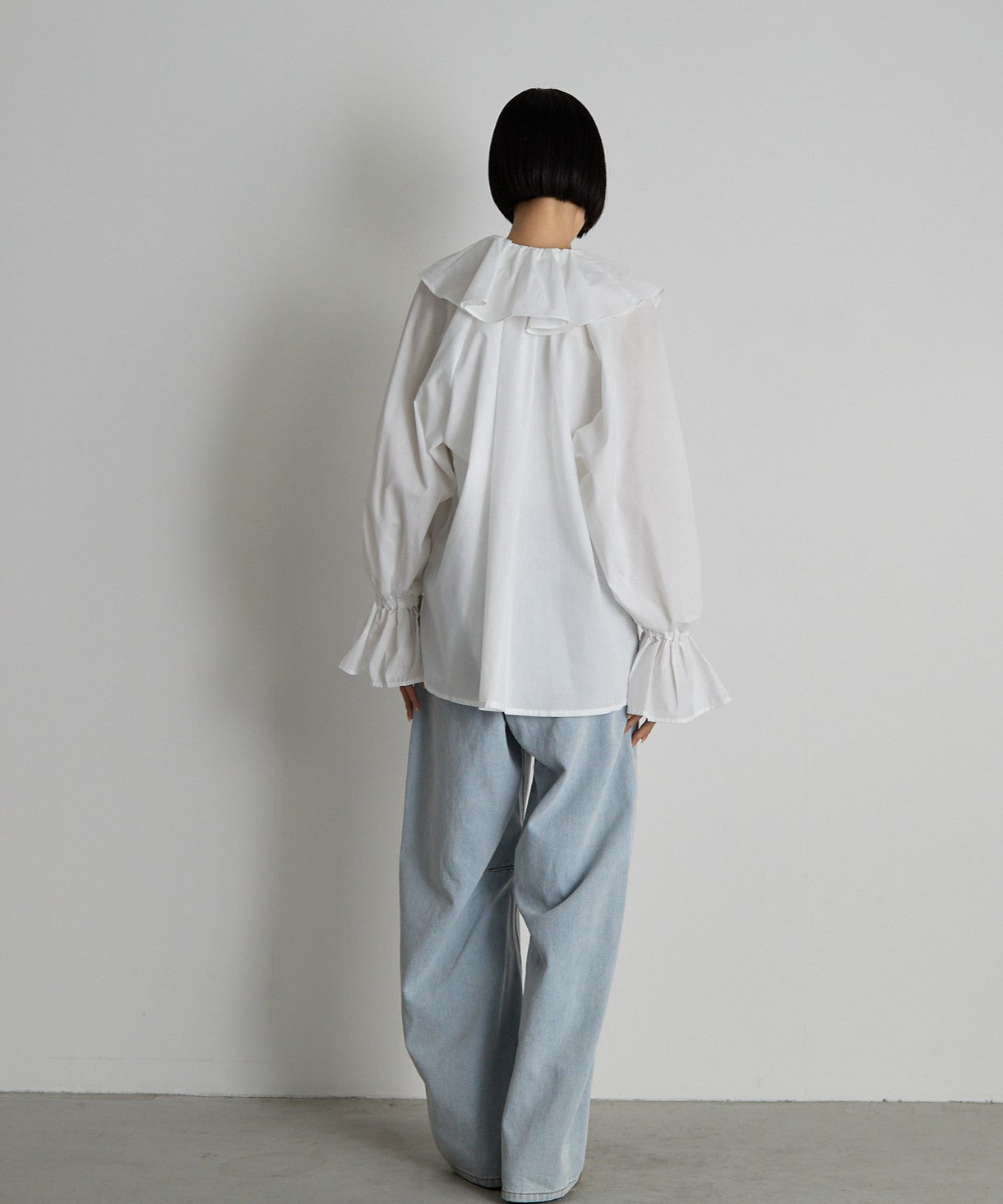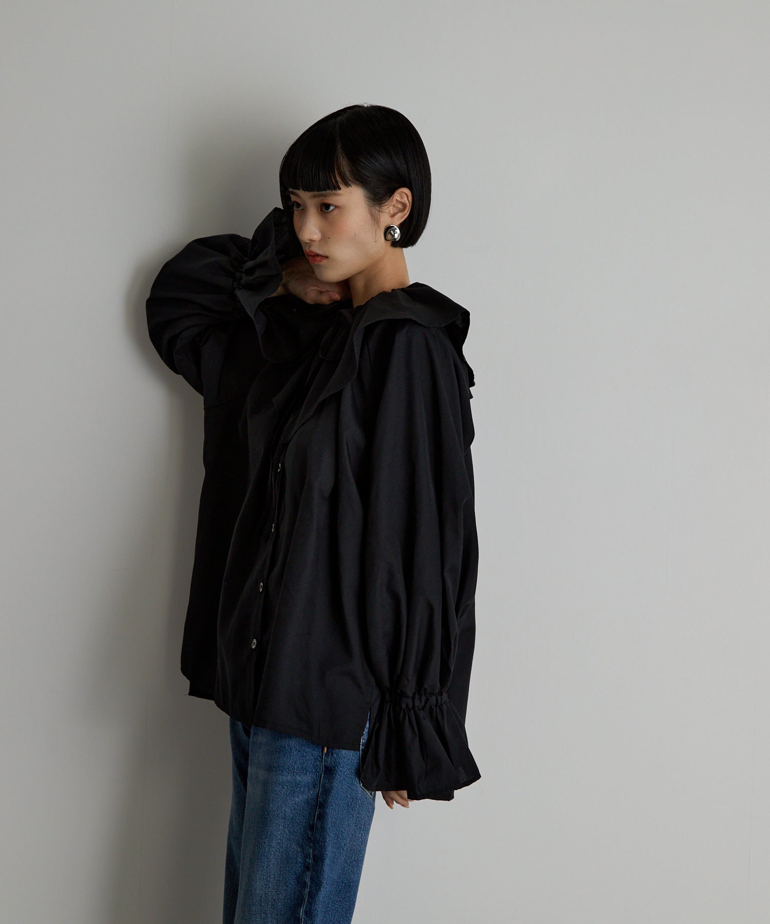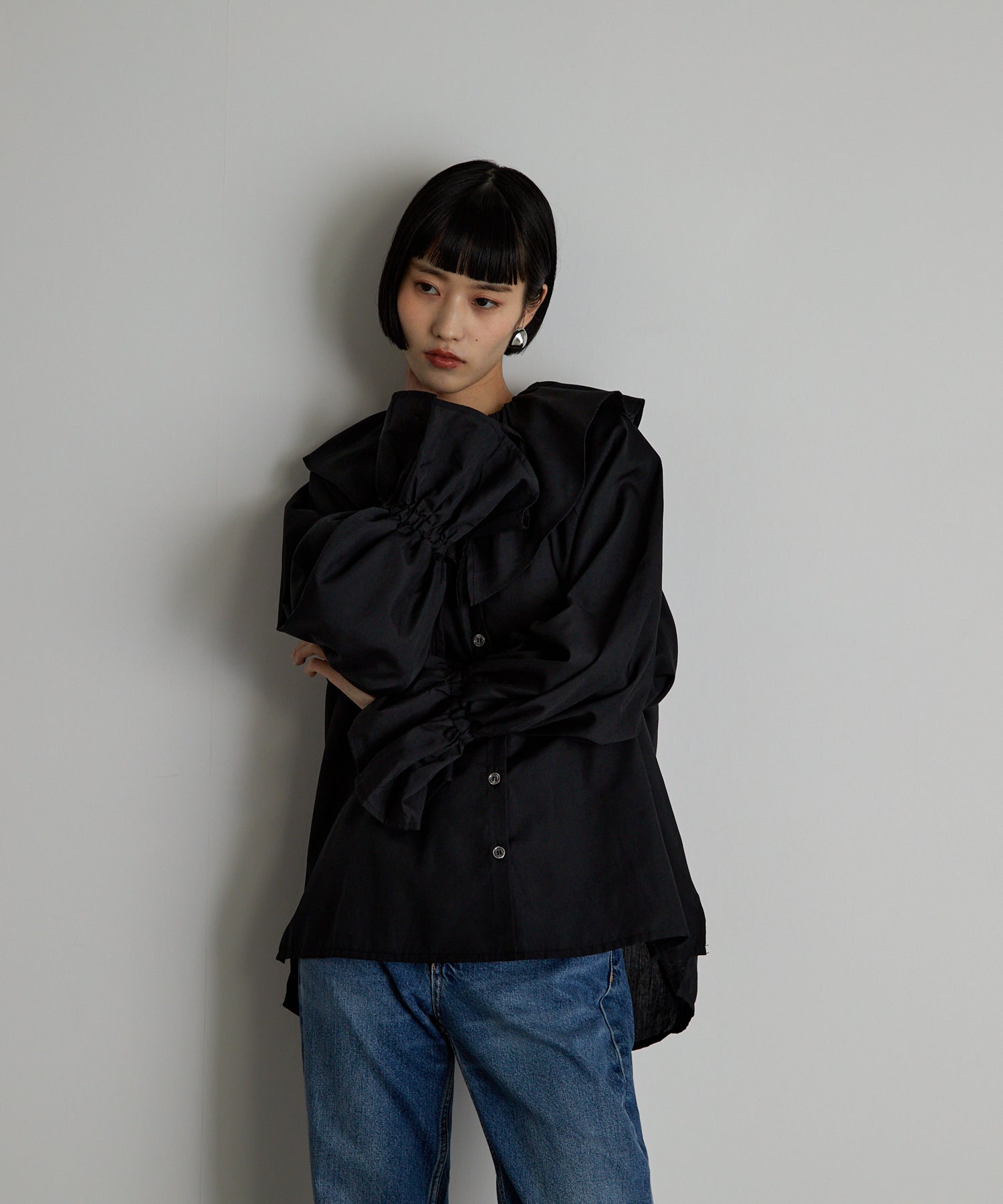 大きな襟のフリルとリボンタイが特徴的で、クラシカルかつフェミニンな雰囲気を演出しています。ボリュームのある袖口もポイントで、全体的に軽やかで華やかな印象を与えています。アウター、ニットなどのアイテムとのレイヤード使いにも◎