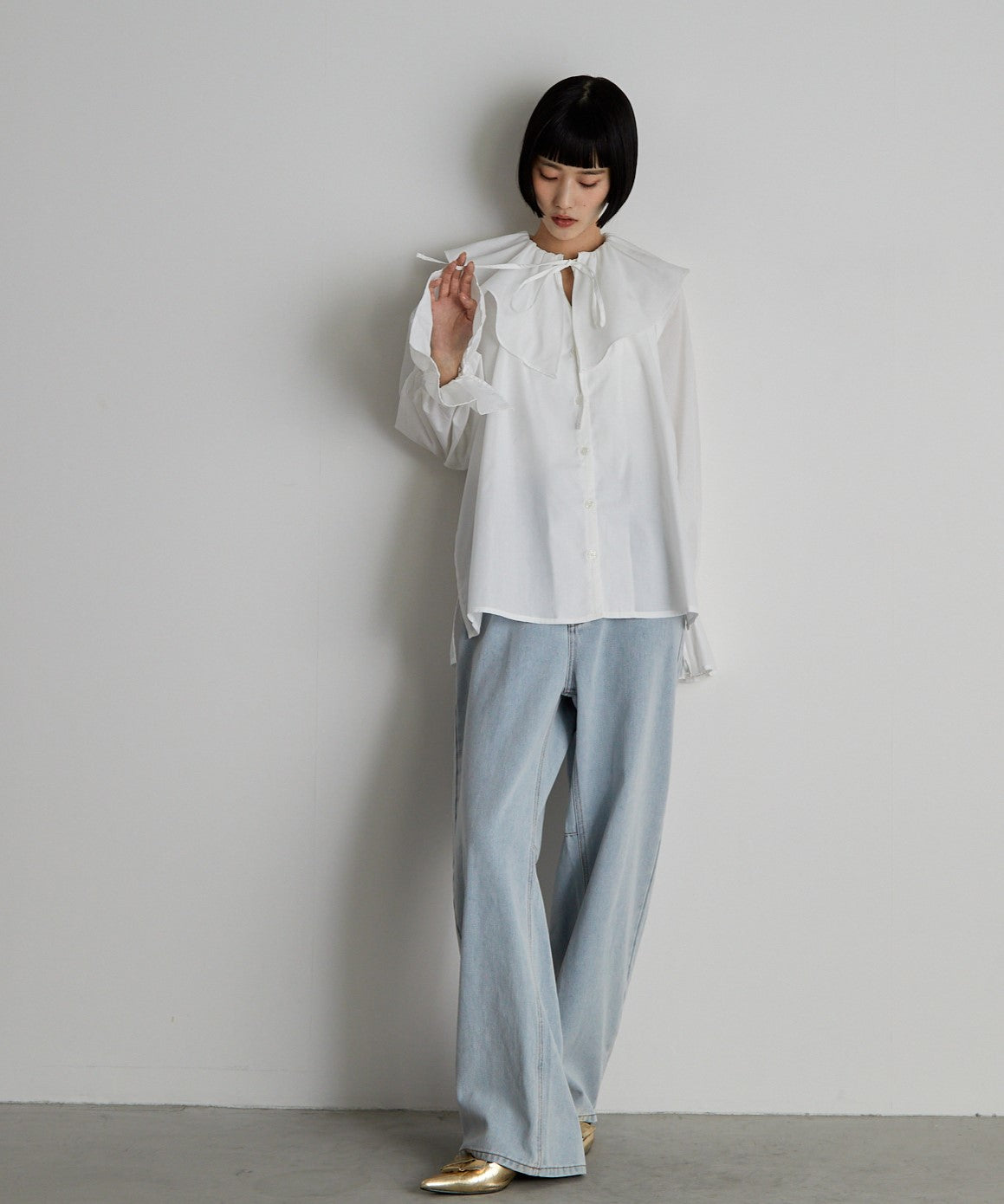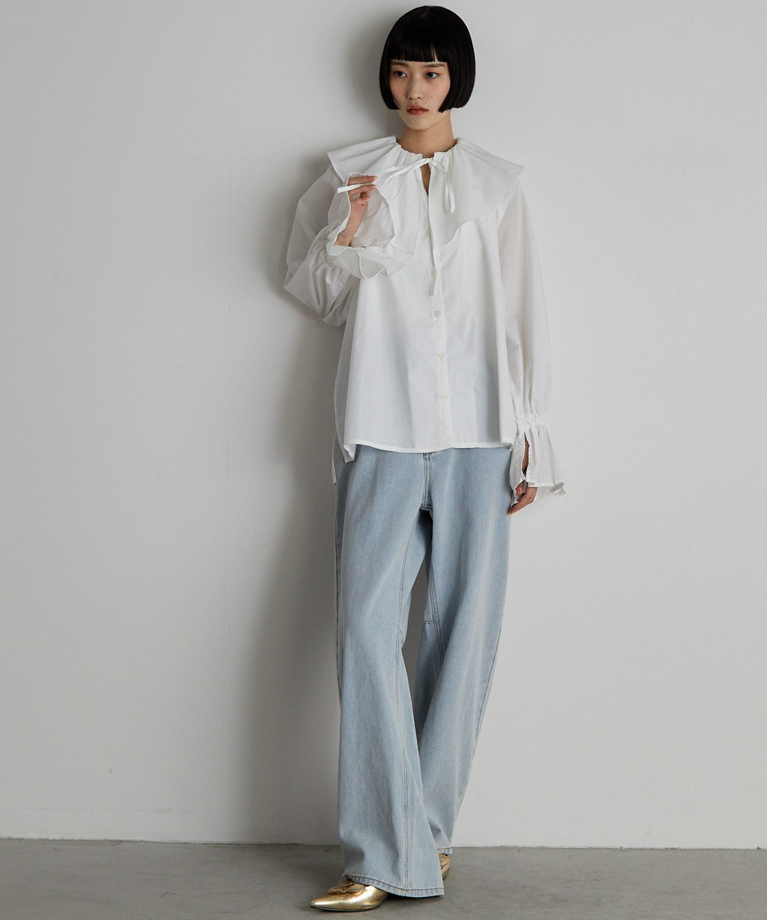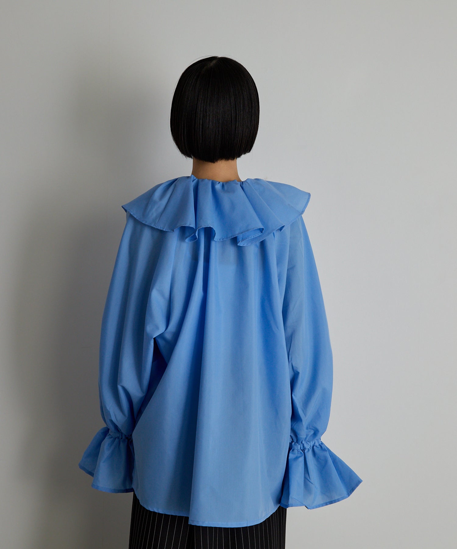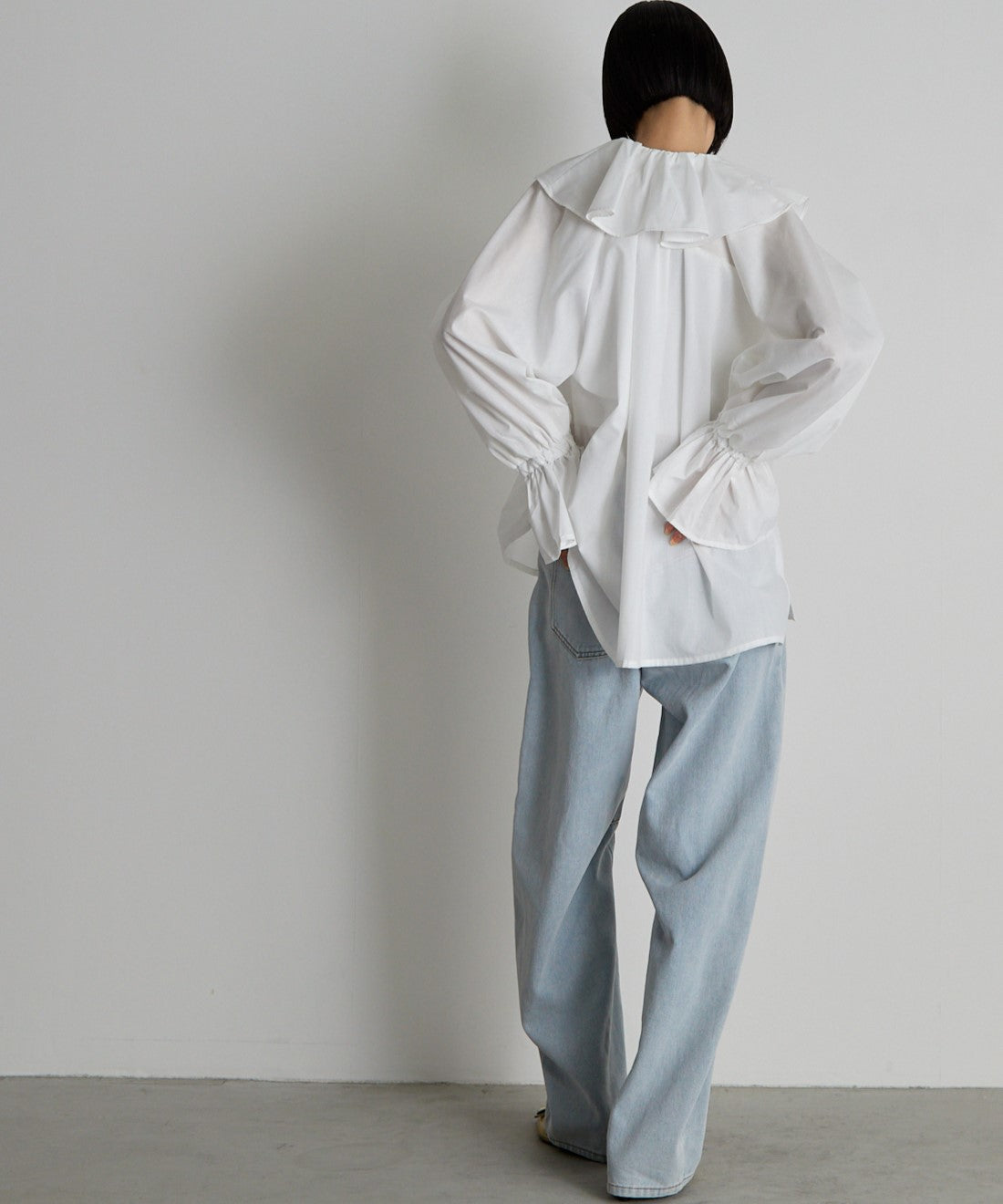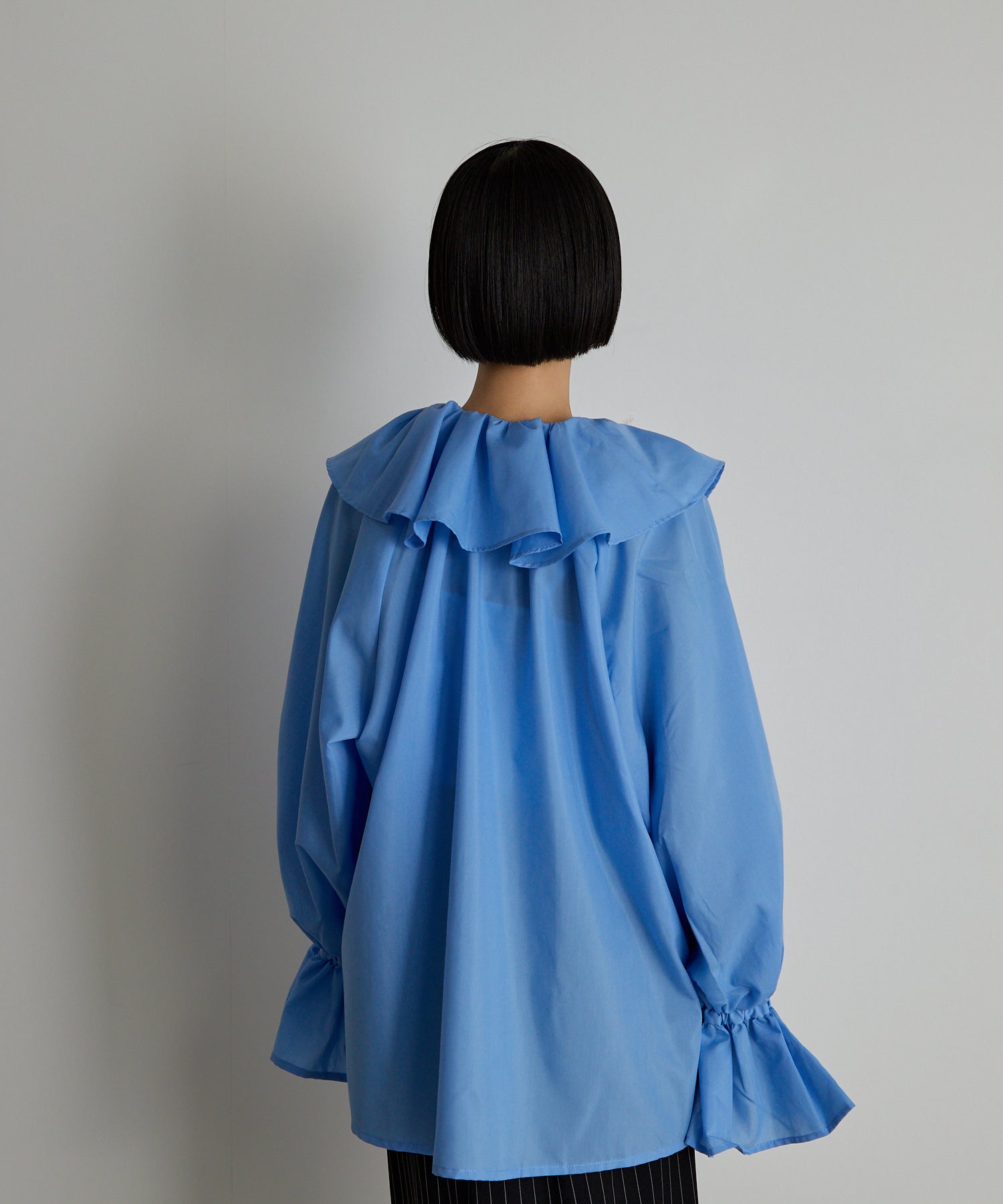 大きな襟のフリルとリボンタイが特徴的で、クラシカルかつフェミニンな雰囲気を演出しています。ボリュームのある袖口もポイントで、全体的に軽やかで華やかな印象を与えています。アウター、ニットなどのアイテムとのレイヤード使いにも◎
