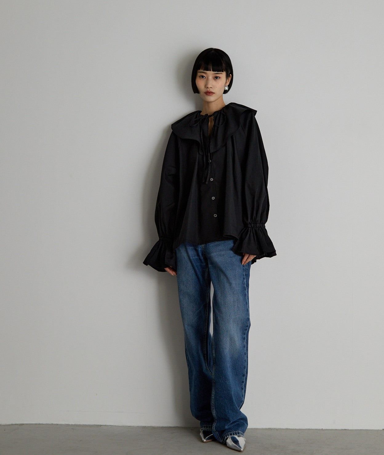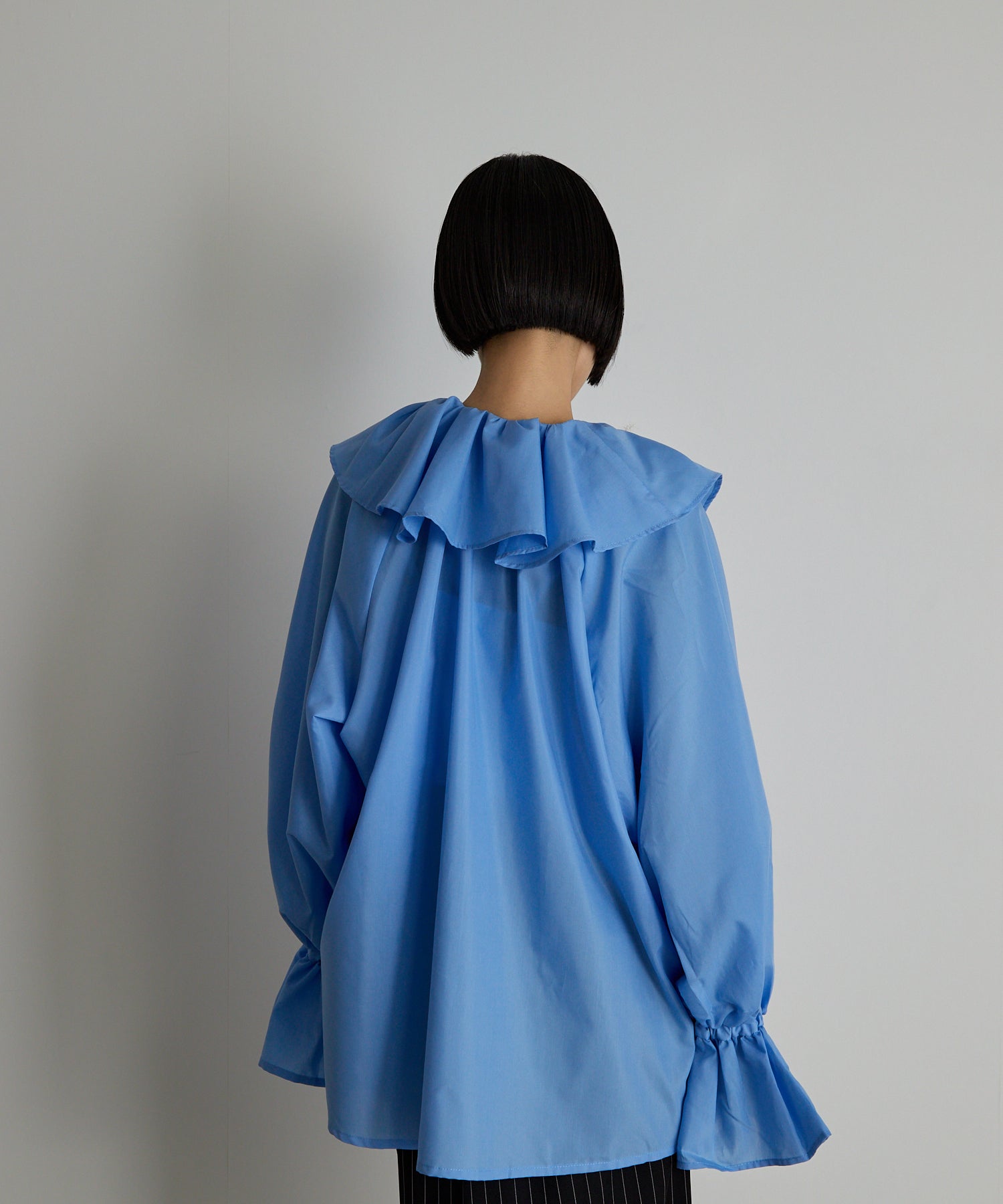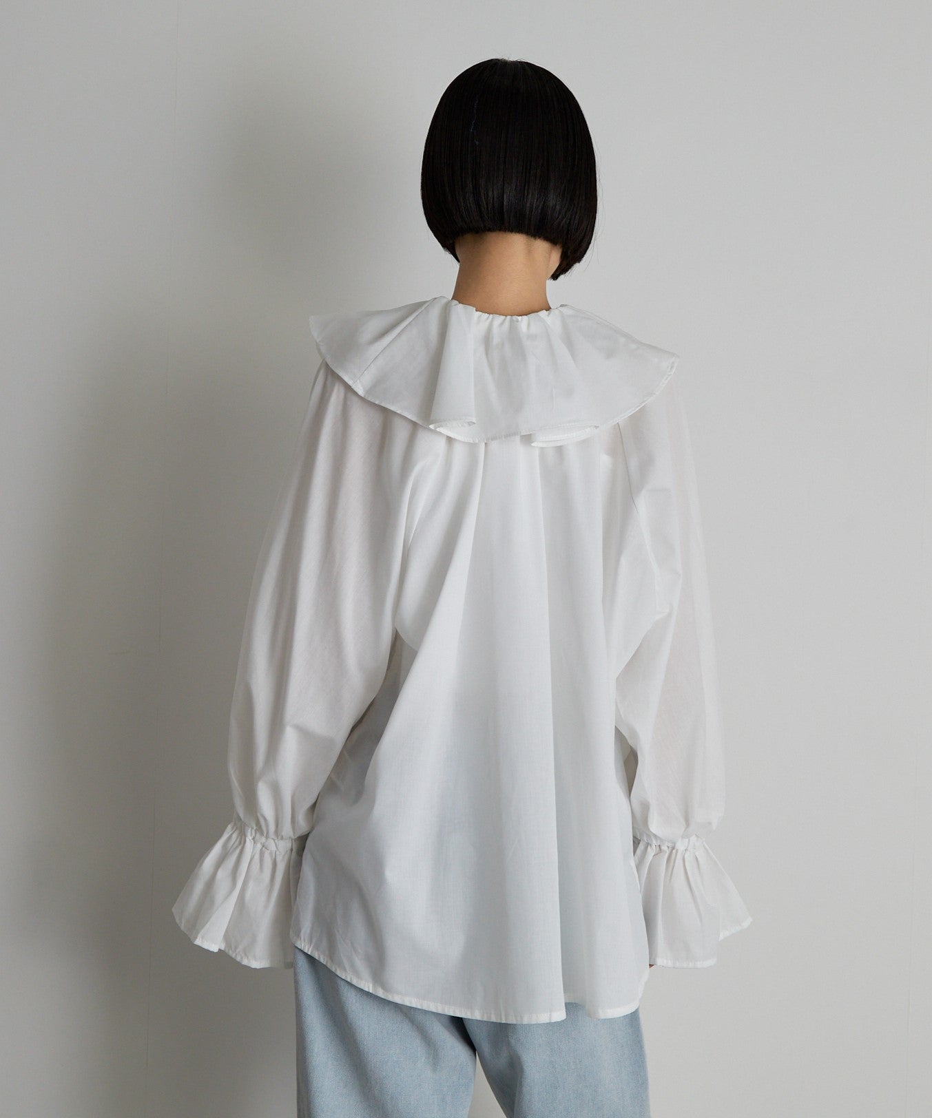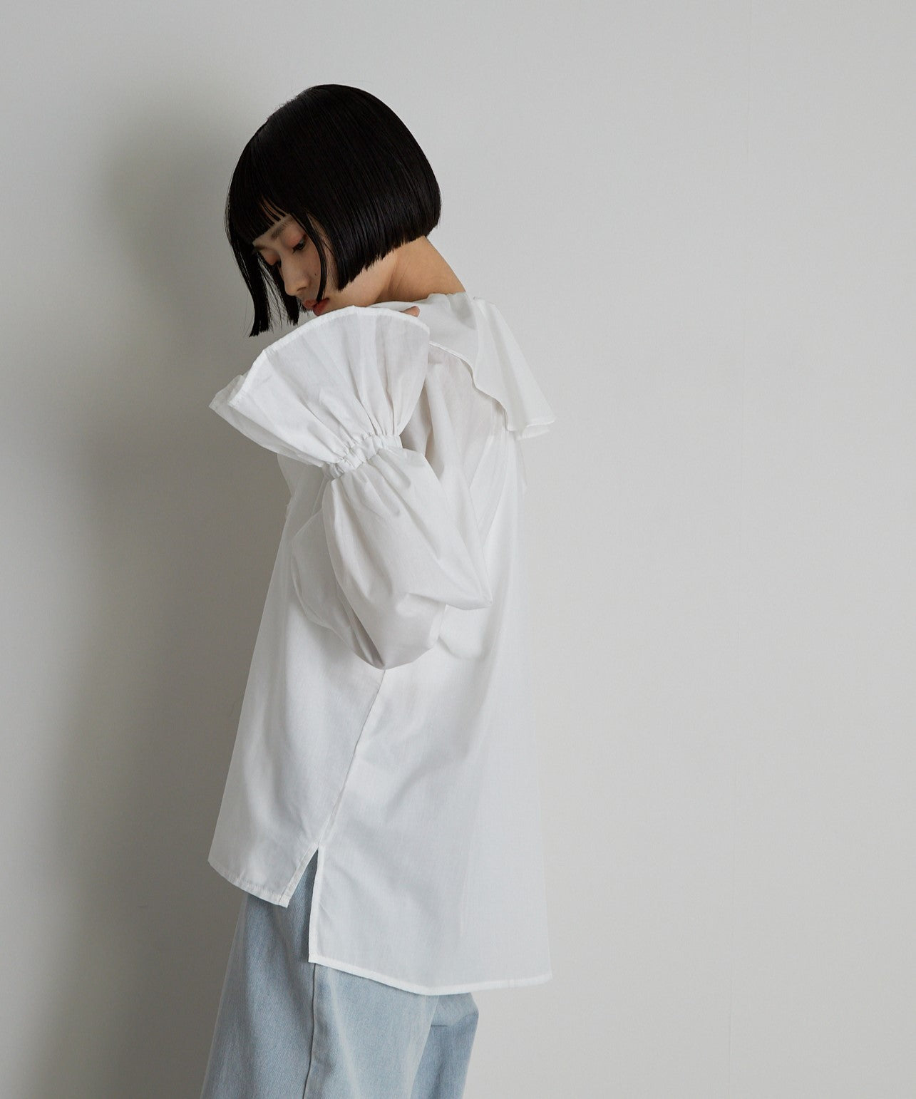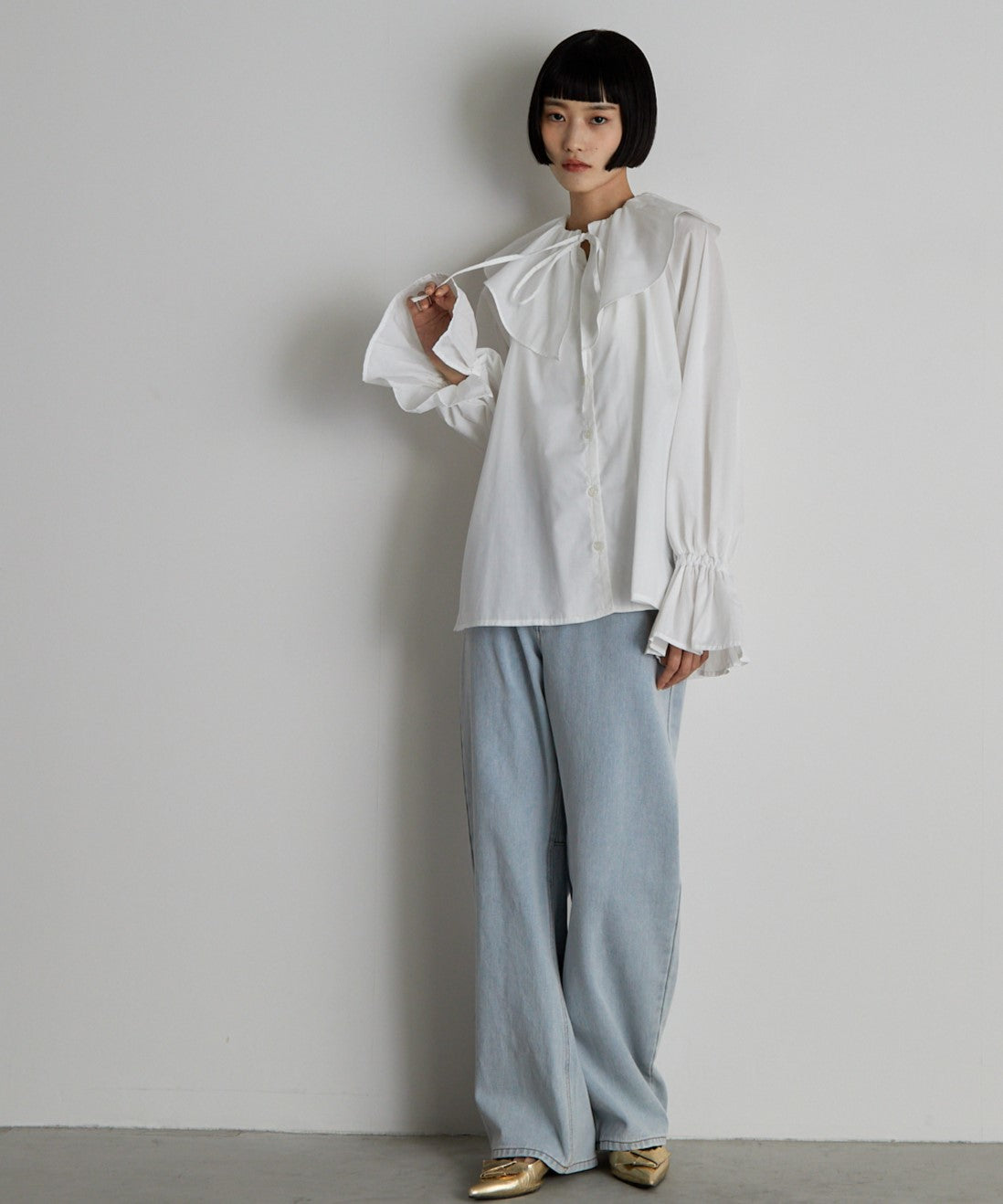 大きな襟のフリルとリボンタイが特徴的で、クラシカルかつフェミニンな雰囲気を演出しています。ボリュームのある袖口もポイントで、全体的に軽やかで華やかな印象を与えています。アウター、ニットなどのアイテムとのレイヤード使いにも◎