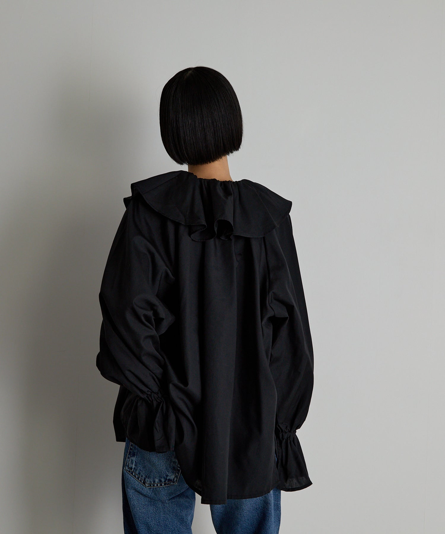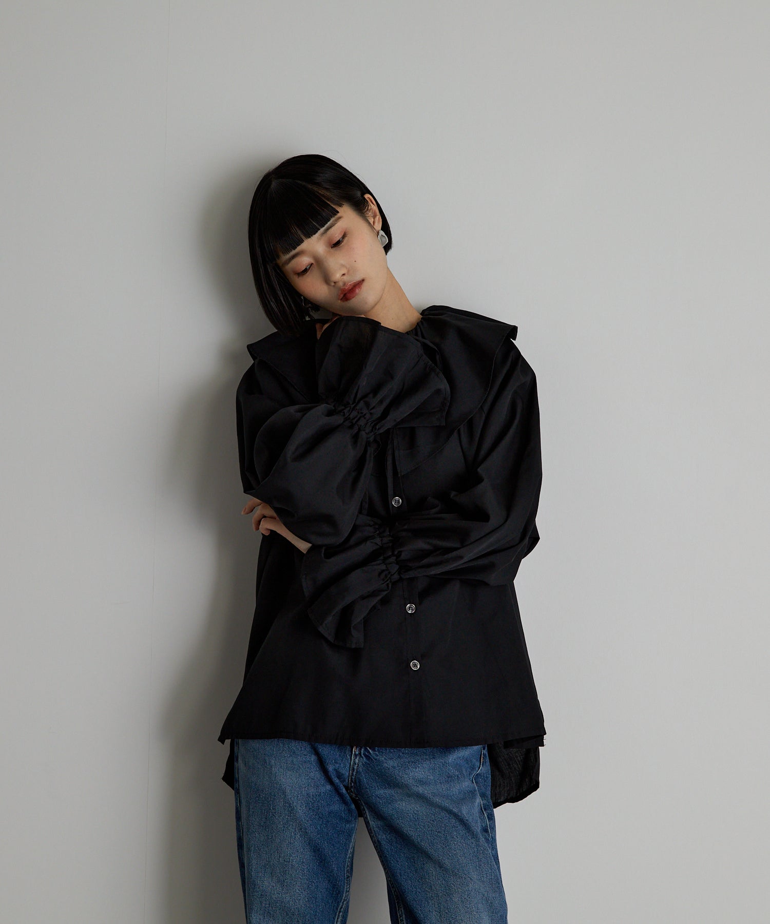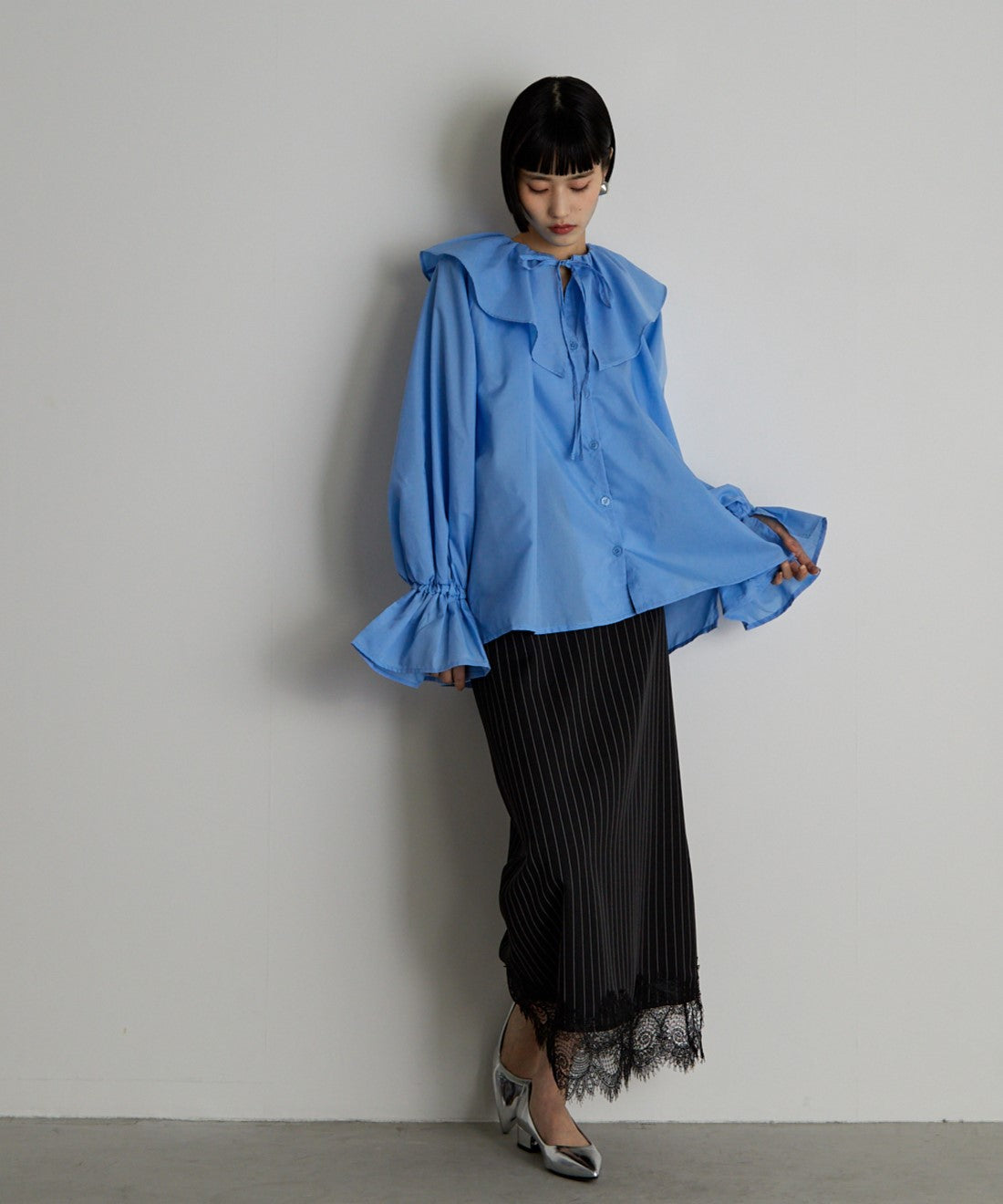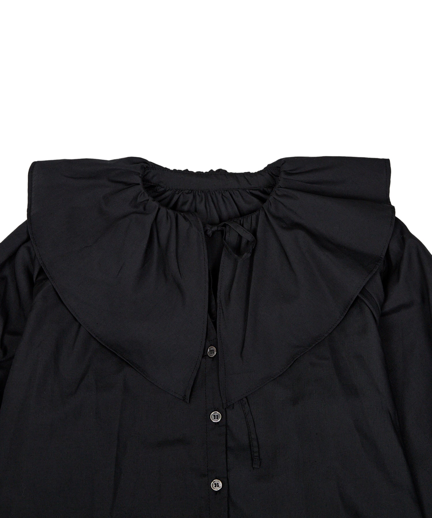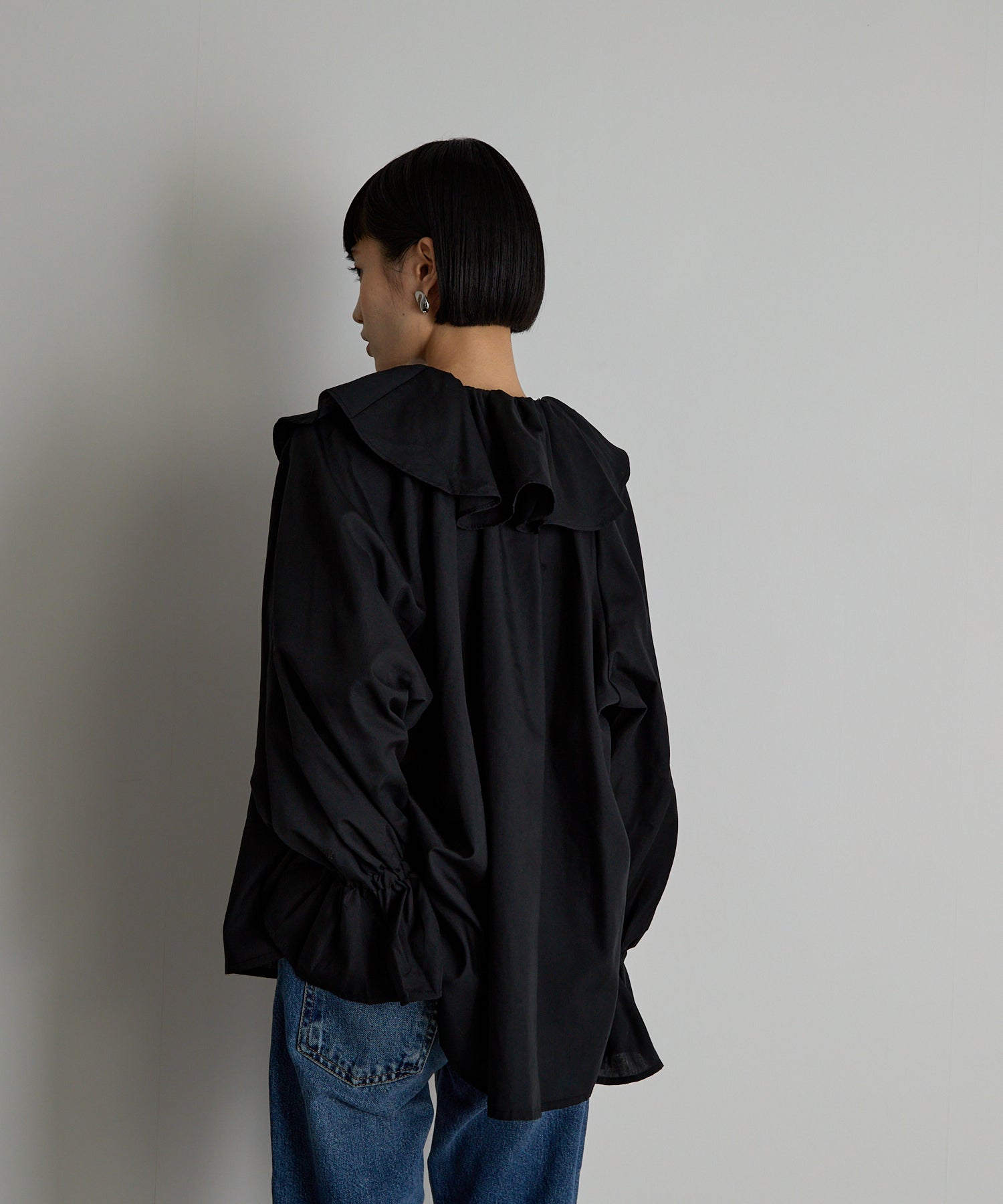 大きな襟のフリルとリボンタイが特徴的で、クラシカルかつフェミニンな雰囲気を演出しています。ボリュームのある袖口もポイントで、全体的に軽やかで華やかな印象を与えています。アウター、ニットなどのアイテムとのレイヤード使いにも◎