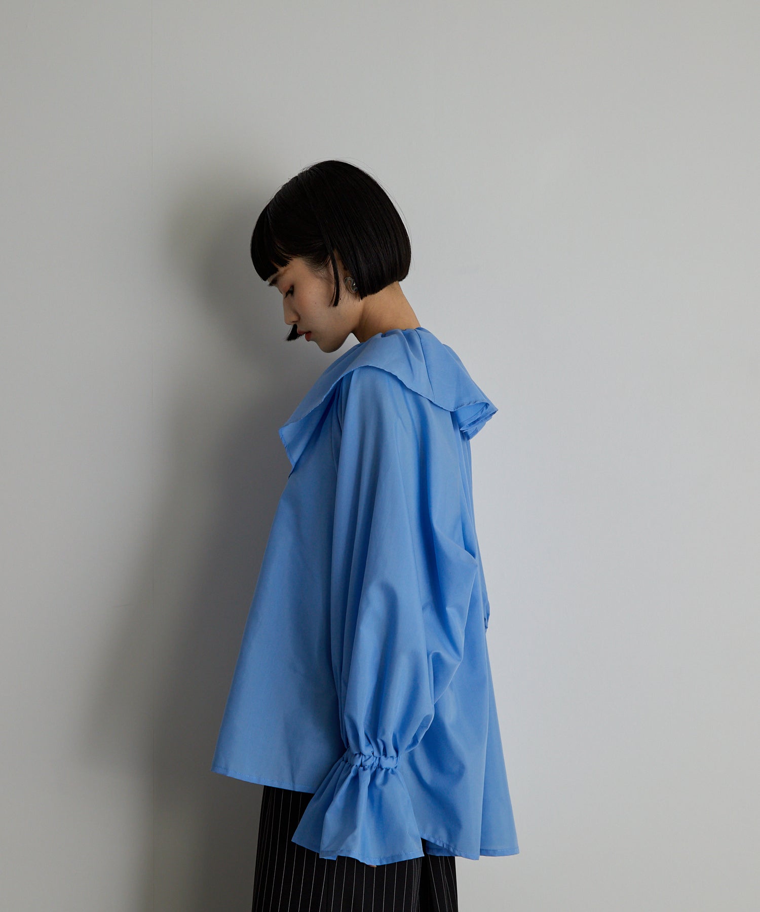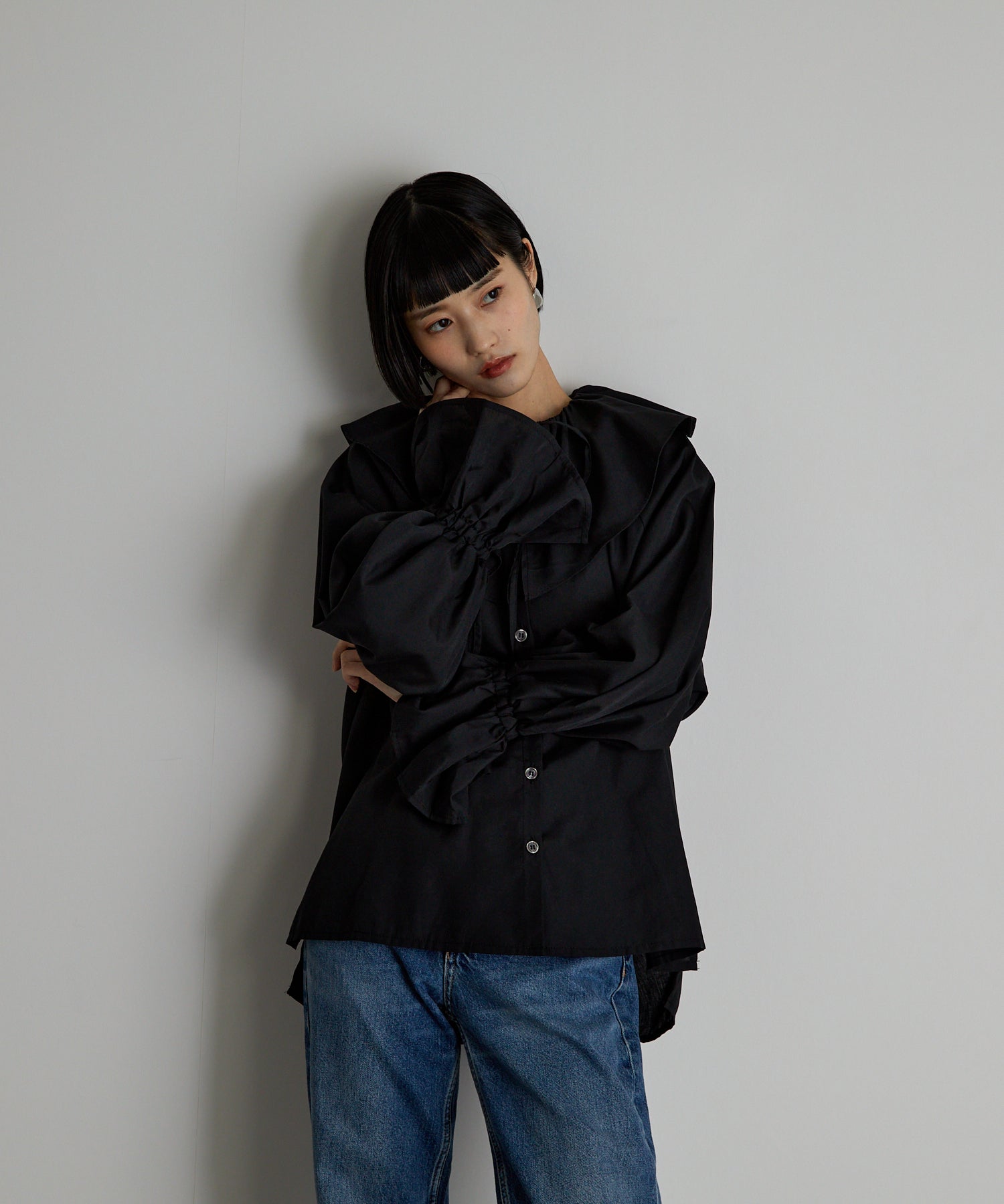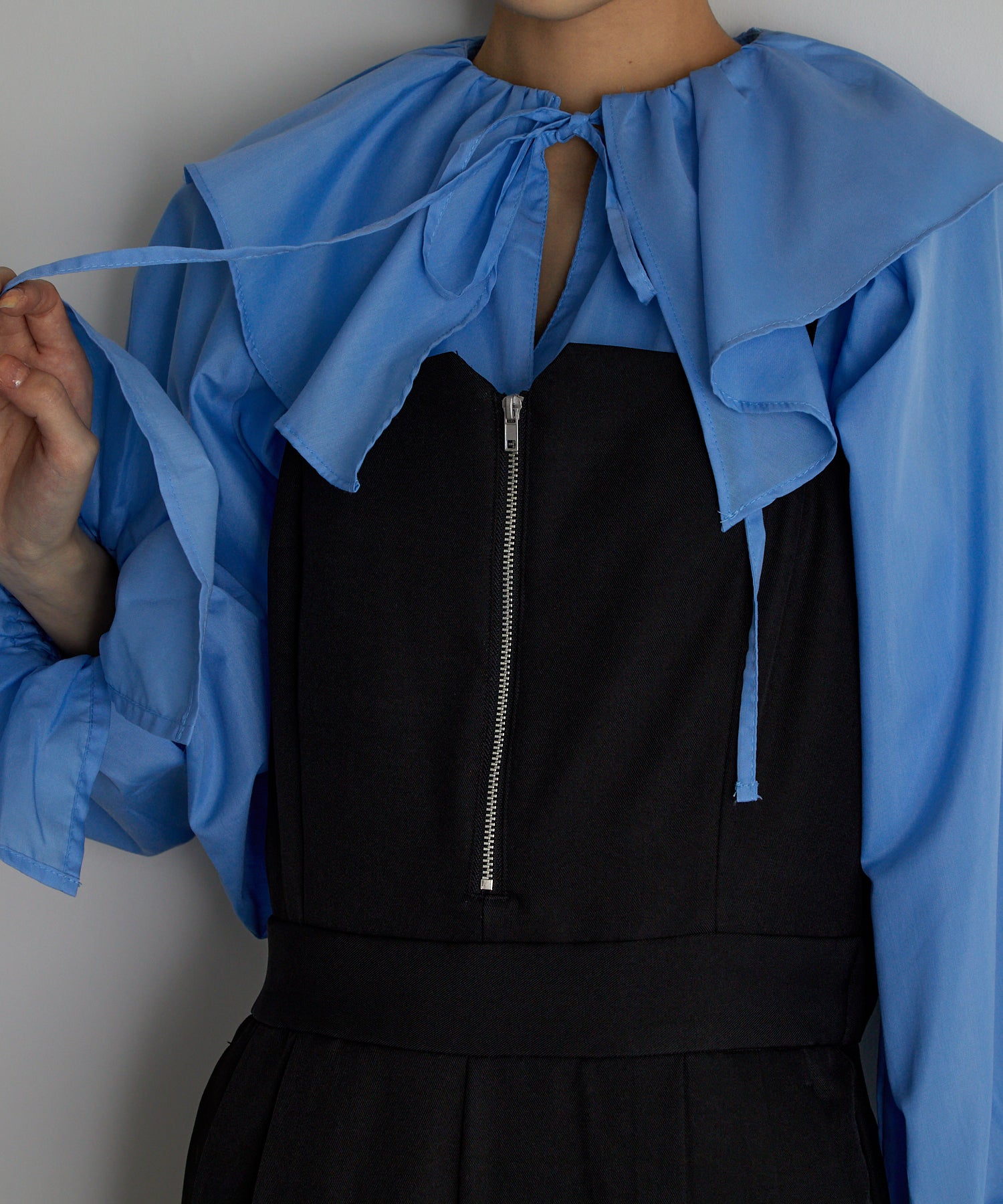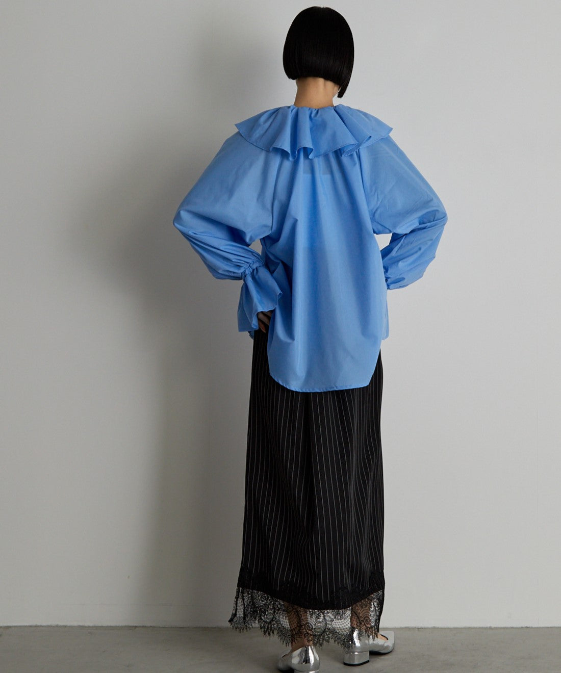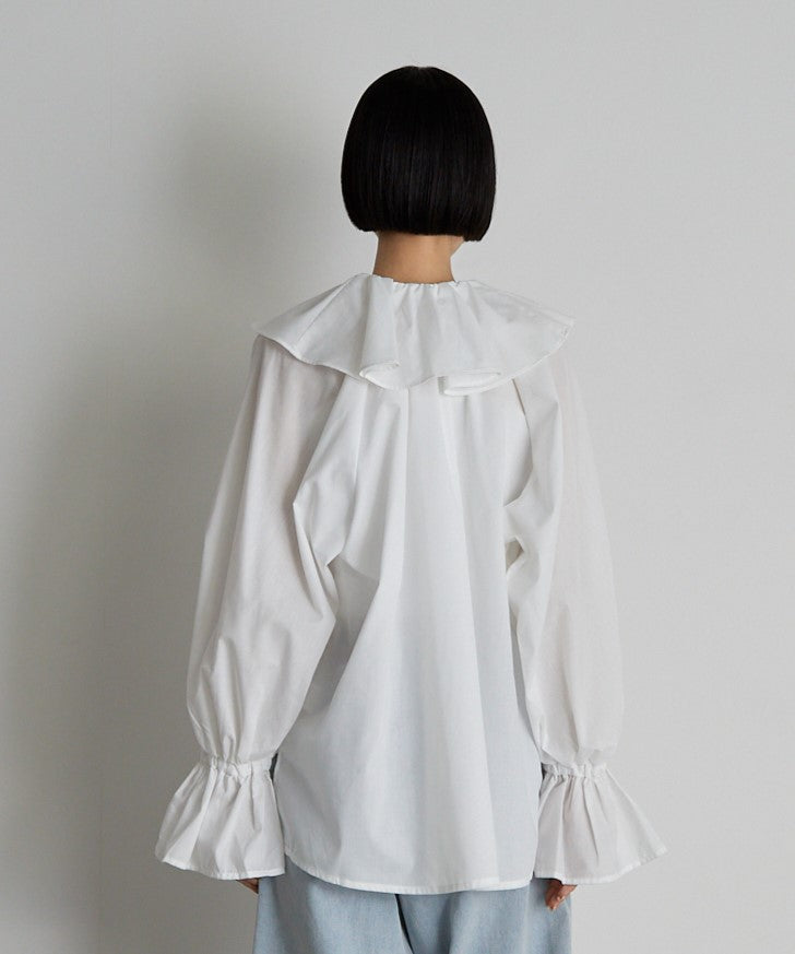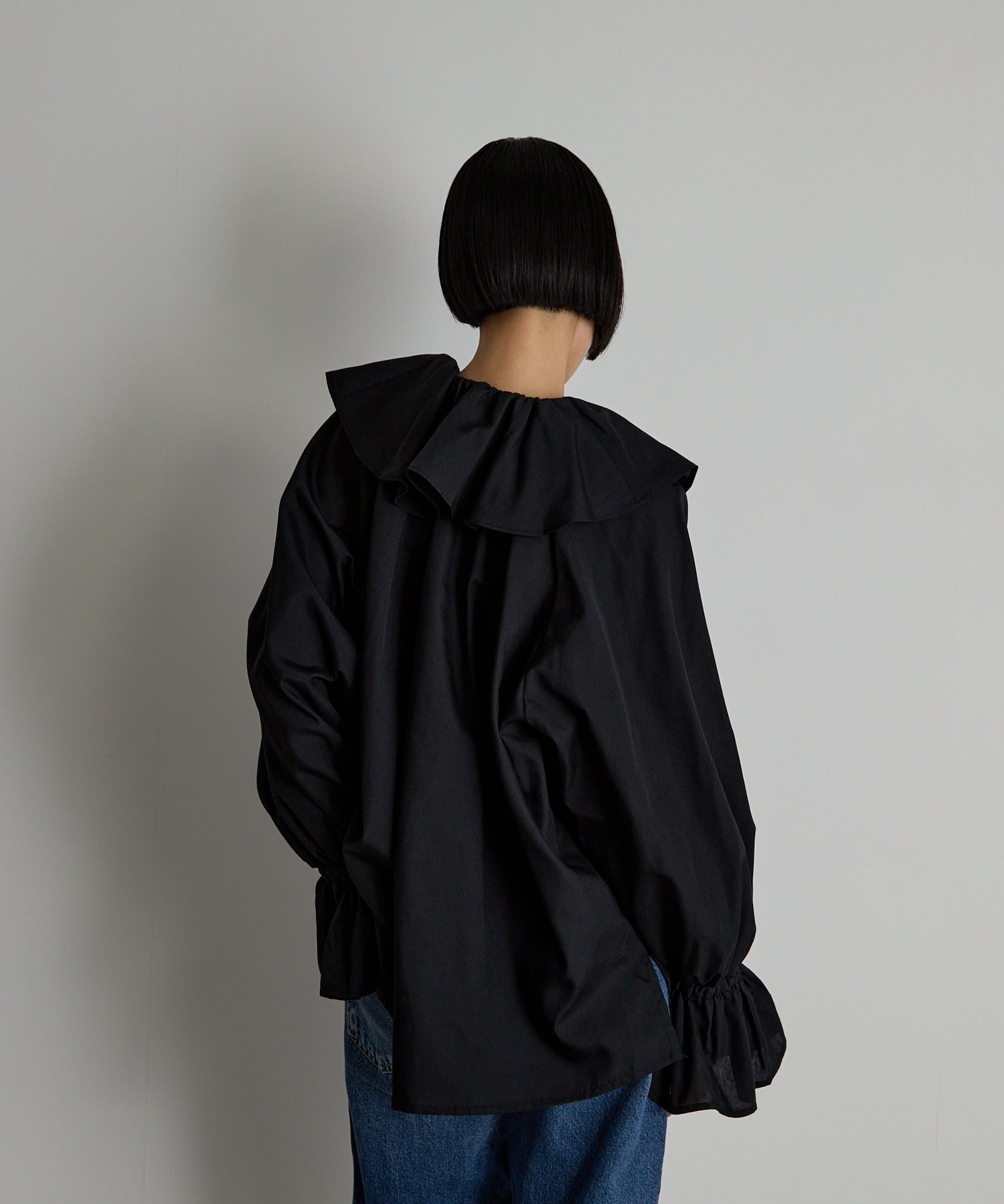 大きな襟のフリルとリボンタイが特徴的で、クラシカルかつフェミニンな雰囲気を演出しています。ボリュームのある袖口もポイントで、全体的に軽やかで華やかな印象を与えています。アウター、ニットなどのアイテムとのレイヤード使いにも◎