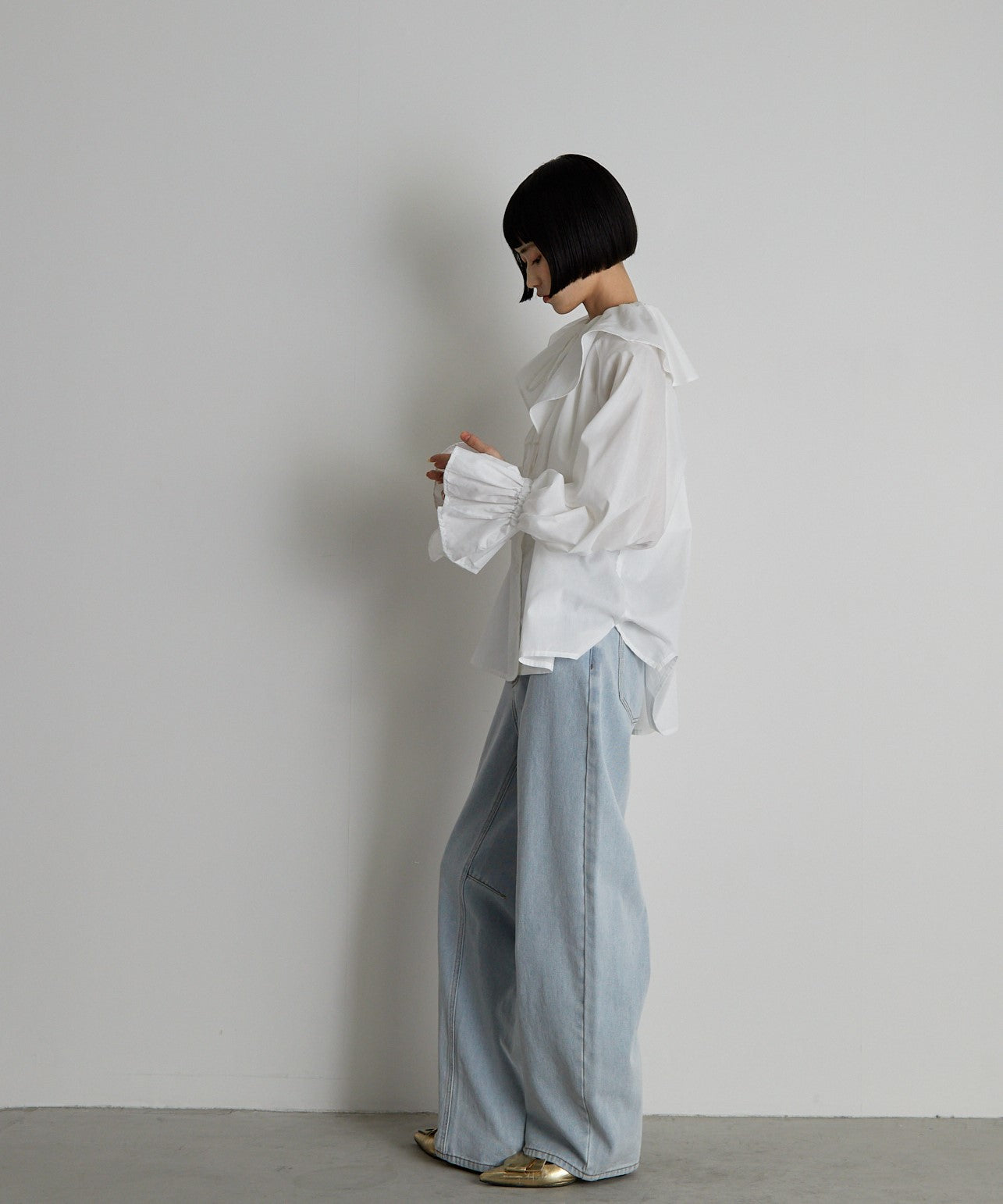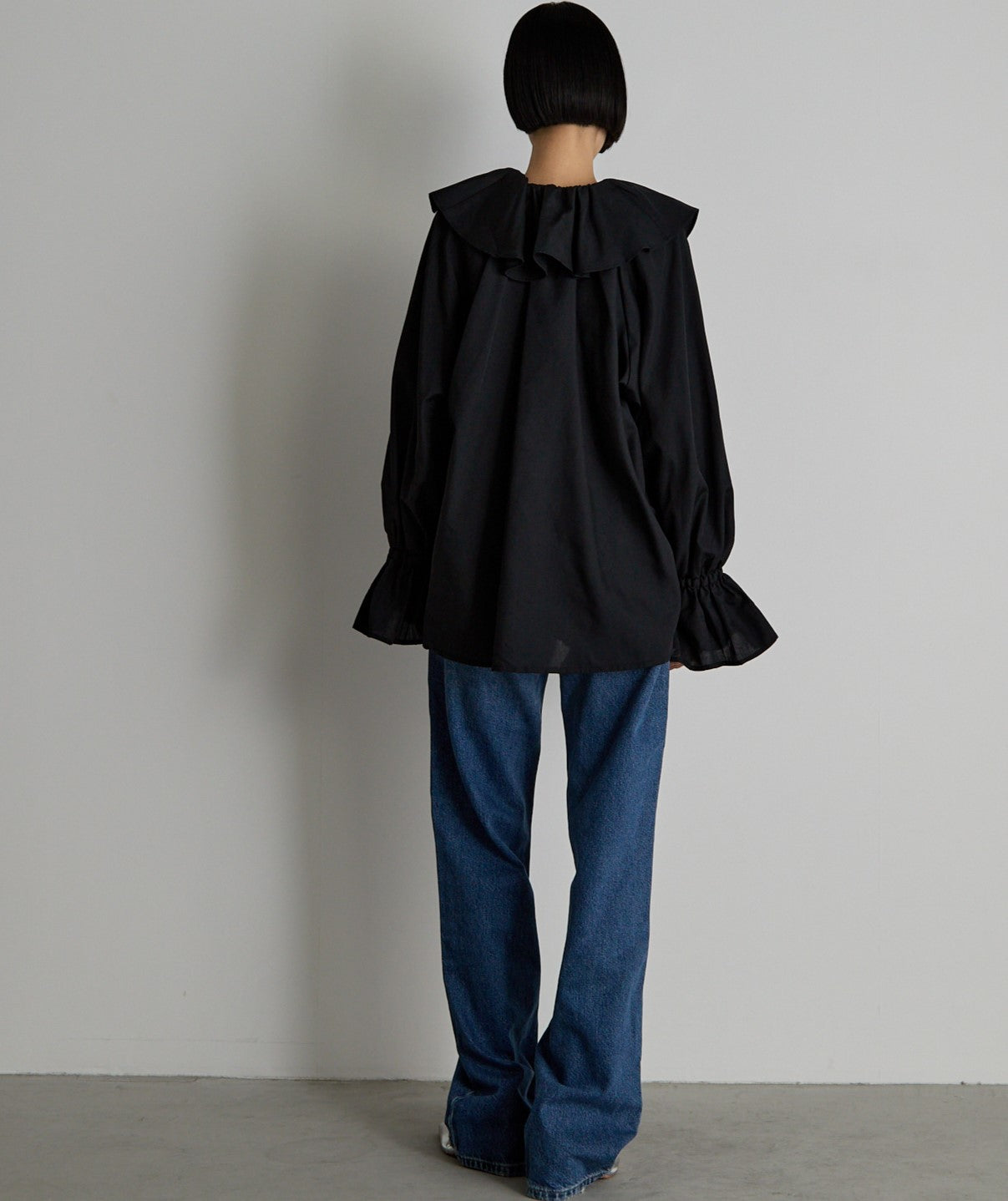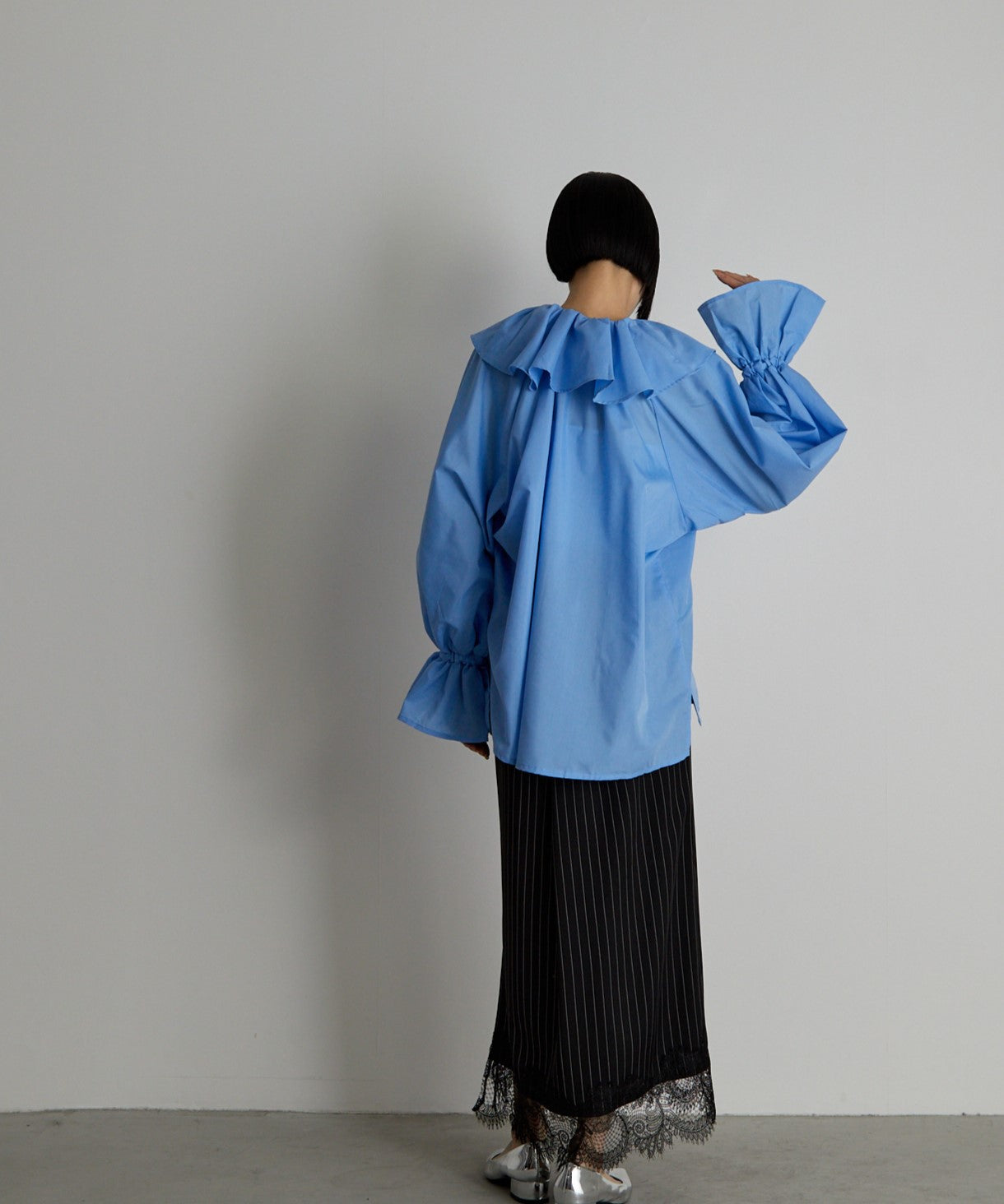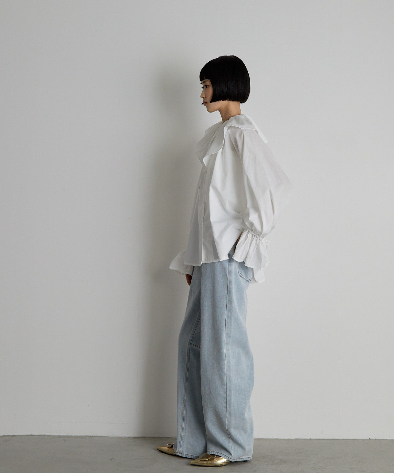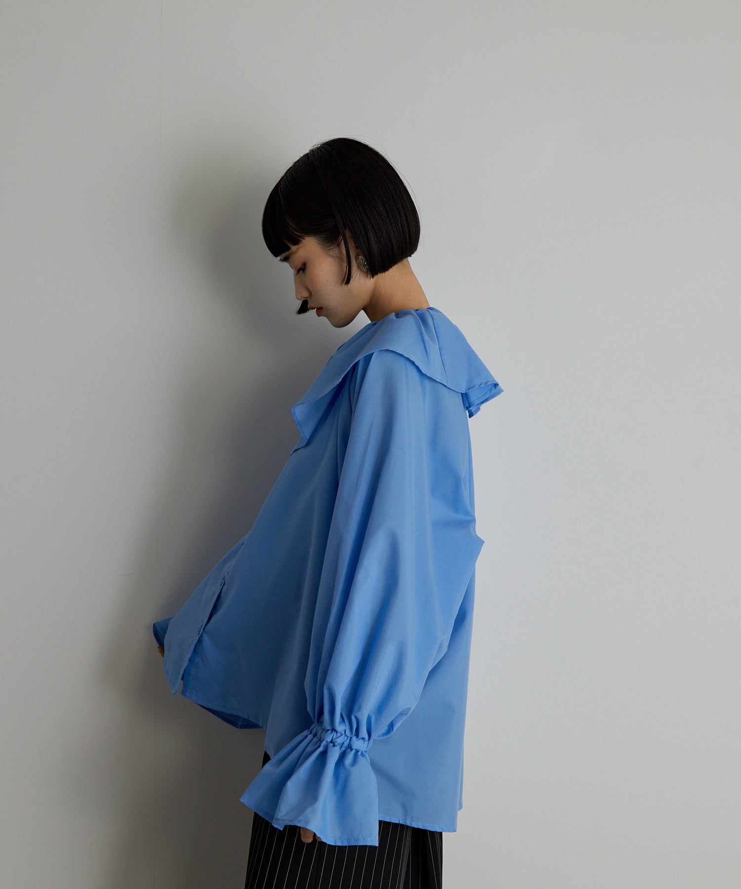 大きな襟のフリルとリボンタイが特徴的で、クラシカルかつフェミニンな雰囲気を演出しています。ボリュームのある袖口もポイントで、全体的に軽やかで華やかな印象を与えています。アウター、ニットなどのアイテムとのレイヤード使いにも◎