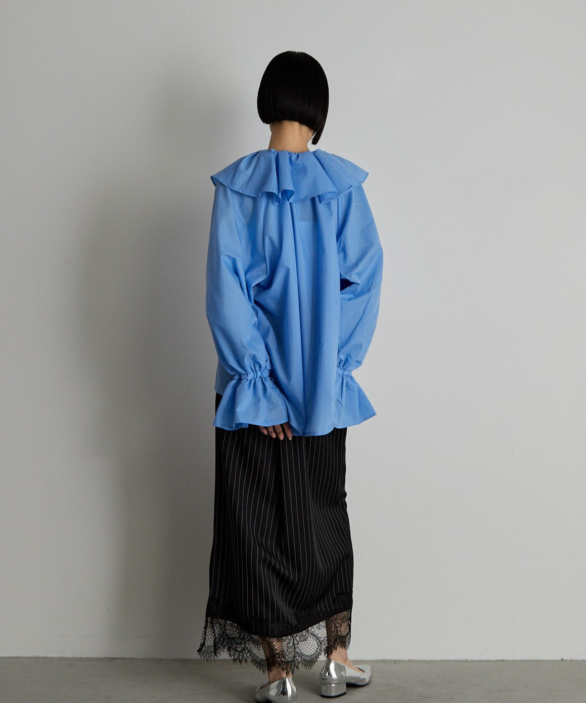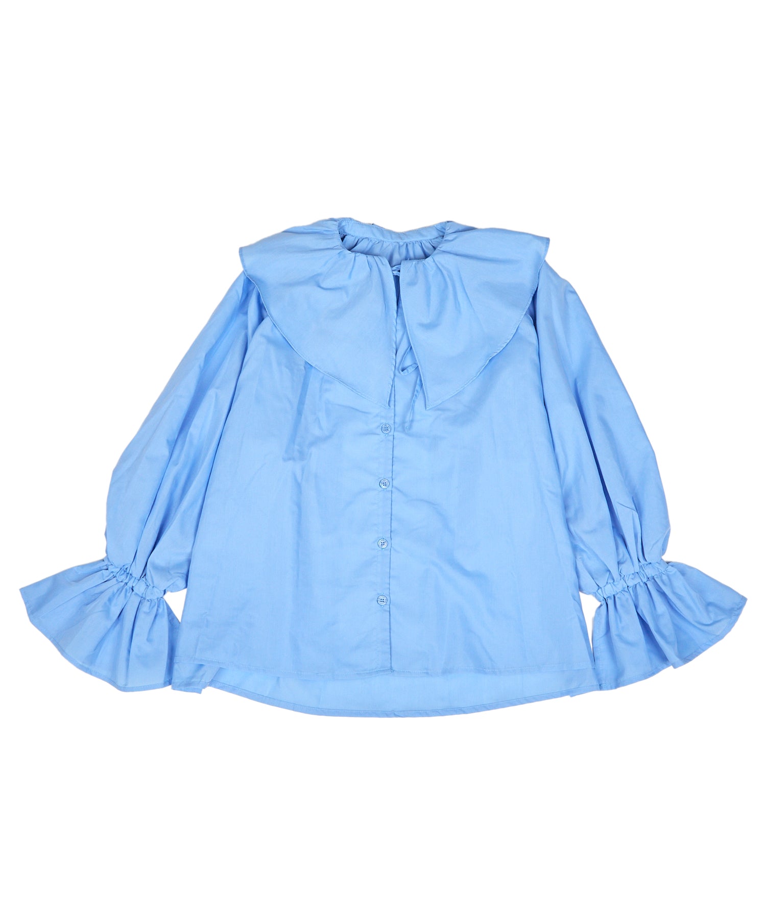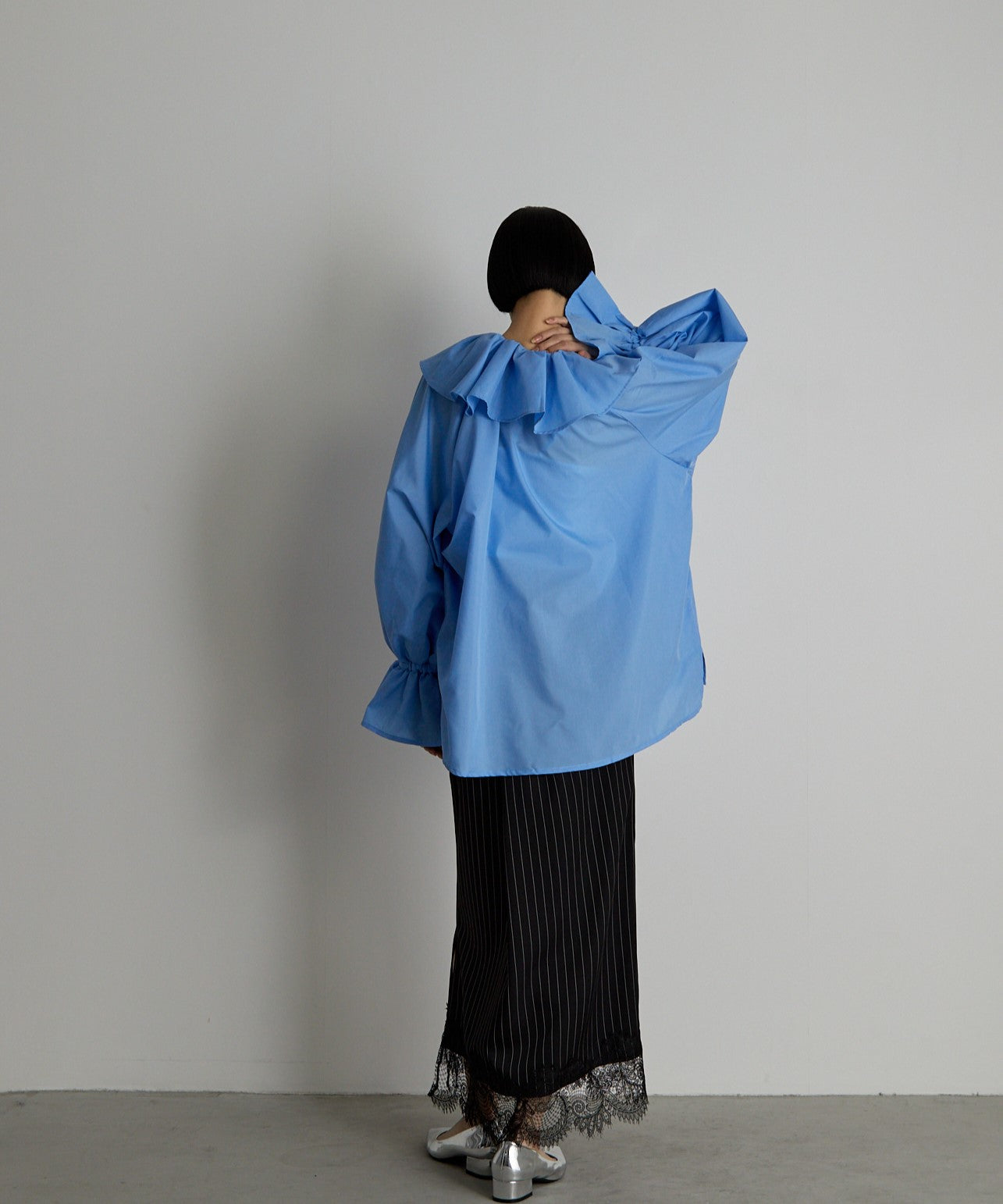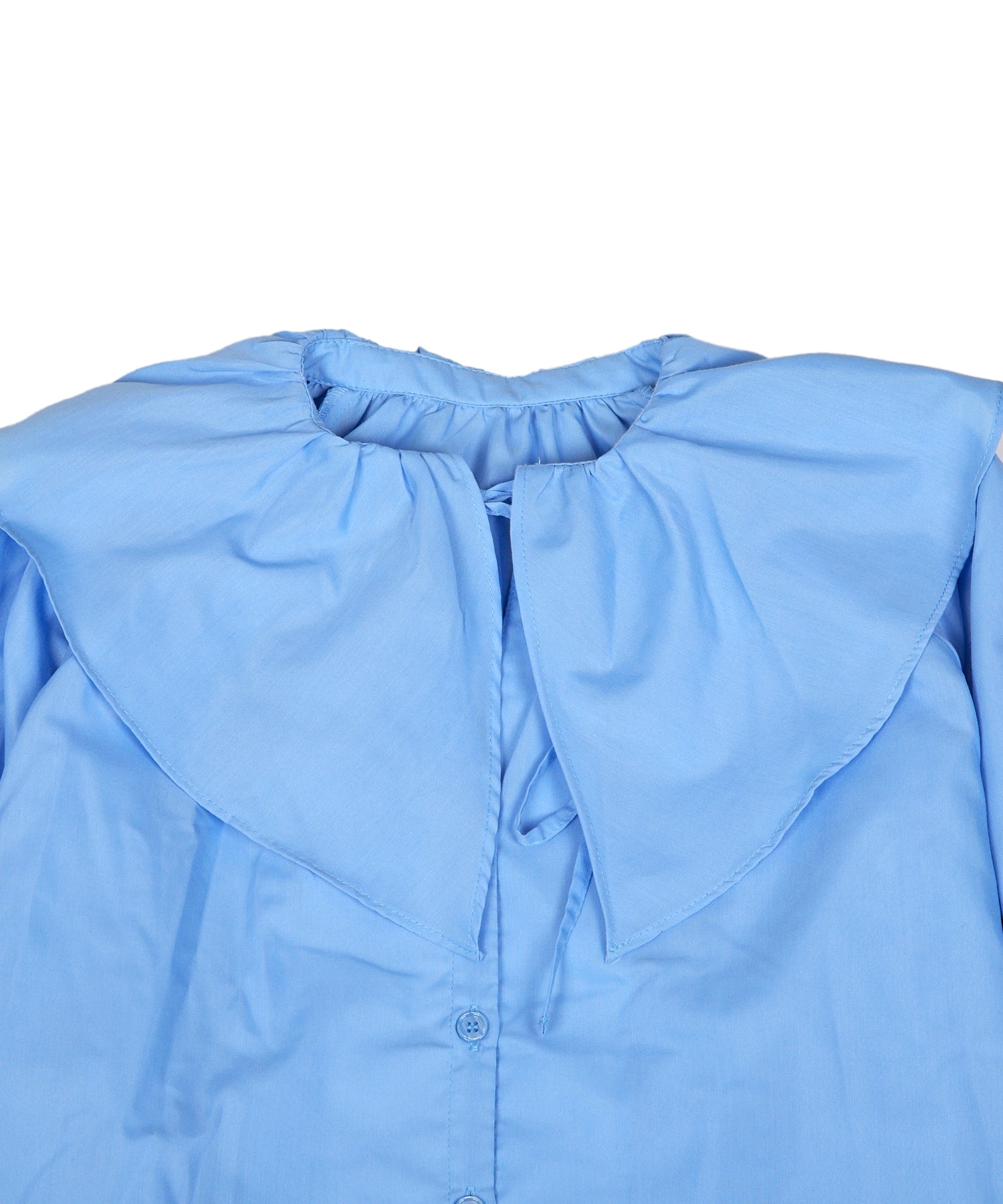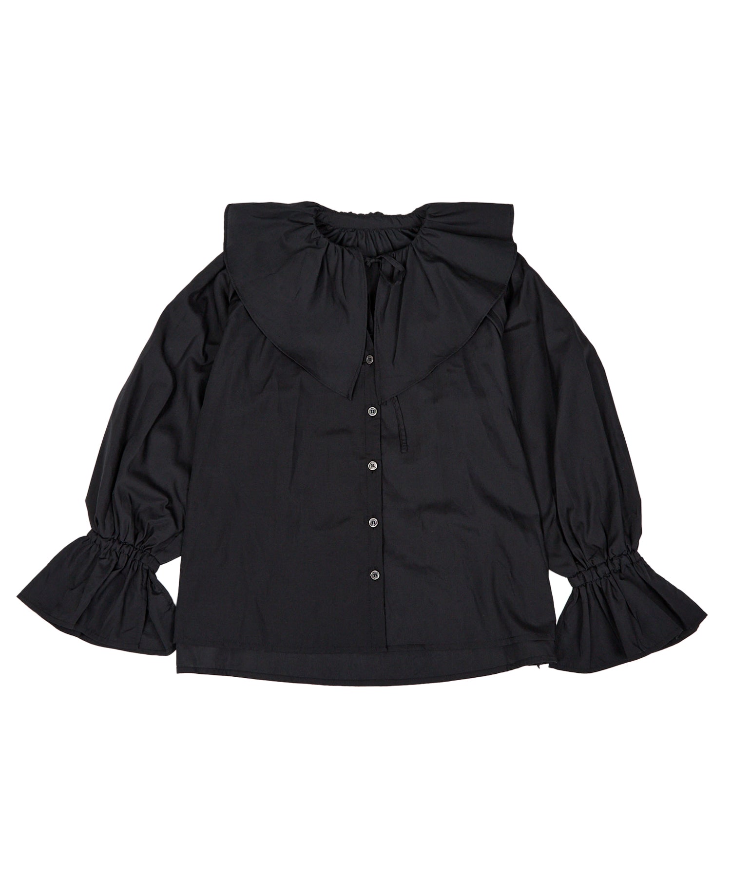 大きな襟のフリルとリボンタイが特徴的で、クラシカルかつフェミニンな雰囲気を演出しています。ボリュームのある袖口もポイントで、全体的に軽やかで華やかな印象を与えています。アウター、ニットなどのアイテムとのレイヤード使いにも◎