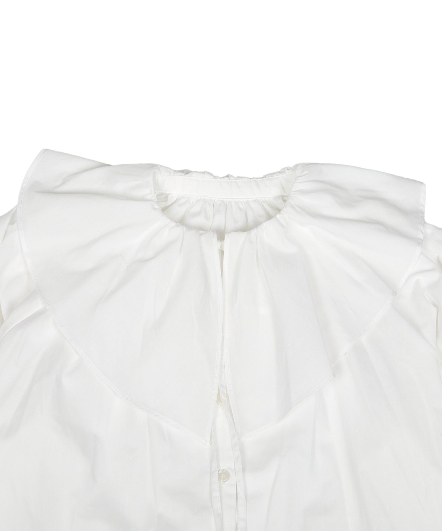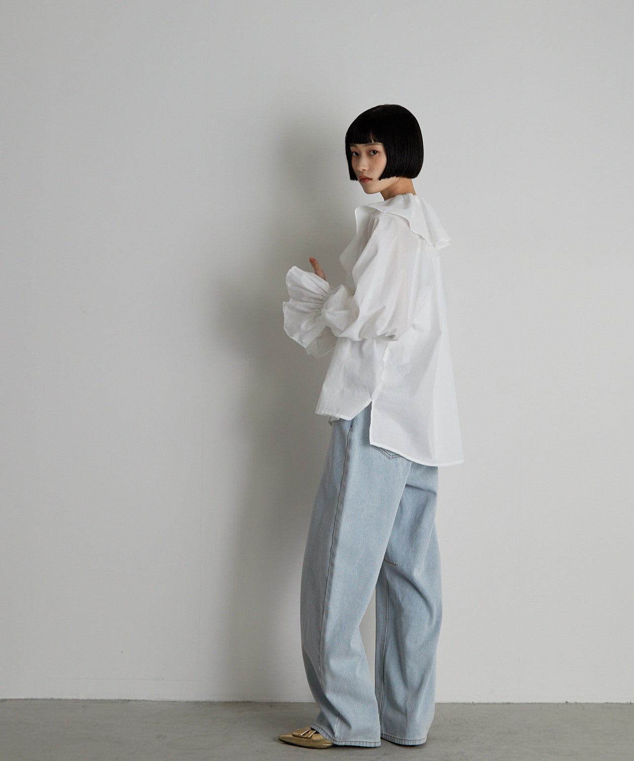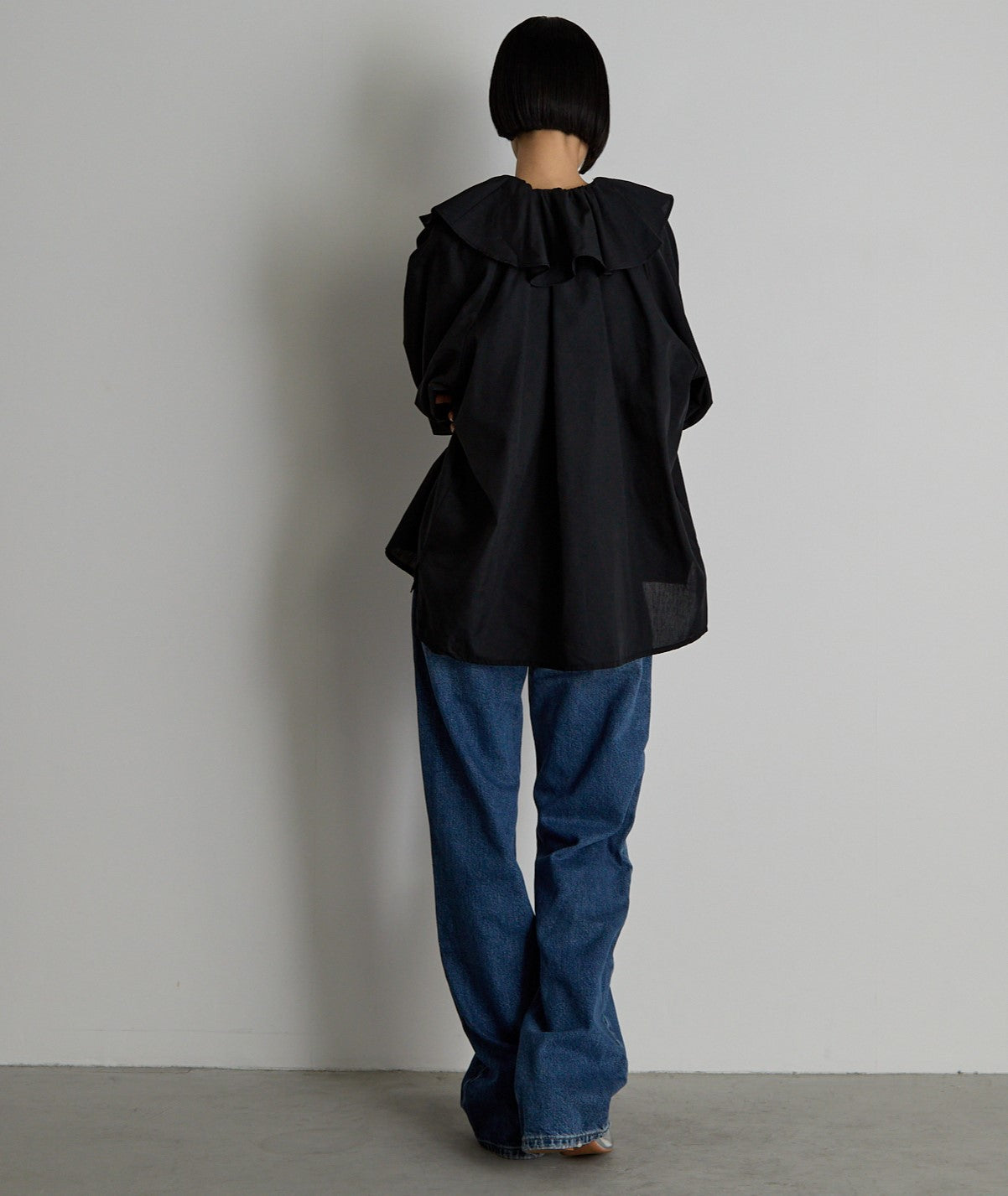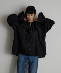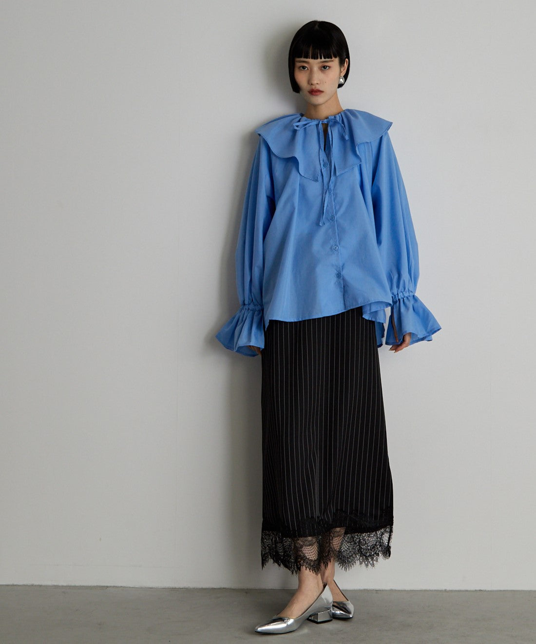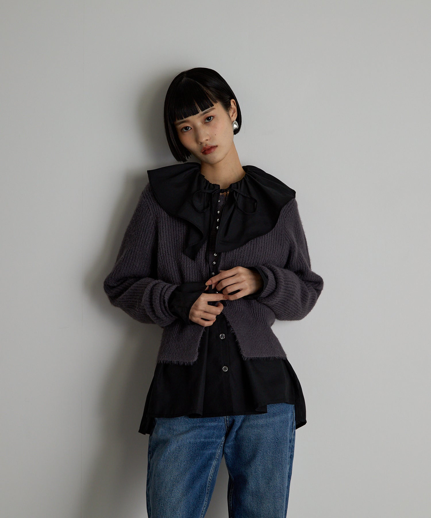 大きな襟のフリルとリボンタイが特徴的で、クラシカルかつフェミニンな雰囲気を演出しています。ボリュームのある袖口もポイントで、全体的に軽やかで華やかな印象を与えています。アウター、ニットなどのアイテムとのレイヤード使いにも◎