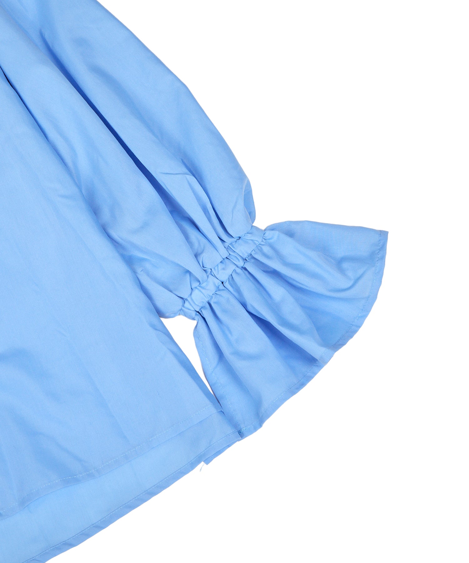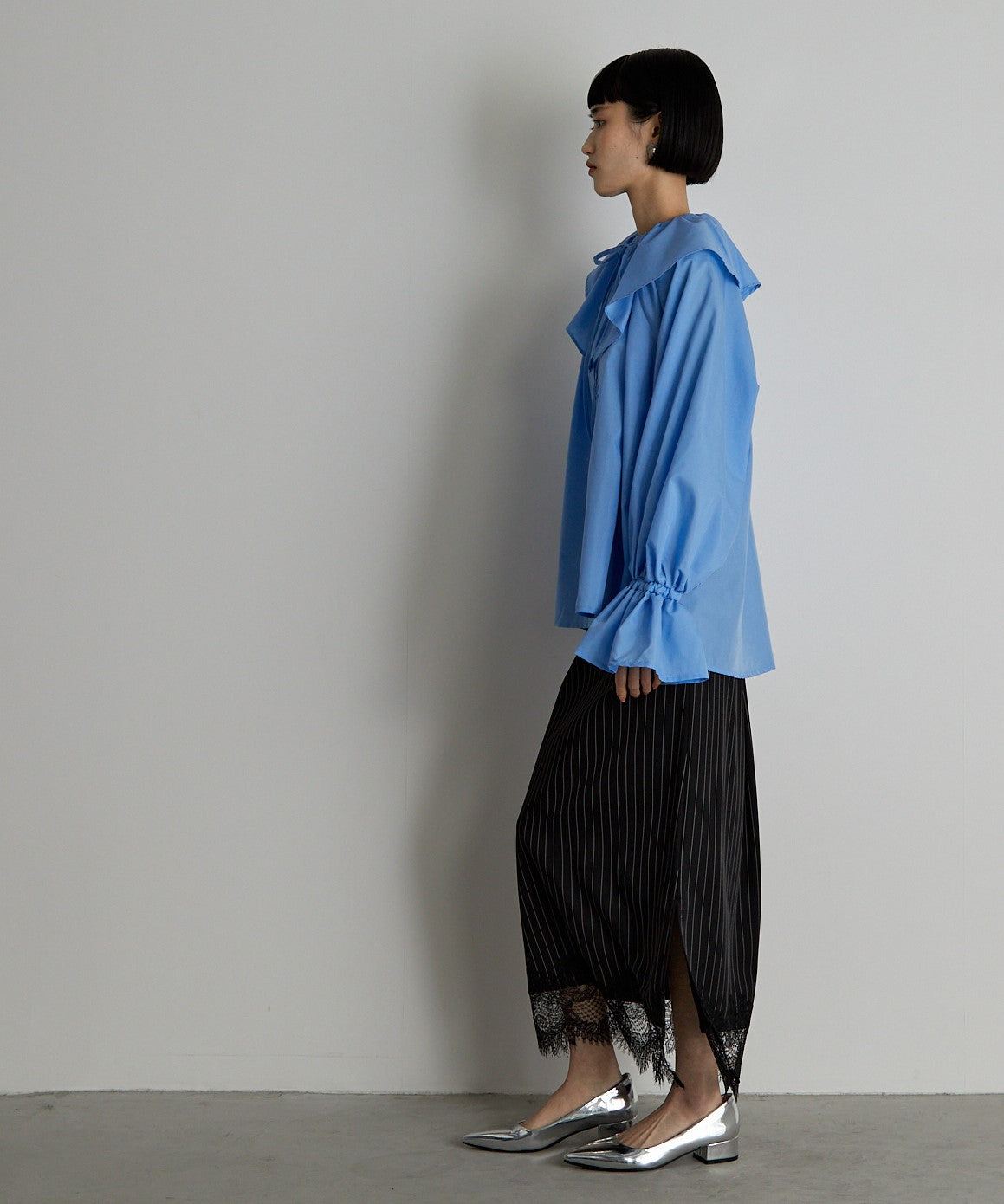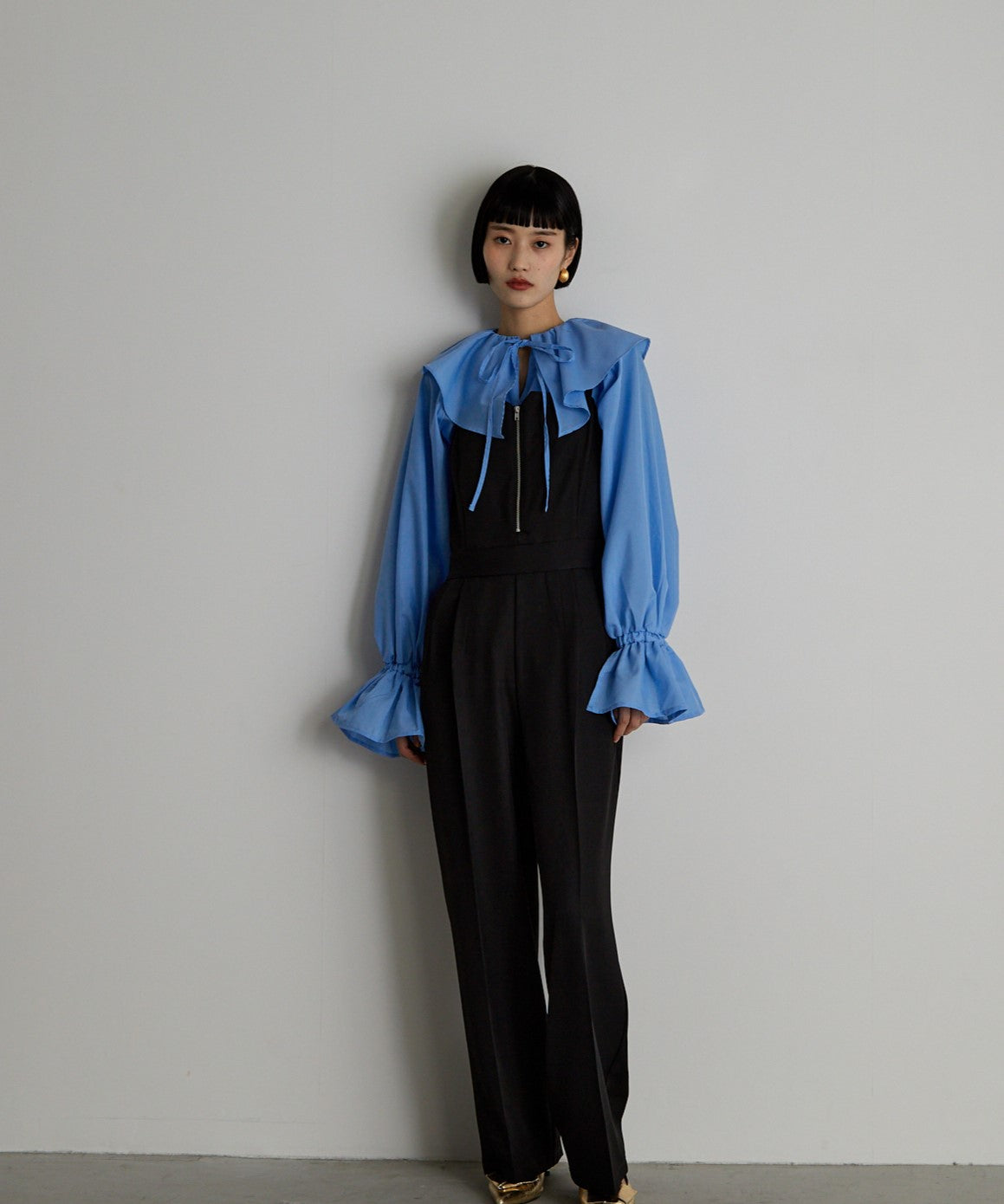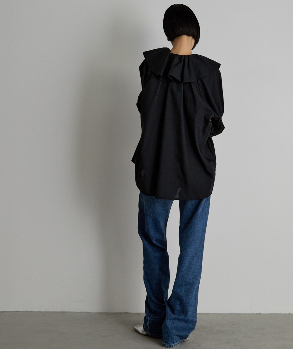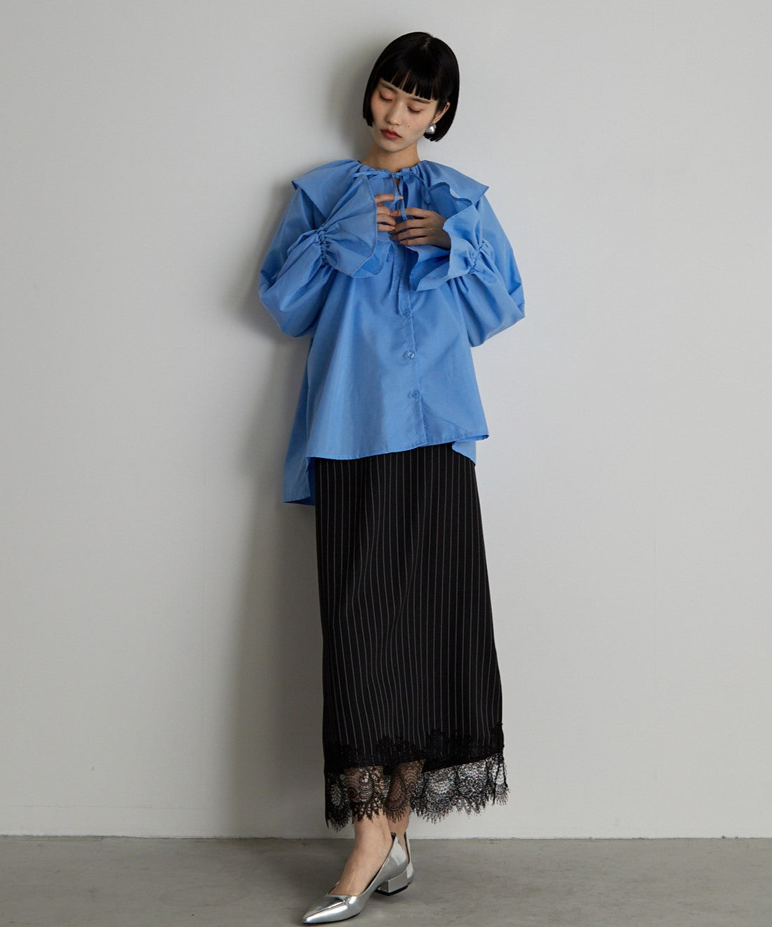 大きな襟のフリルとリボンタイが特徴的で、クラシカルかつフェミニンな雰囲気を演出しています。ボリュームのある袖口もポイントで、全体的に軽やかで華やかな印象を与えています。アウター、ニットなどのアイテムとのレイヤード使いにも◎