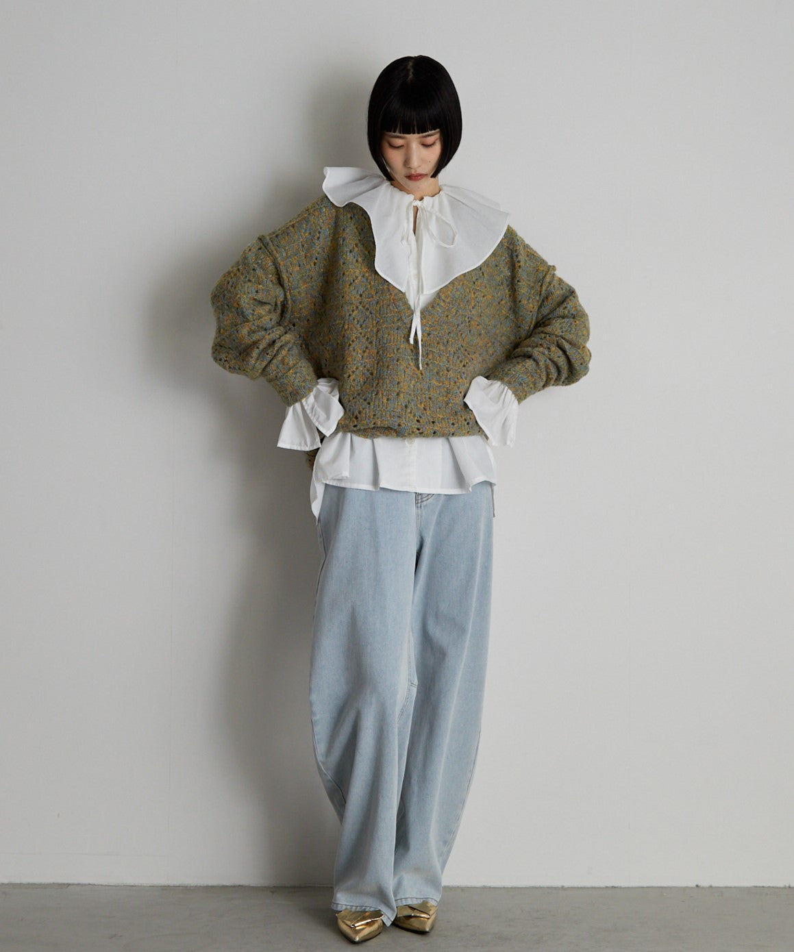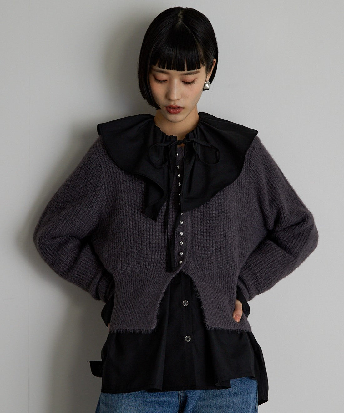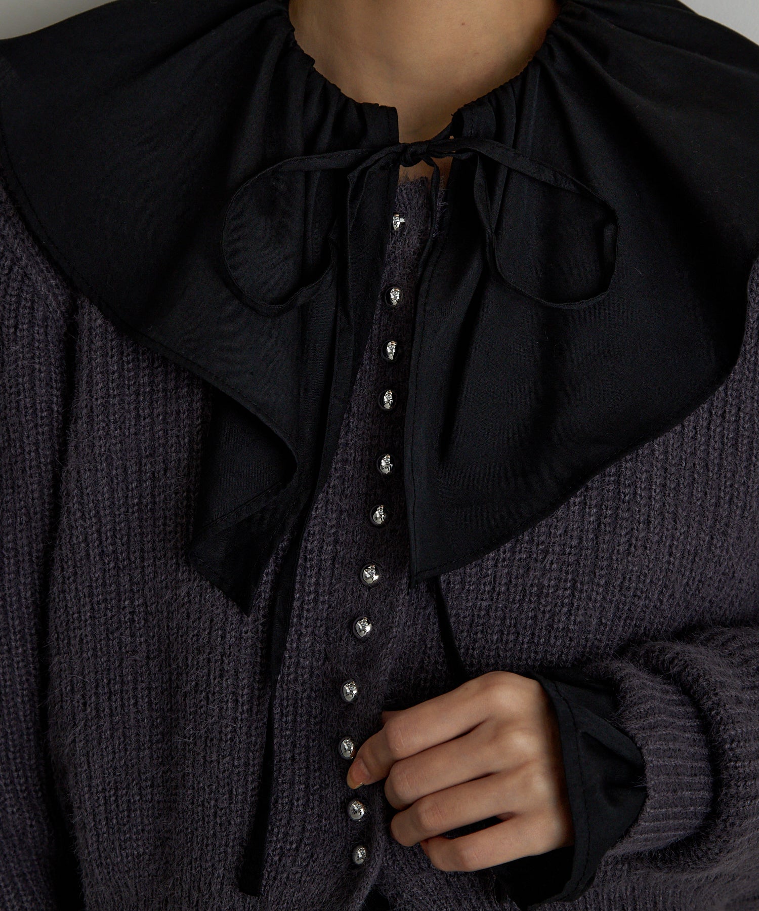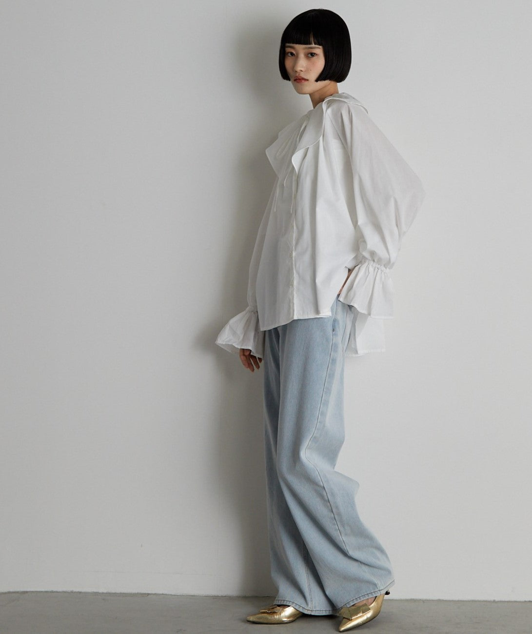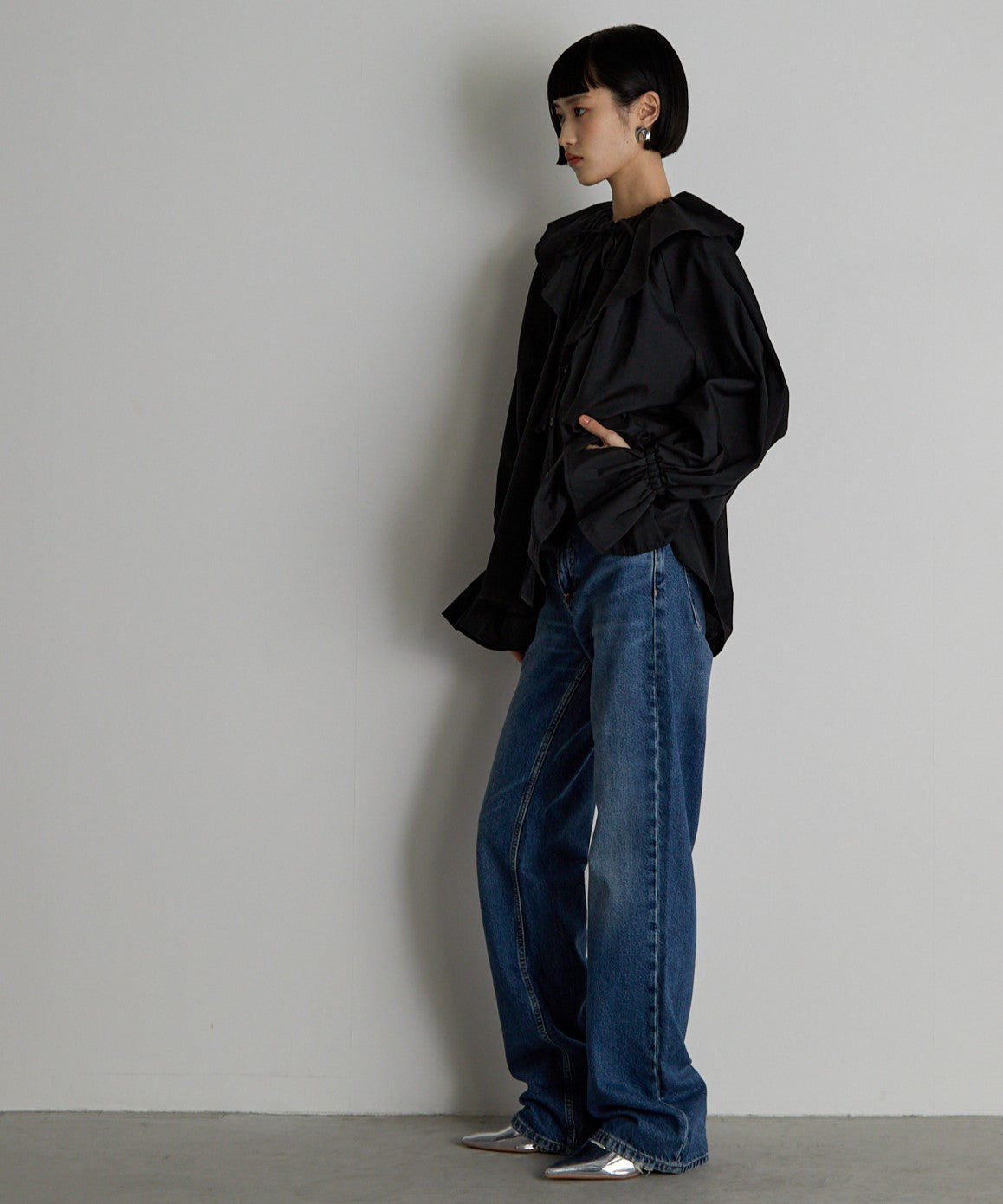 大きな襟のフリルとリボンタイが特徴的で、クラシカルかつフェミニンな雰囲気を演出しています。ボリュームのある袖口もポイントで、全体的に軽やかで華やかな印象を与えています。アウター、ニットなどのアイテムとのレイヤード使いにも◎