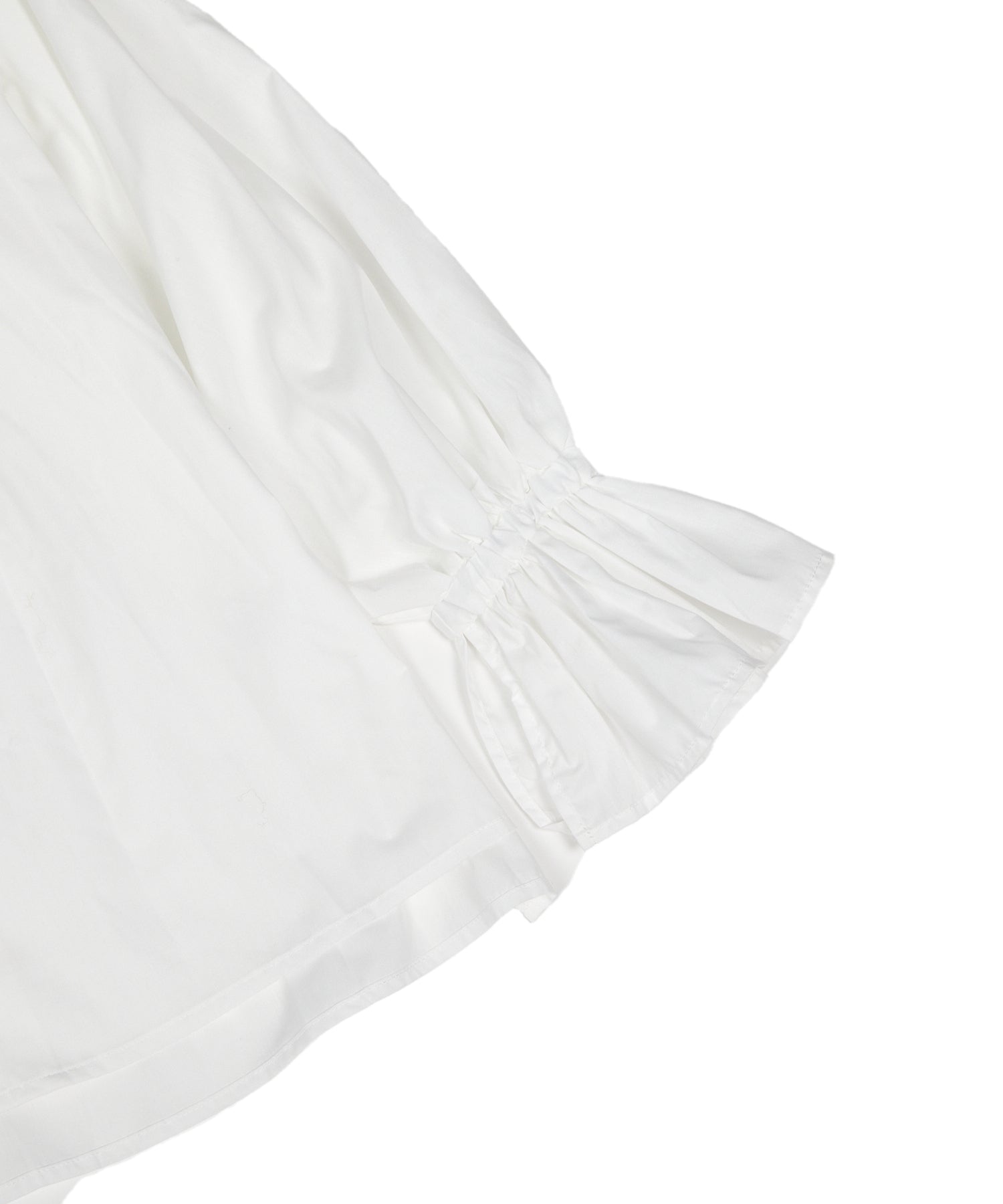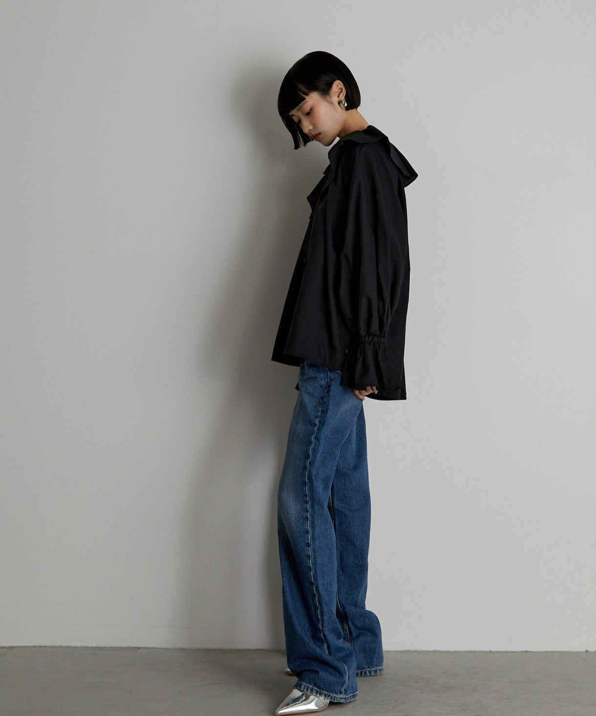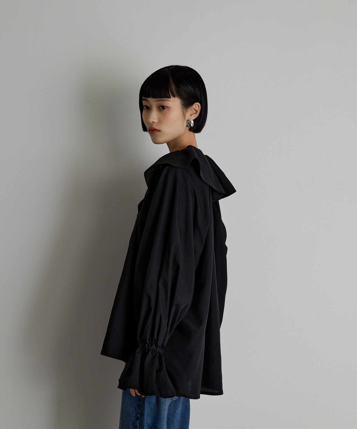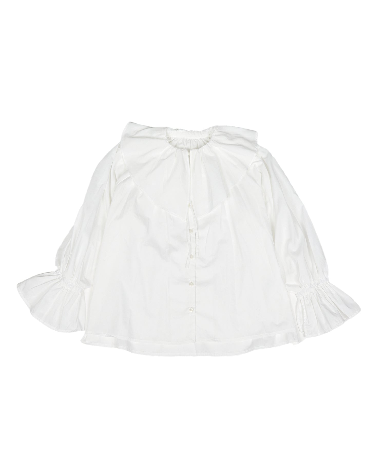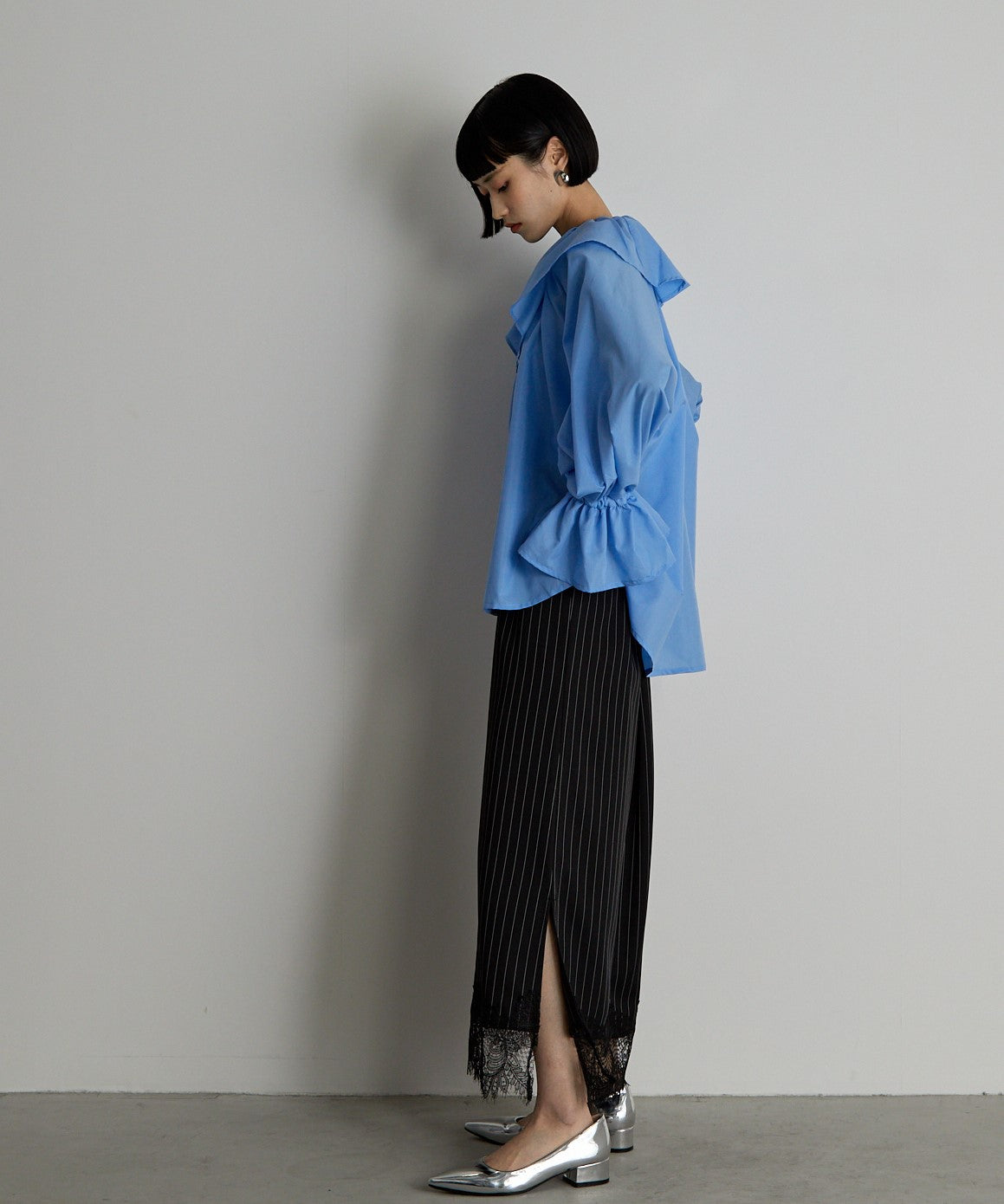 大きな襟のフリルとリボンタイが特徴的で、クラシカルかつフェミニンな雰囲気を演出しています。ボリュームのある袖口もポイントで、全体的に軽やかで華やかな印象を与えています。アウター、ニットなどのアイテムとのレイヤード使いにも◎