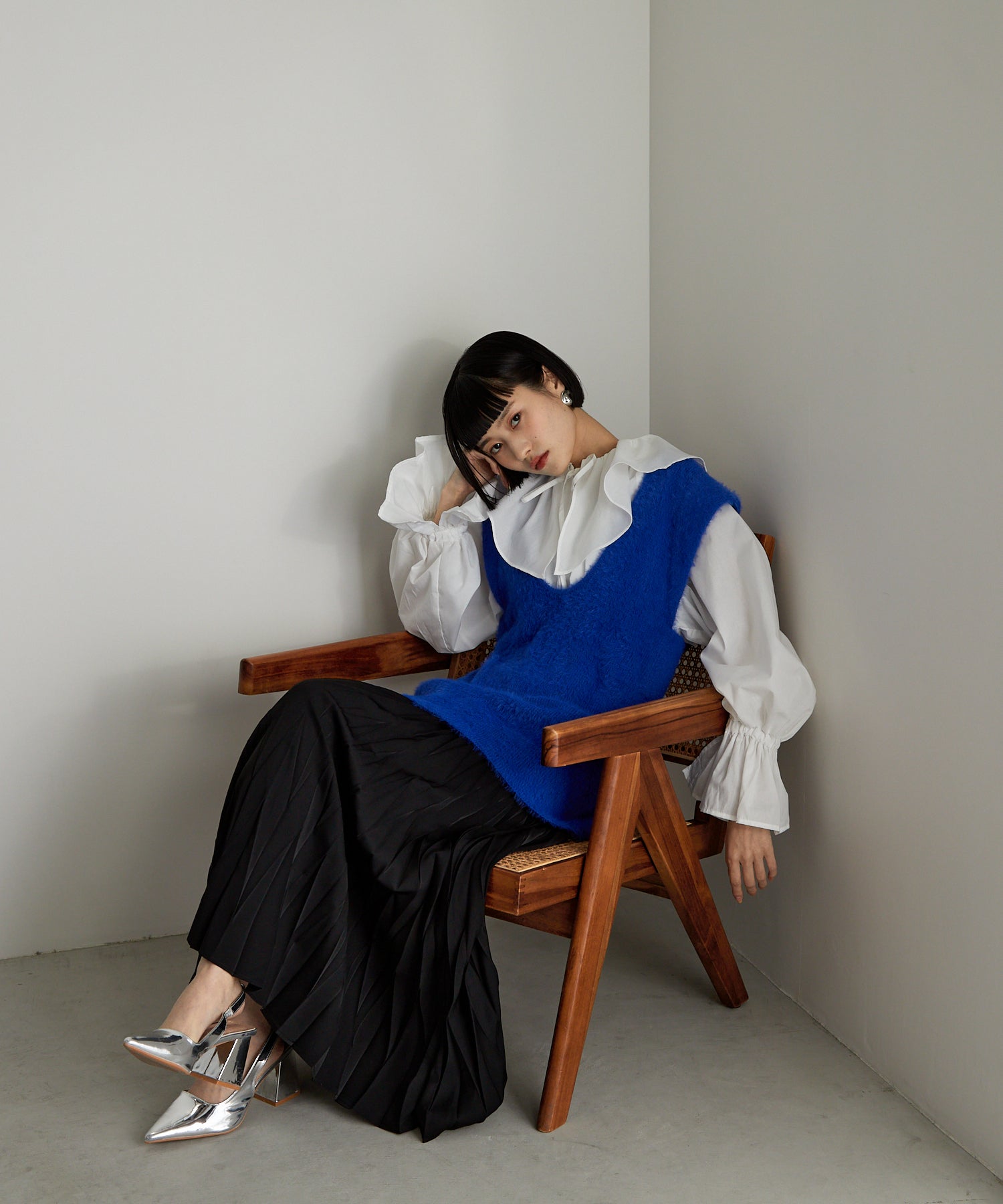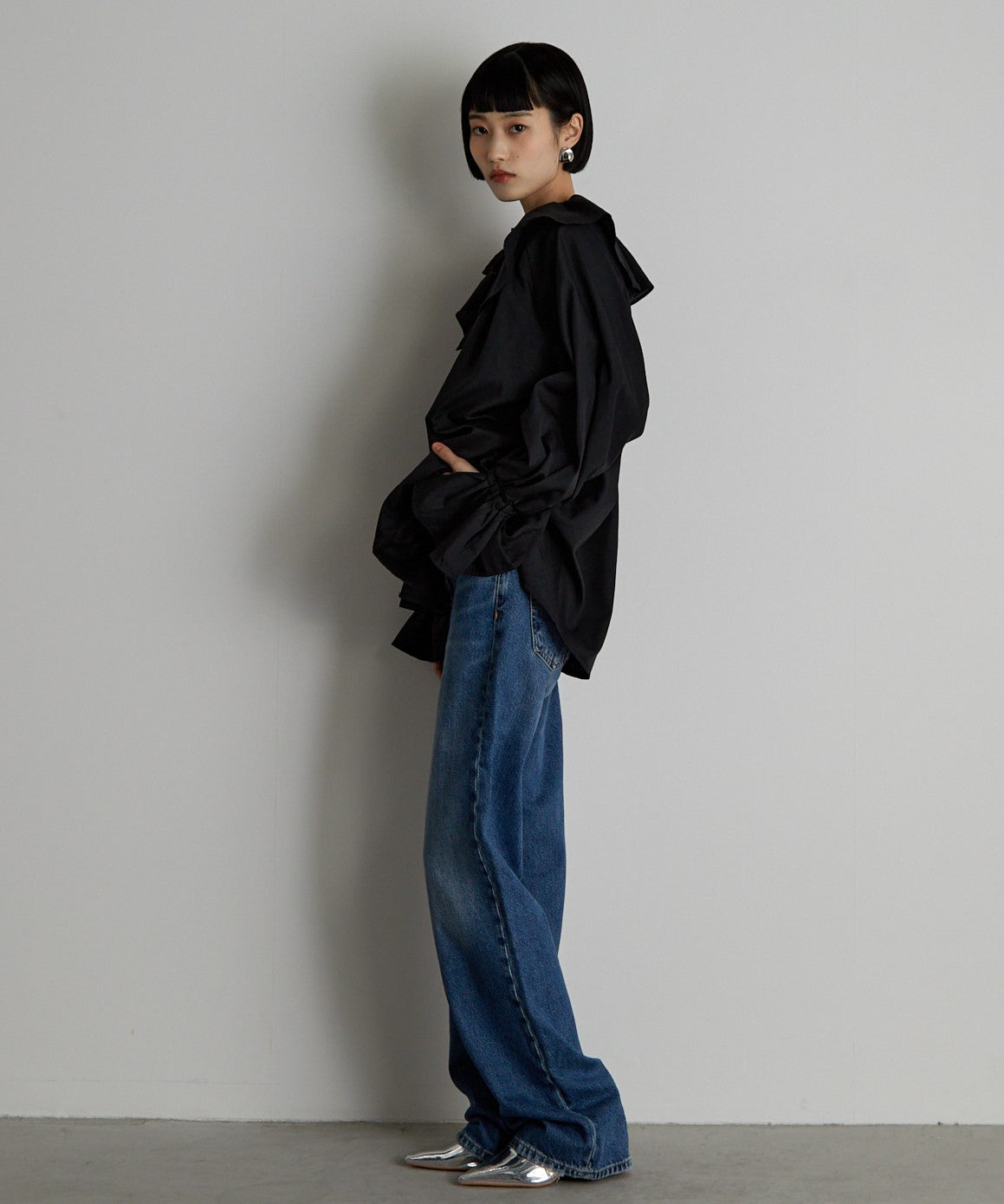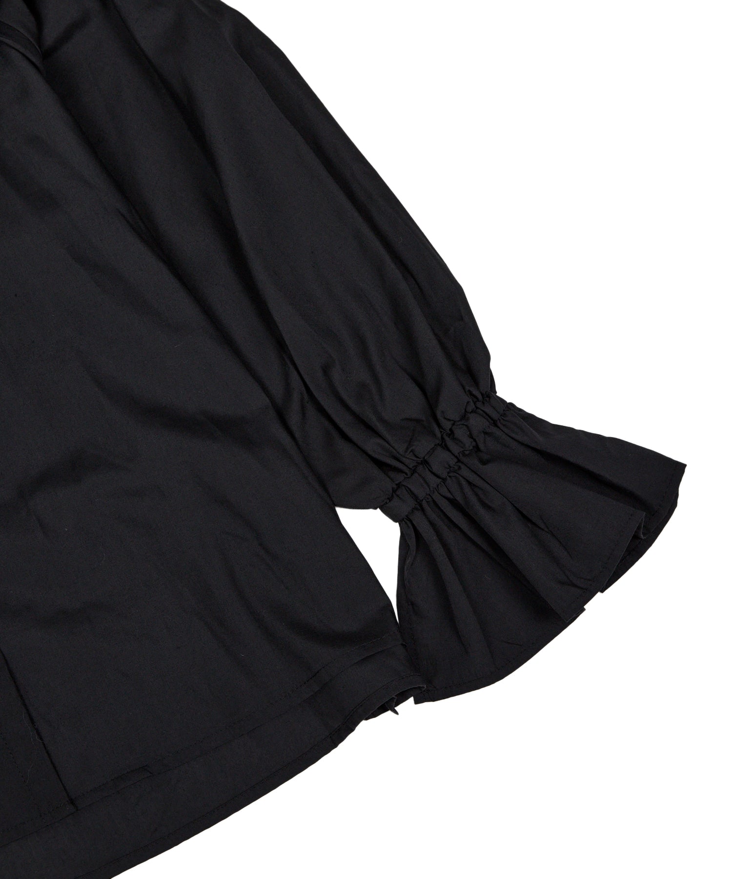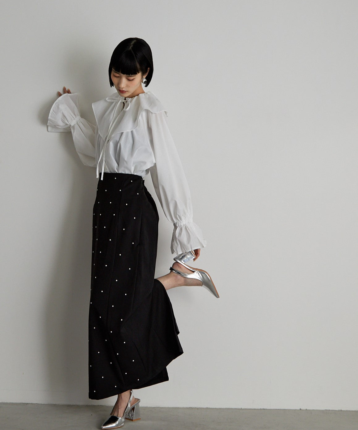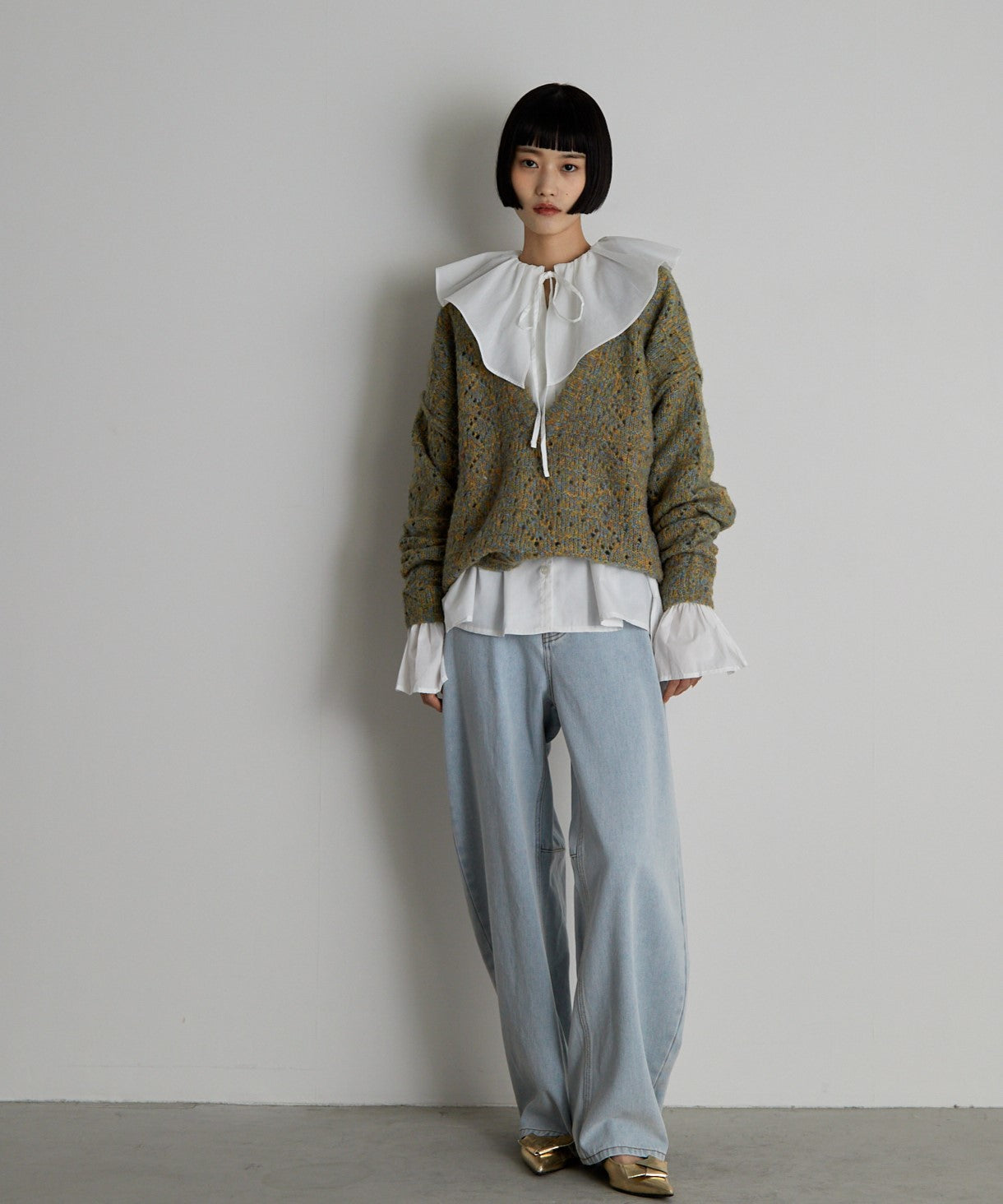 大きな襟のフリルとリボンタイが特徴的で、クラシカルかつフェミニンな雰囲気を演出しています。ボリュームのある袖口もポイントで、全体的に軽やかで華やかな印象を与えています。アウター、ニットなどのアイテムとのレイヤード使いにも◎