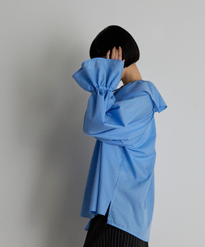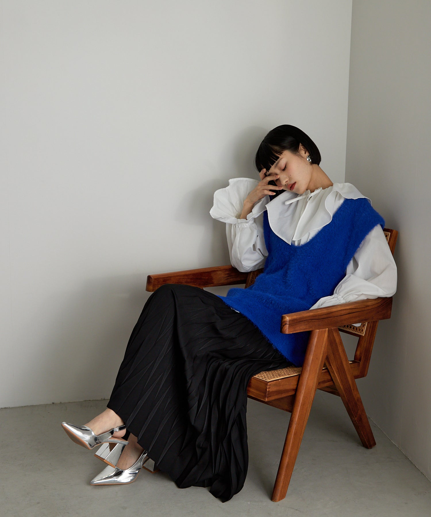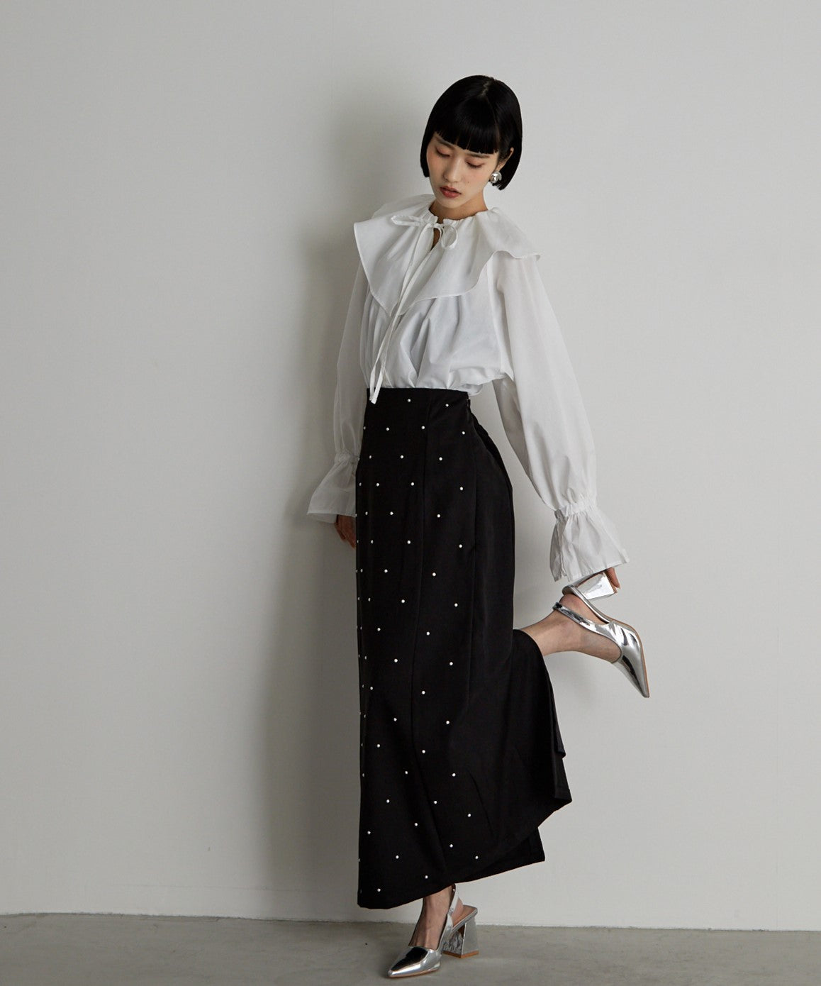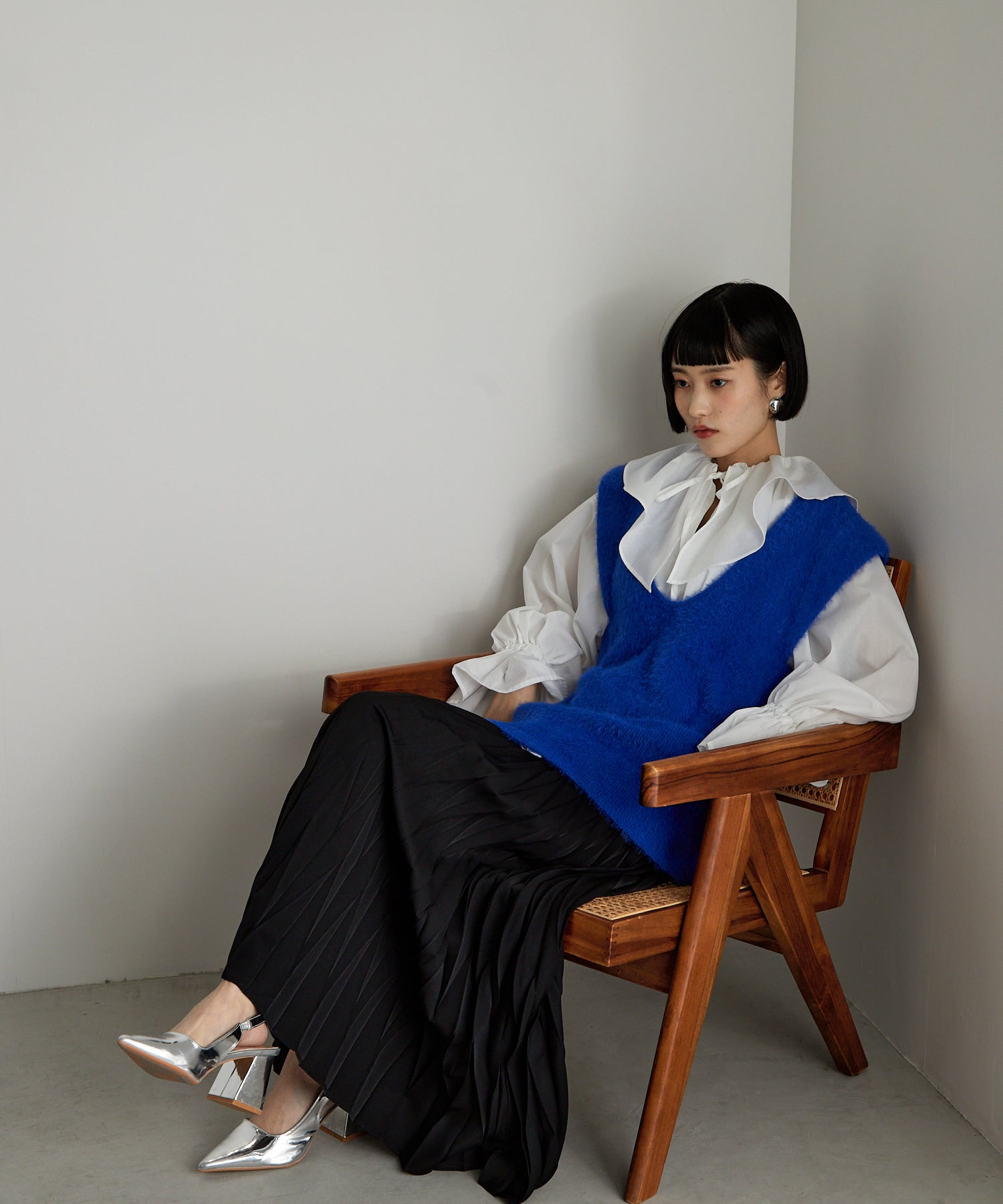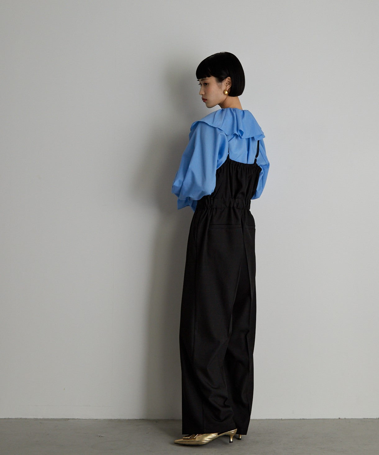 大きな襟のフリルとリボンタイが特徴的で、クラシカルかつフェミニンな雰囲気を演出しています。ボリュームのある袖口もポイントで、全体的に軽やかで華やかな印象を与えています。アウター、ニットなどのアイテムとのレイヤード使いにも◎
