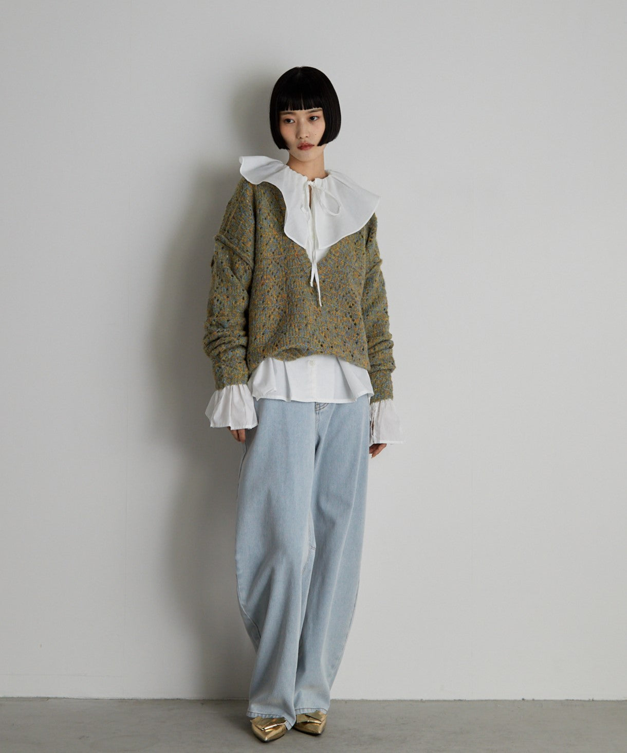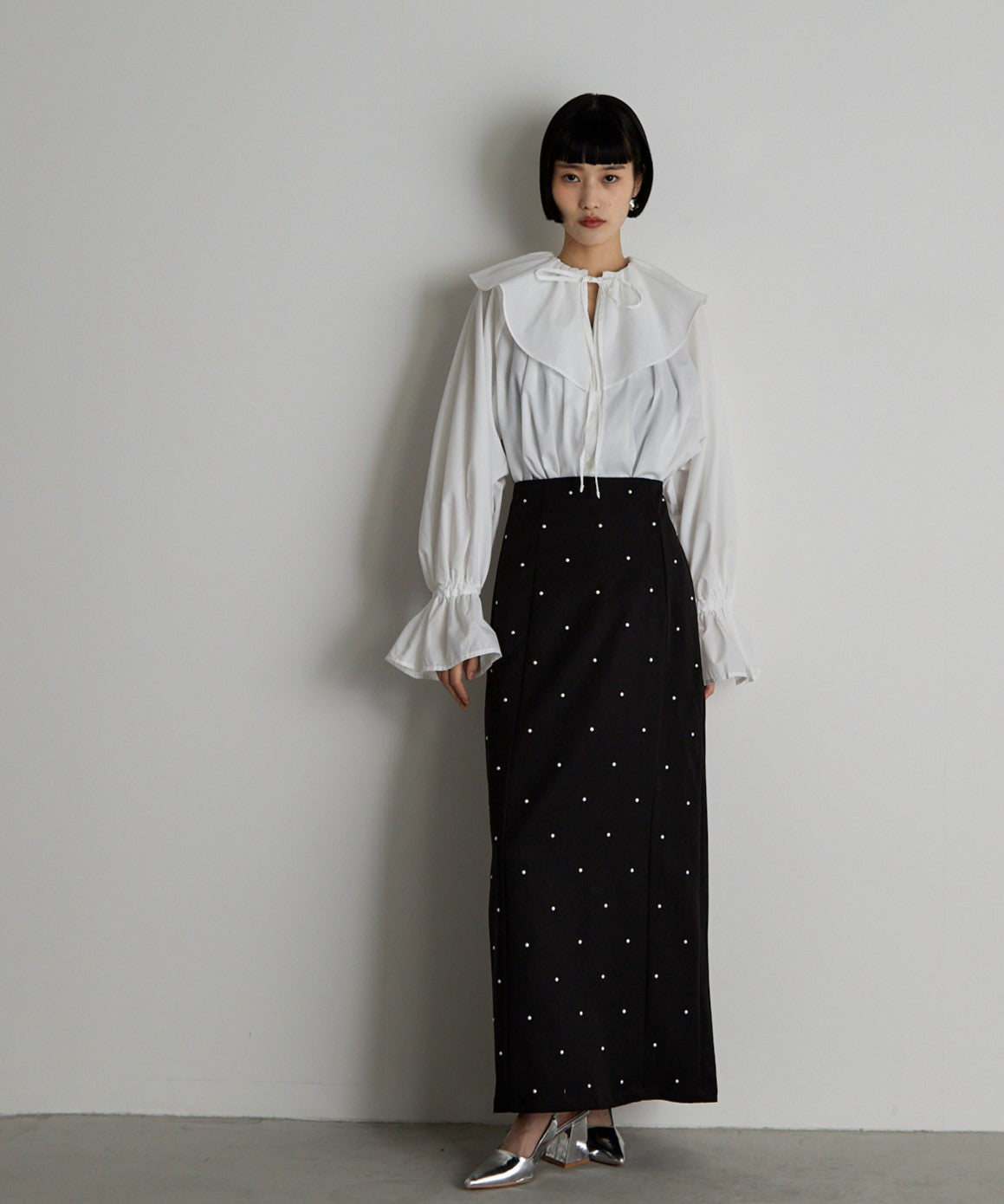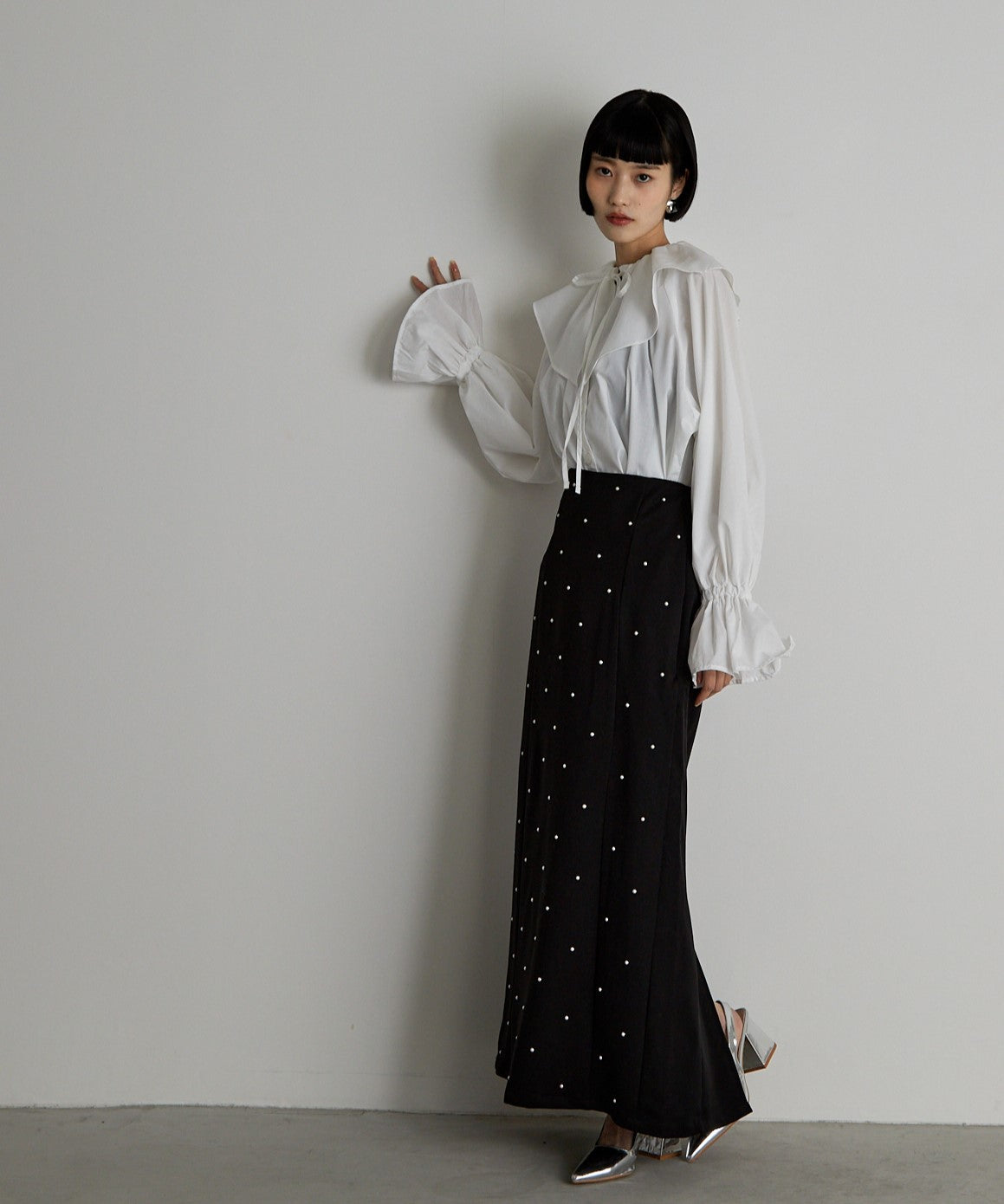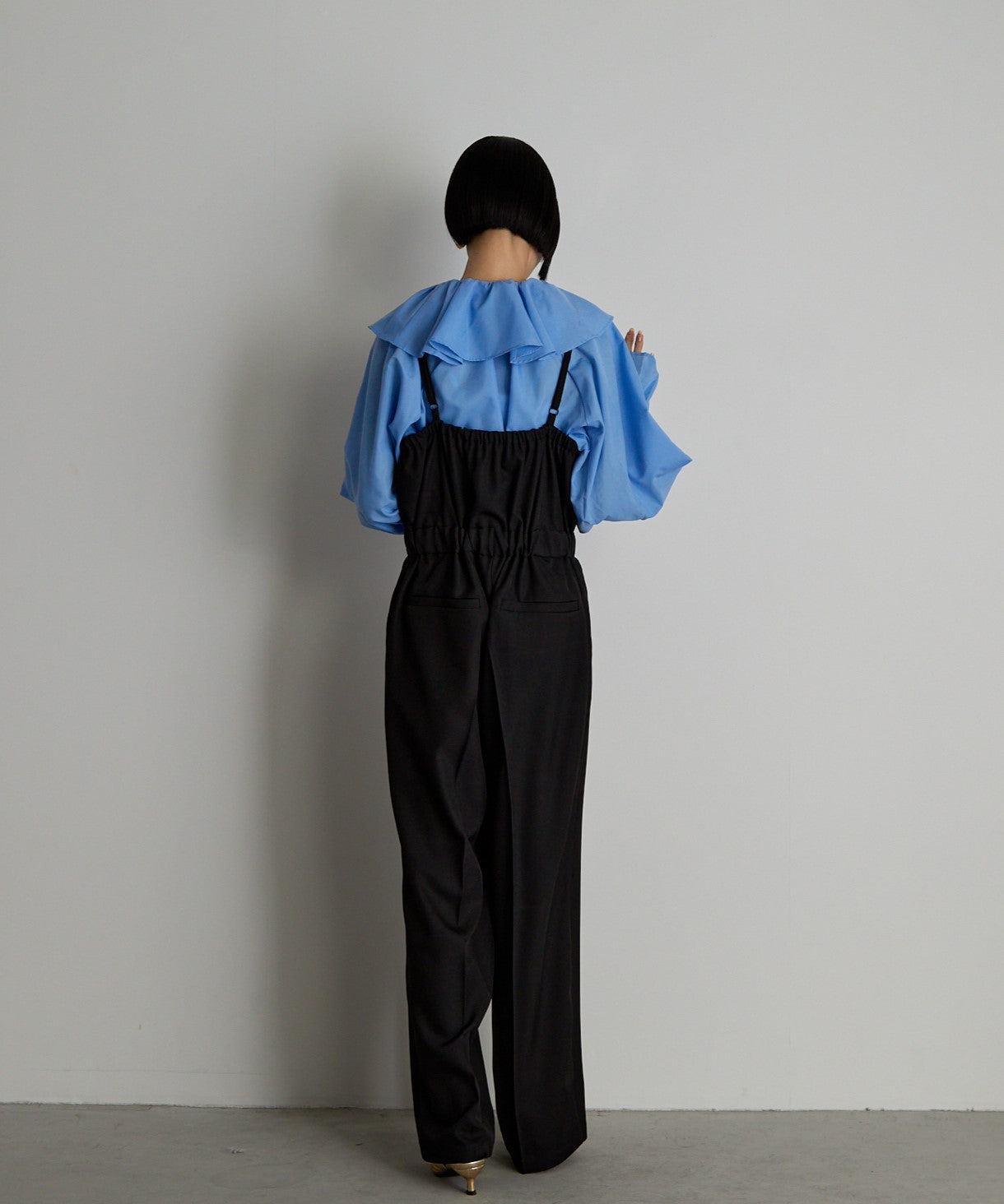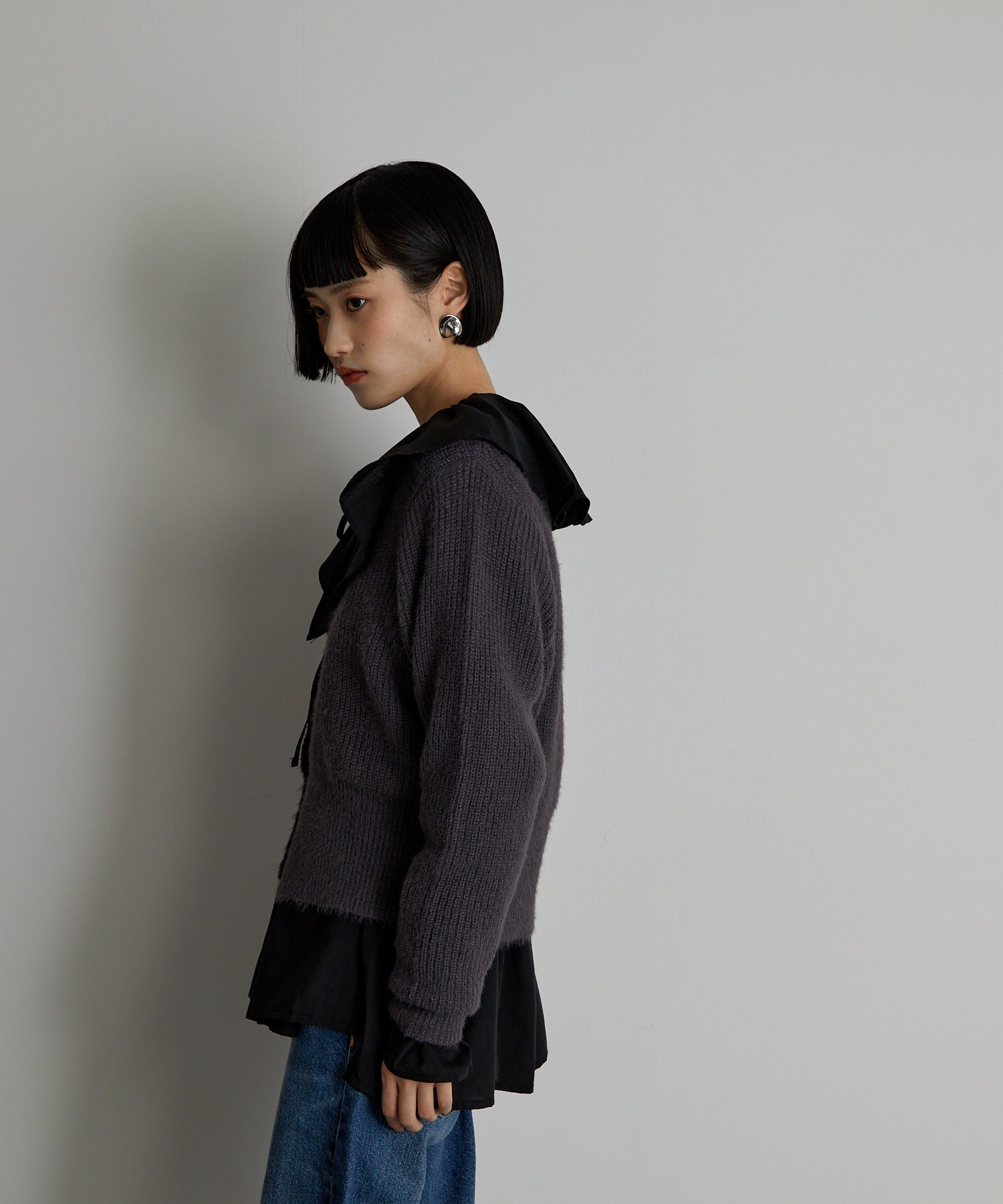 大きな襟のフリルとリボンタイが特徴的で、クラシカルかつフェミニンな雰囲気を演出しています。ボリュームのある袖口もポイントで、全体的に軽やかで華やかな印象を与えています。アウター、ニットなどのアイテムとのレイヤード使いにも◎