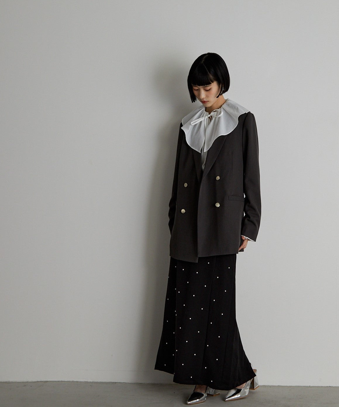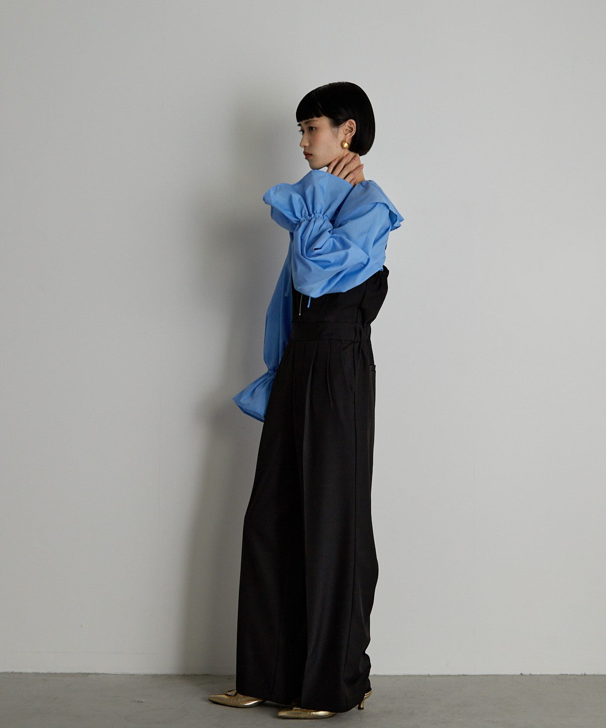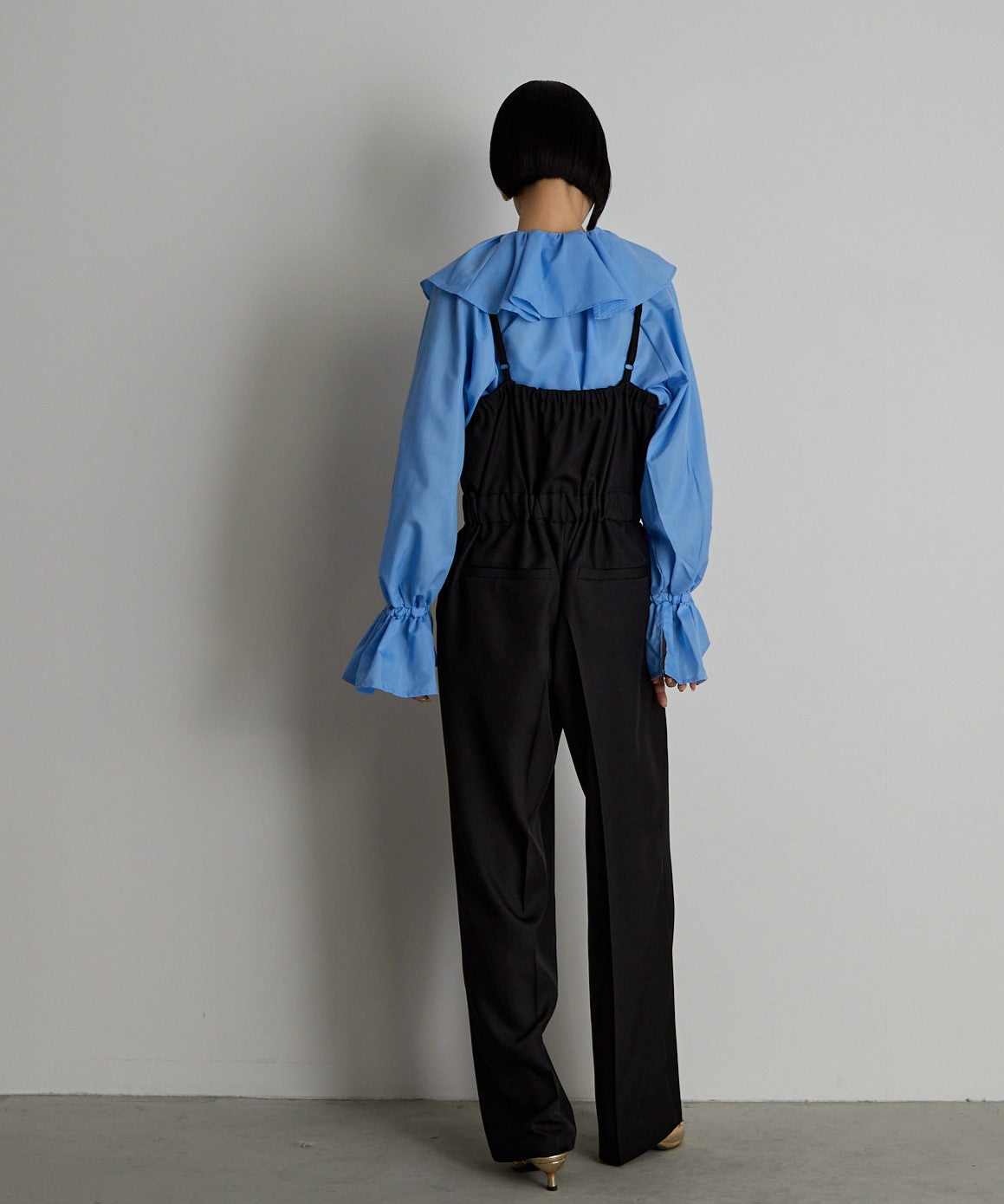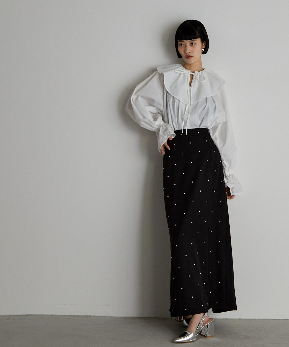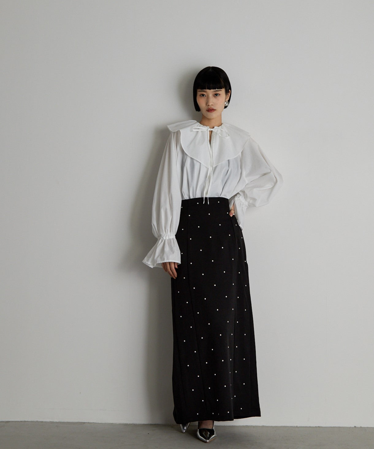 大きな襟のフリルとリボンタイが特徴的で、クラシカルかつフェミニンな雰囲気を演出しています。ボリュームのある袖口もポイントで、全体的に軽やかで華やかな印象を与えています。アウター、ニットなどのアイテムとのレイヤード使いにも◎