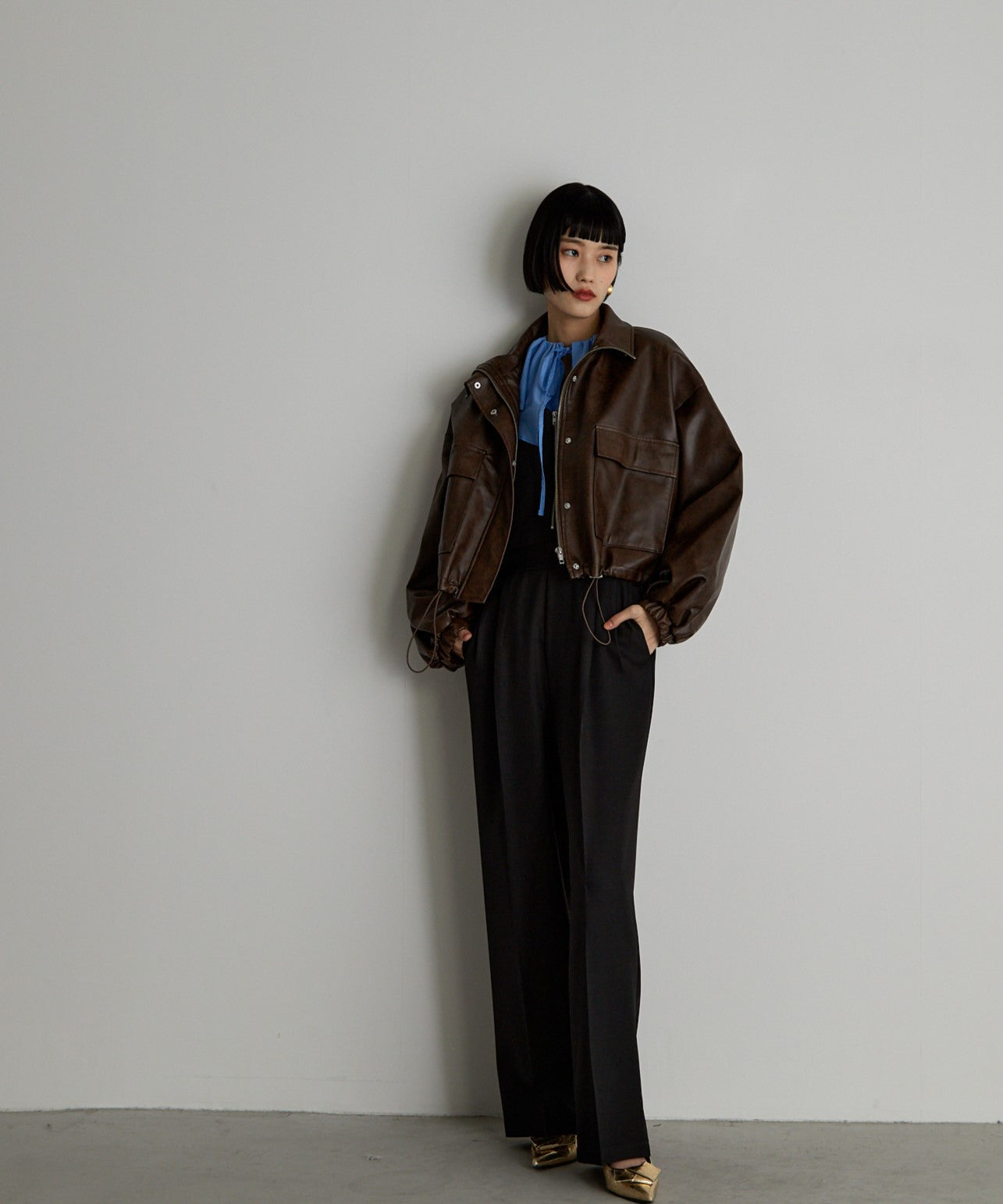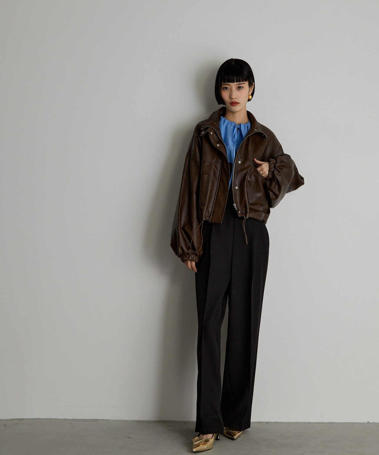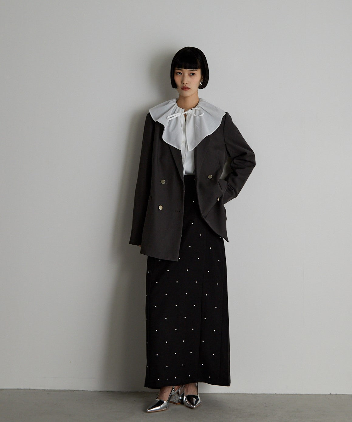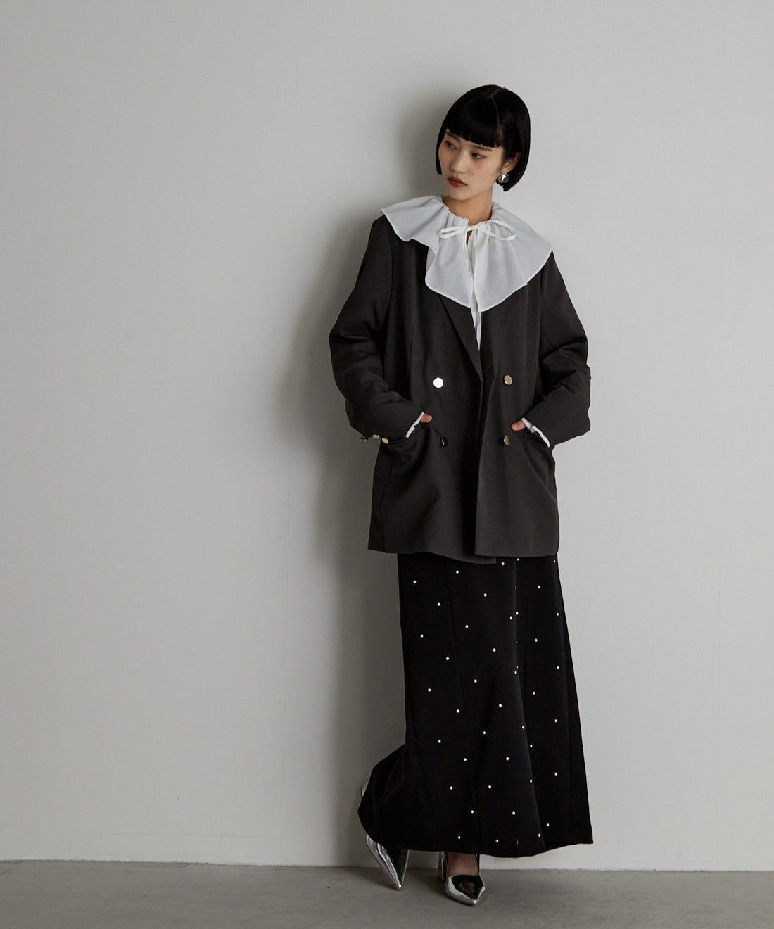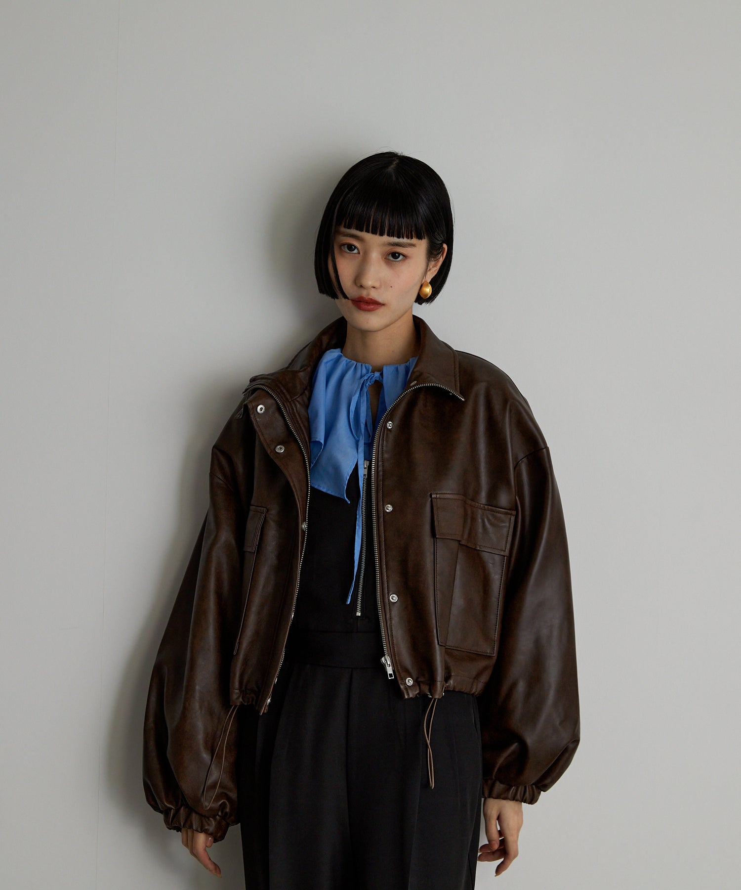 大きな襟のフリルとリボンタイが特徴的で、クラシカルかつフェミニンな雰囲気を演出しています。ボリュームのある袖口もポイントで、全体的に軽やかで華やかな印象を与えています。アウター、ニットなどのアイテムとのレイヤード使いにも◎