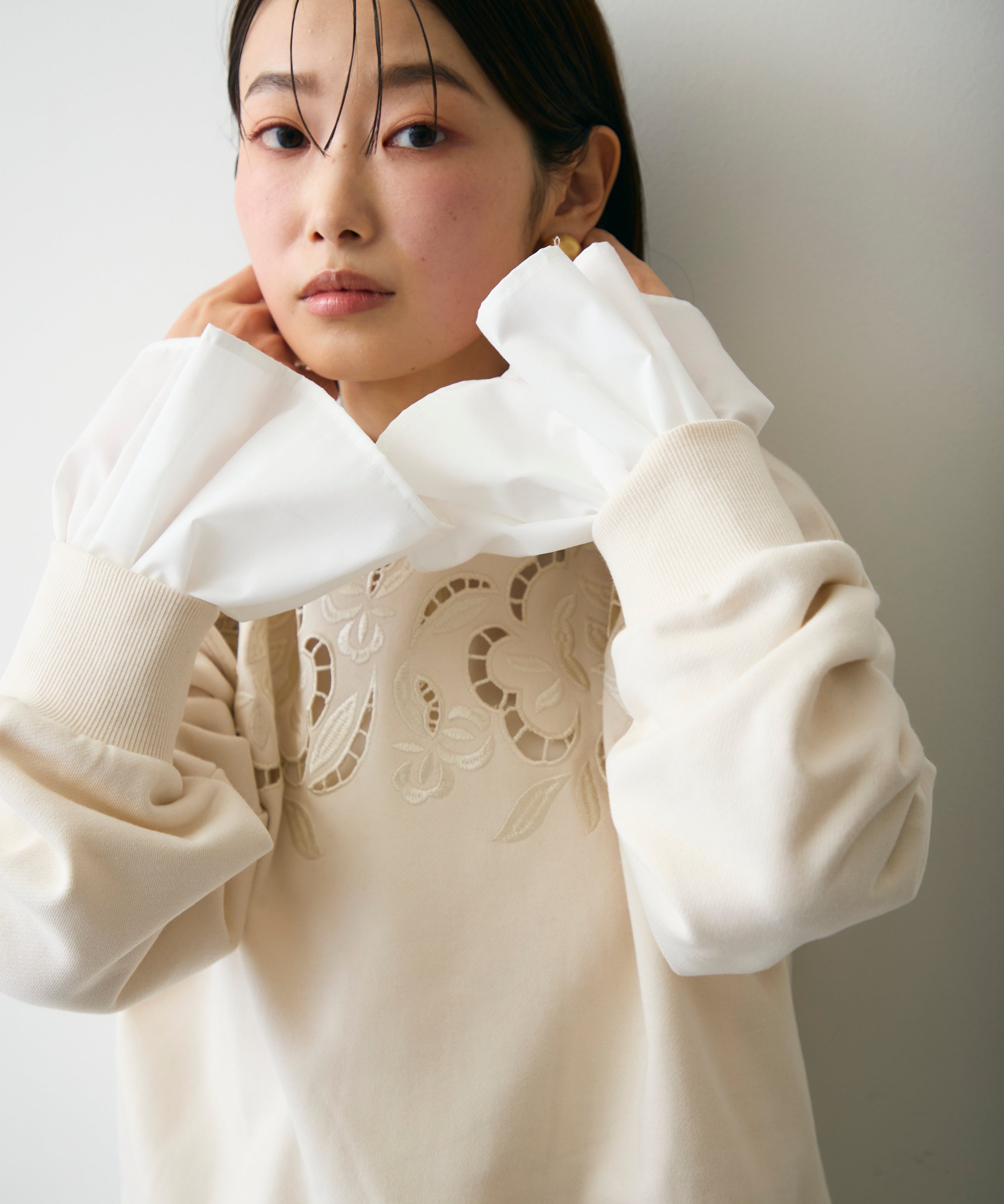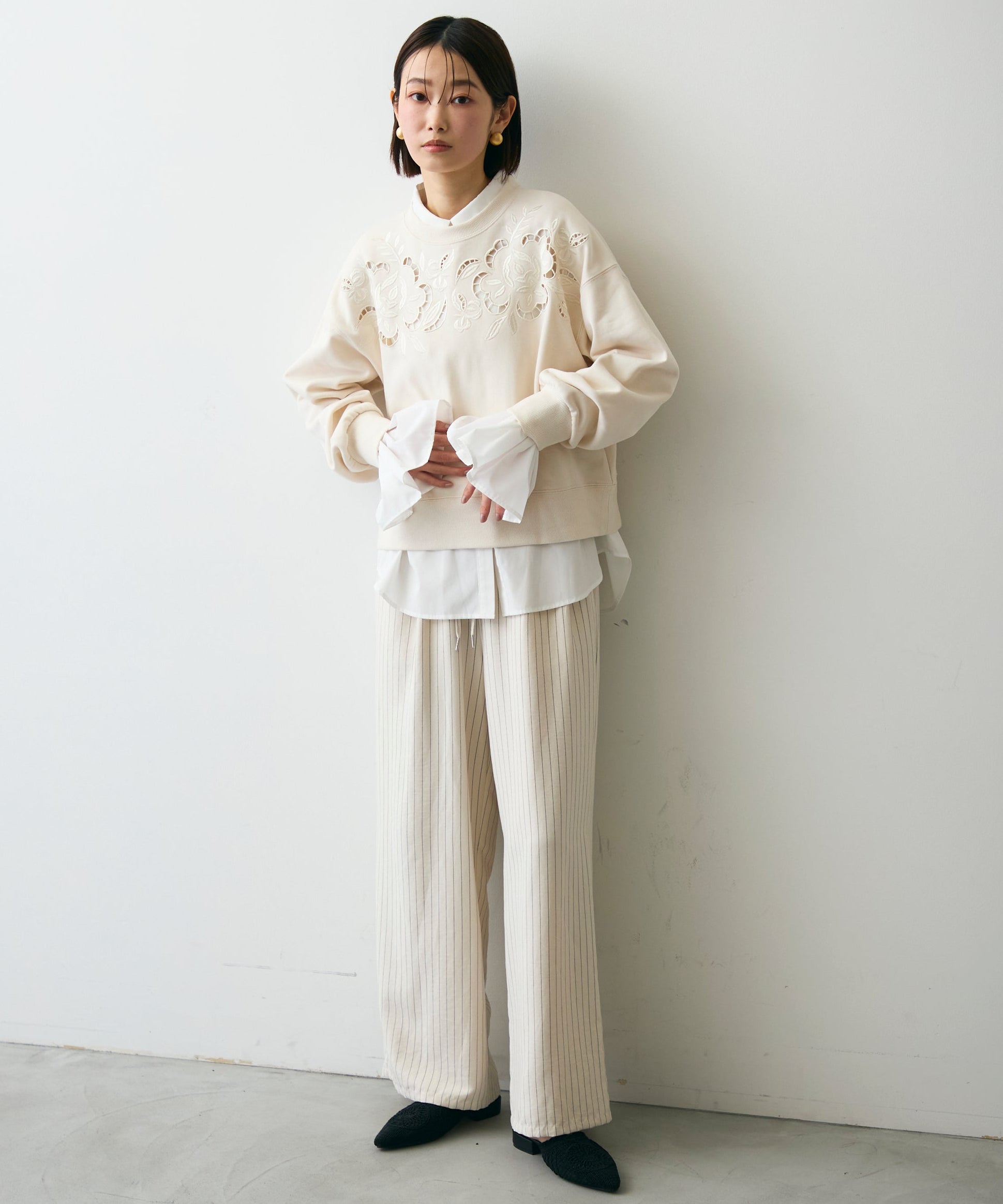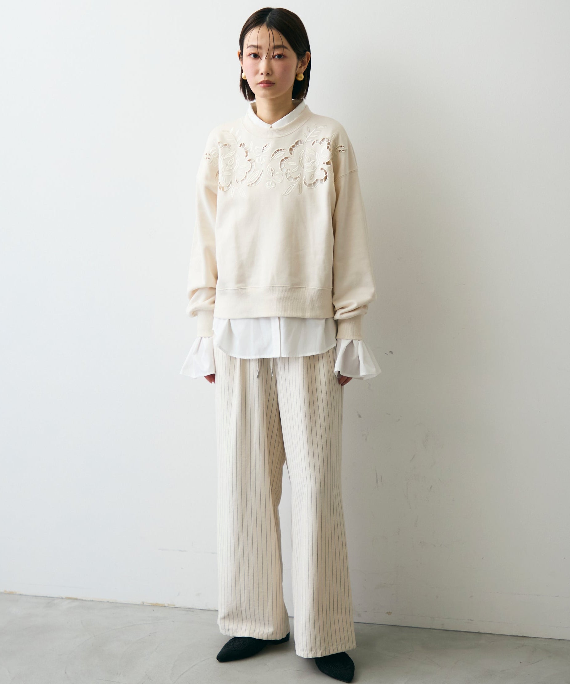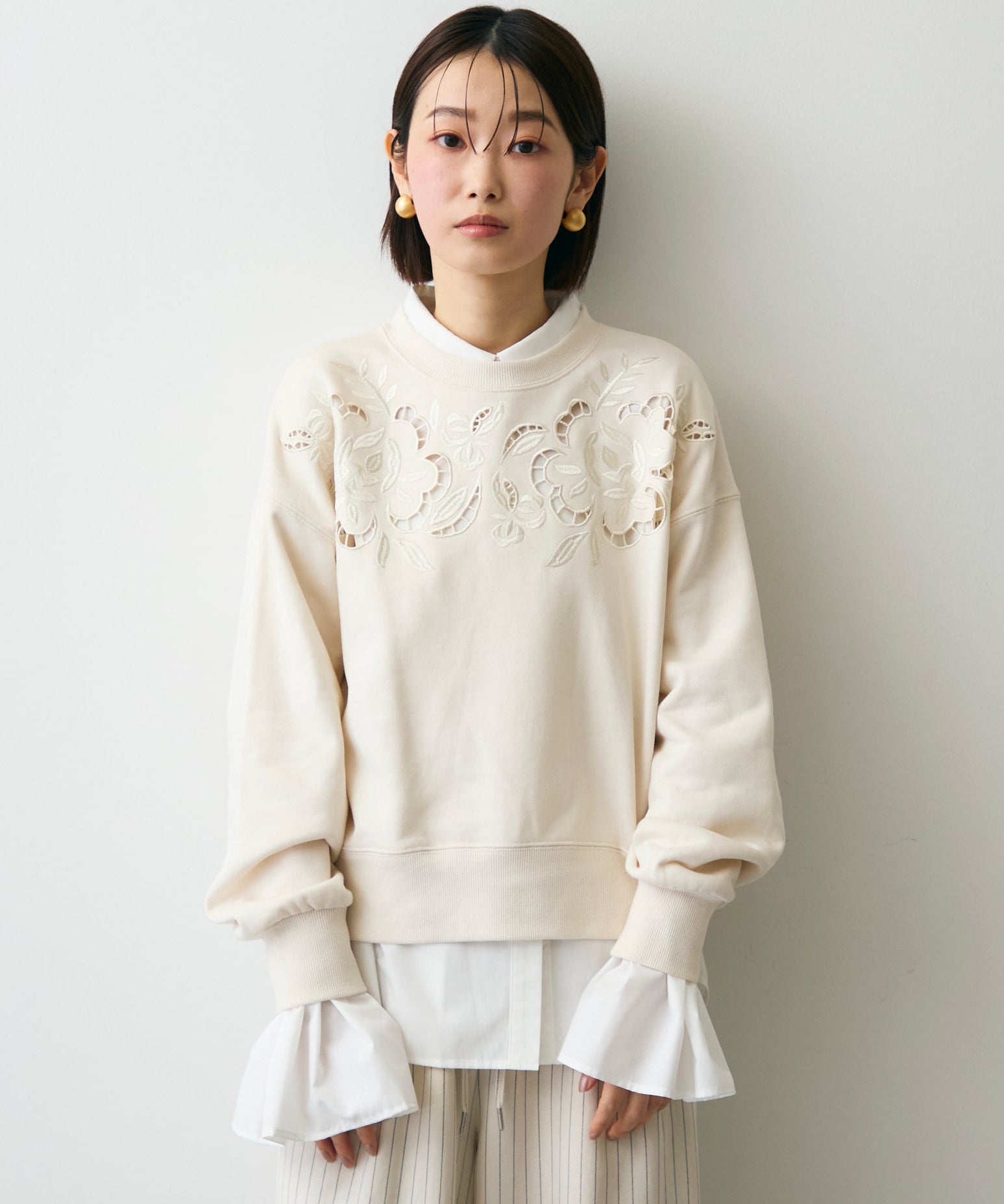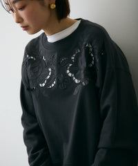 ふんわりとした裏毛素材に、上品なフラワーカットワーク刺繍をあしらった大人可愛いプルオーバー。