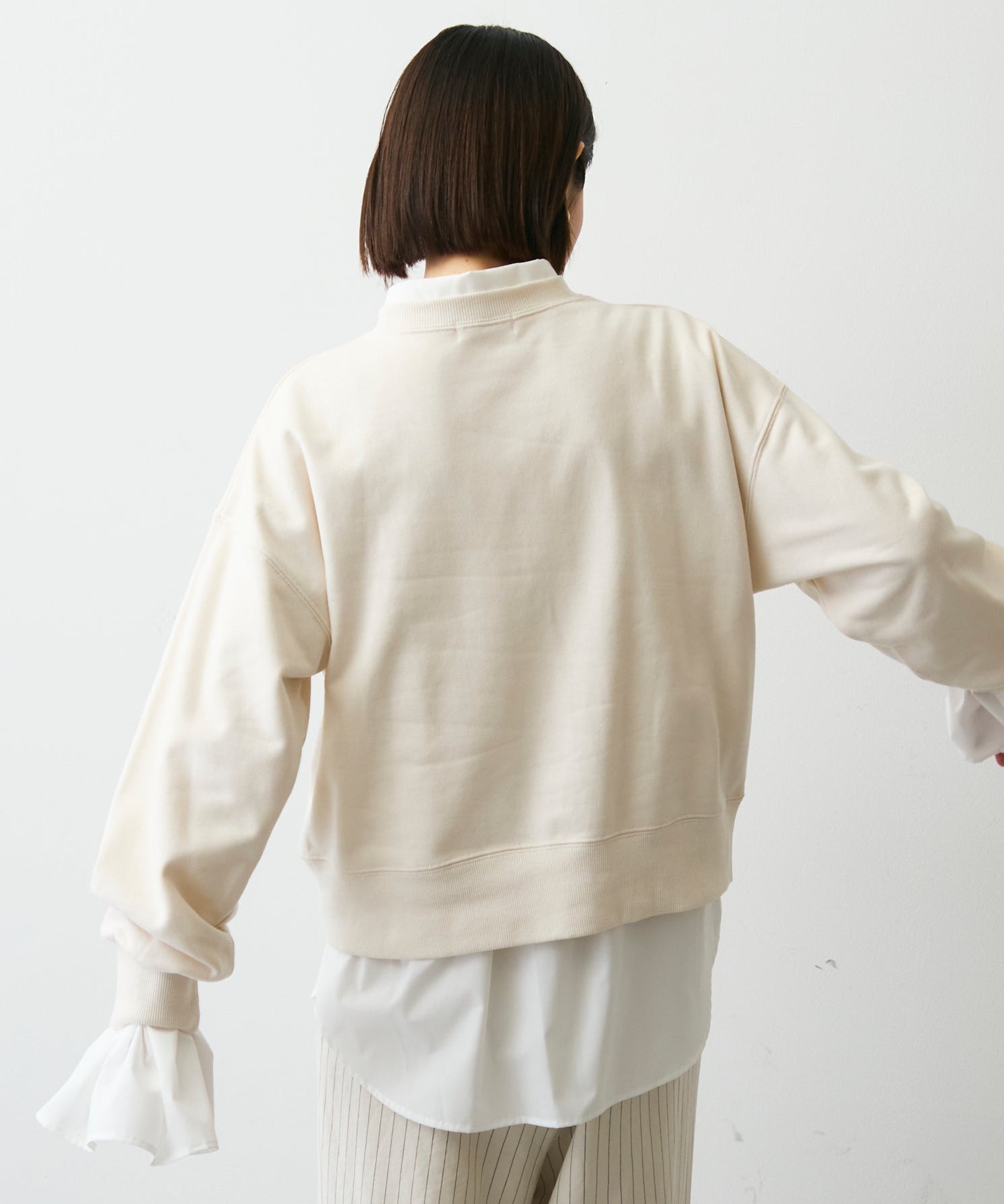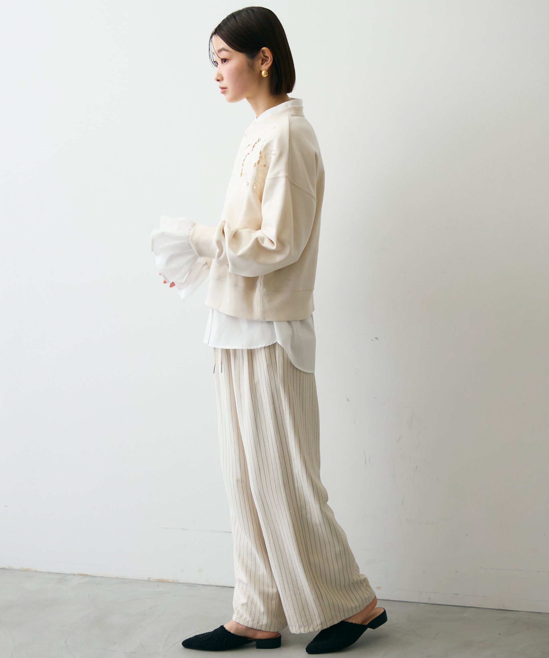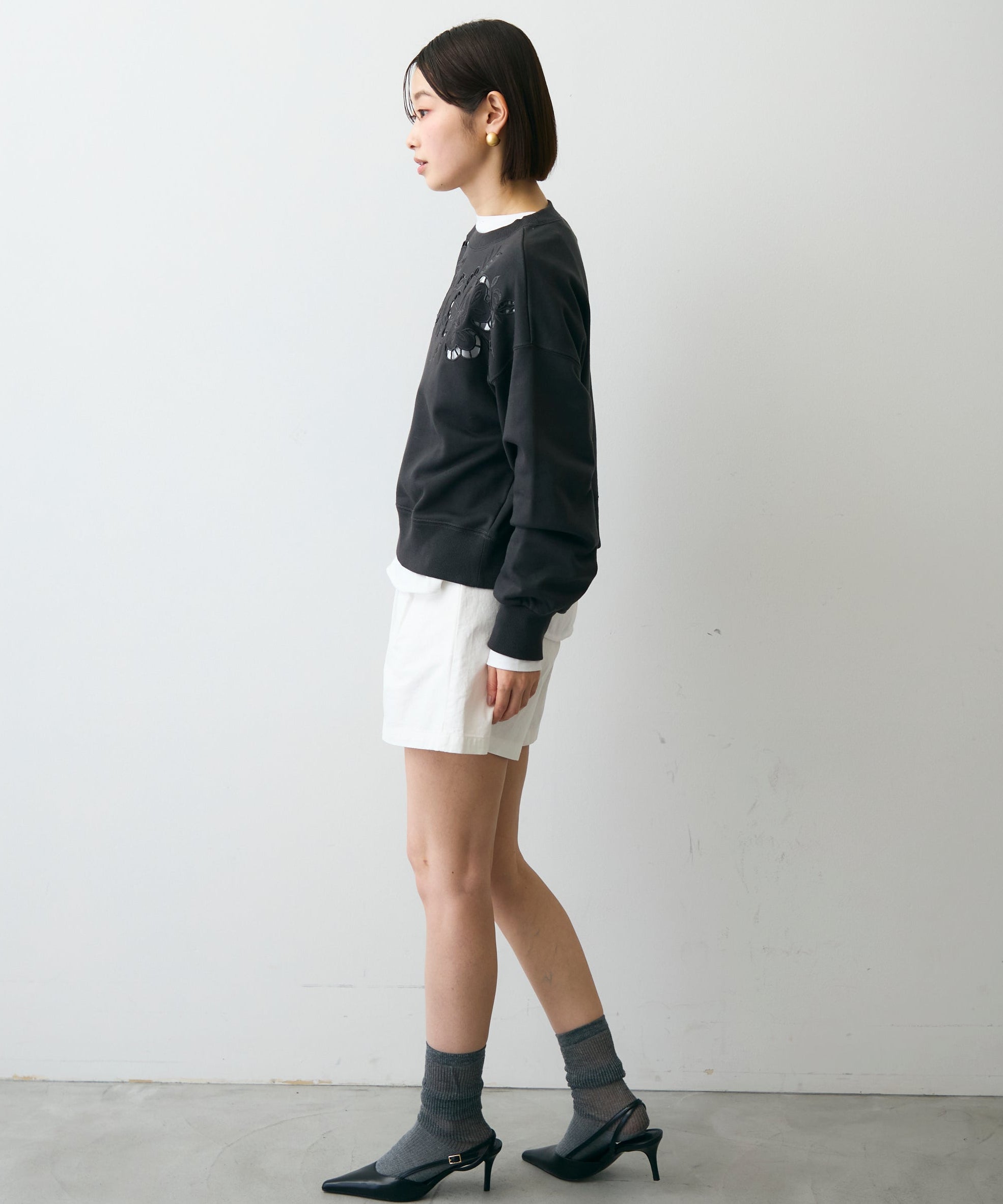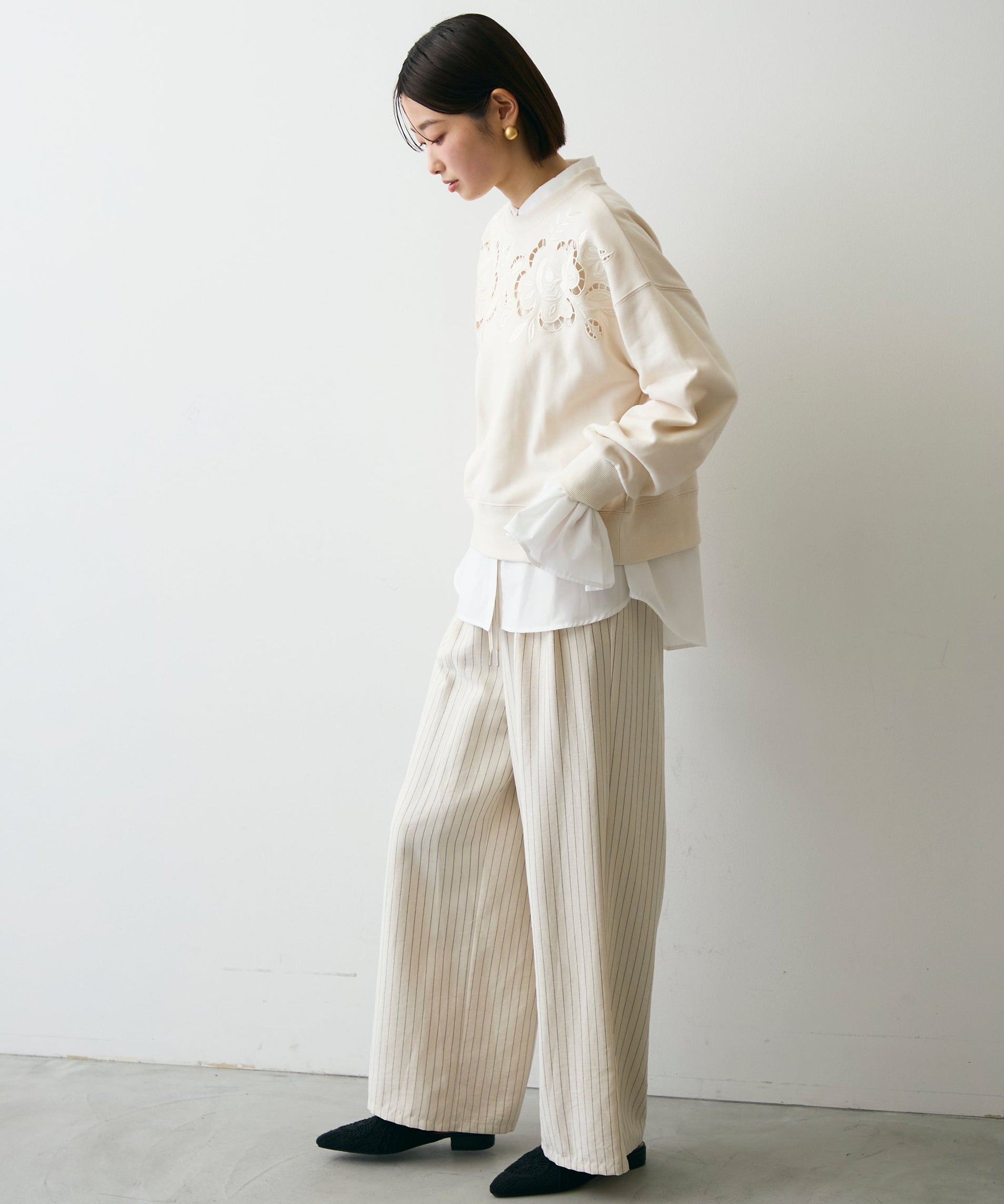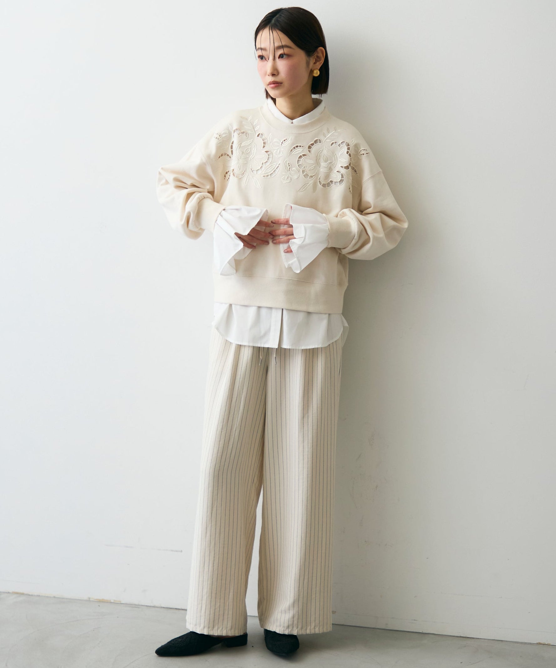 ふんわりとした裏毛素材に、上品なフラワーカットワーク刺繍をあしらった大人可愛いプルオーバー。