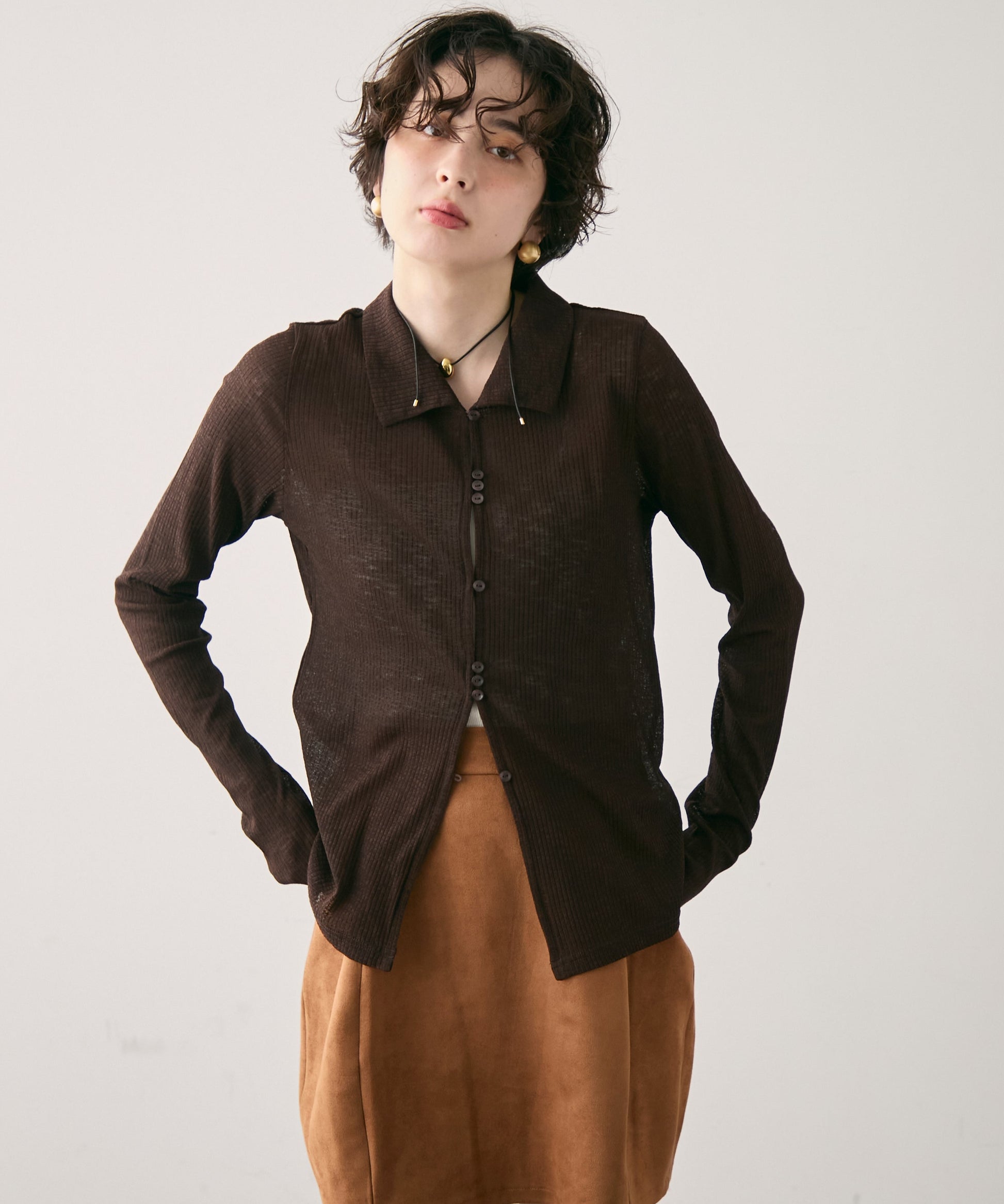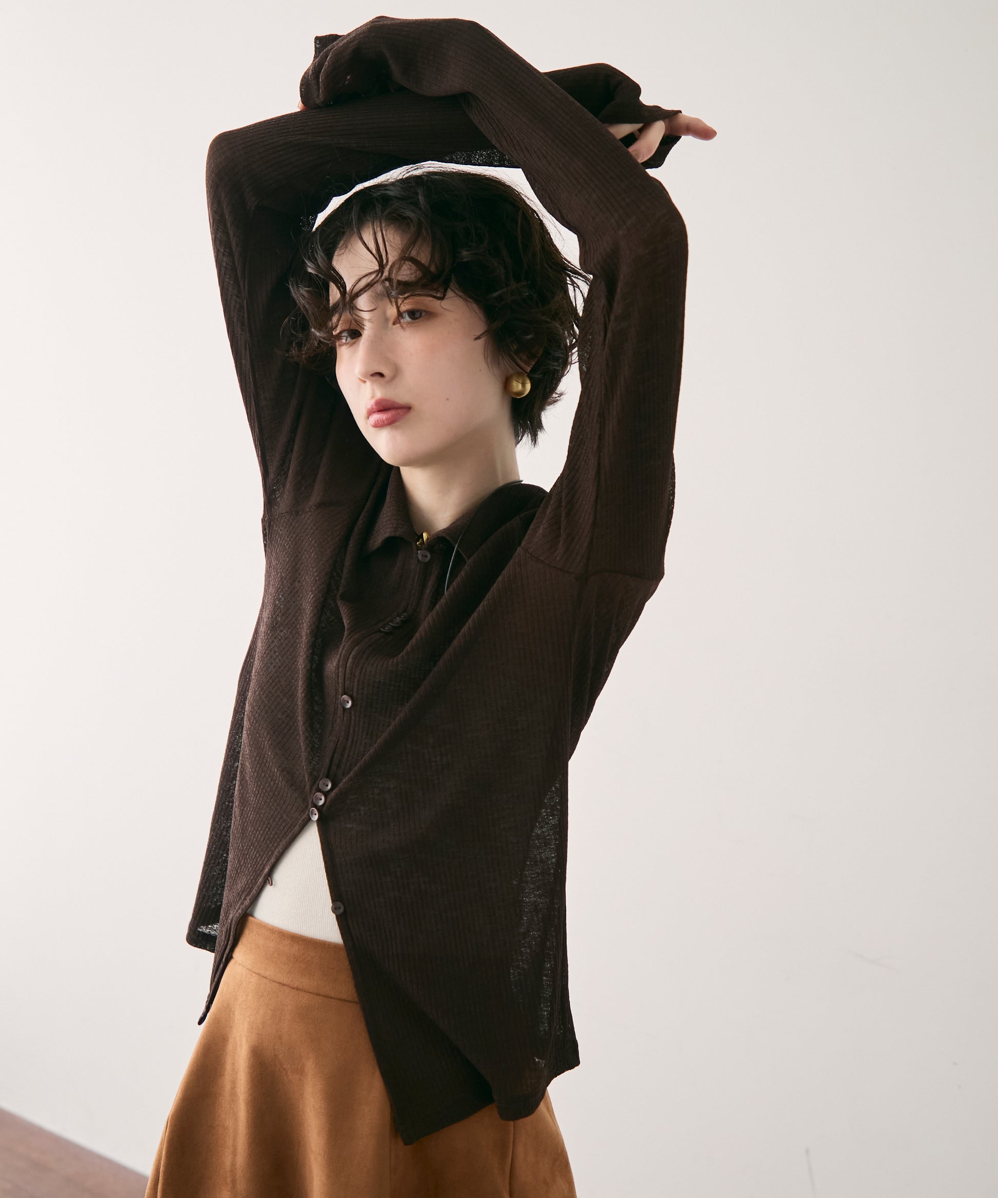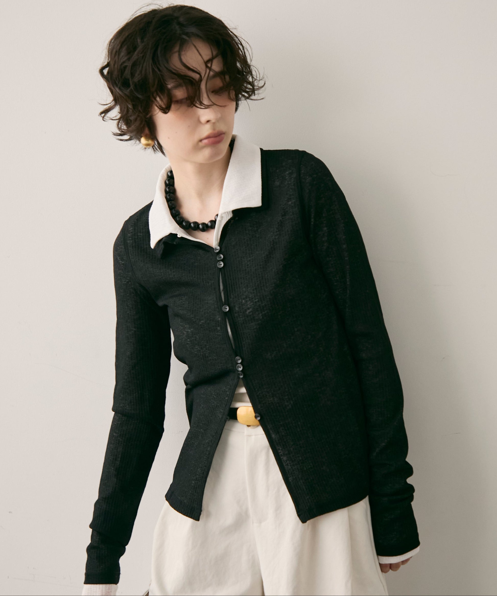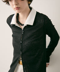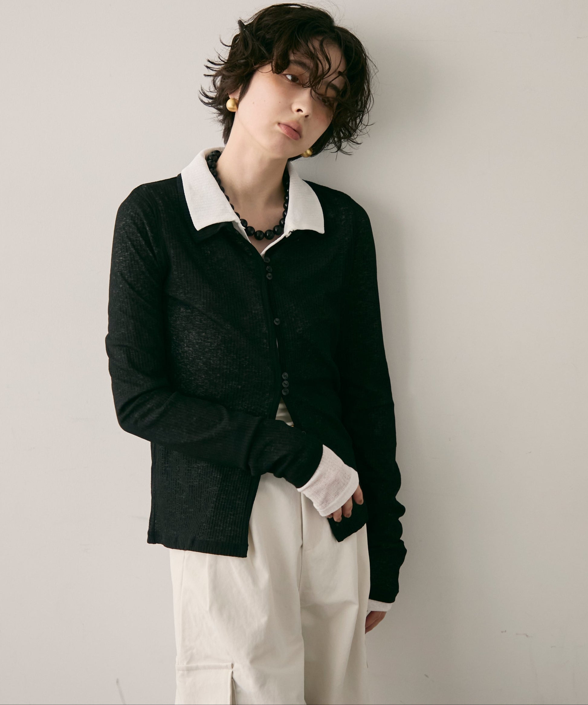 軽やかなシアー素材とランダムに配したボタンデザインがポイントのポロカーディガン。