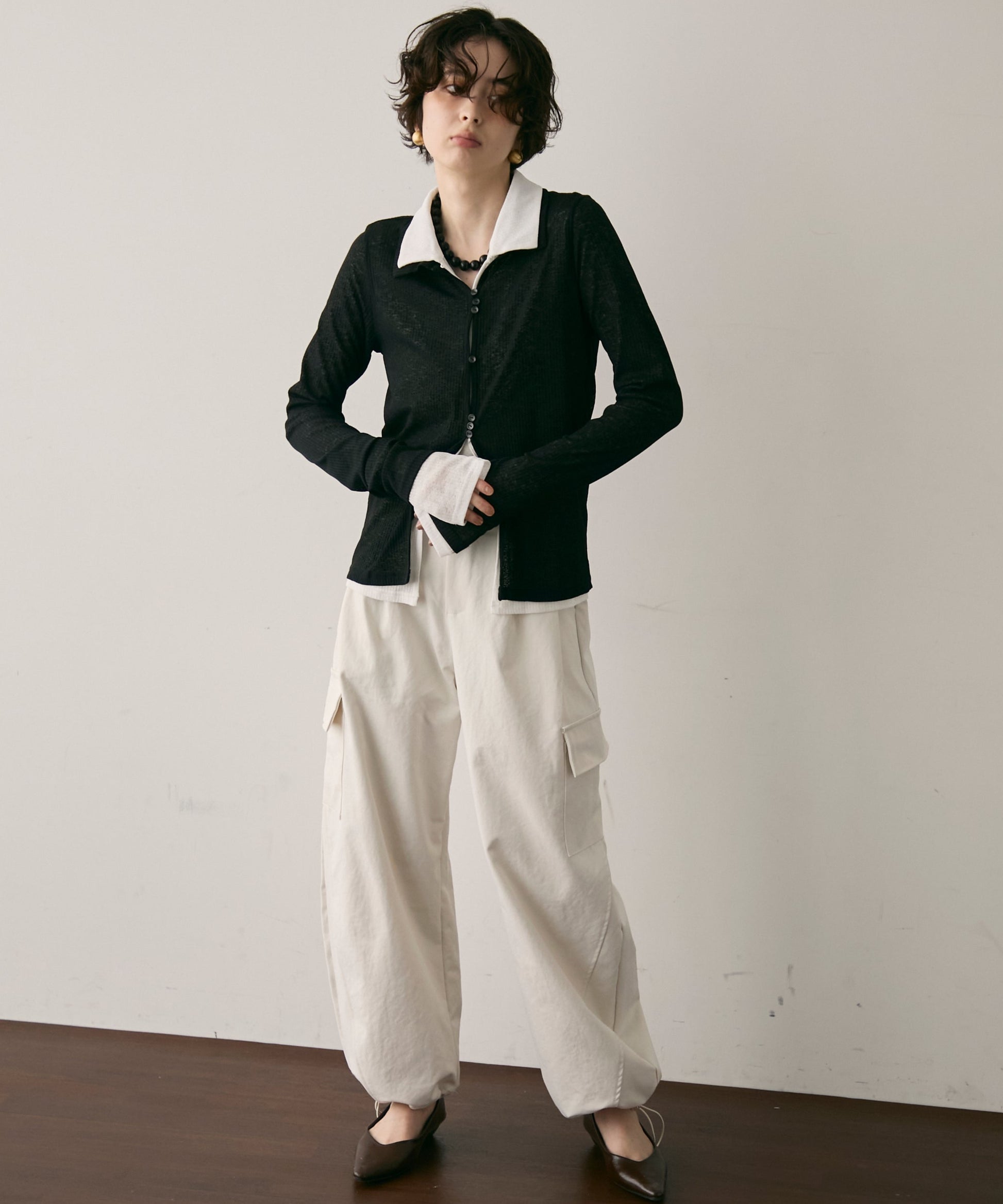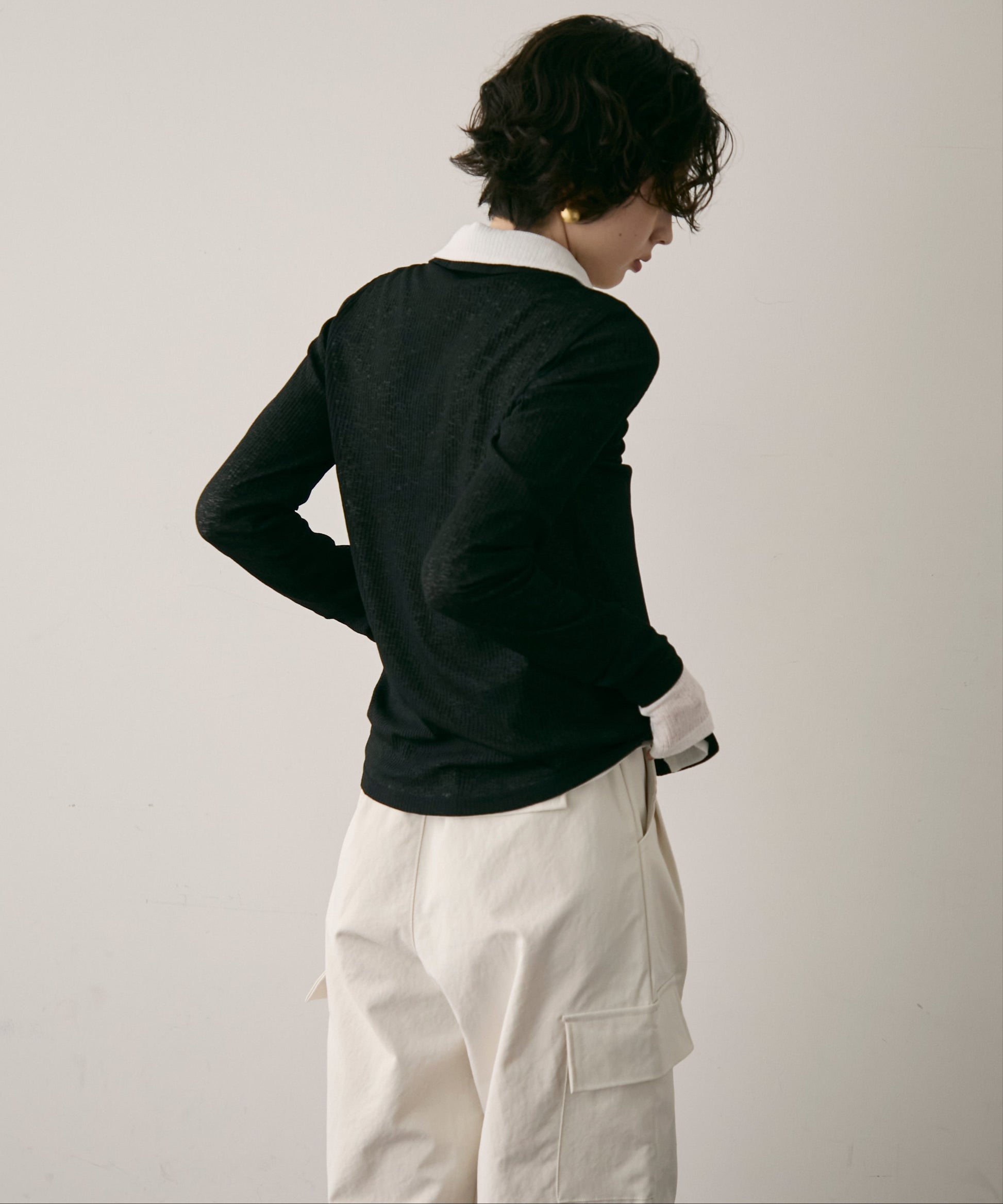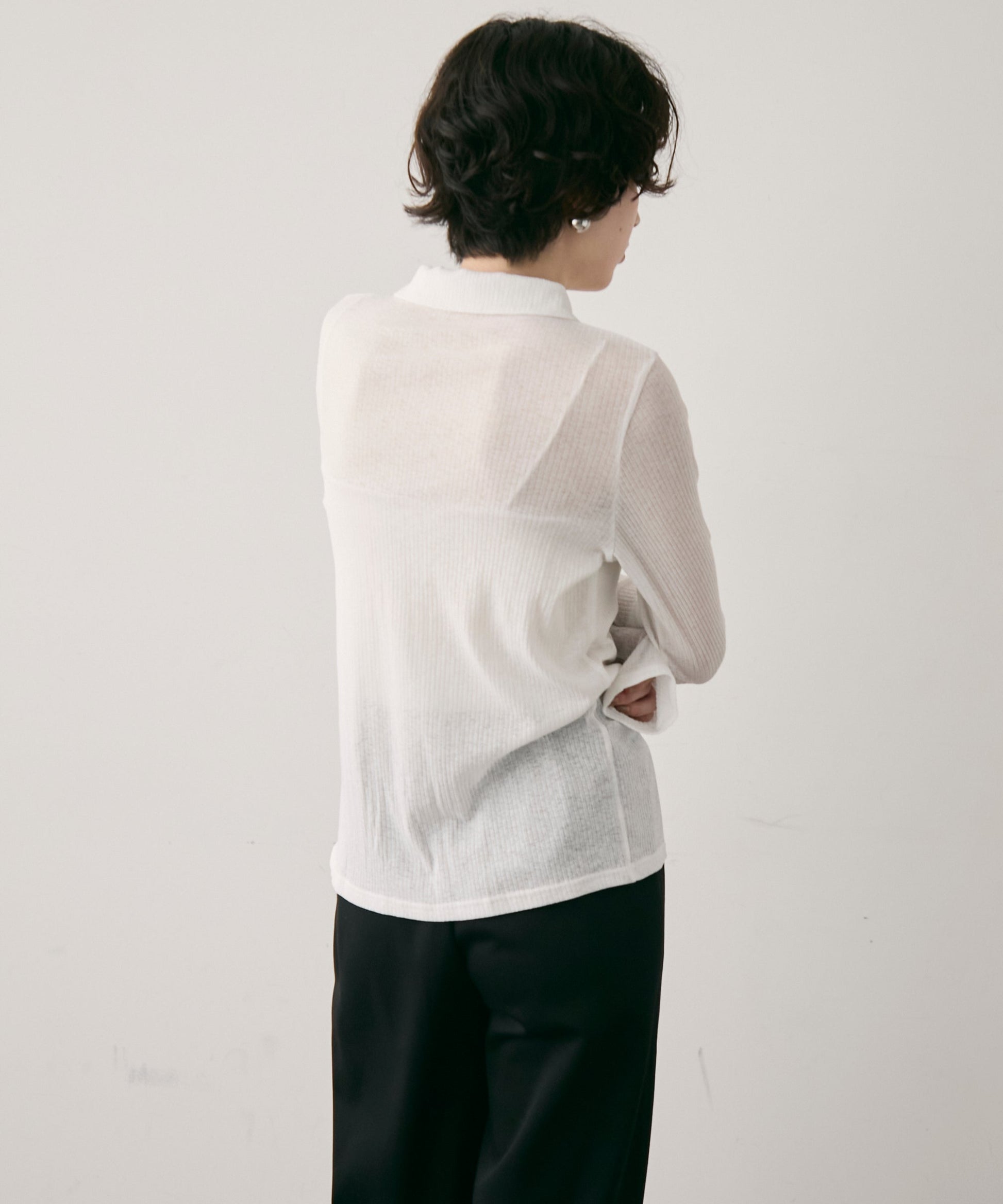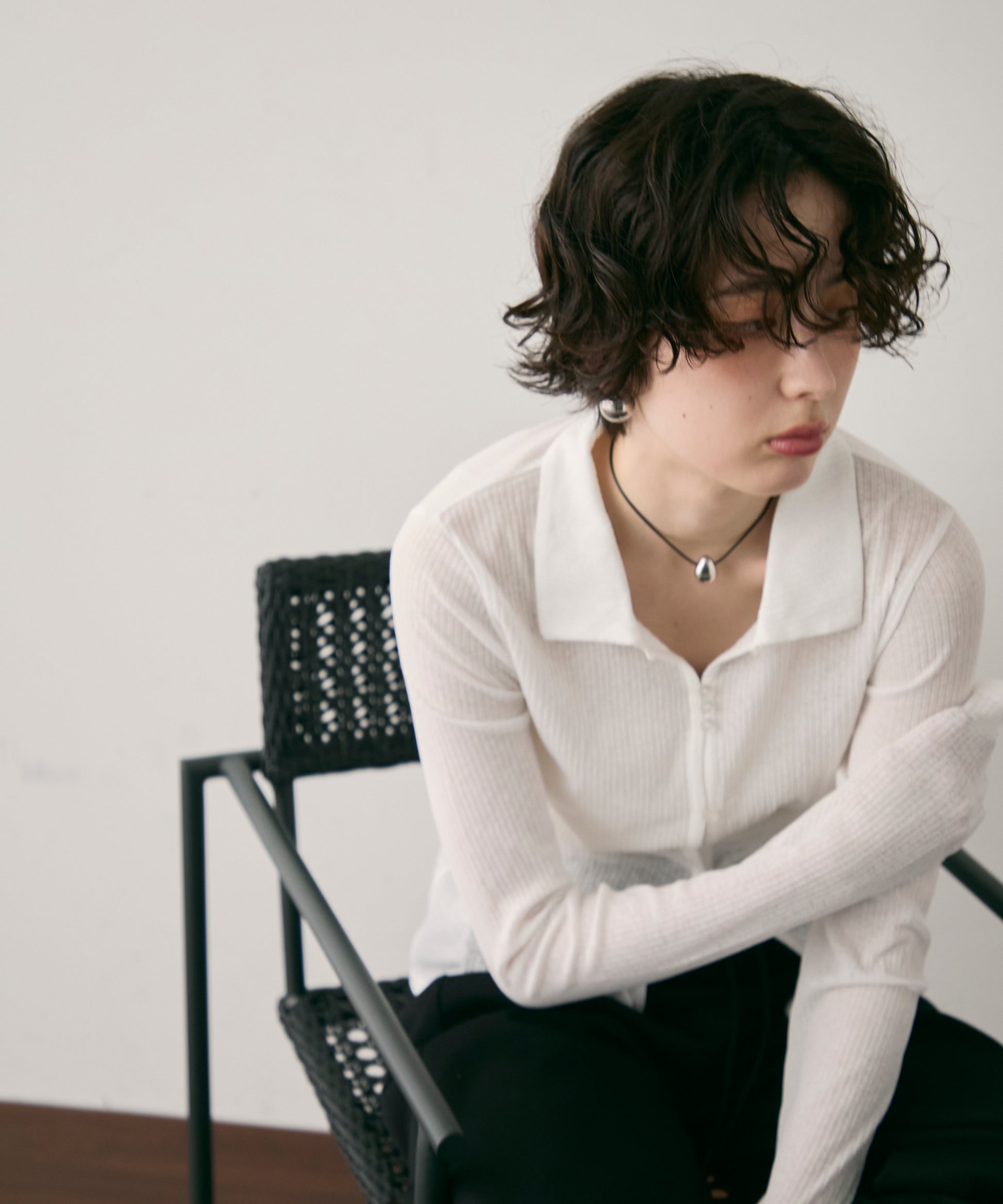 軽やかなシアー素材とランダムに配したボタンデザインがポイントのポロカーディガン。