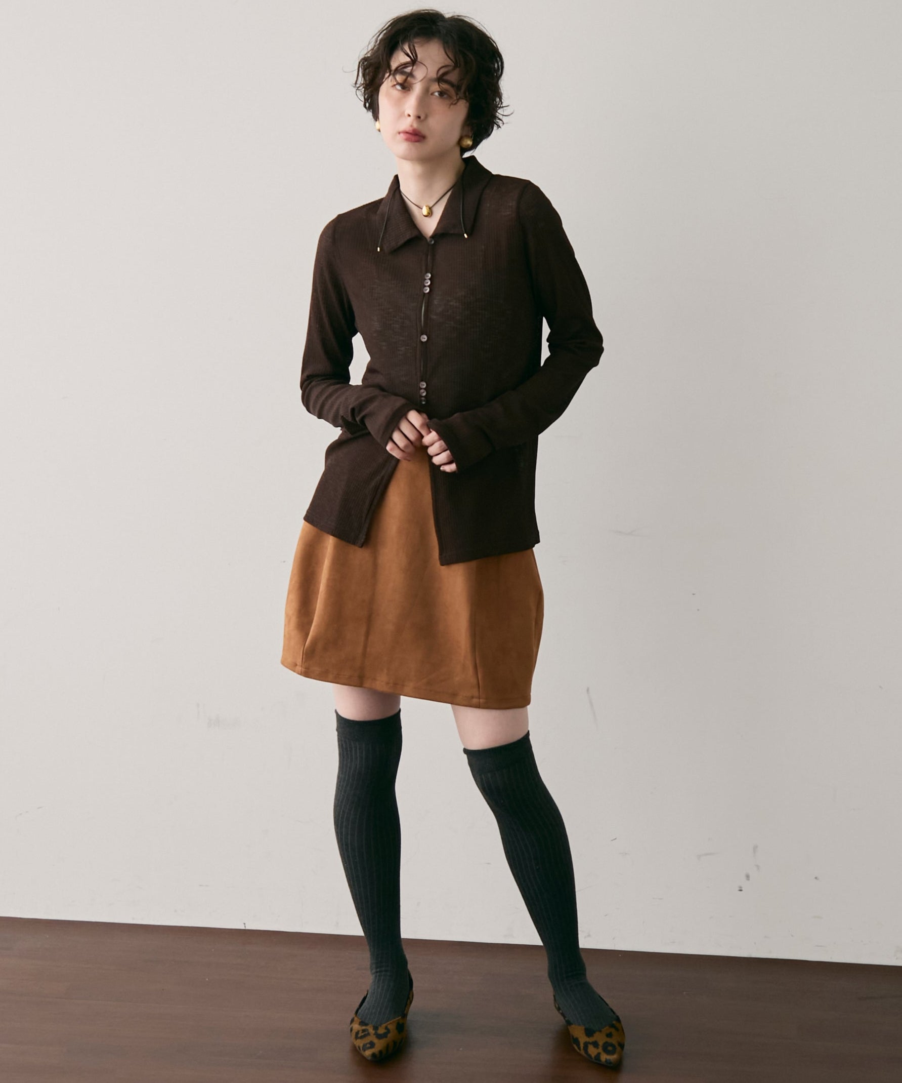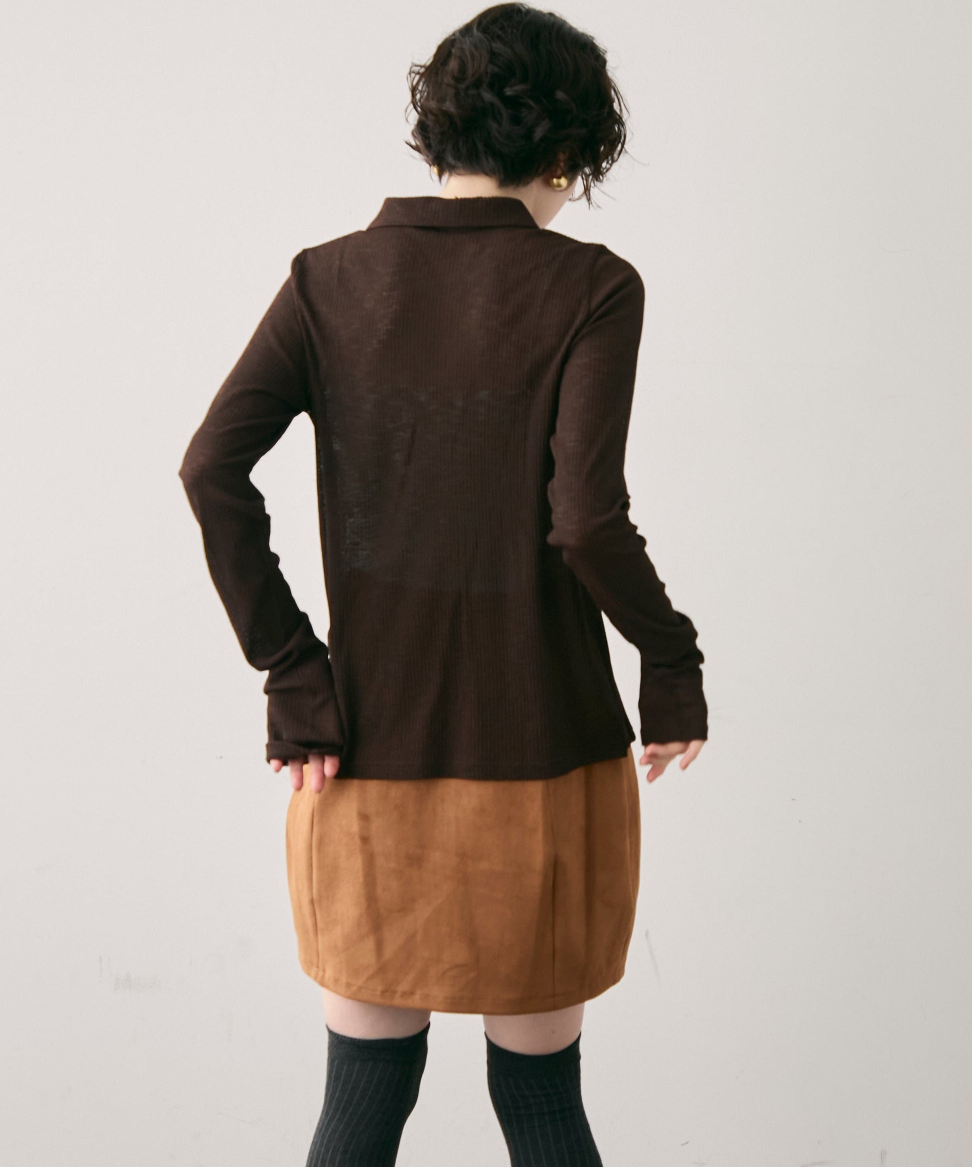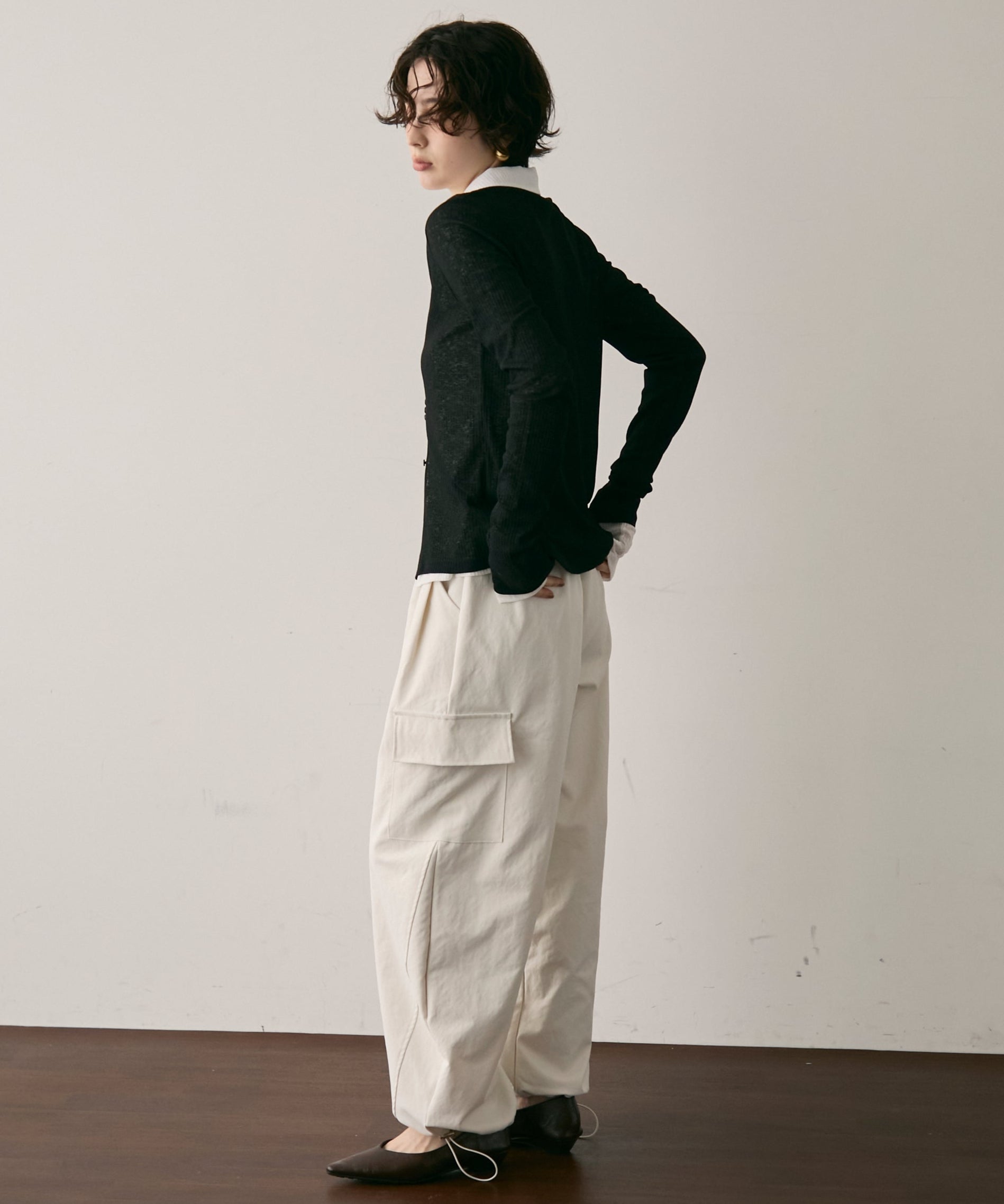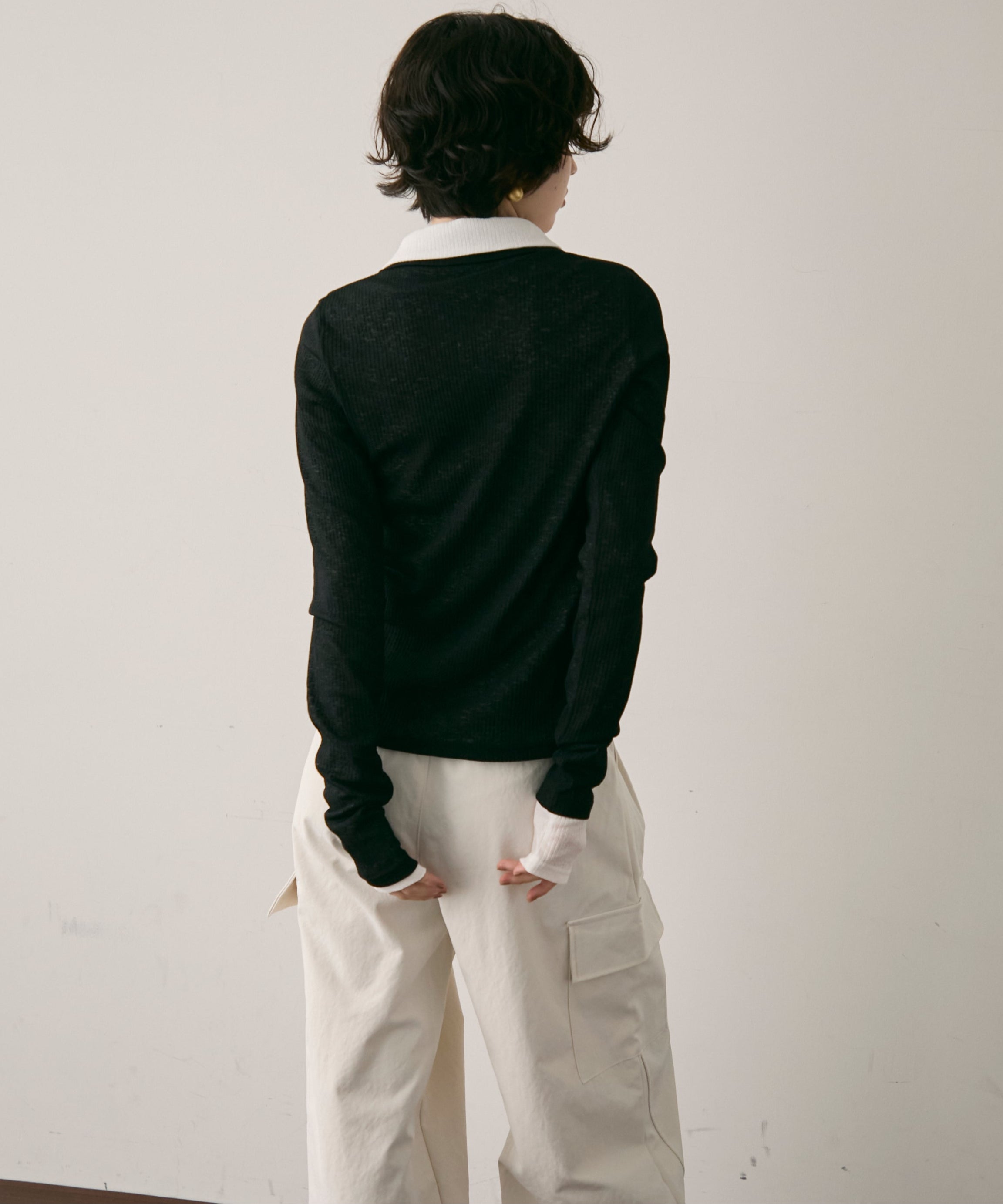 軽やかなシアー素材とランダムに配したボタンデザインがポイントのポロカーディガン。
