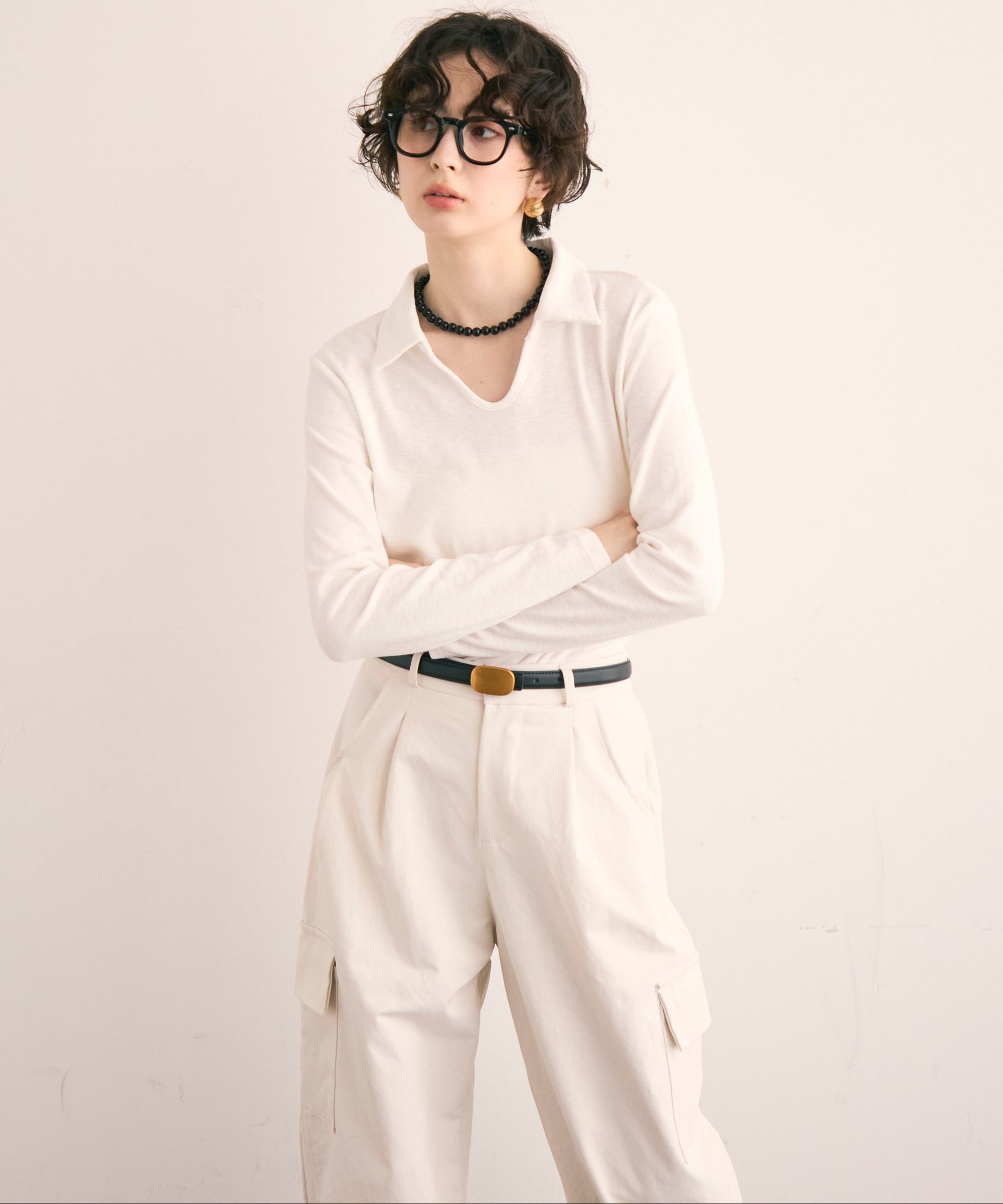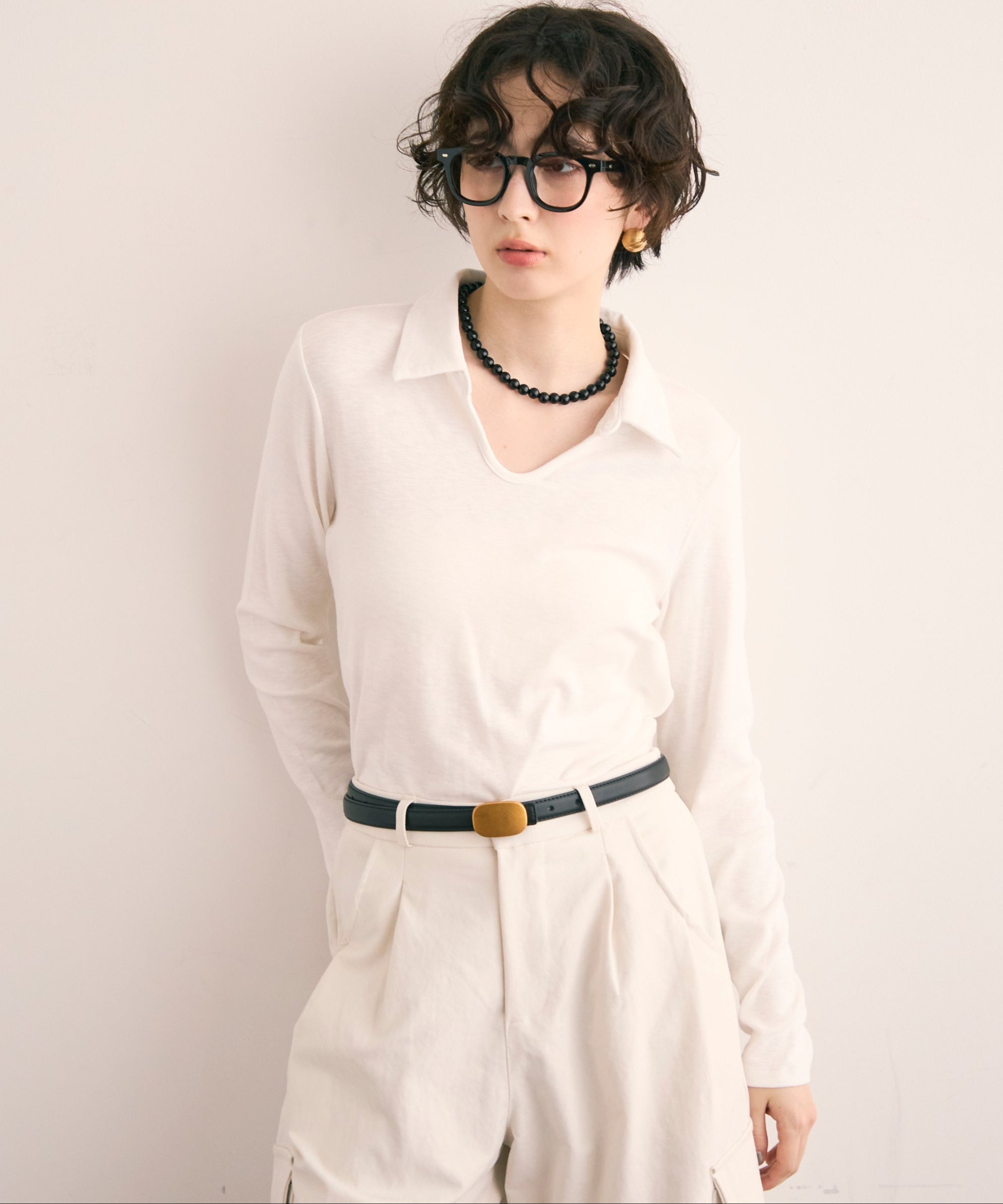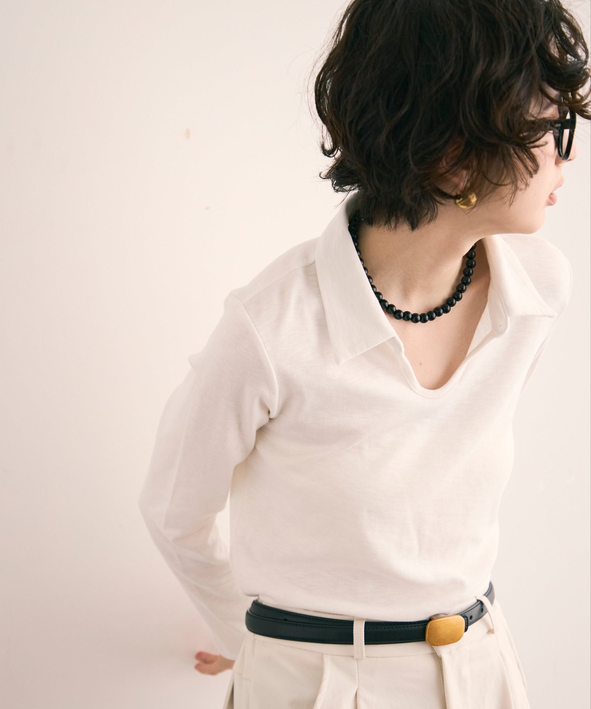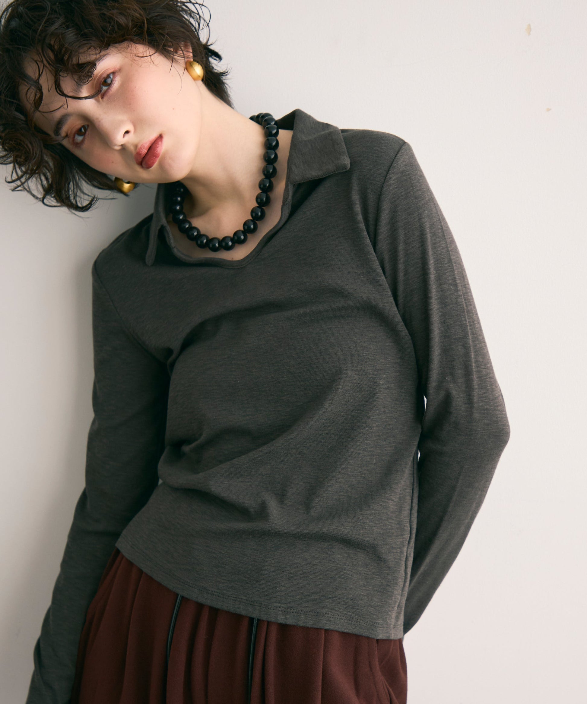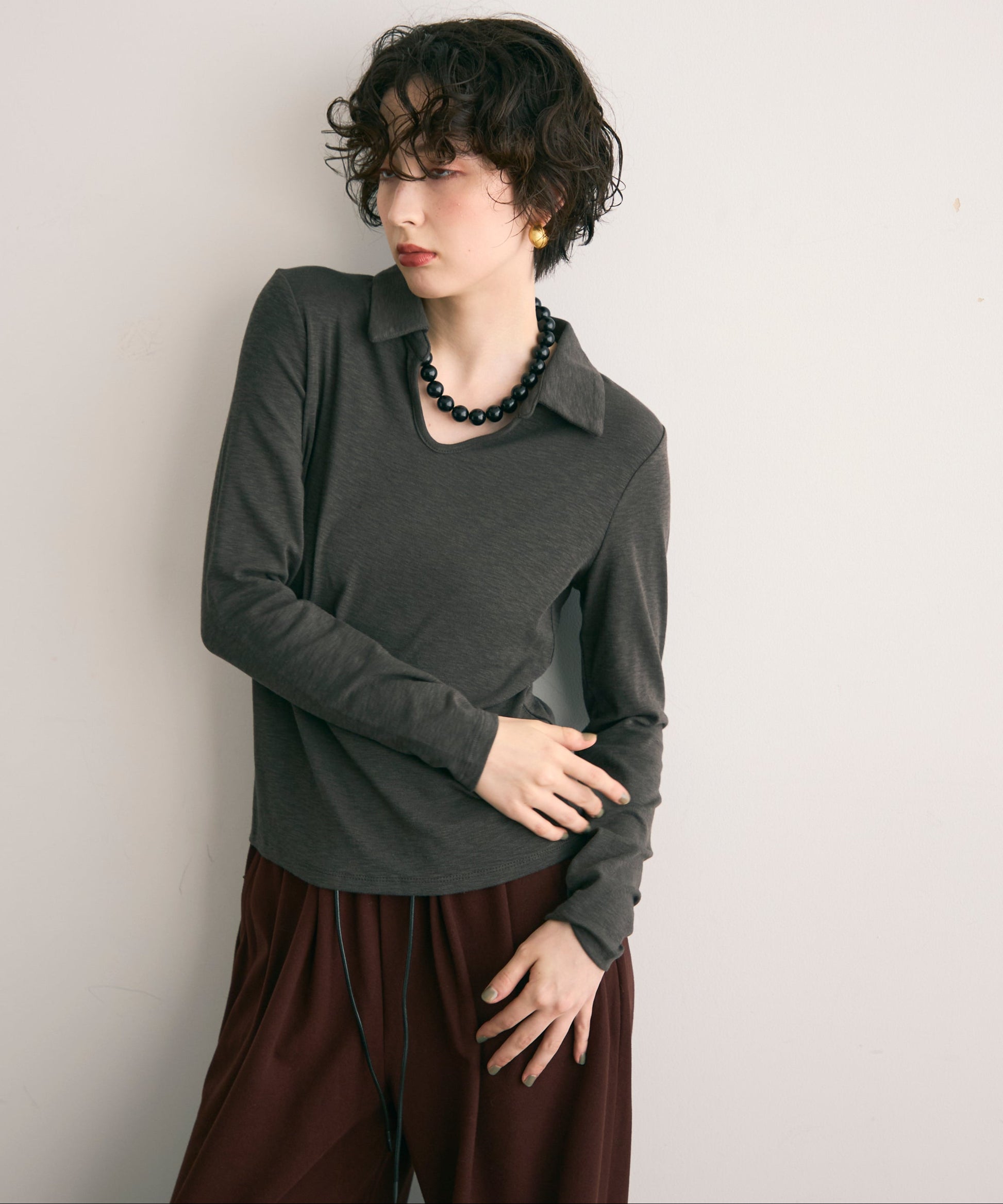 首元をすっきりと見せてくれるスキッパーデザインが特徴のカットソー。