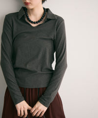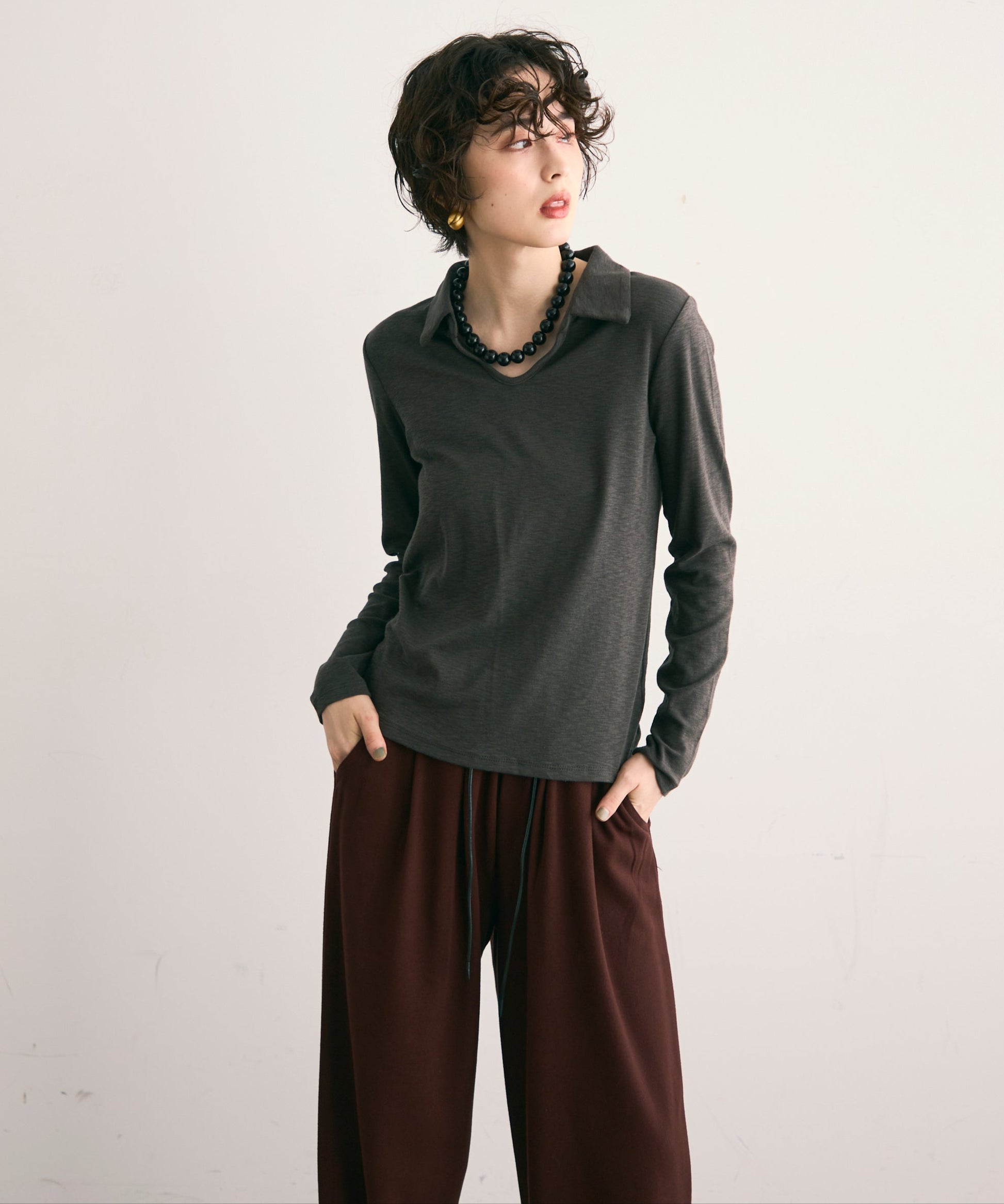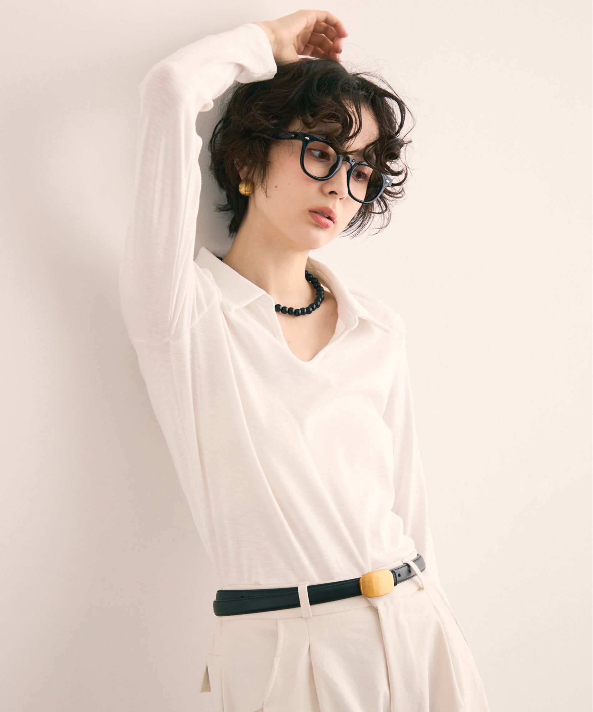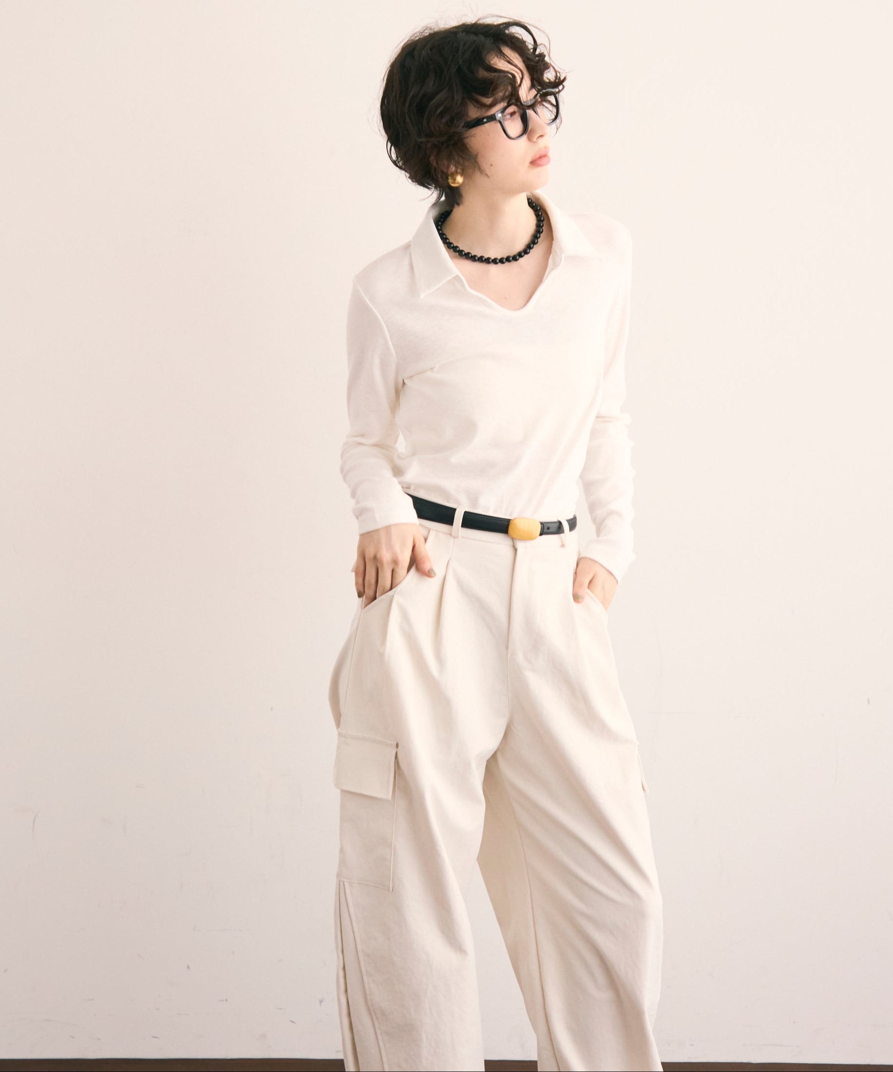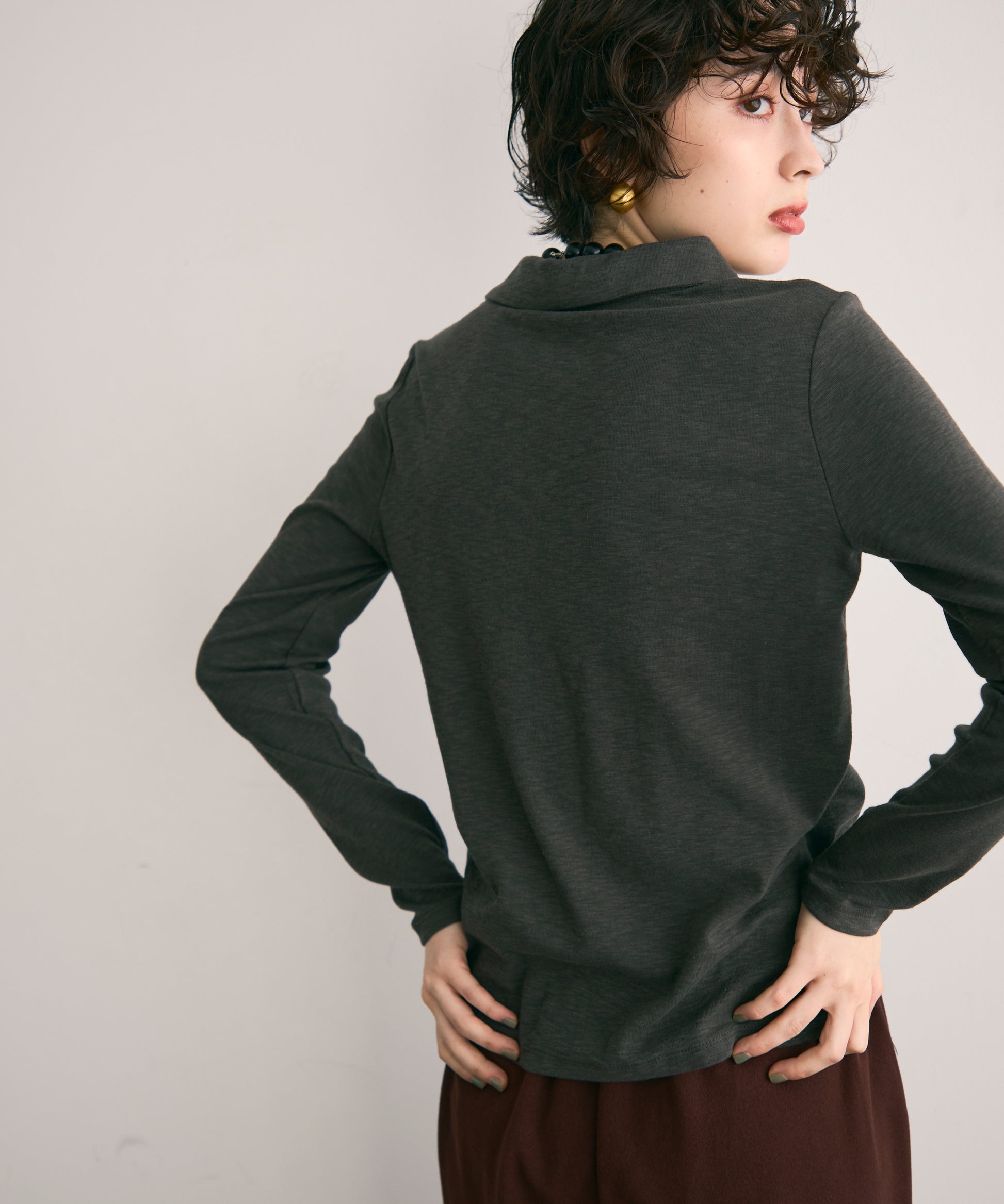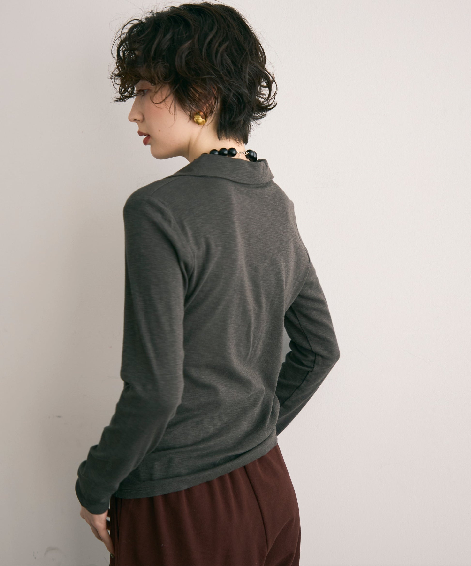首元をすっきりと見せてくれるスキッパーデザインが特徴のカットソー。