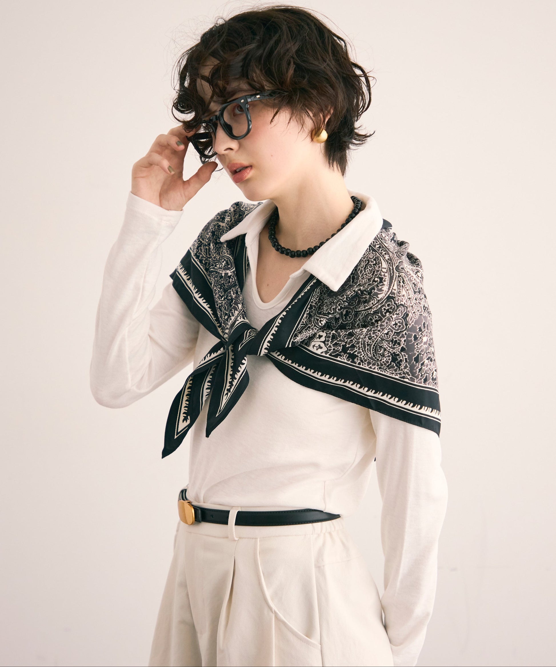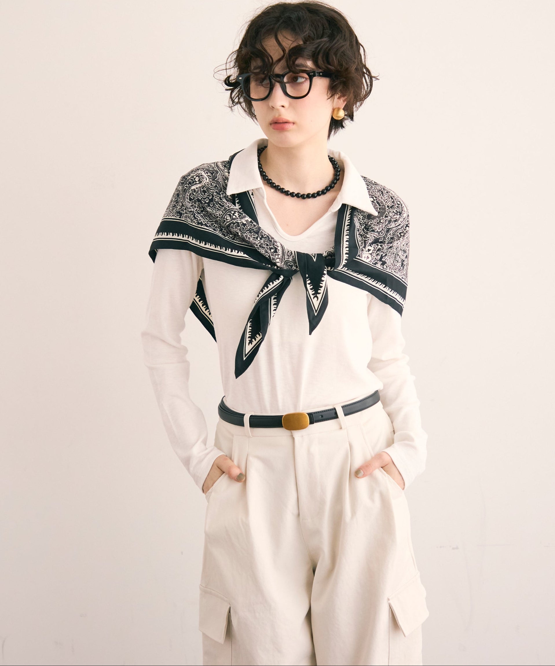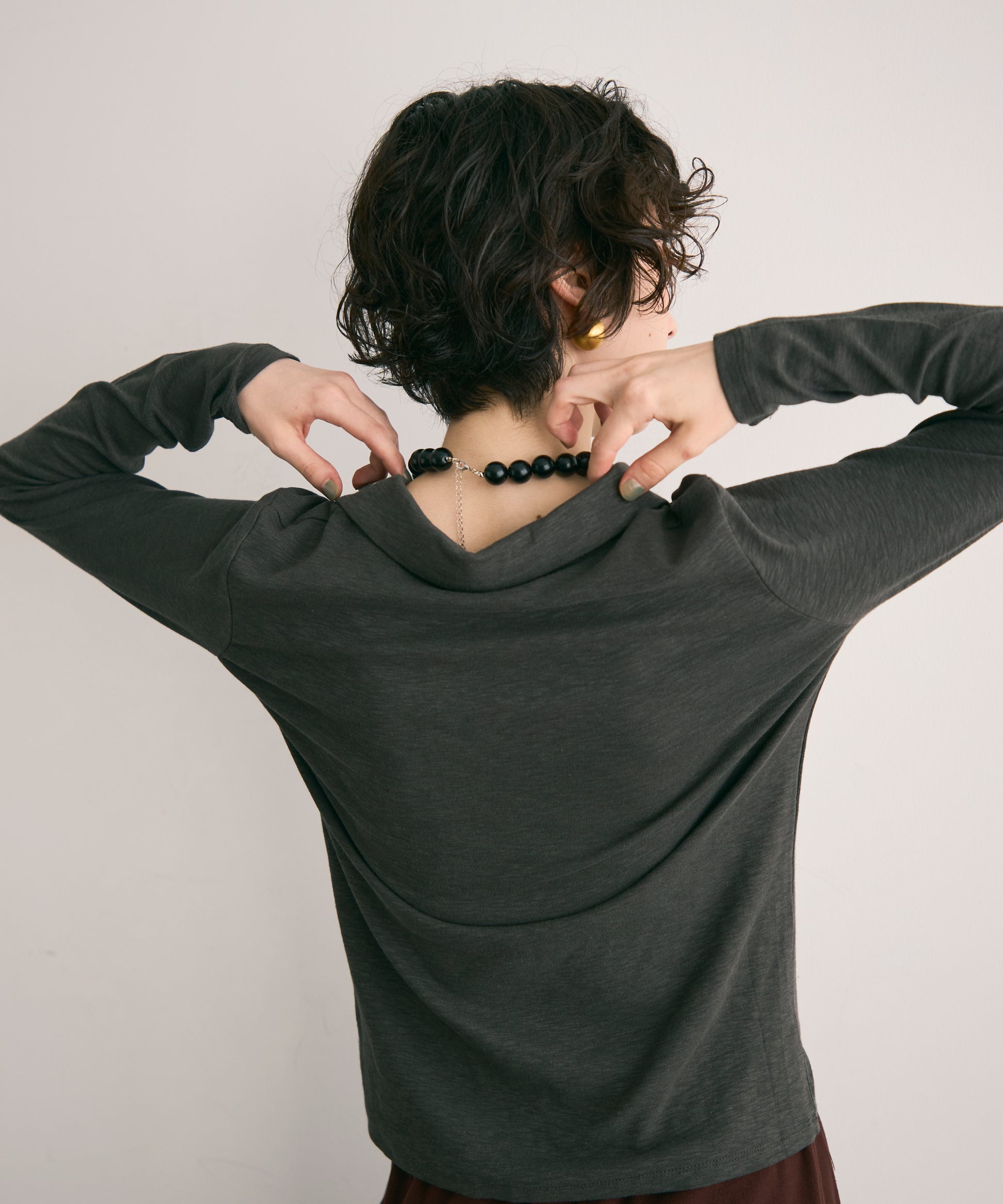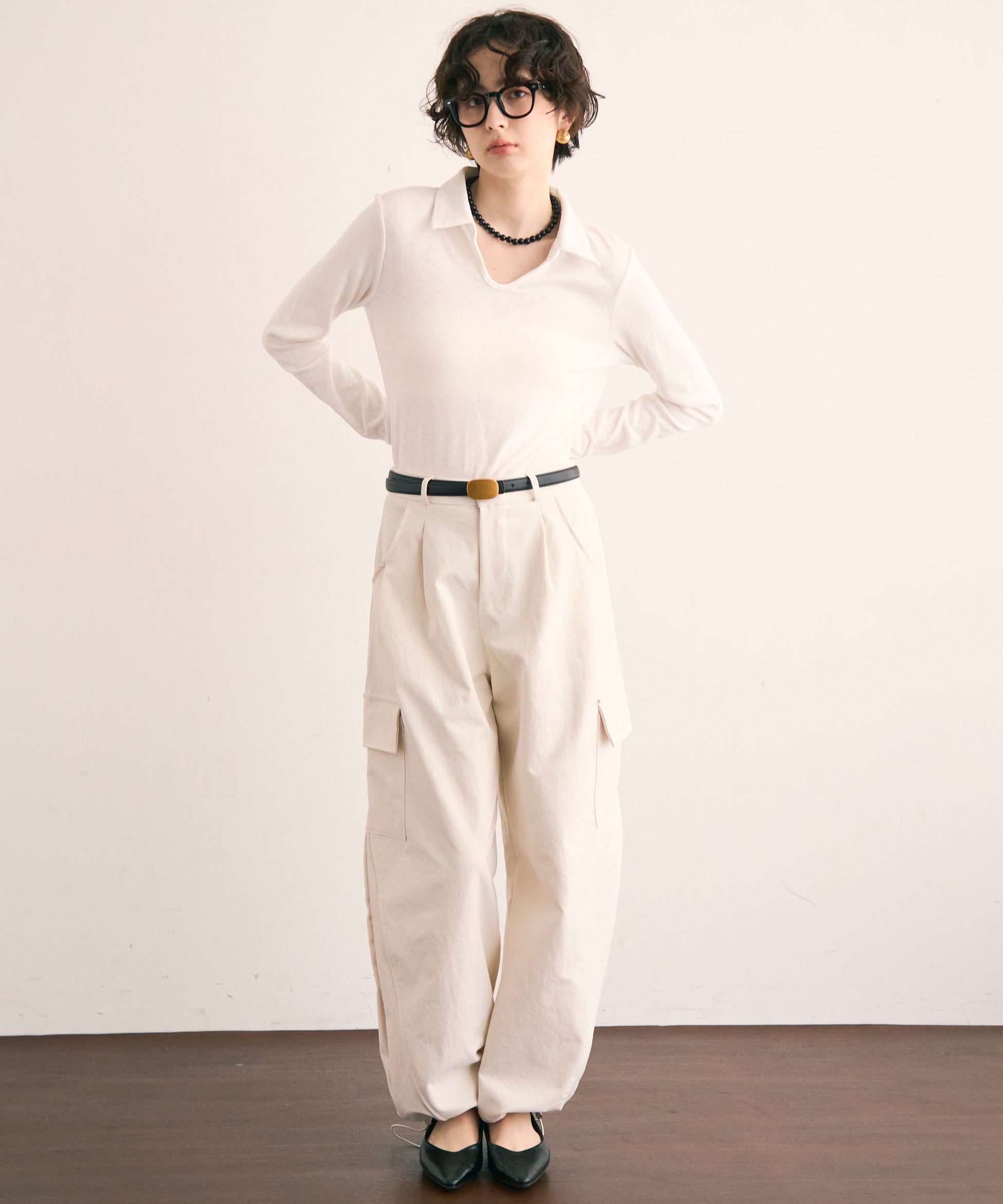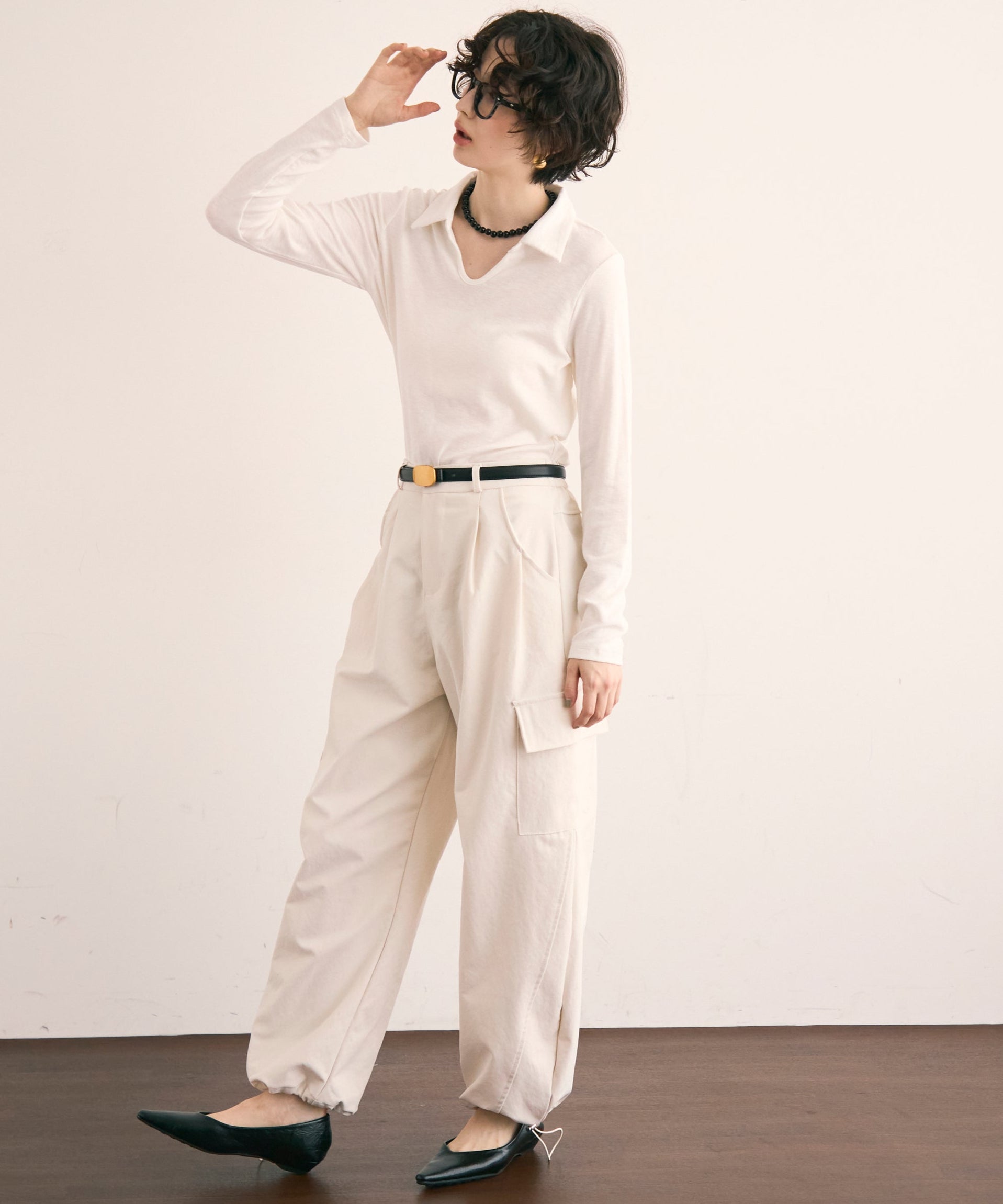 首元をすっきりと見せてくれるスキッパーデザインが特徴のカットソー。