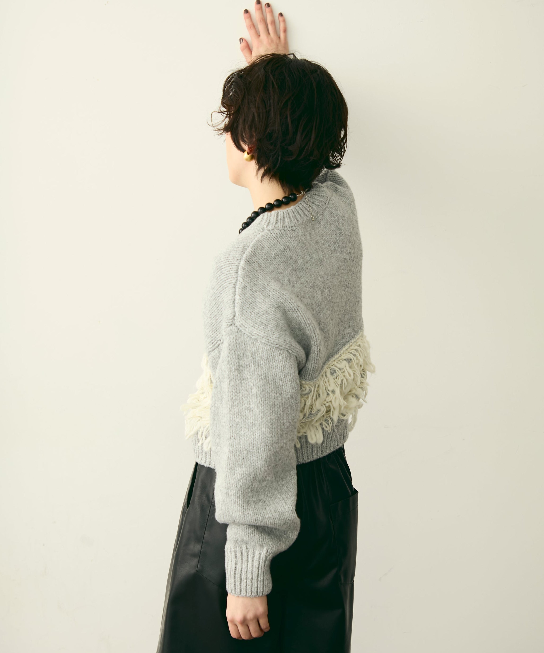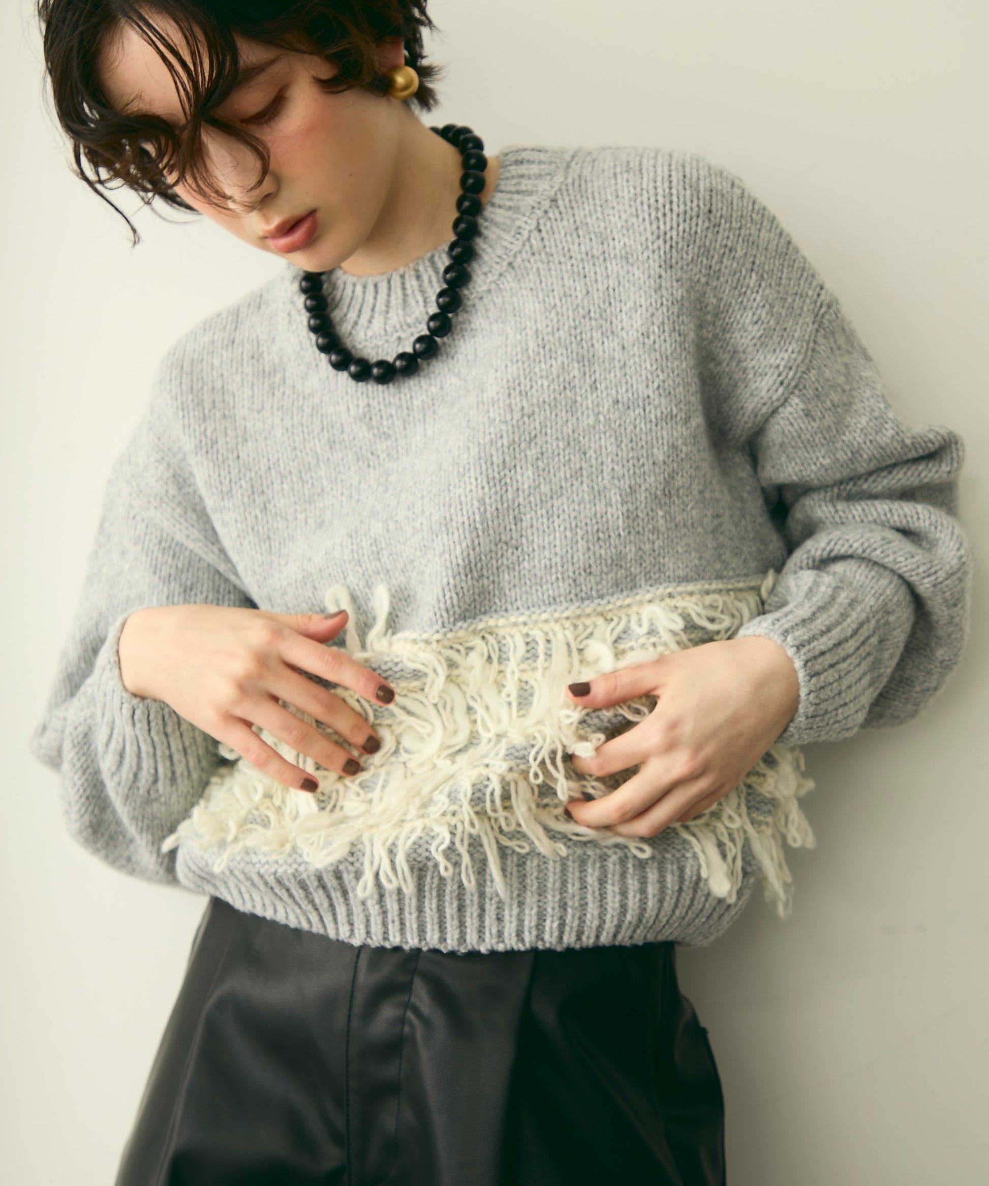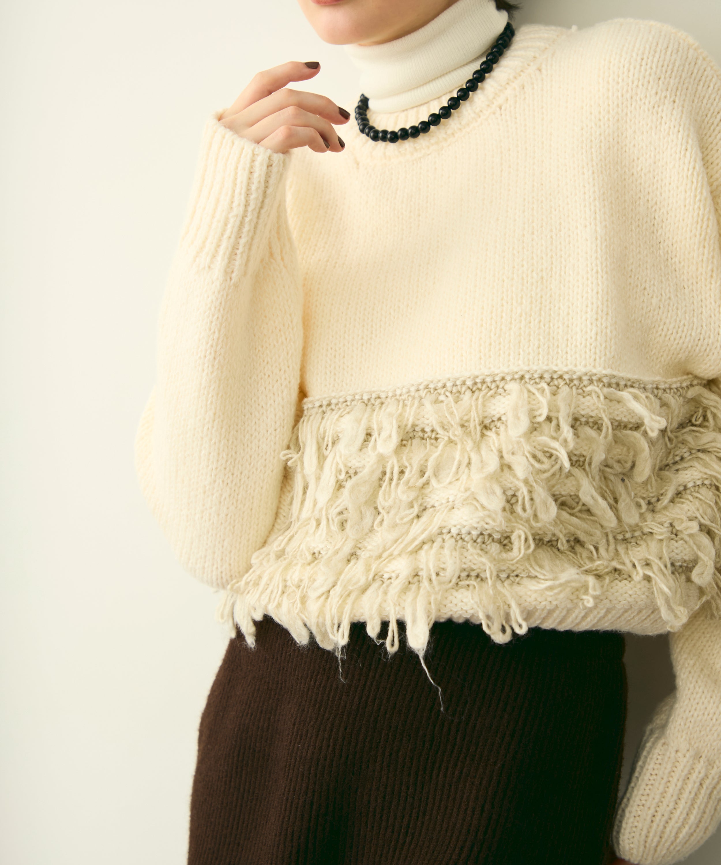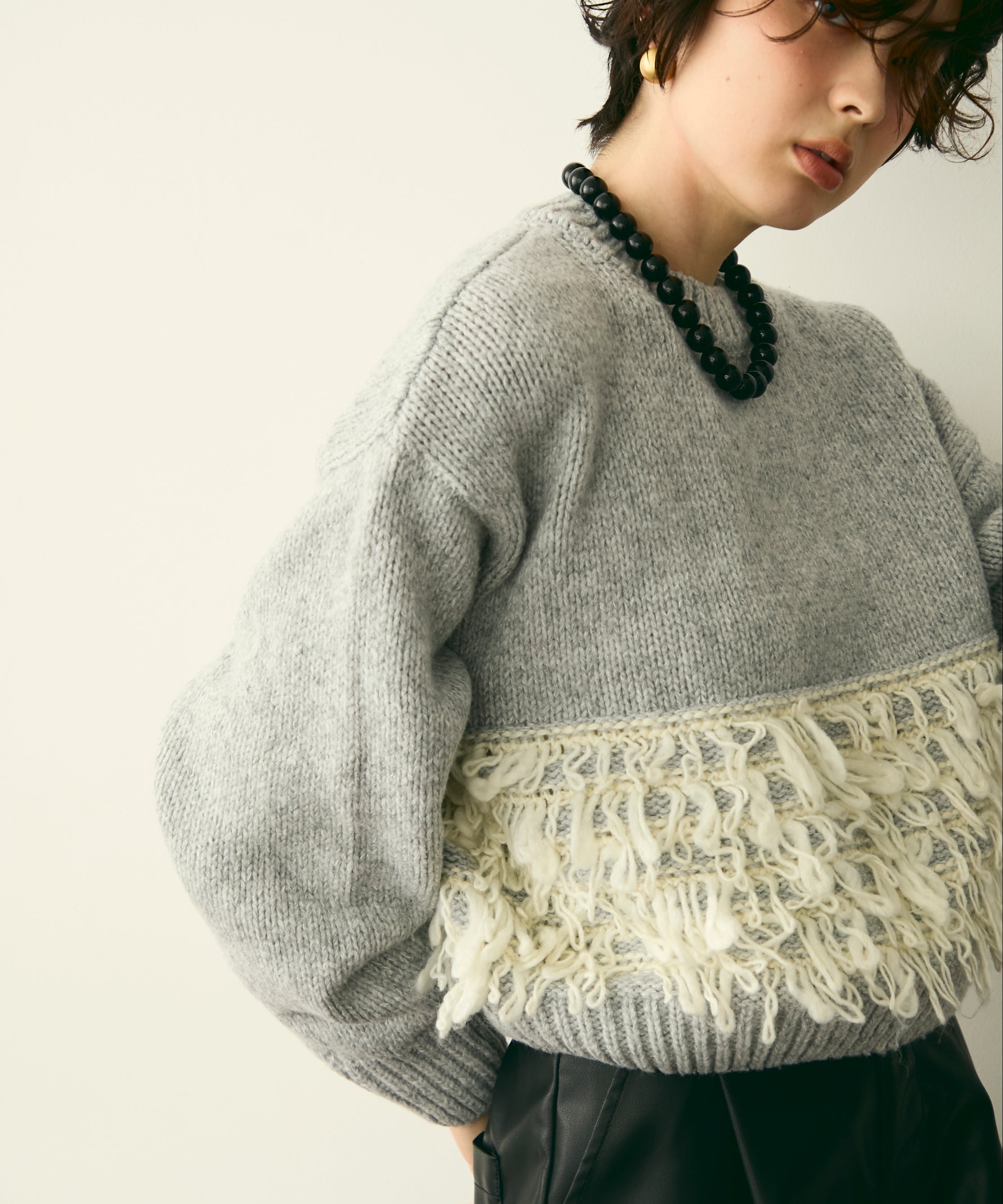 異なる編地を組み合わせたデザインが目を引く、ループ編みのプルオーバー。