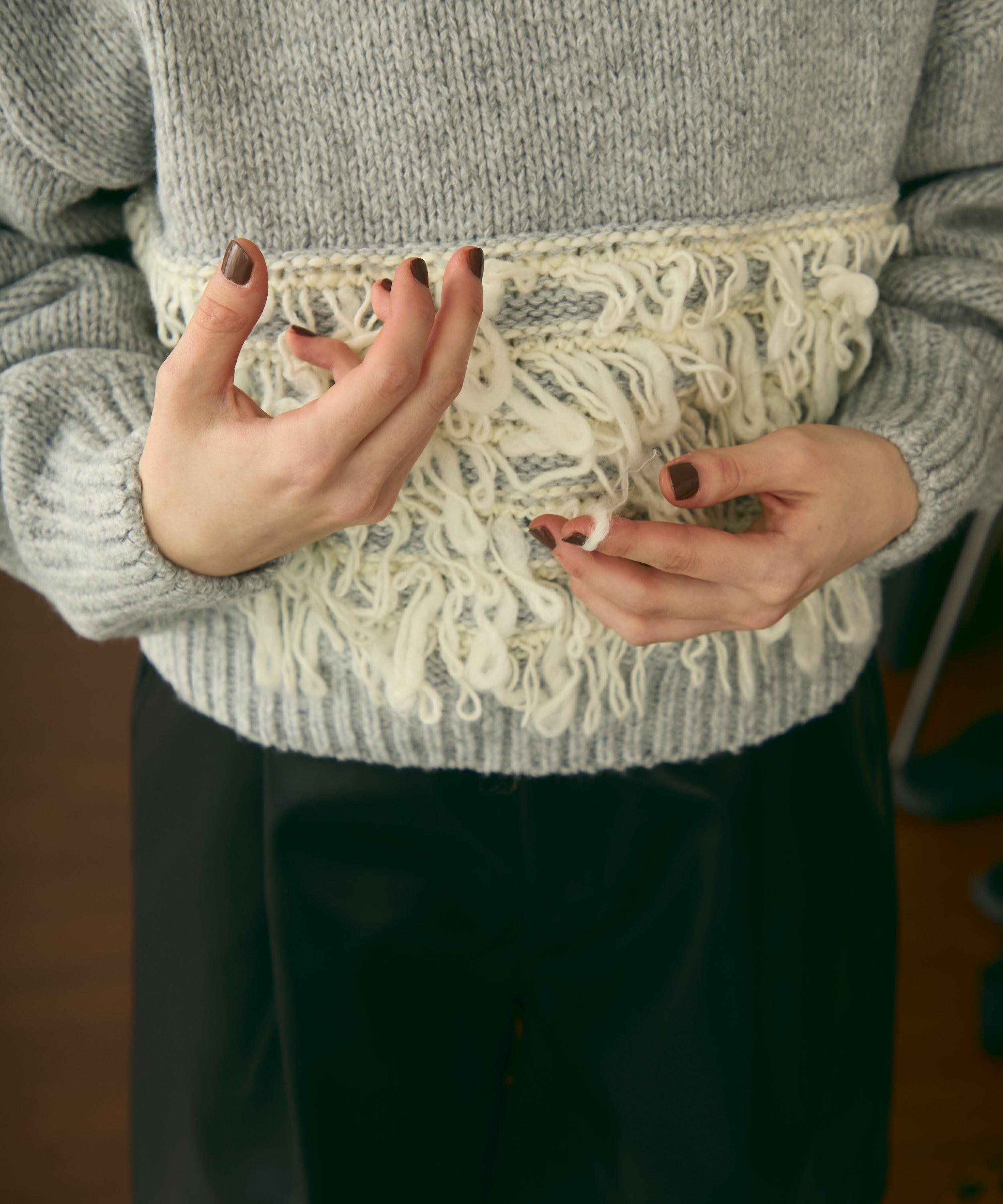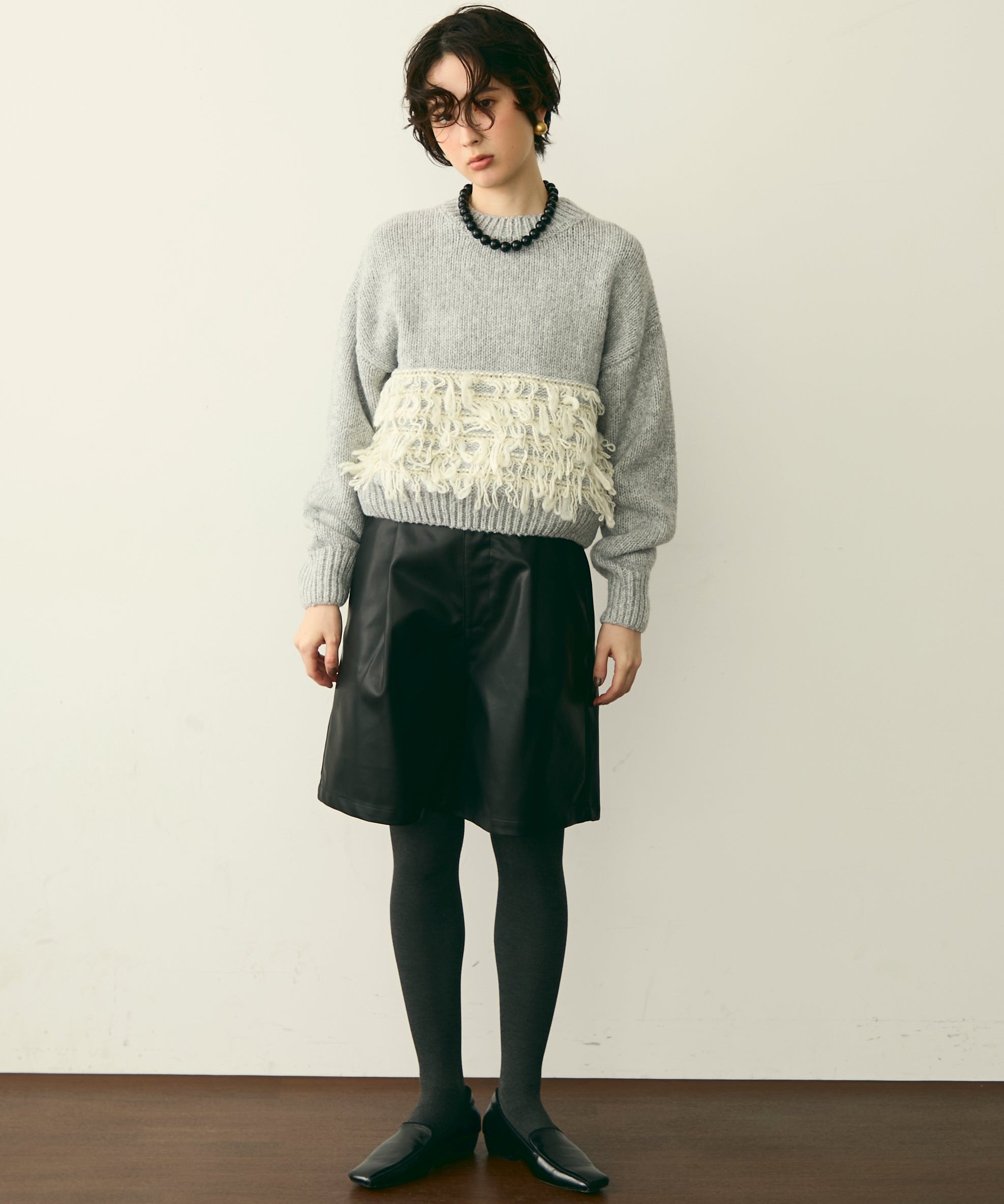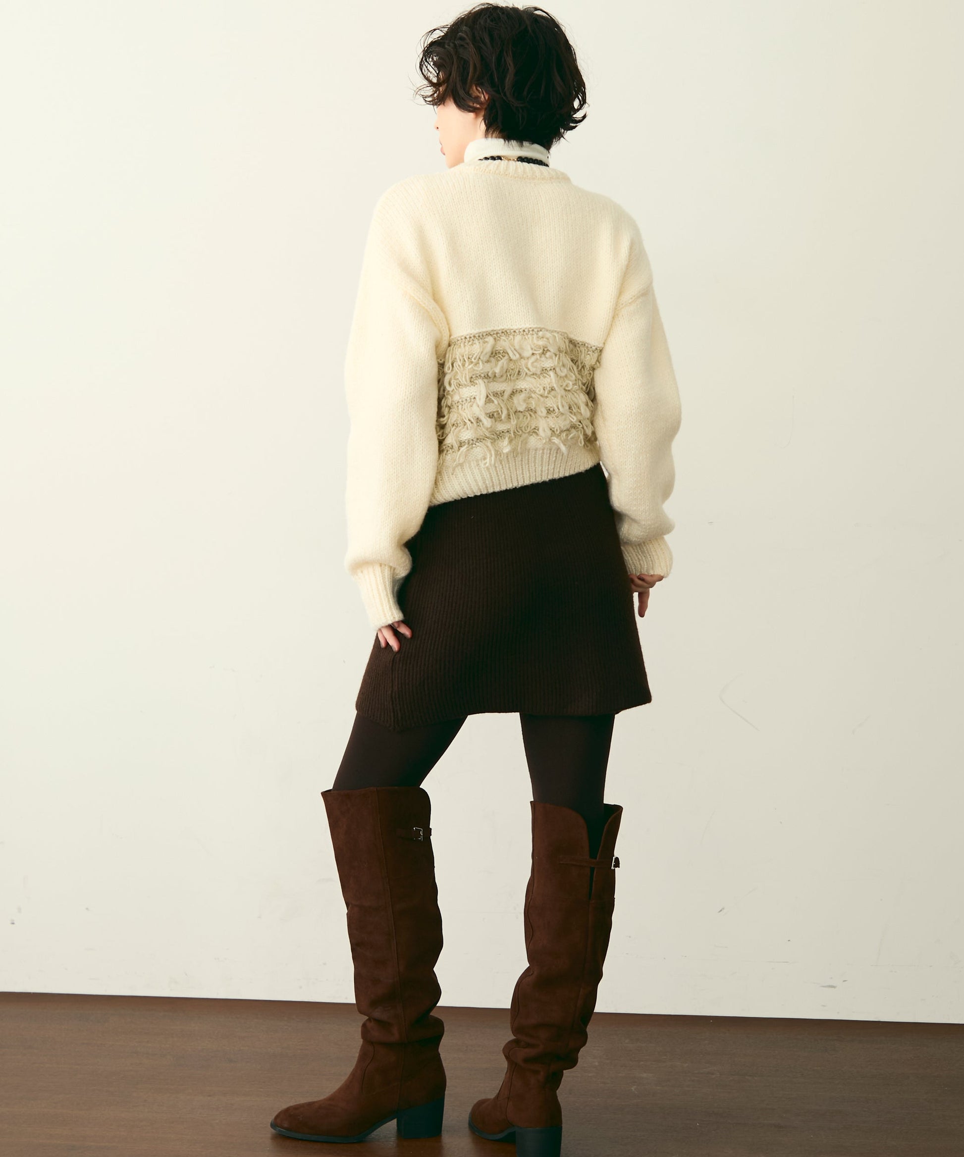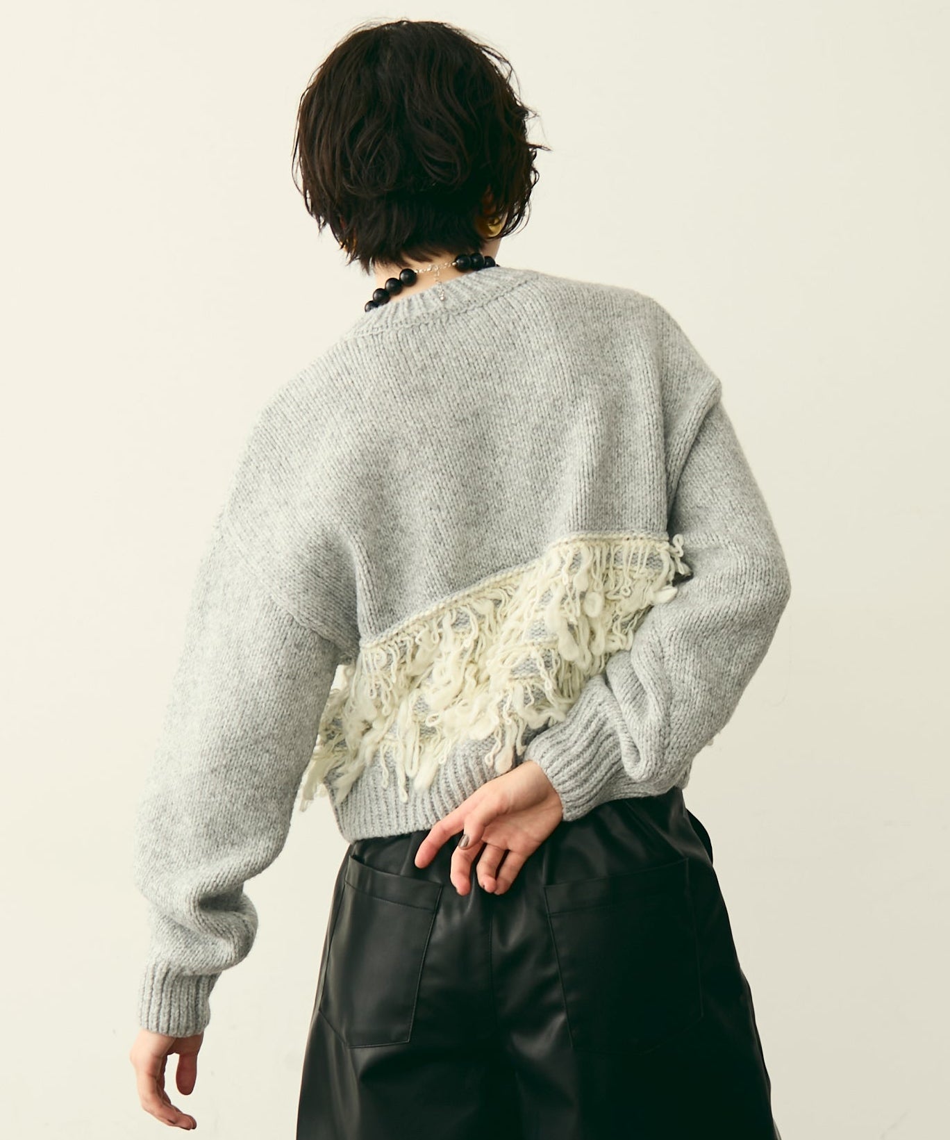 異なる編地を組み合わせたデザインが目を引く、ループ編みのプルオーバー。