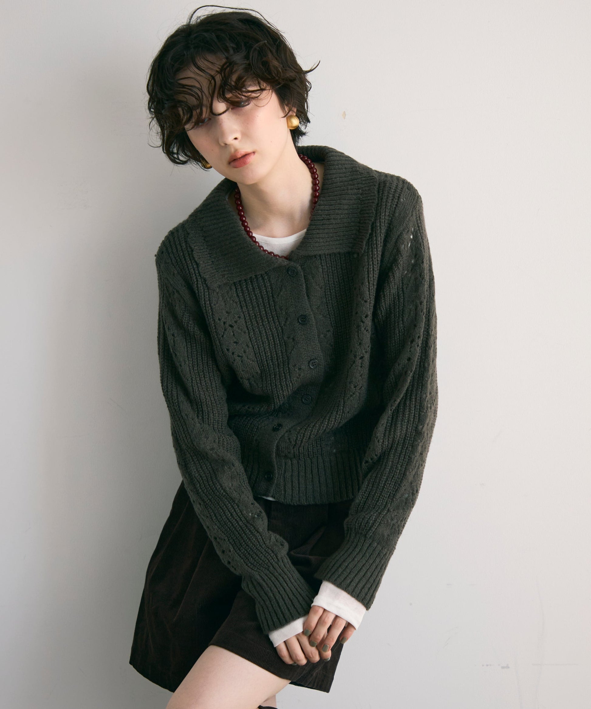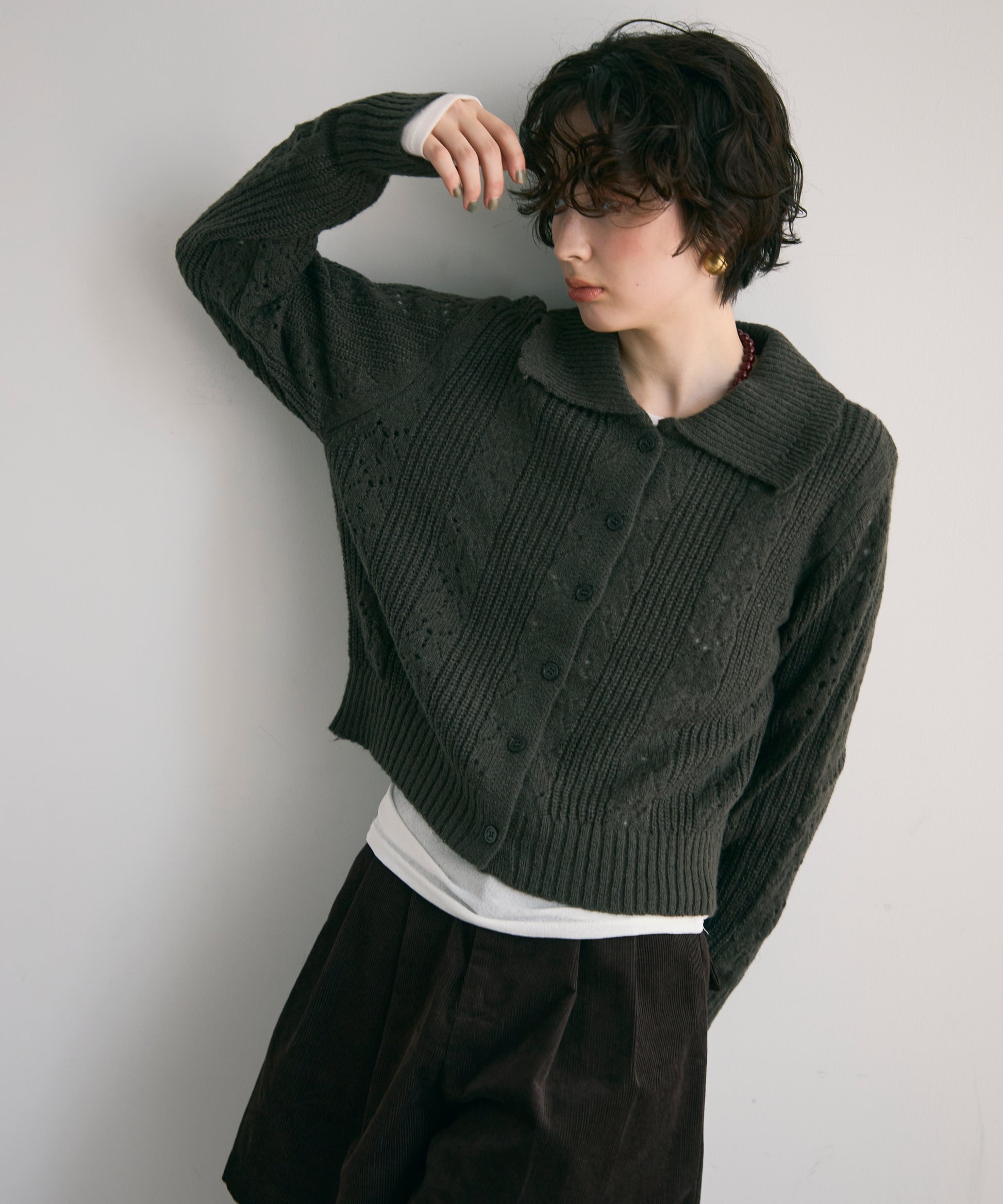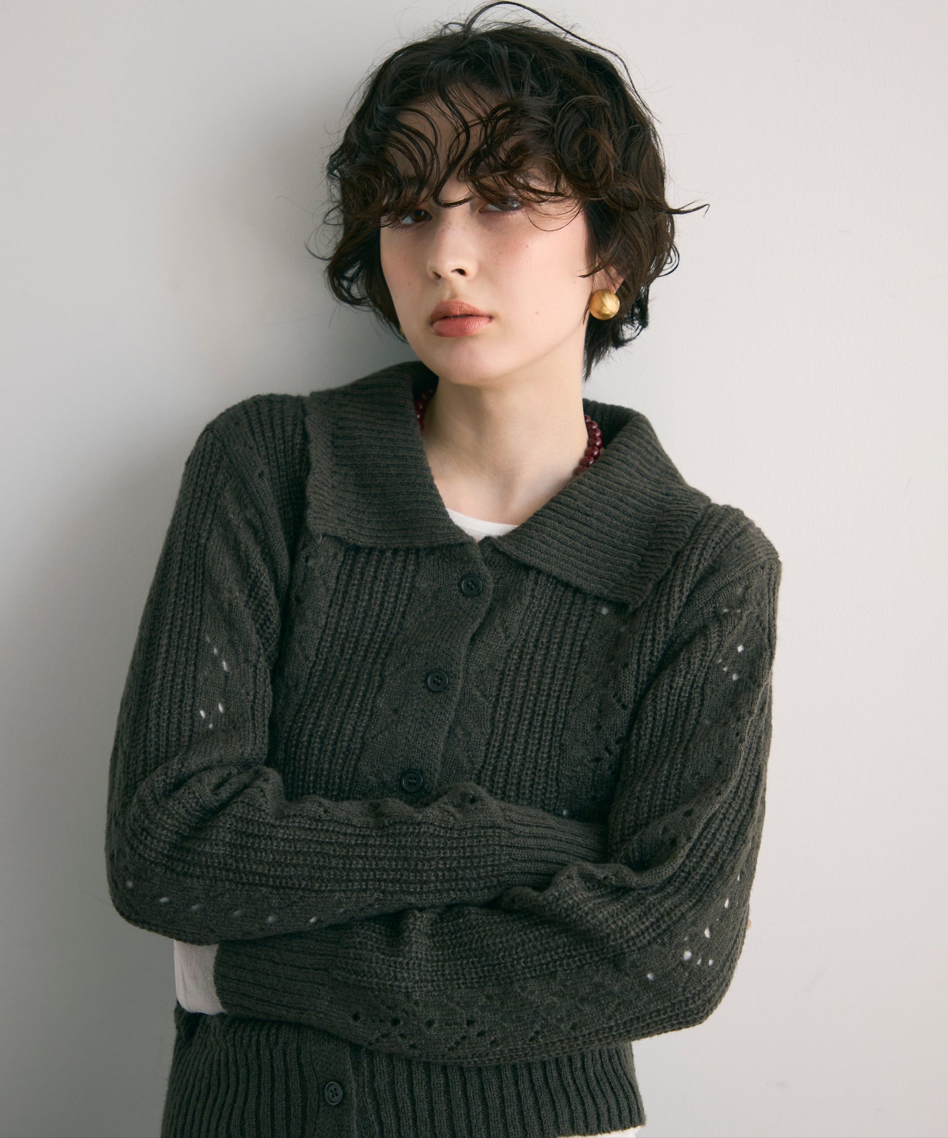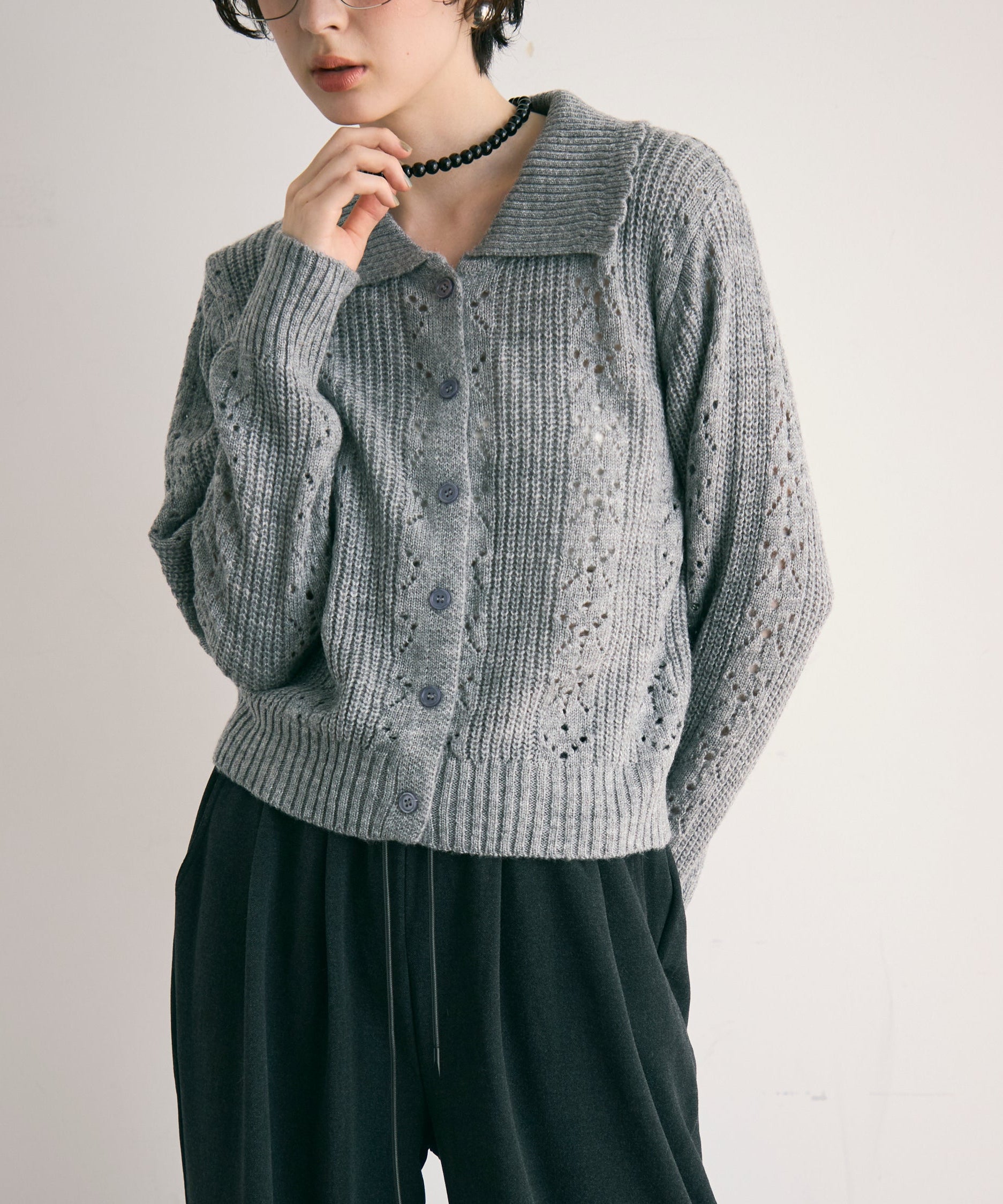 クラシカルなポロ襟デザインに、ふわっとアイレット編みを取り入れたニットカーディガン。