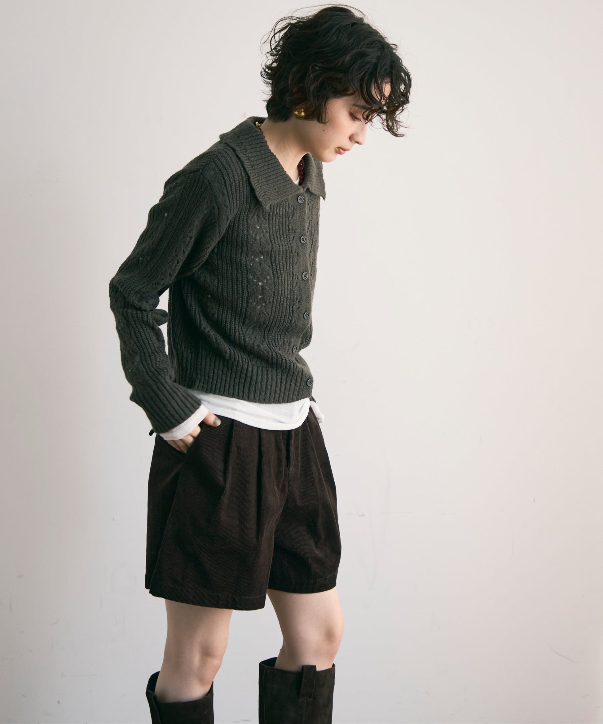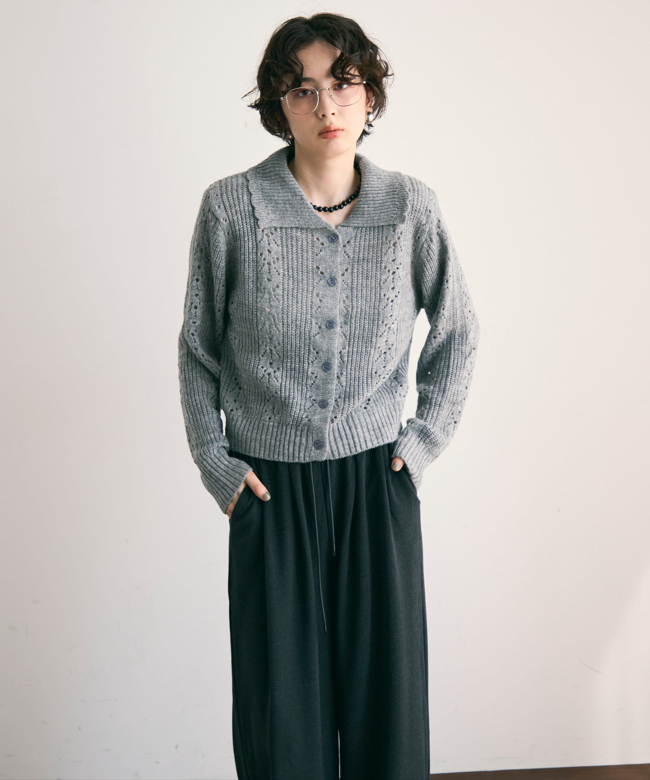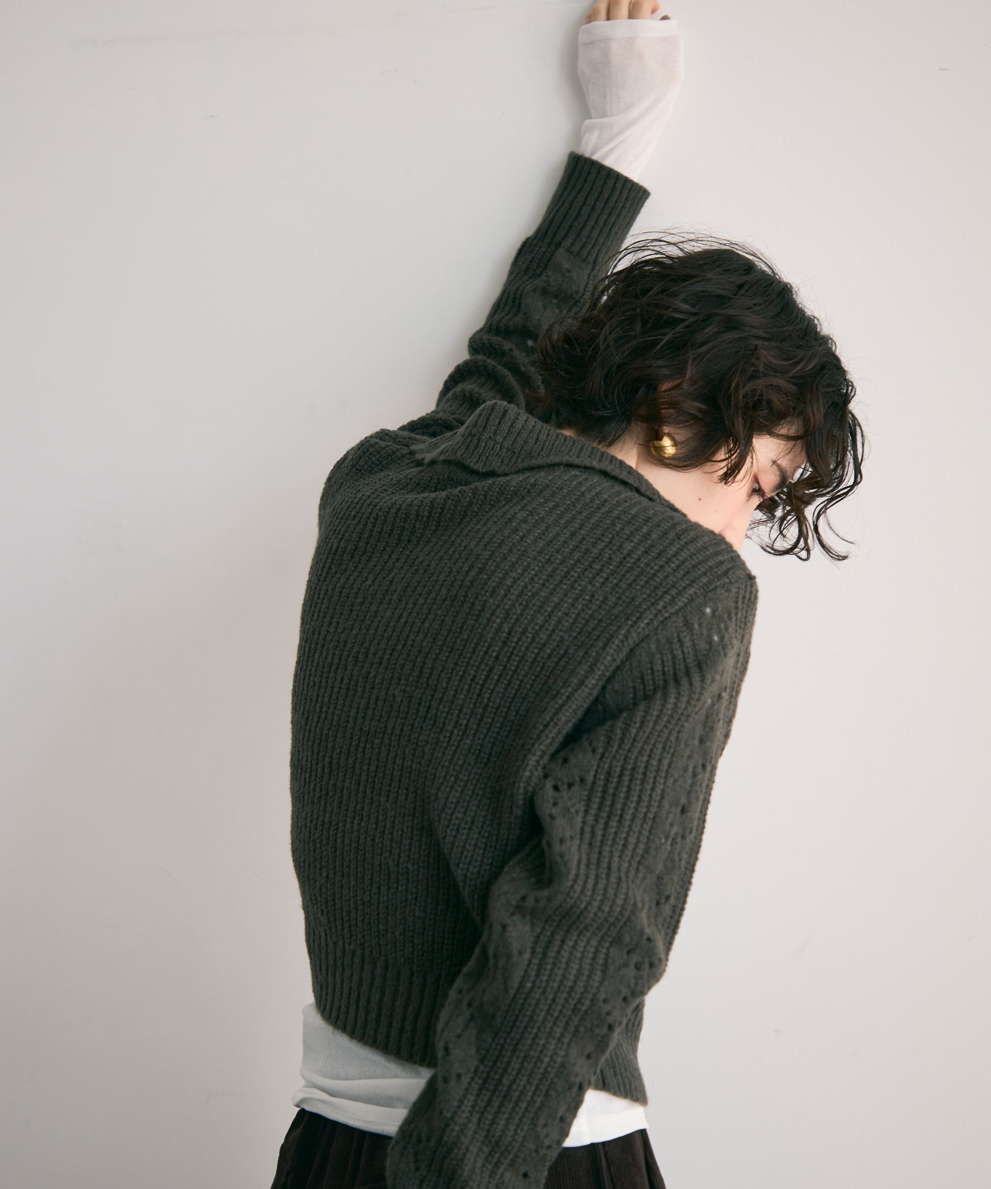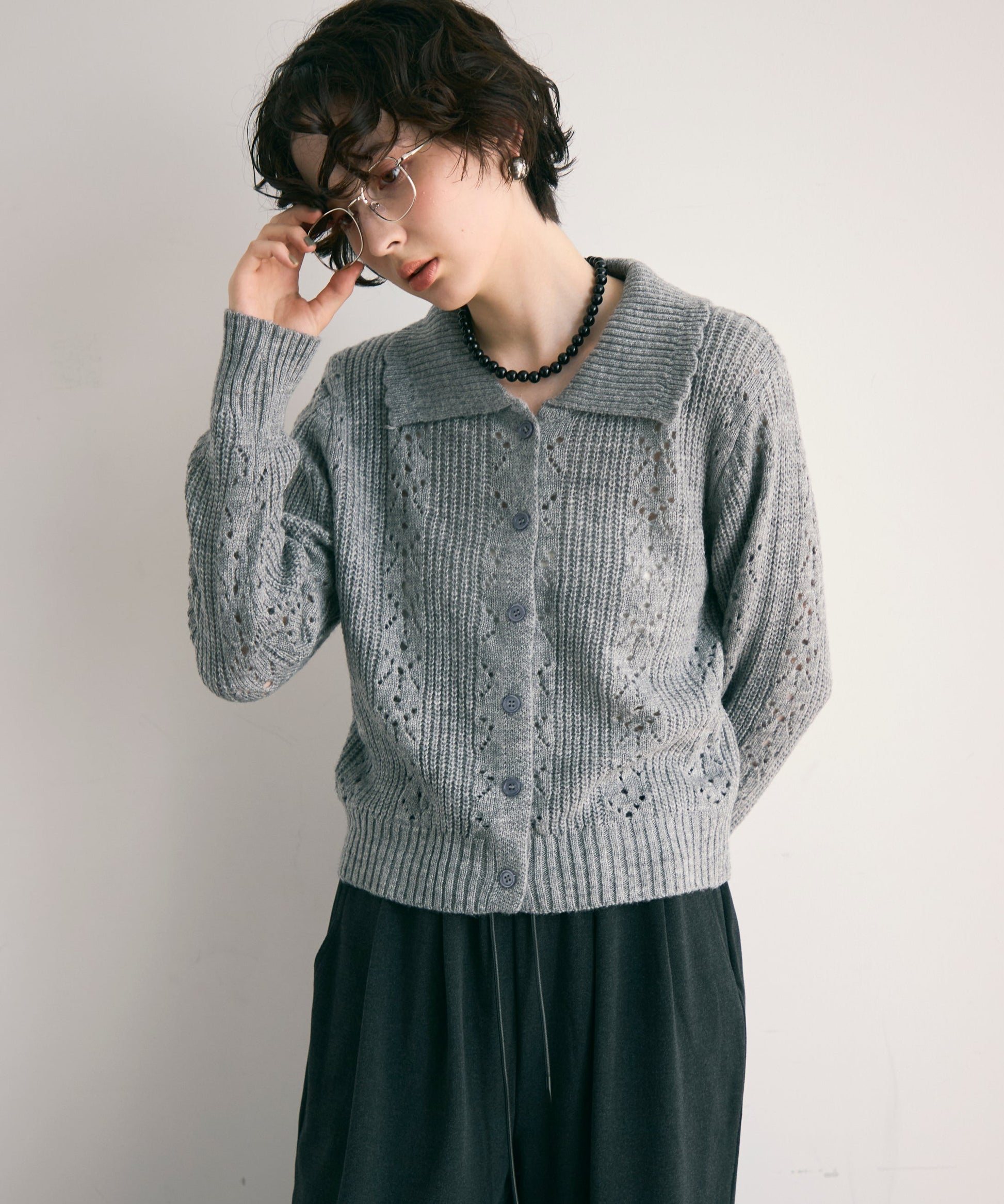 クラシカルなポロ襟デザインに、ふわっとアイレット編みを取り入れたニットカーディガン。