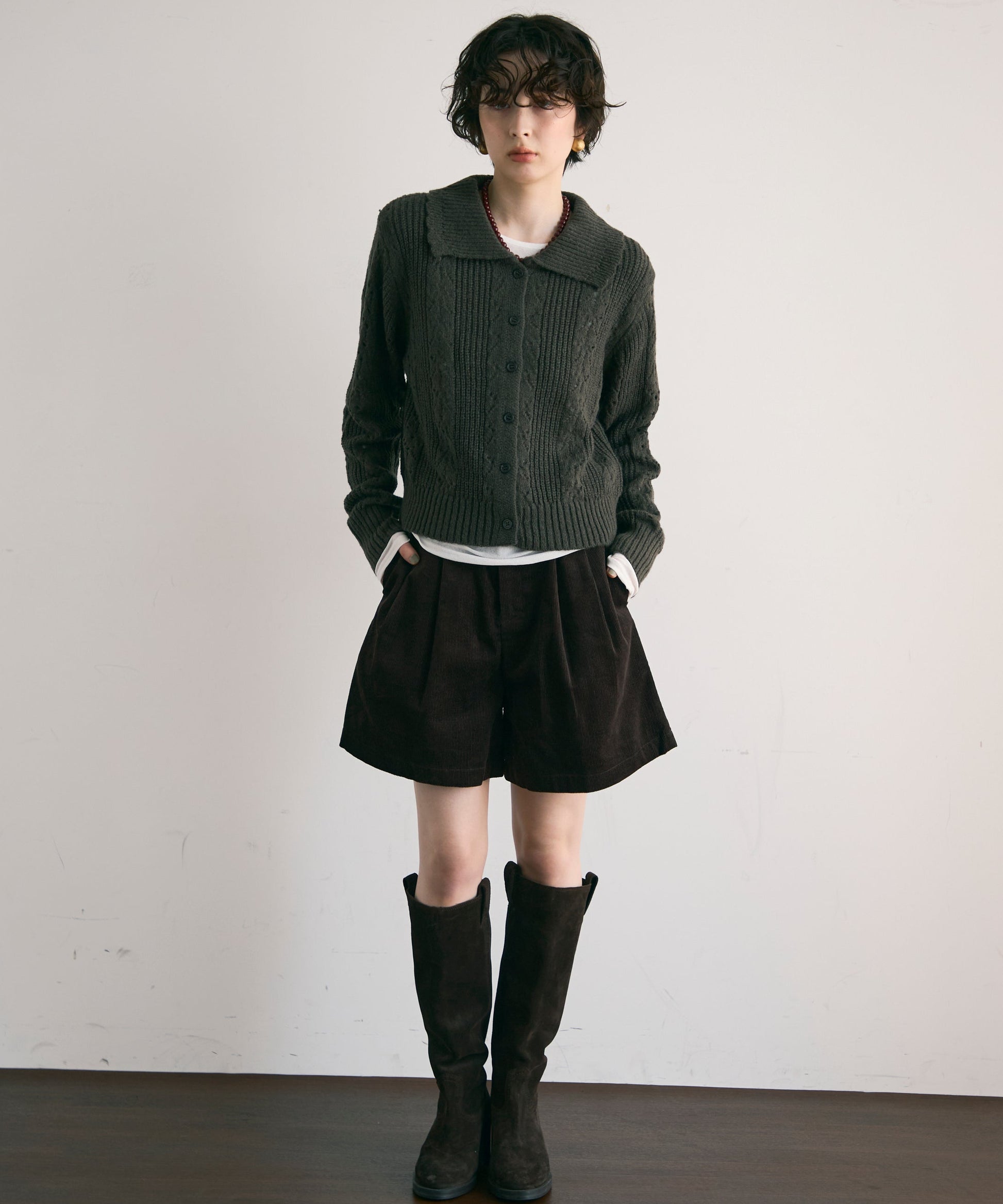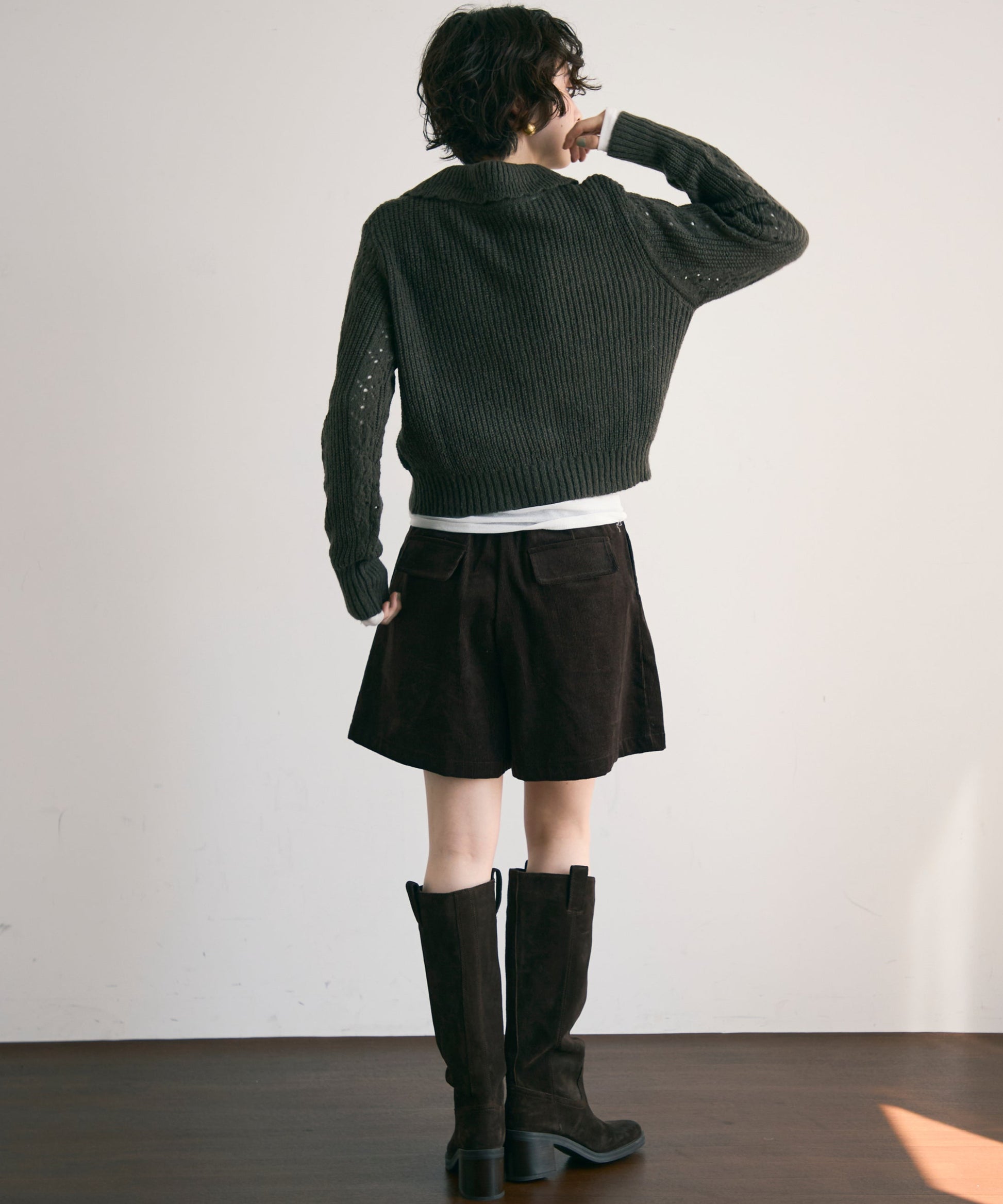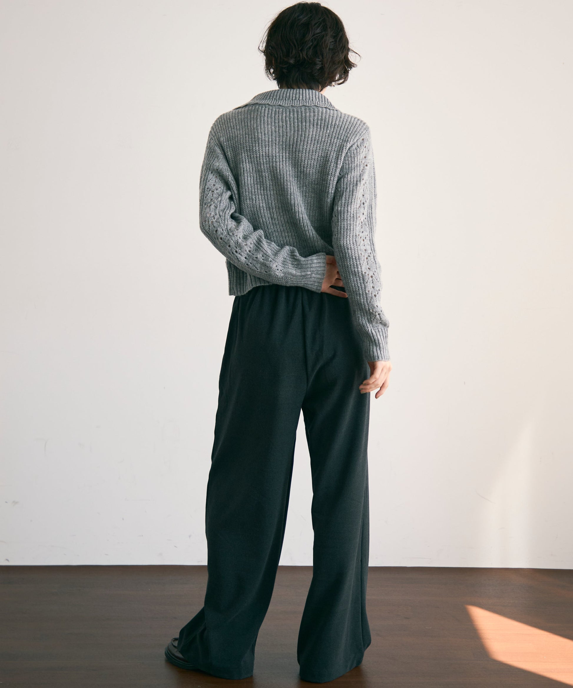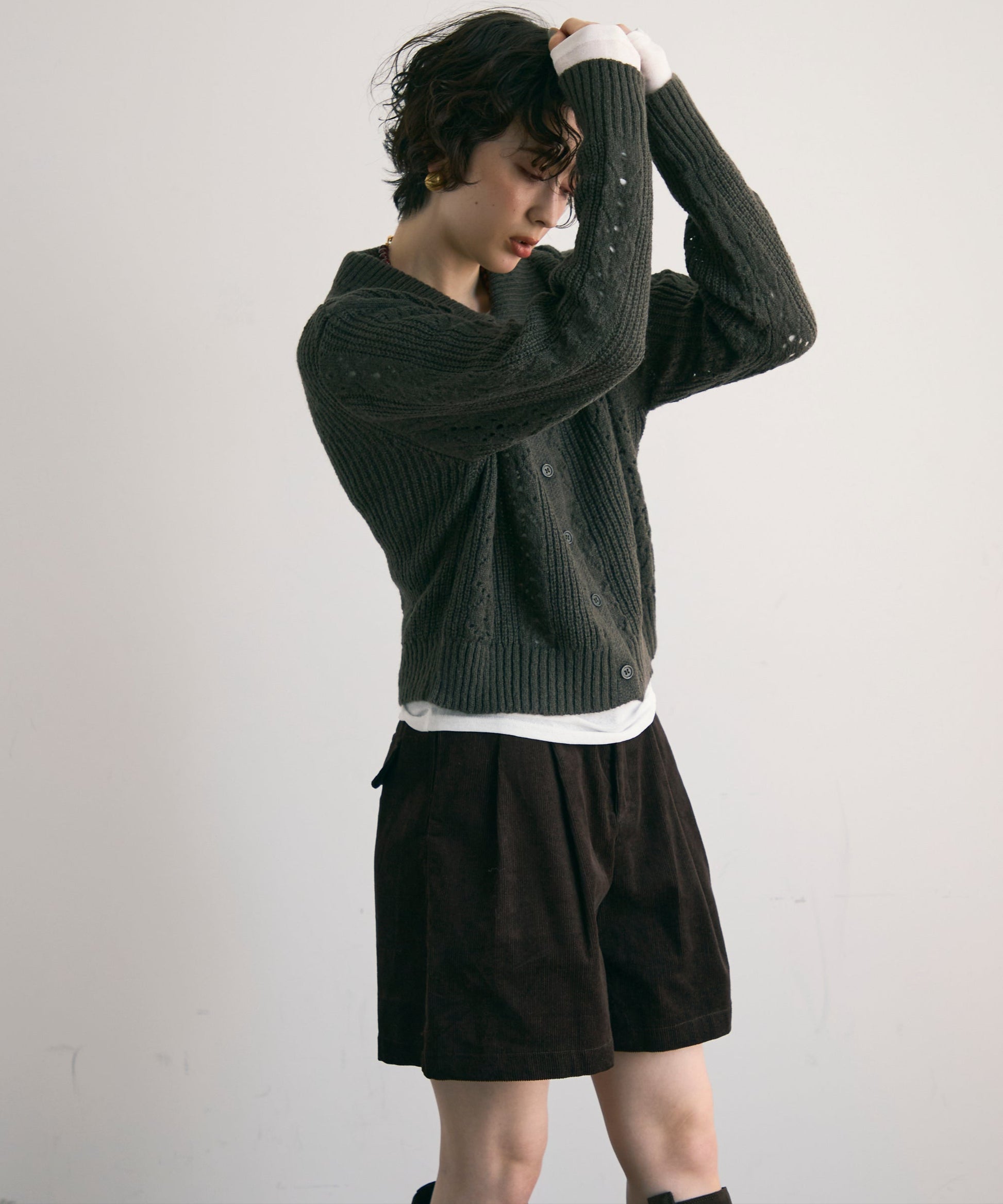 クラシカルなポロ襟デザインに、ふわっとアイレット編みを取り入れたニットカーディガン。