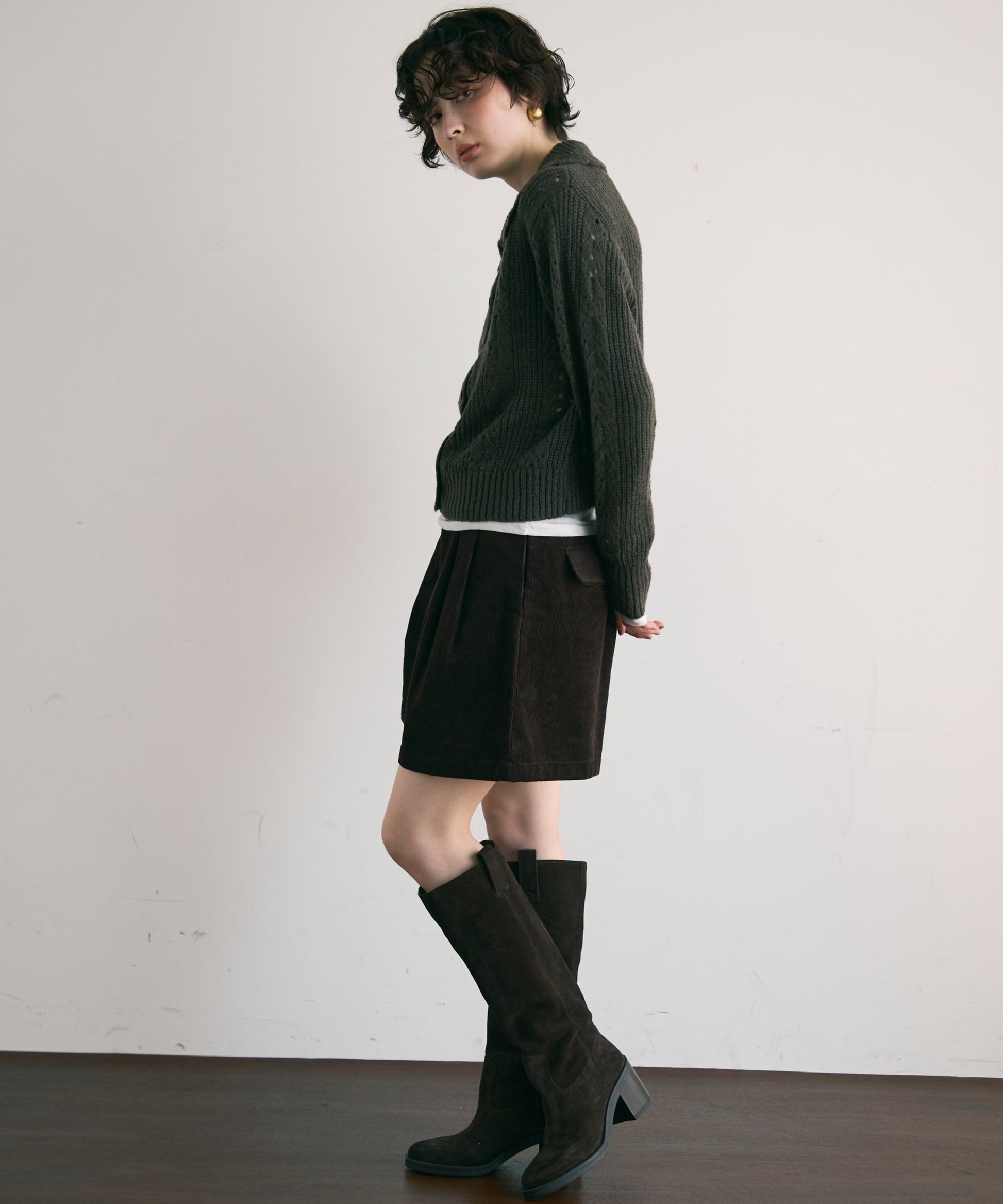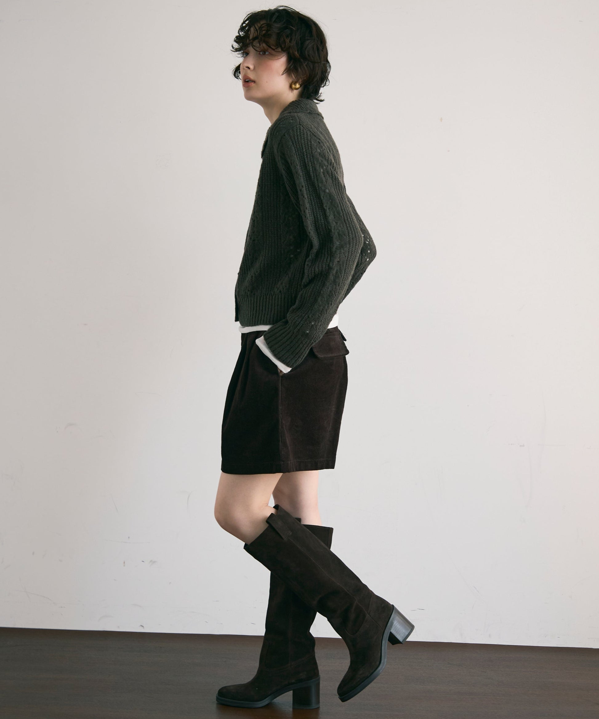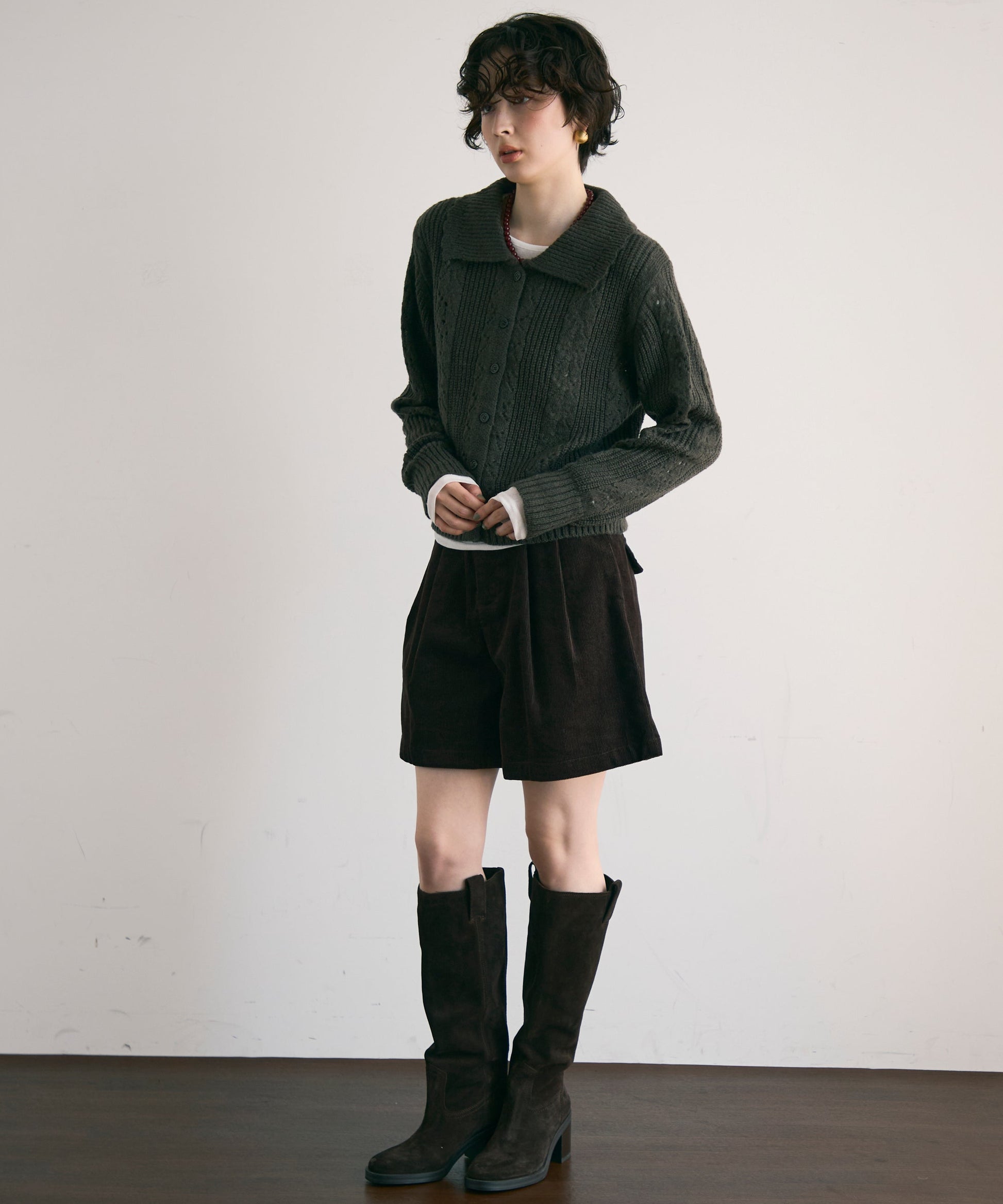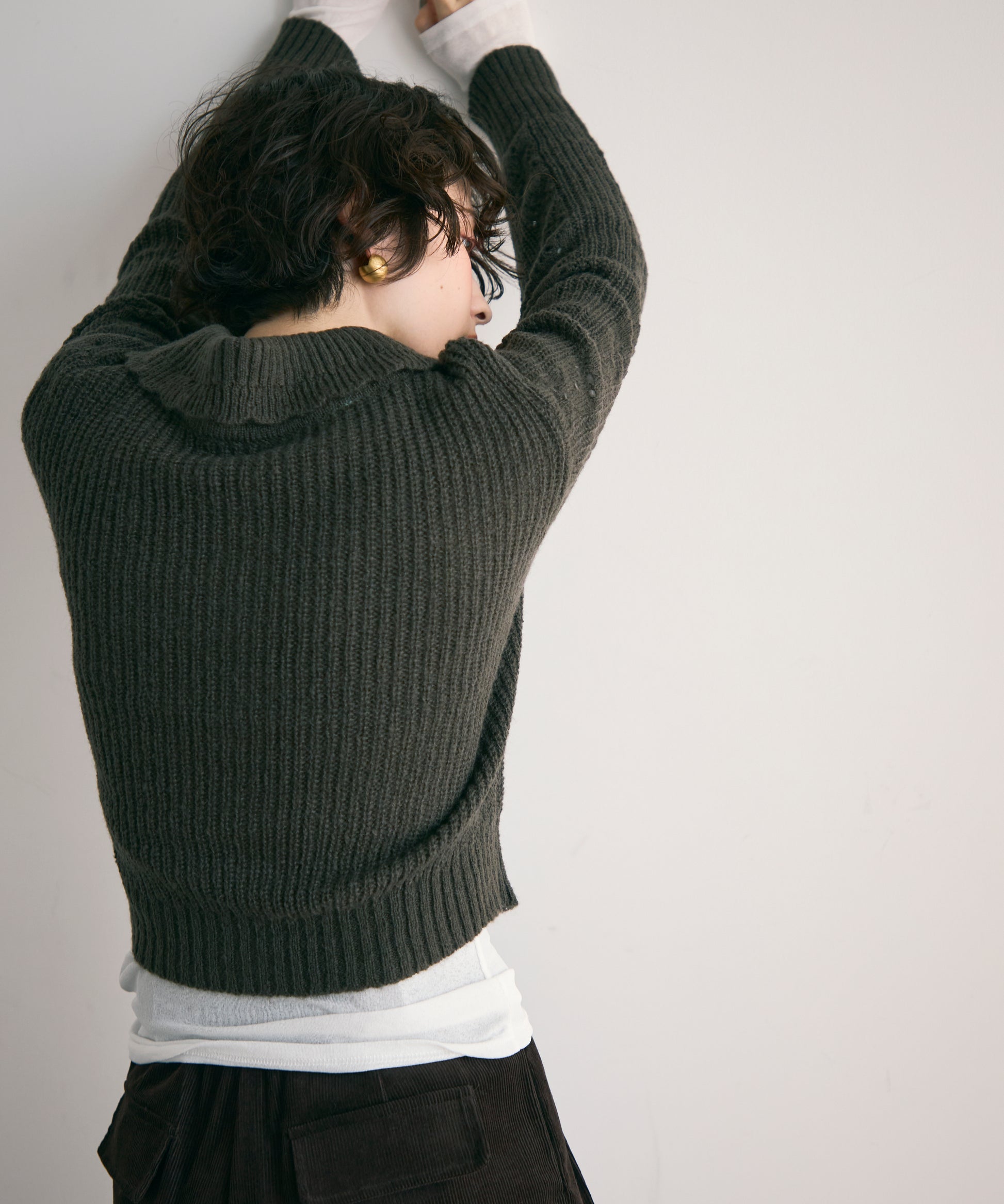 クラシカルなポロ襟デザインに、ふわっとアイレット編みを取り入れたニットカーディガン。