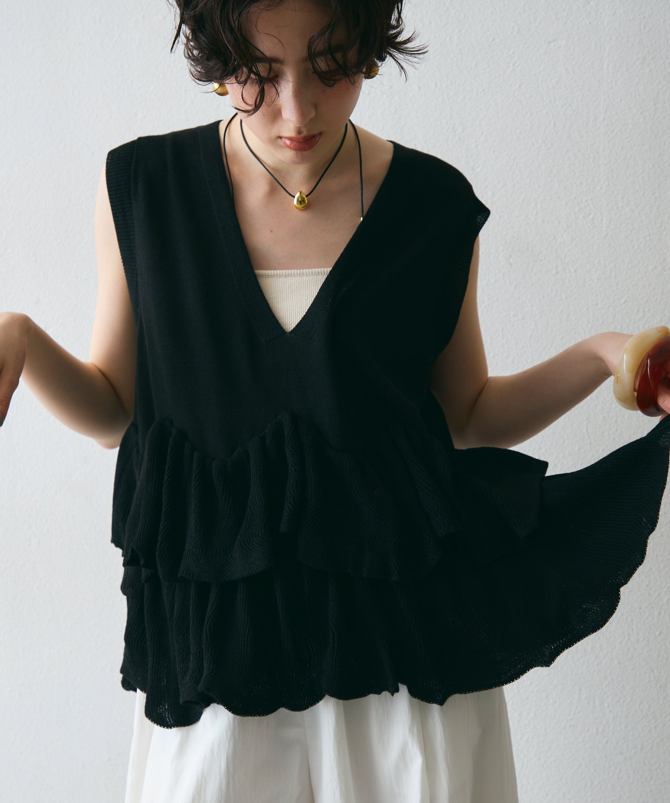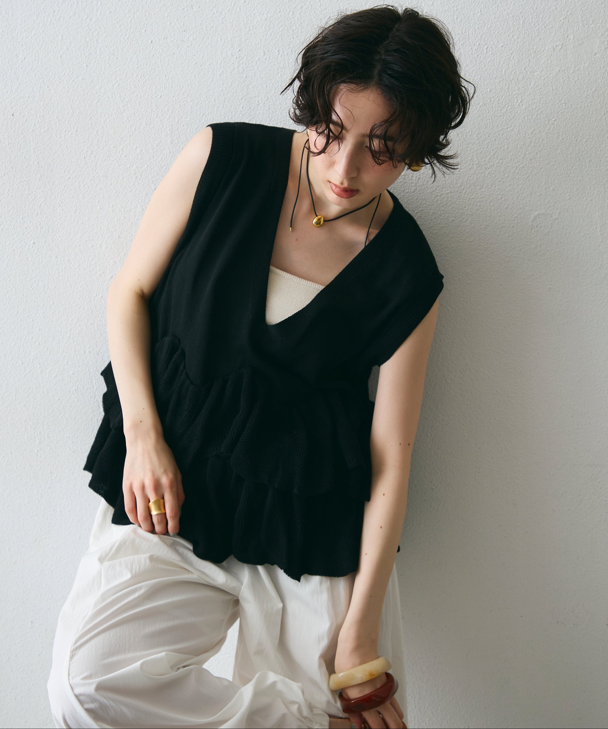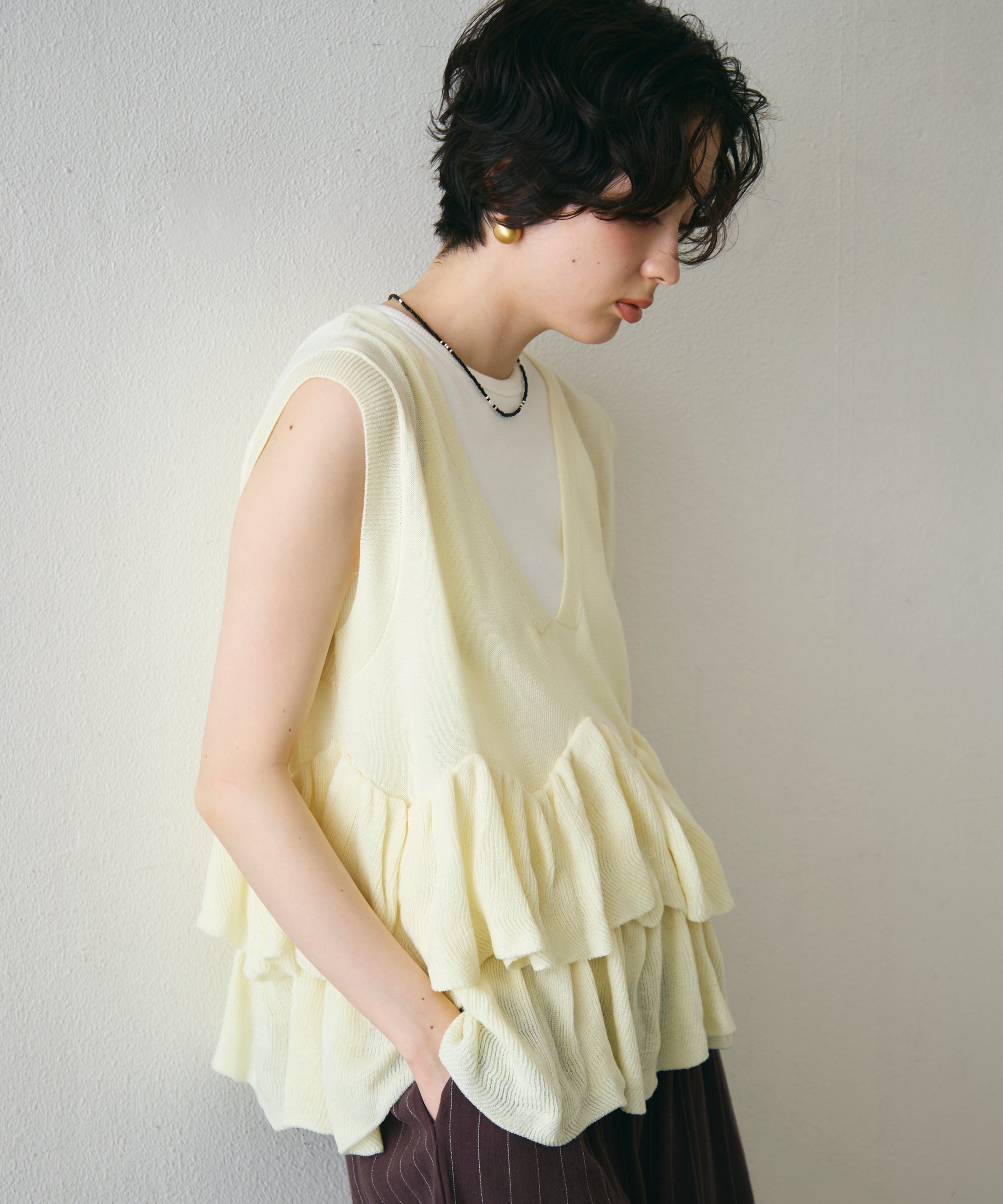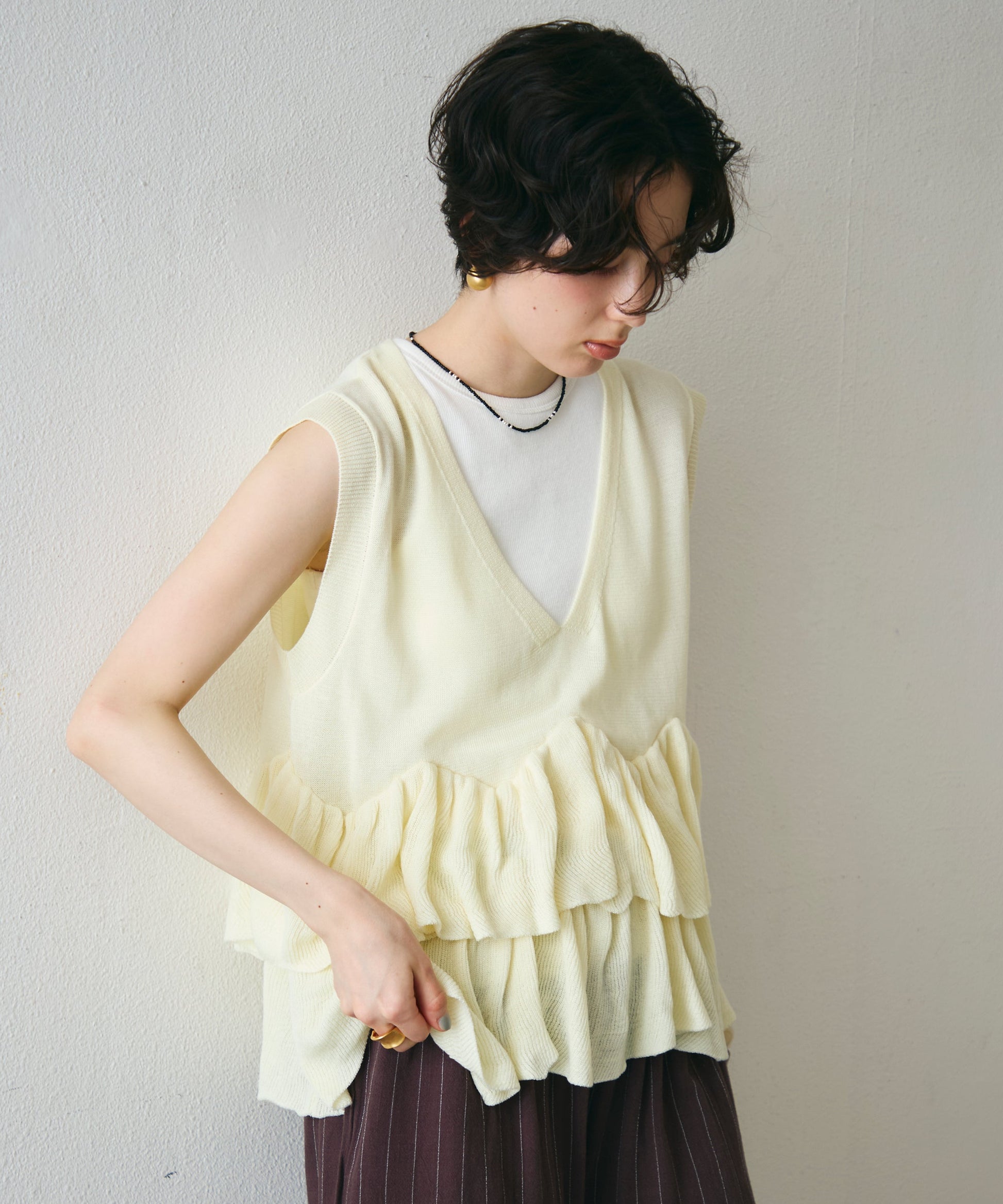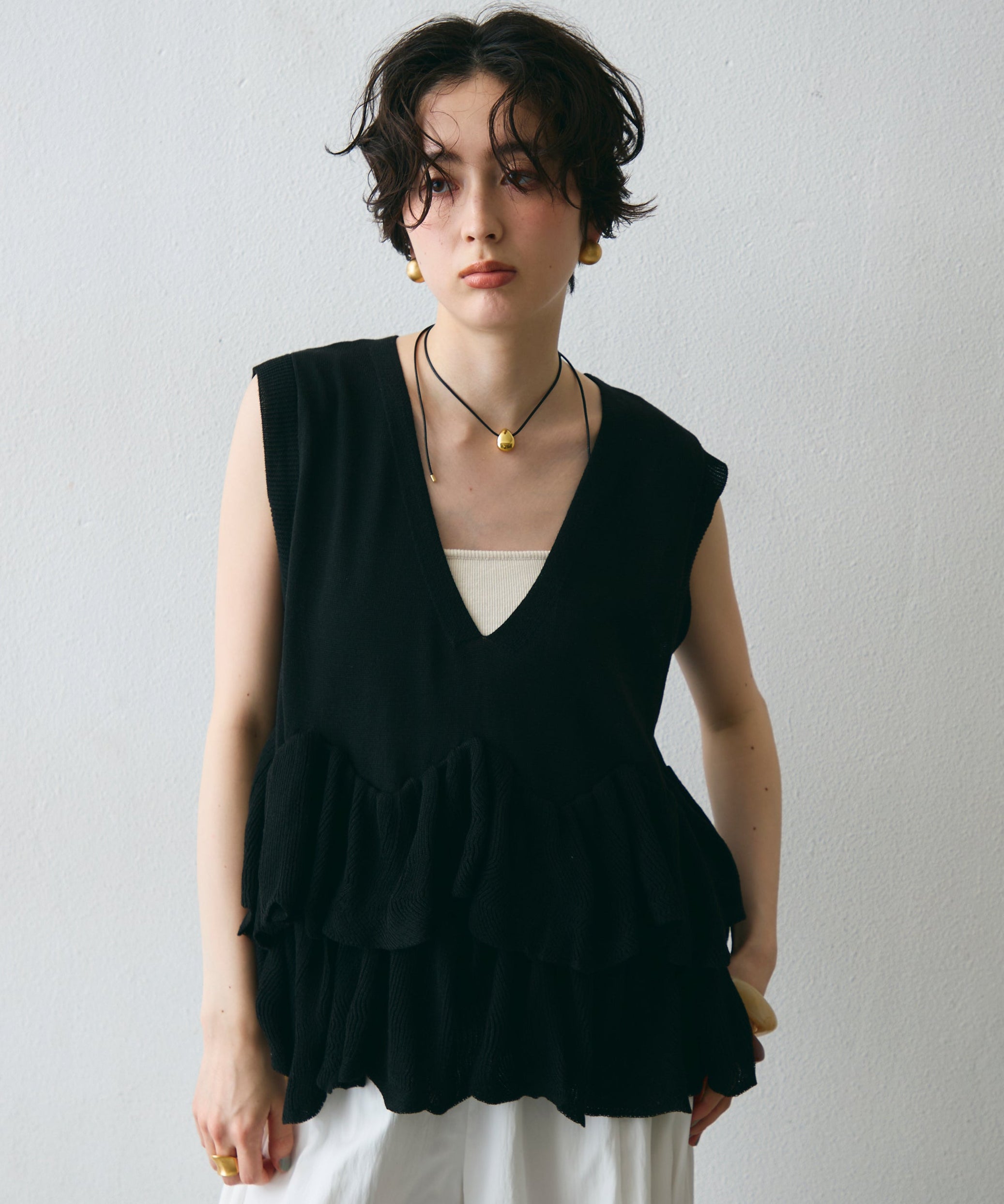 アシンメトリーにあしらったフリルが、上品な華やかさを添えるニットベスト。