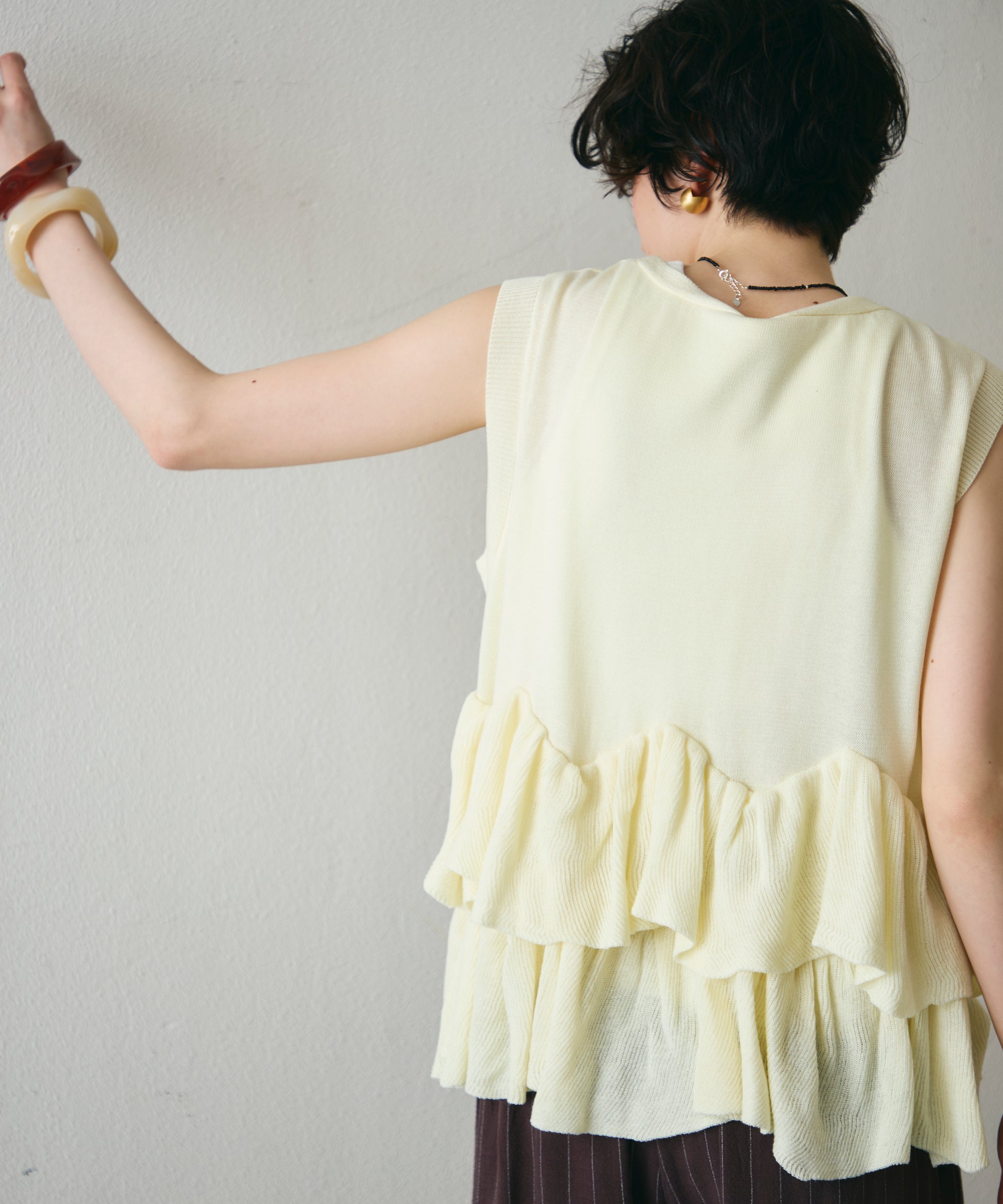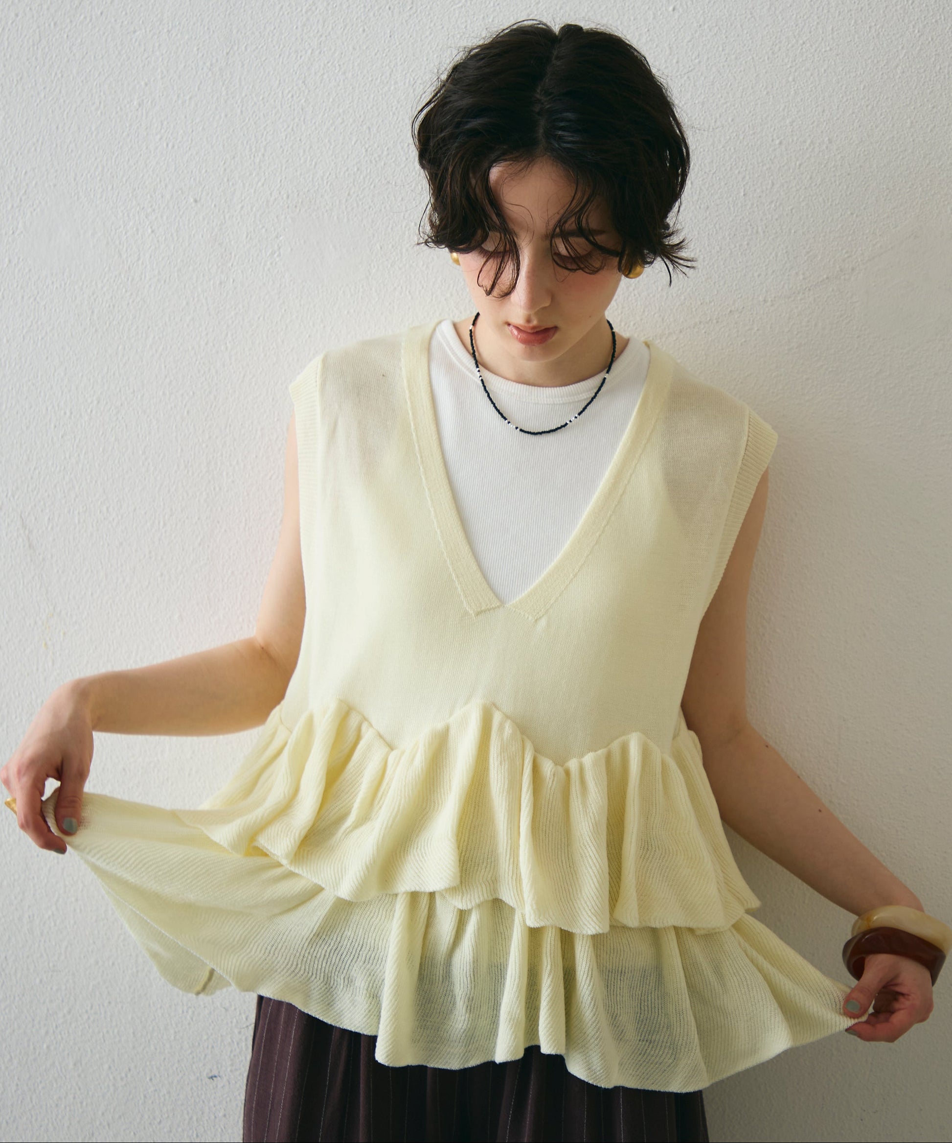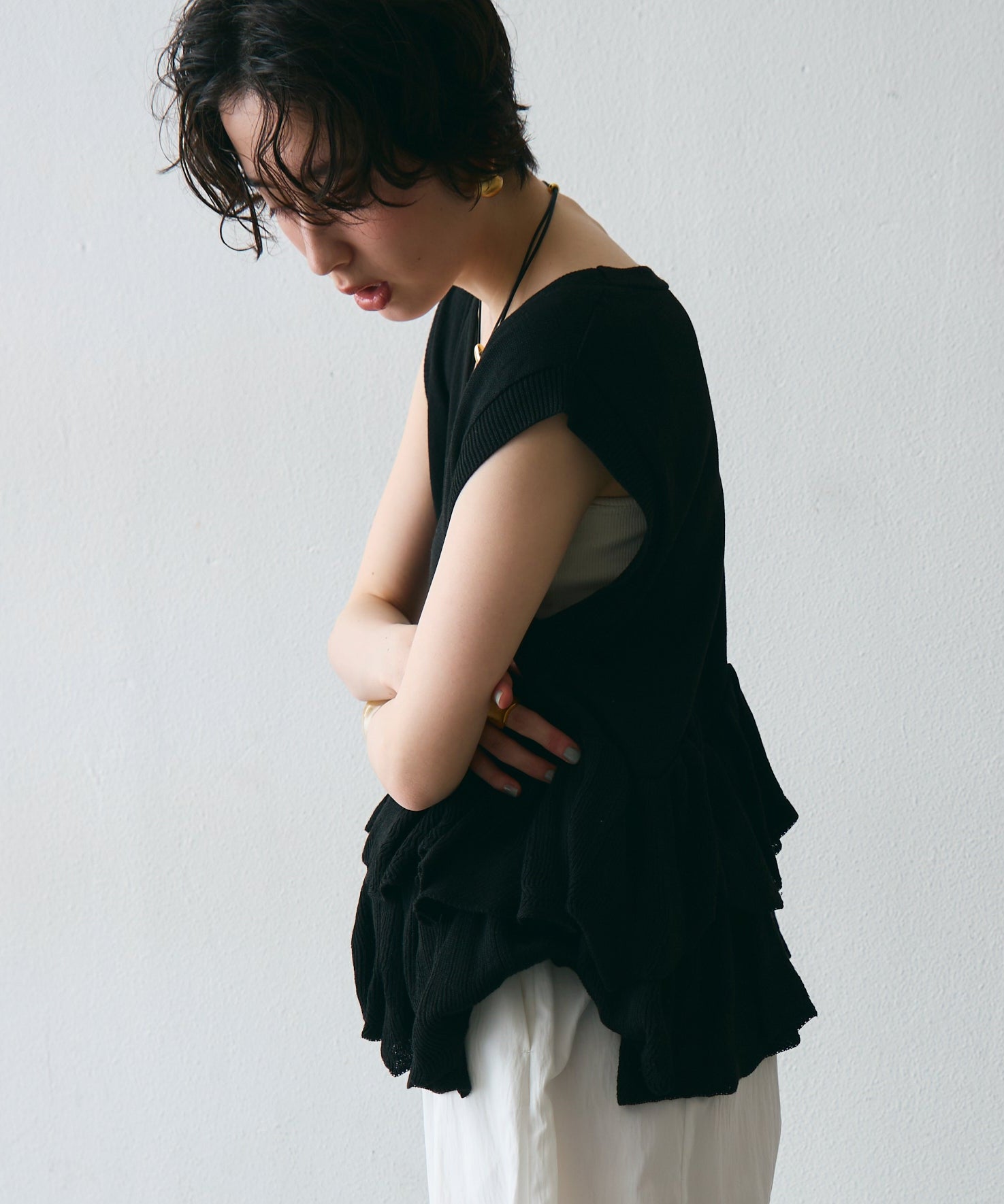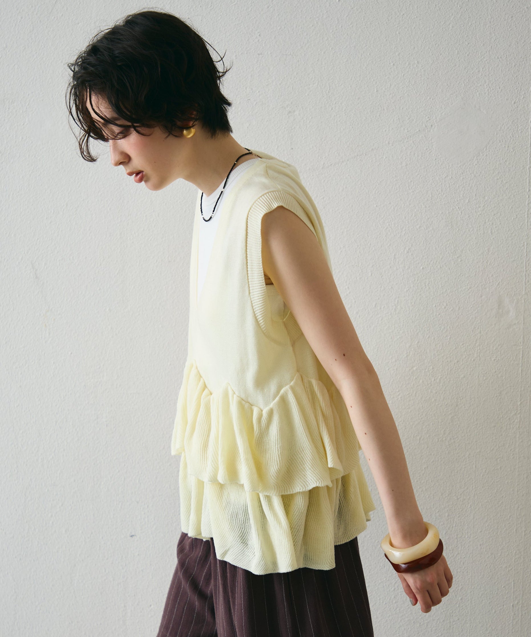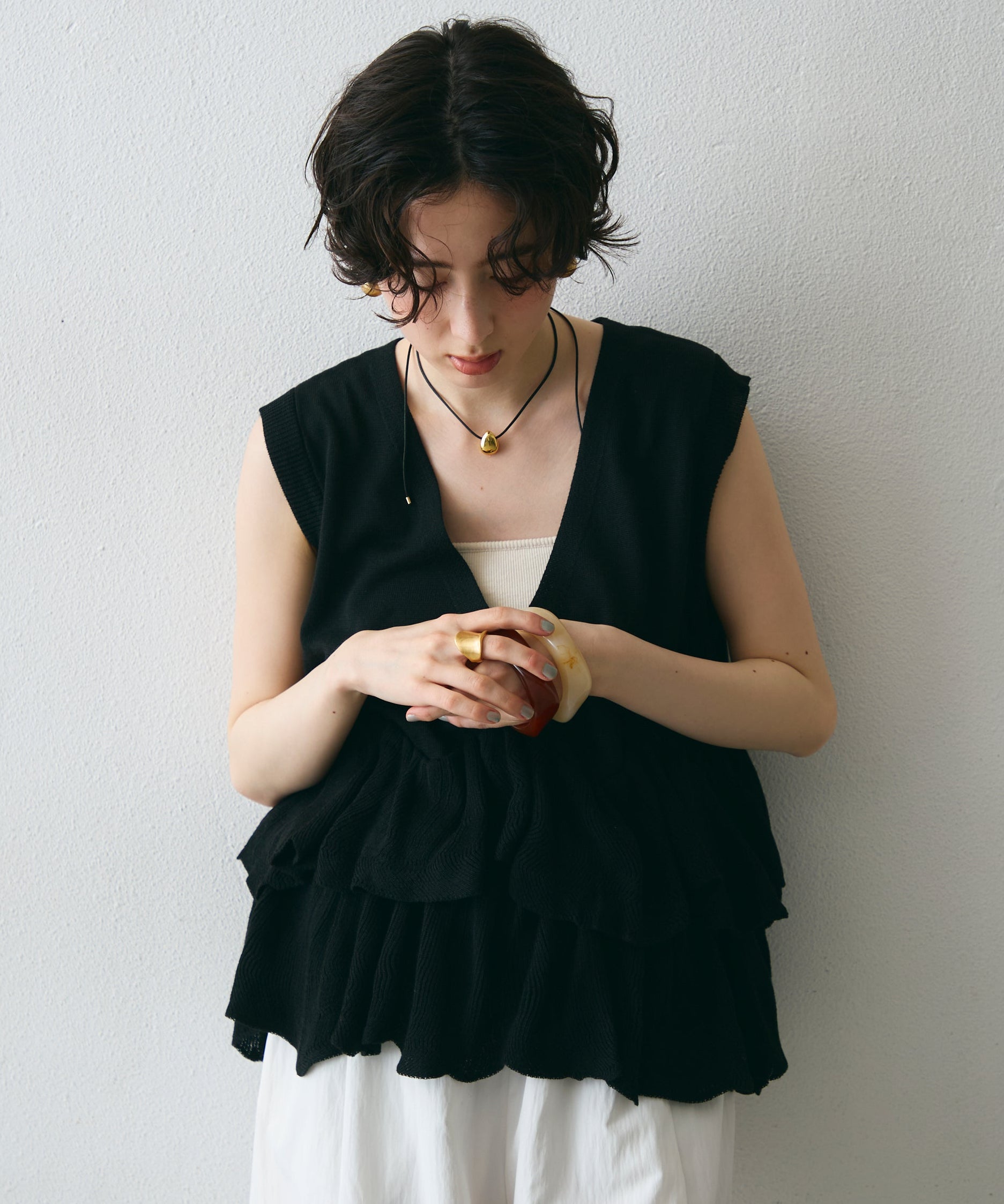 アシンメトリーにあしらったフリルが、上品な華やかさを添えるニットベスト。