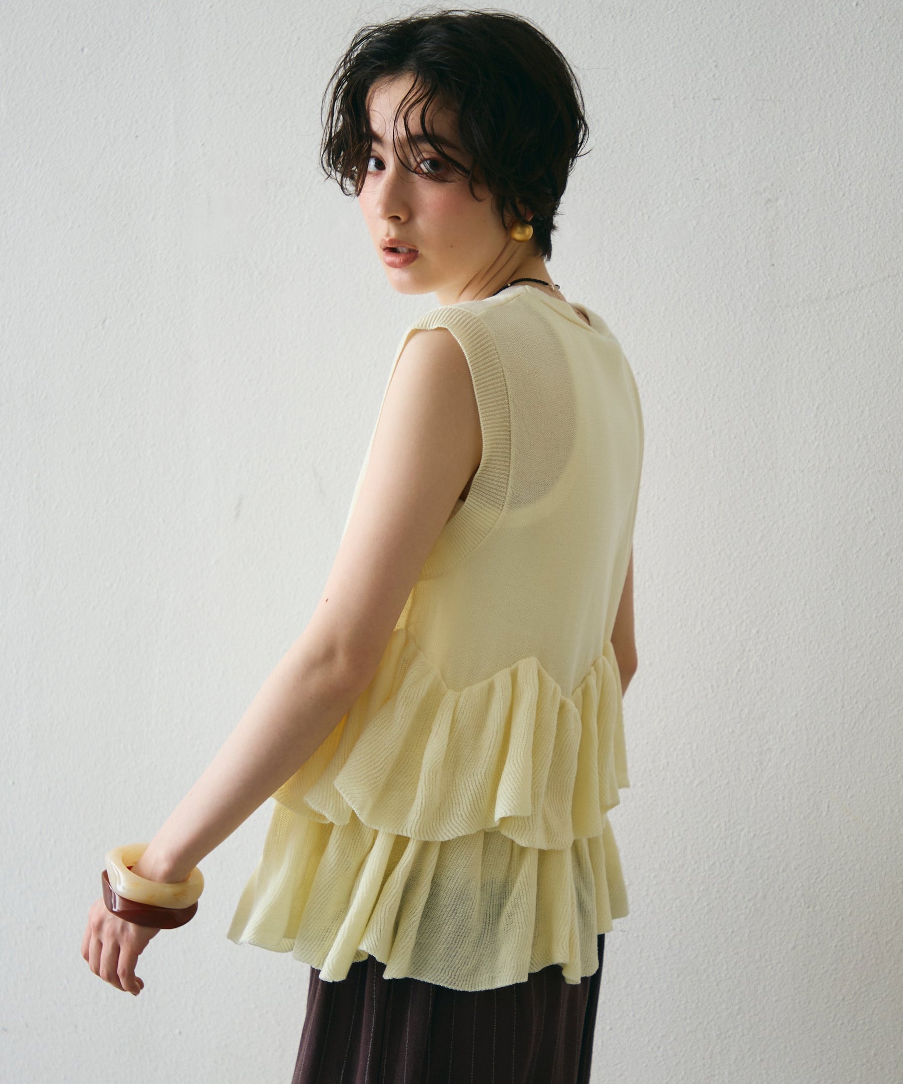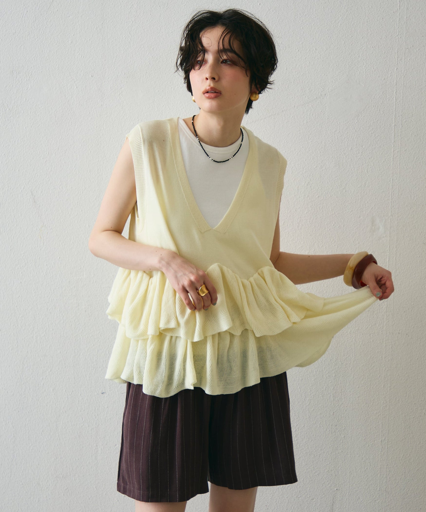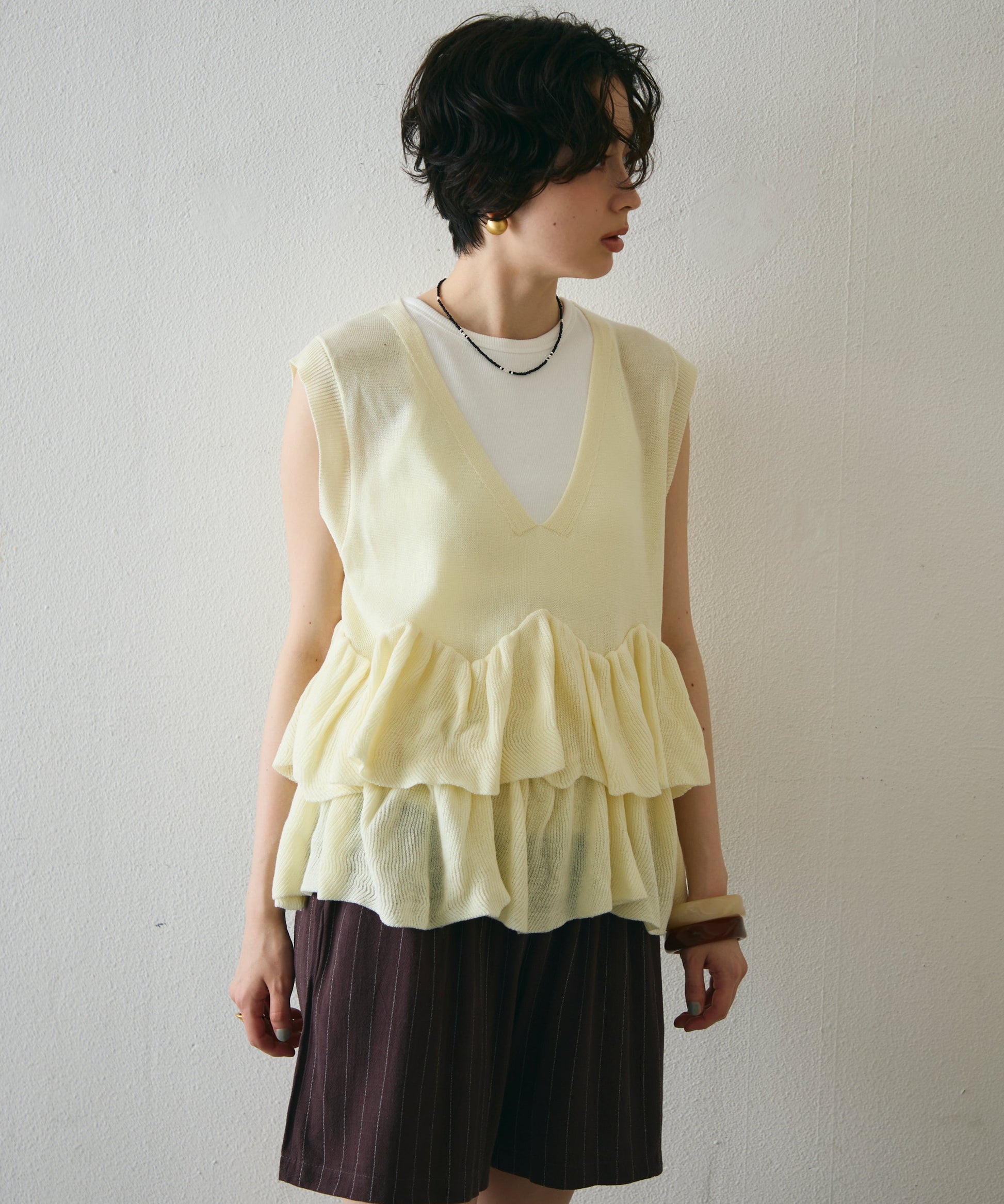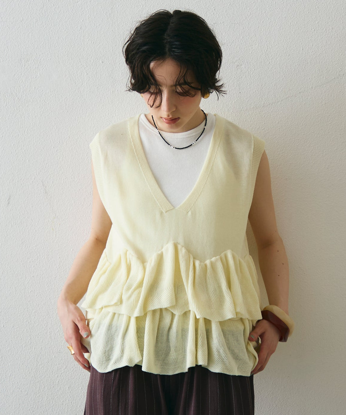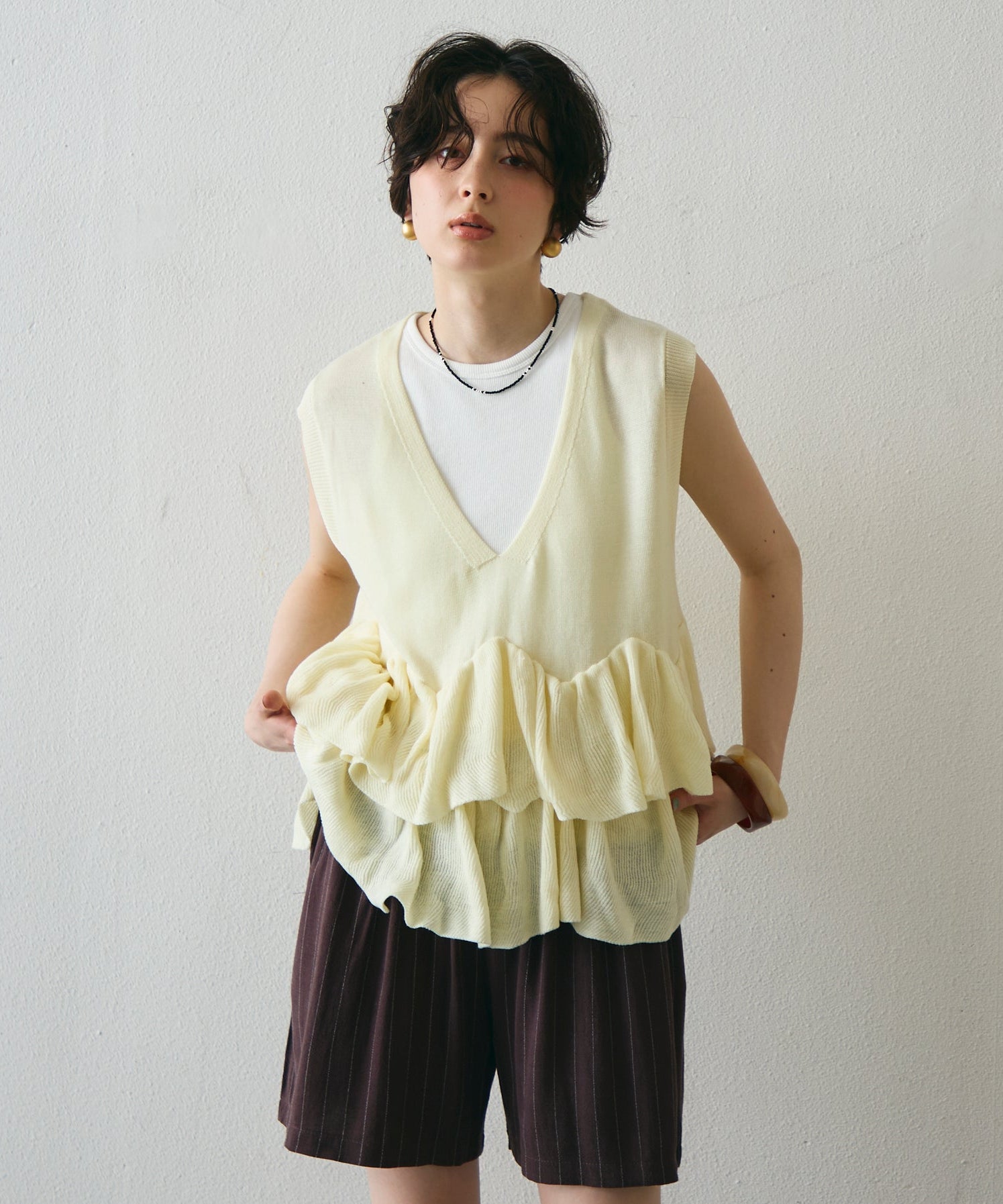 アシンメトリーにあしらったフリルが、上品な華やかさを添えるニットベスト。