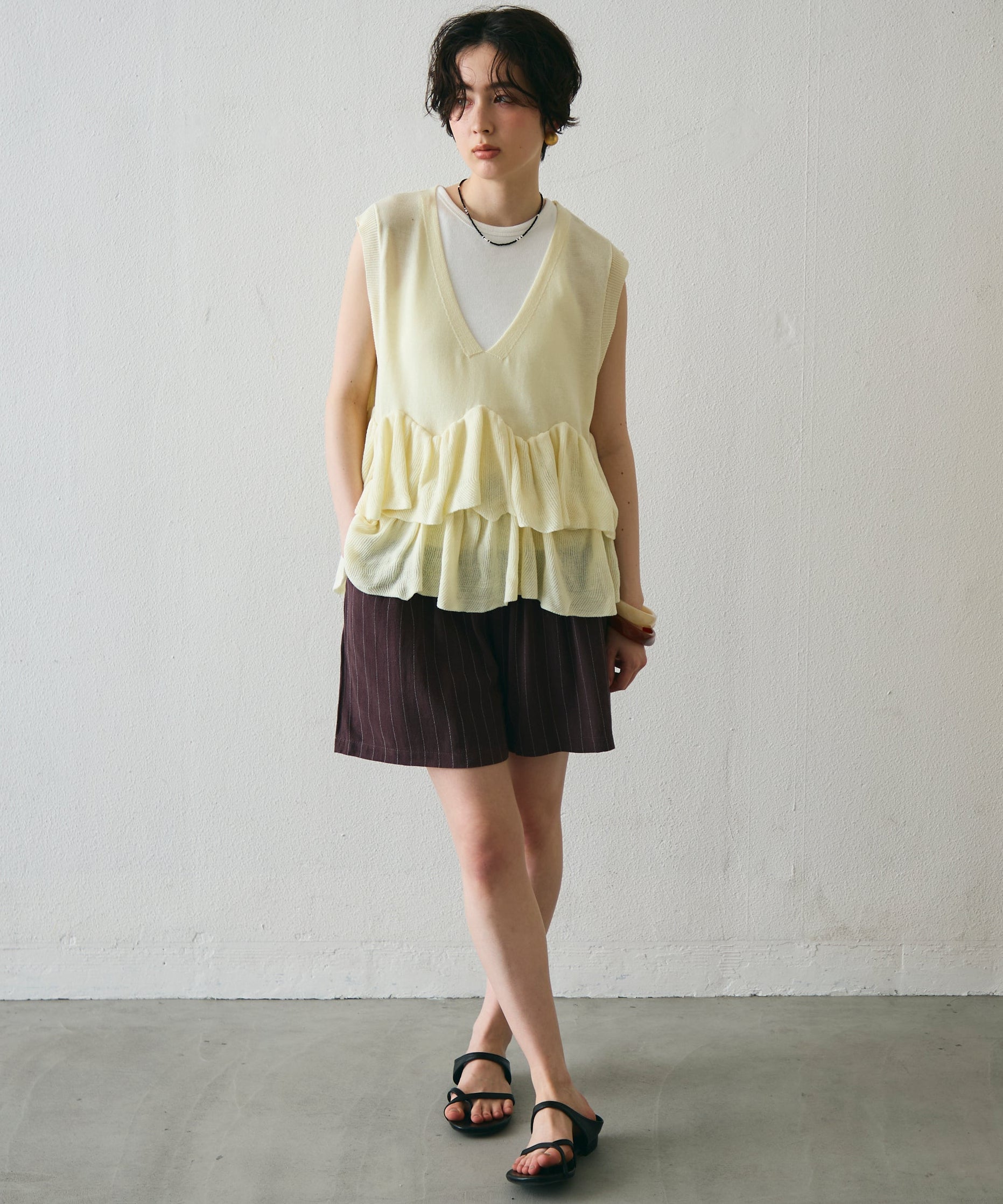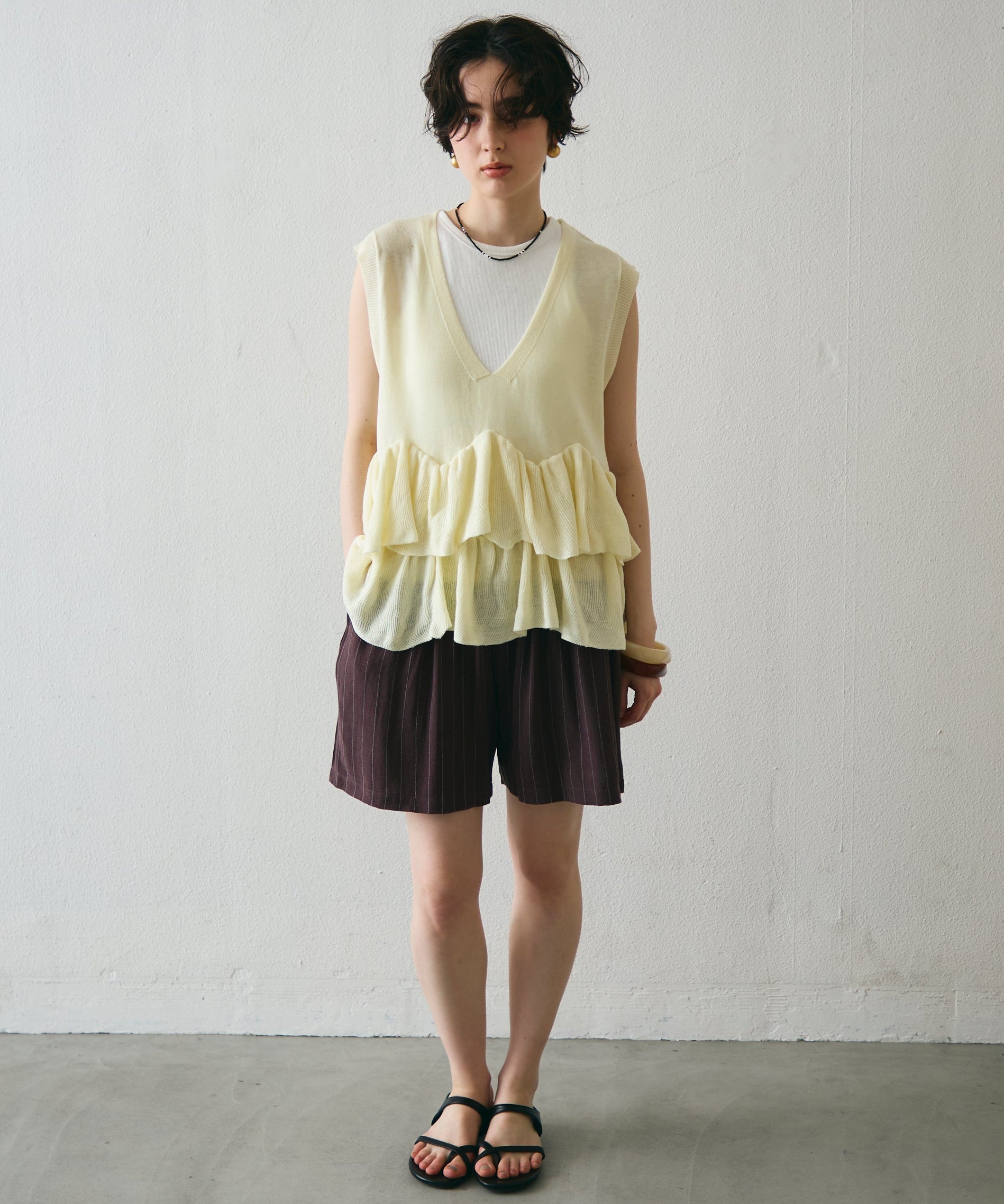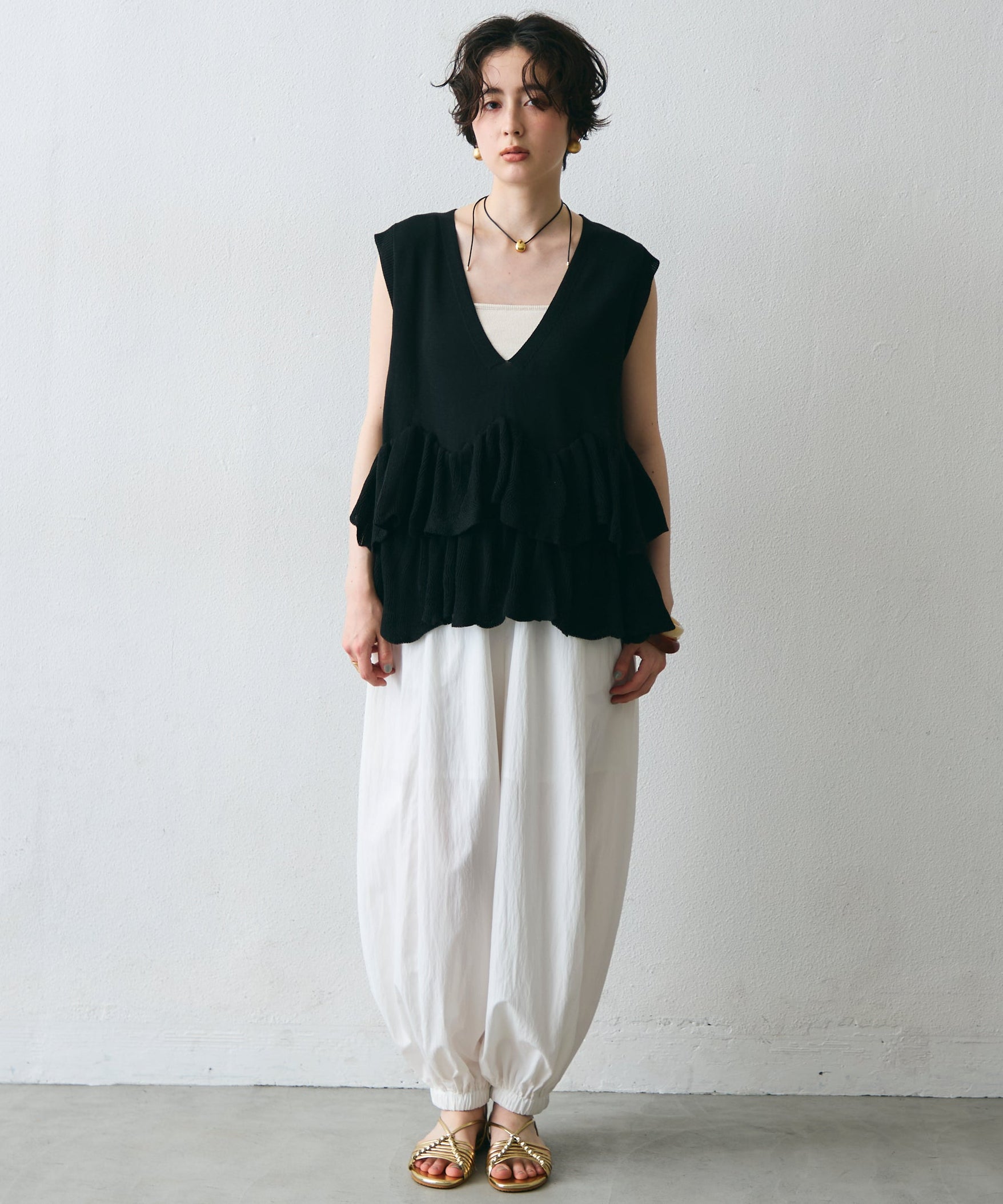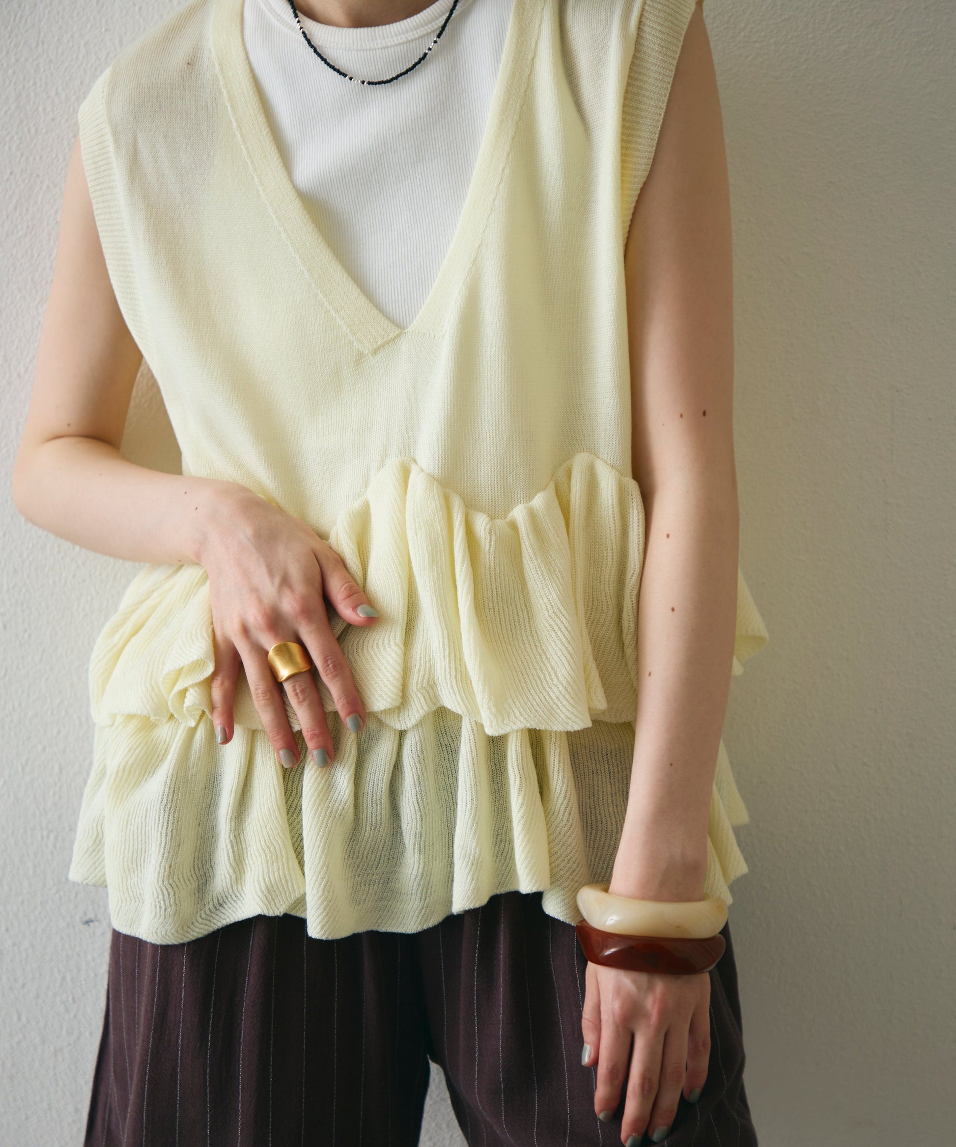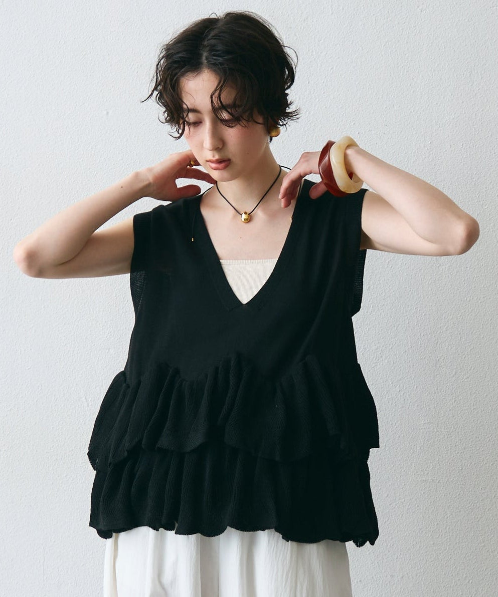 アシンメトリーにあしらったフリルが、上品な華やかさを添えるニットベスト。