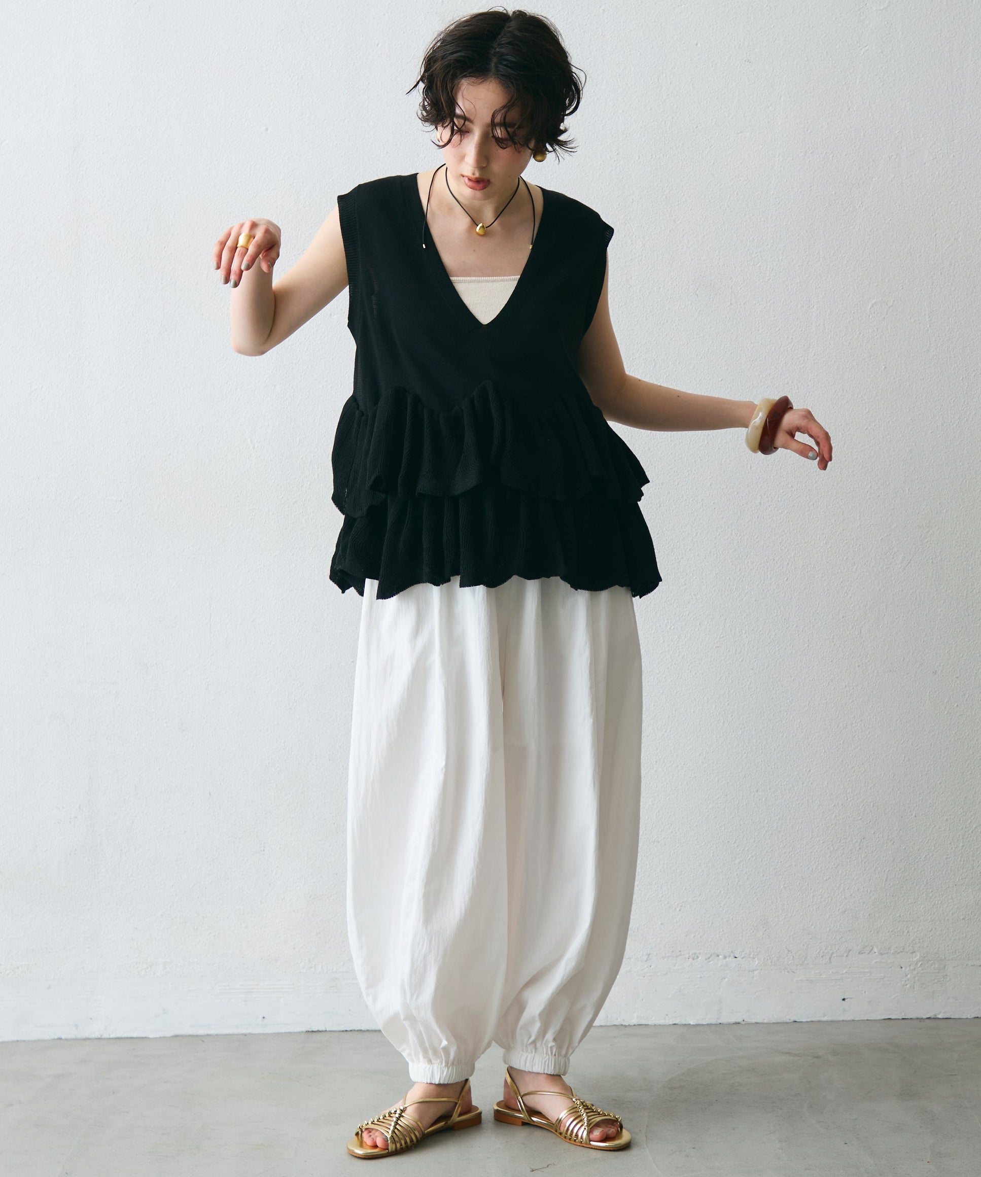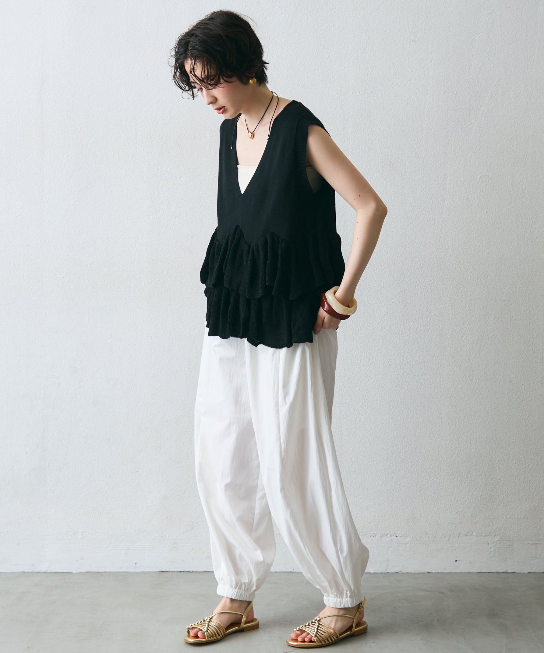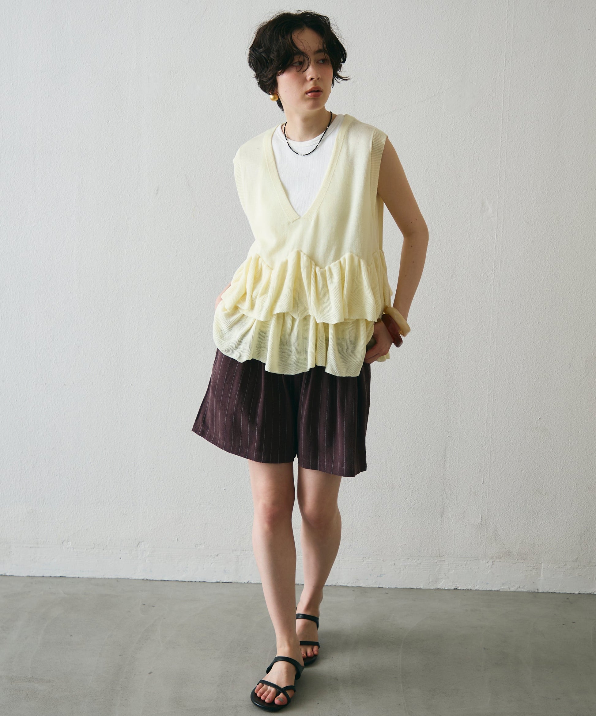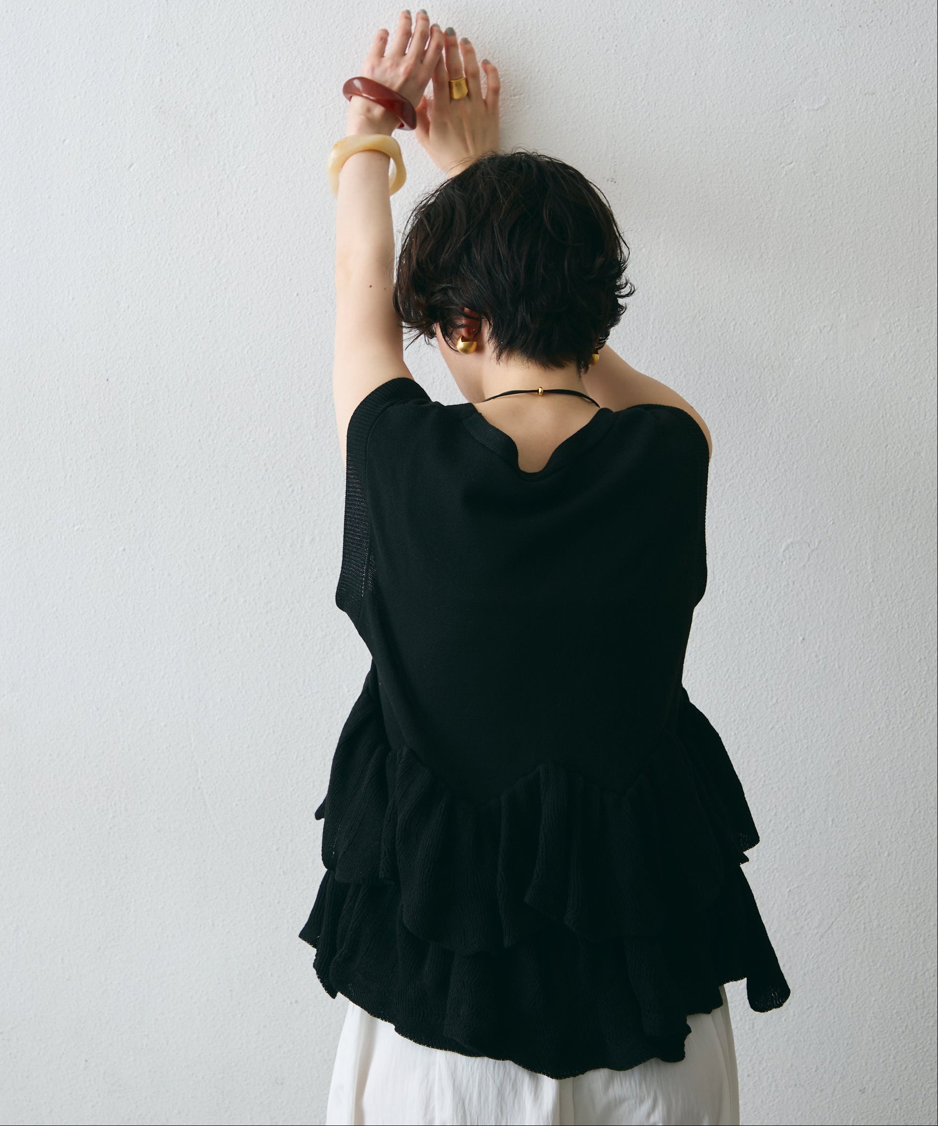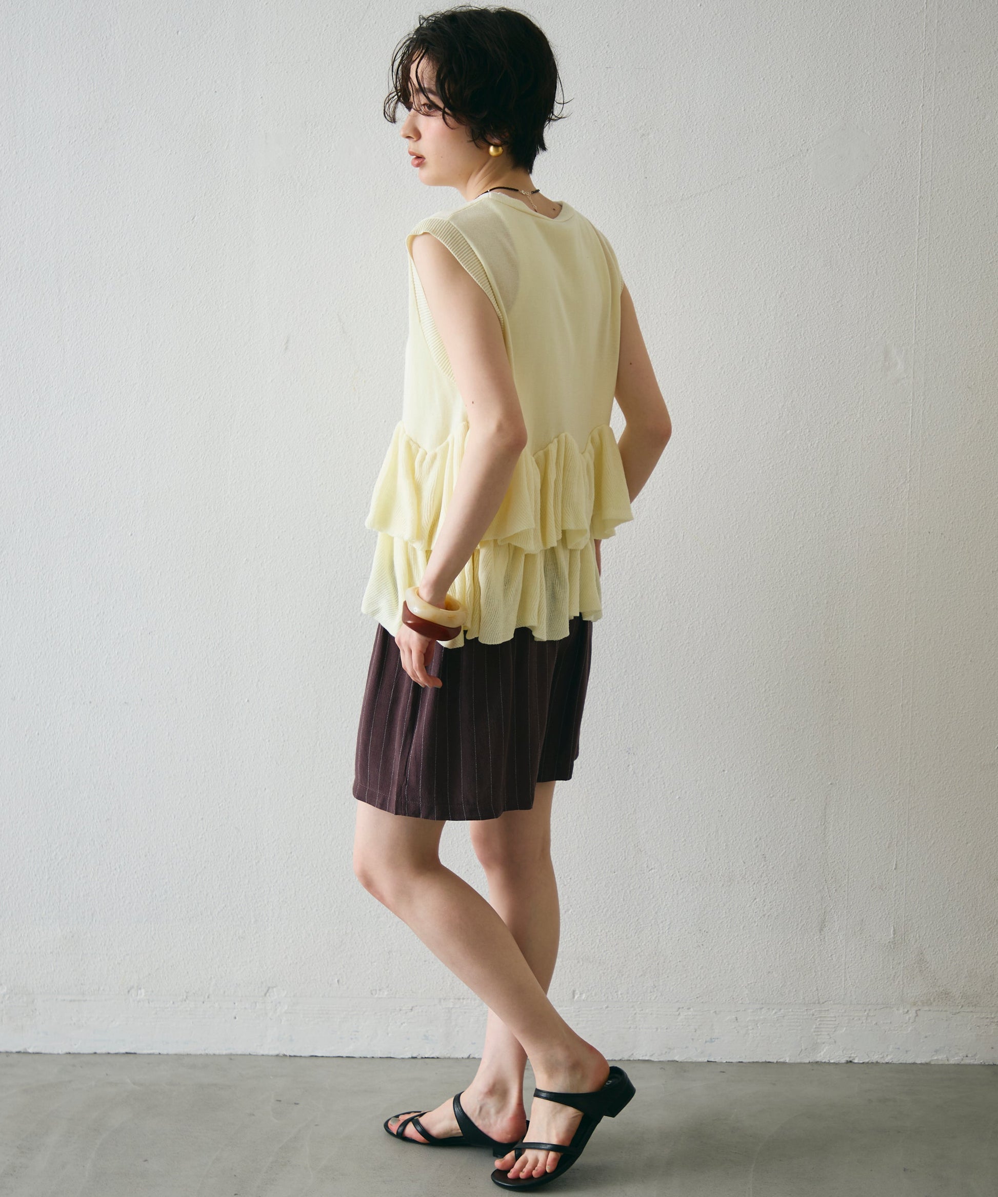 アシンメトリーにあしらったフリルが、上品な華やかさを添えるニットベスト。