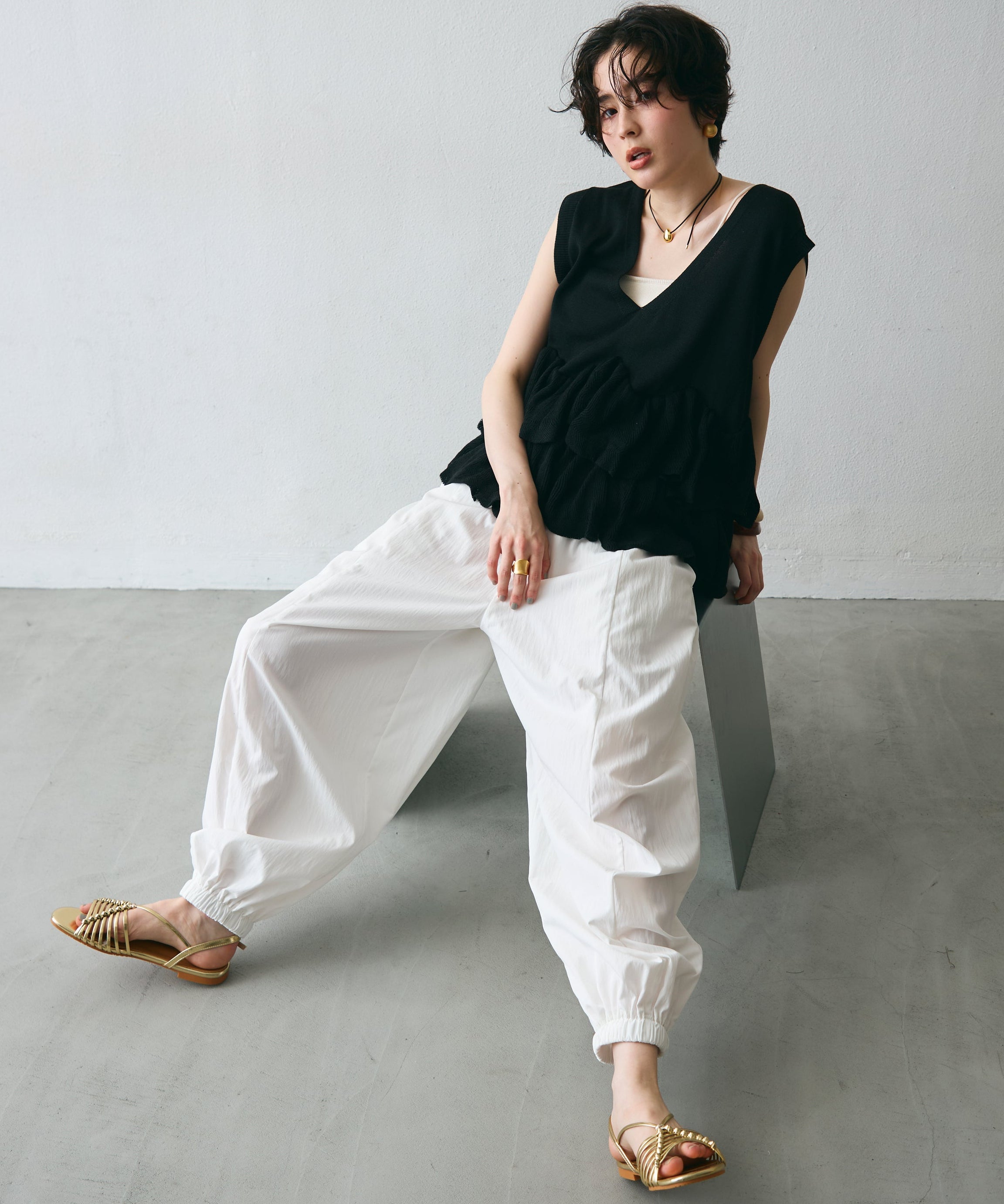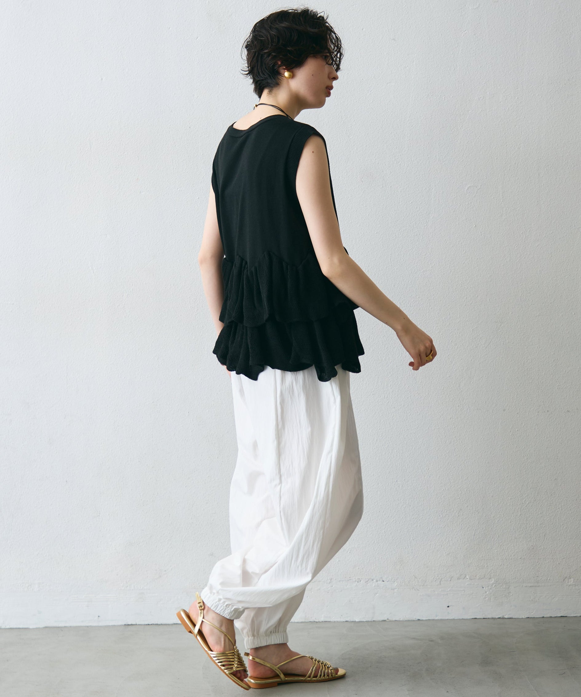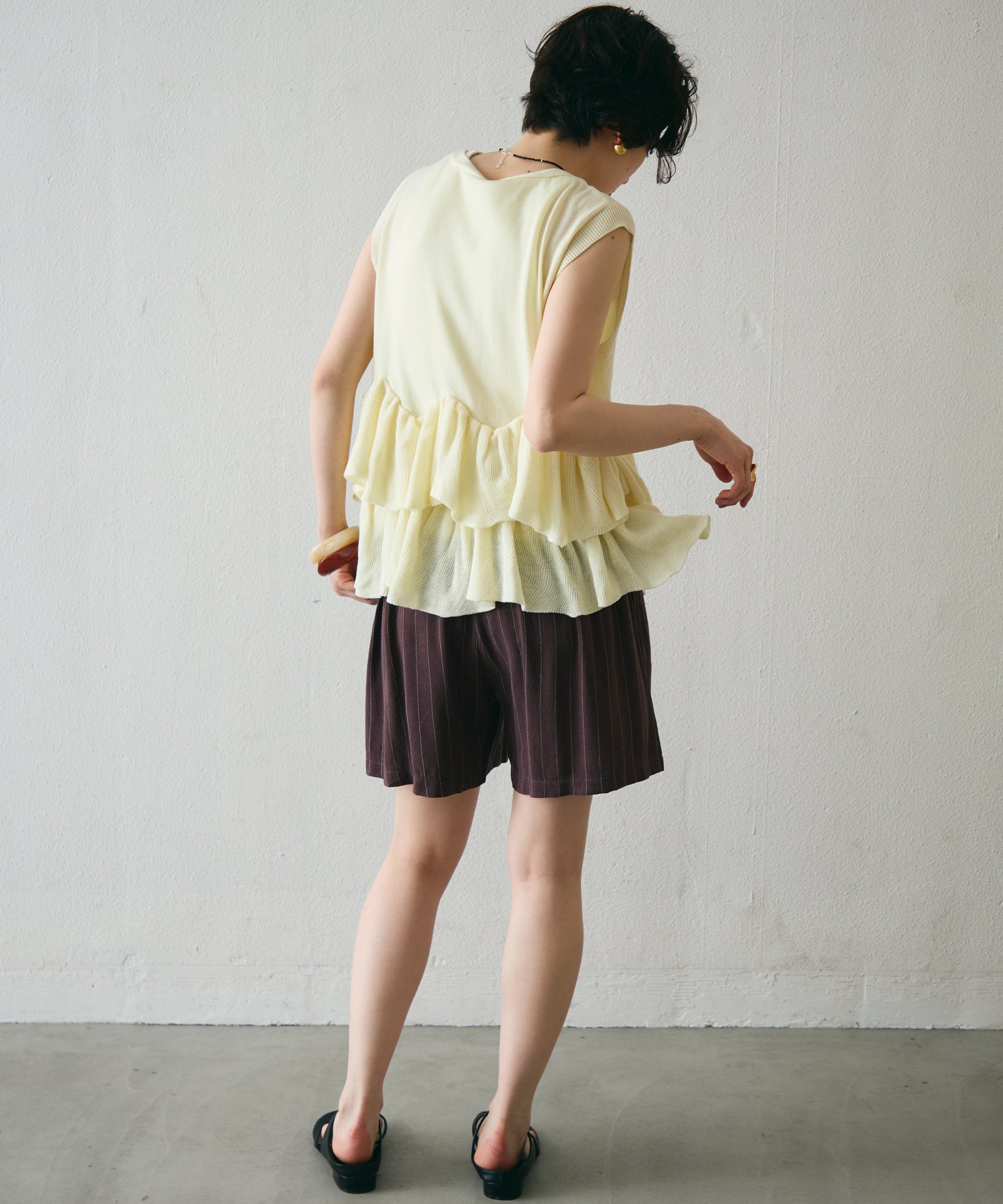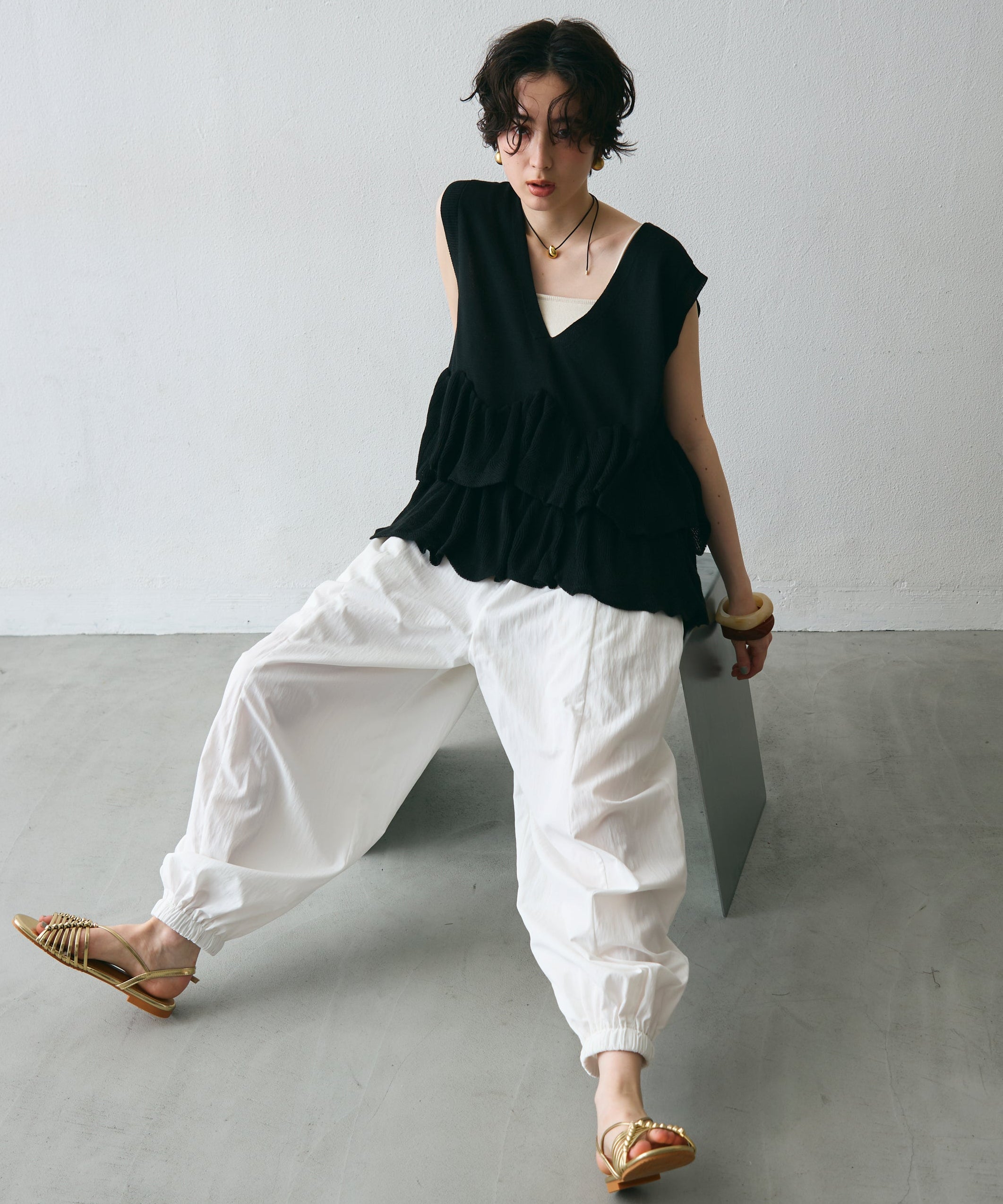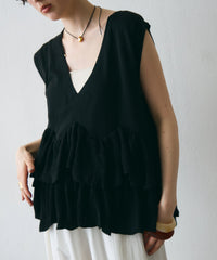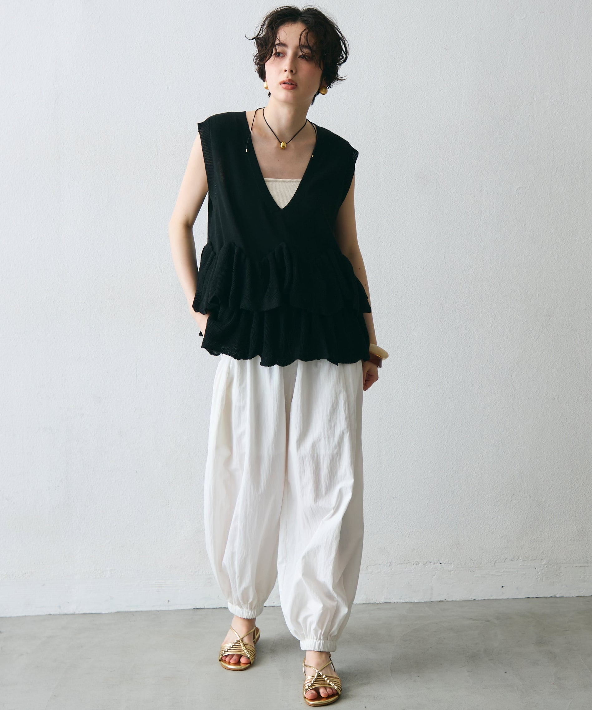 アシンメトリーにあしらったフリルが、上品な華やかさを添えるニットベスト。