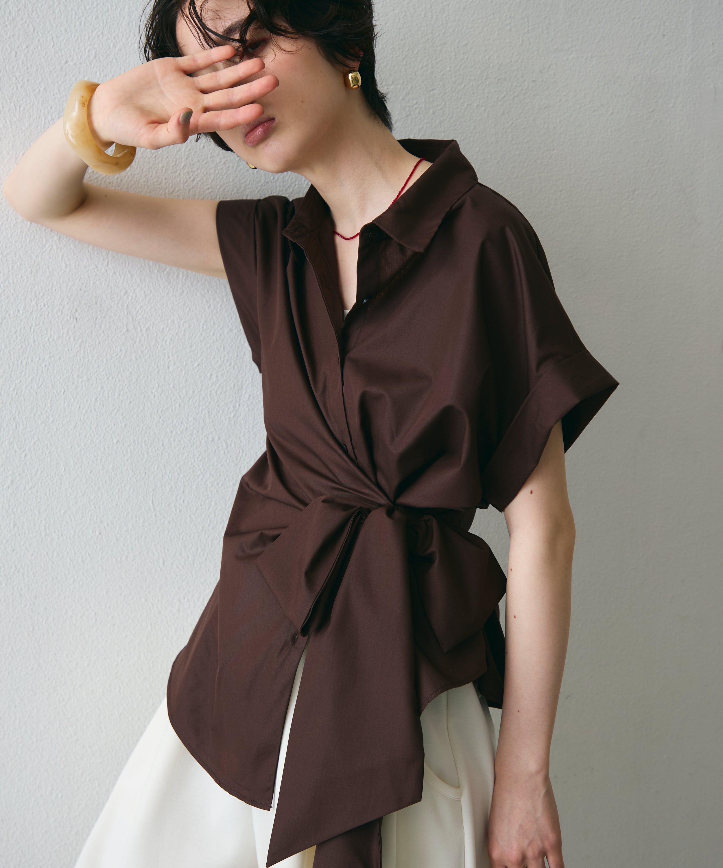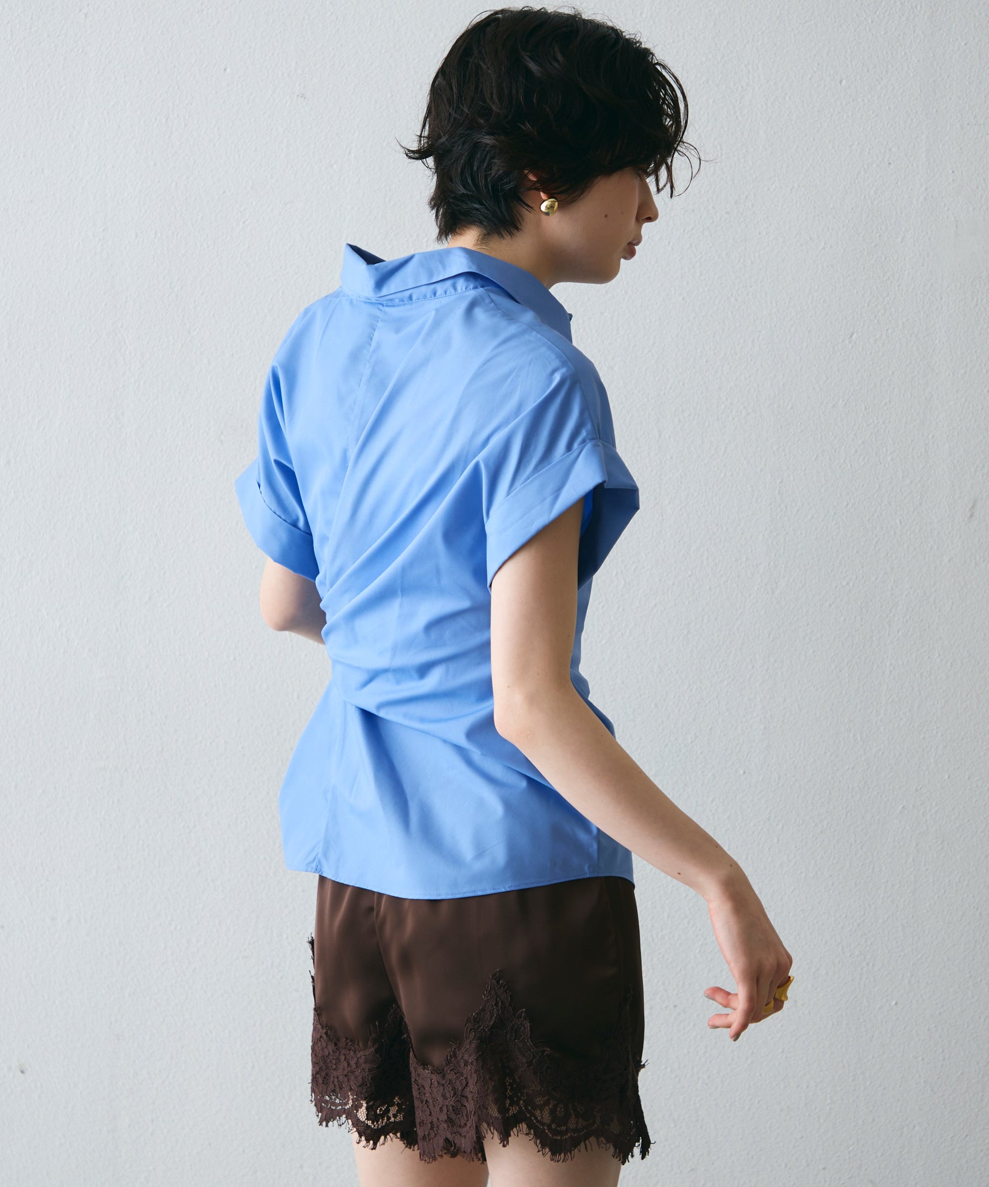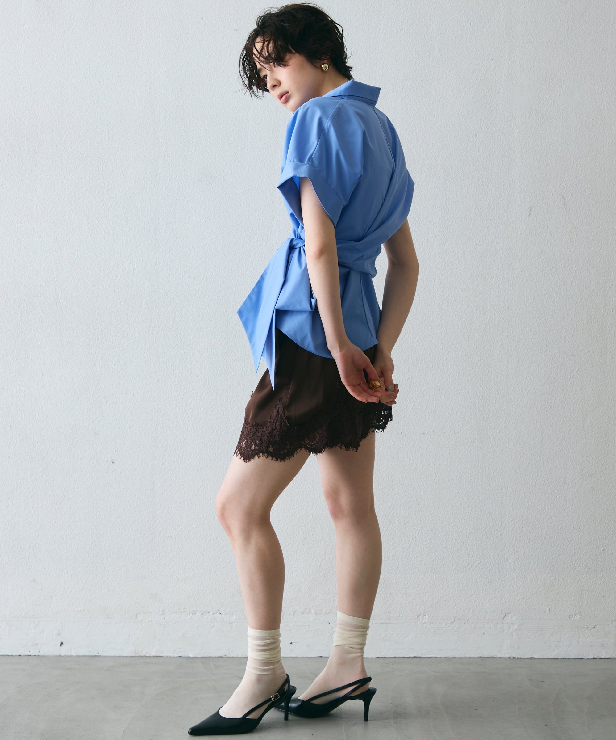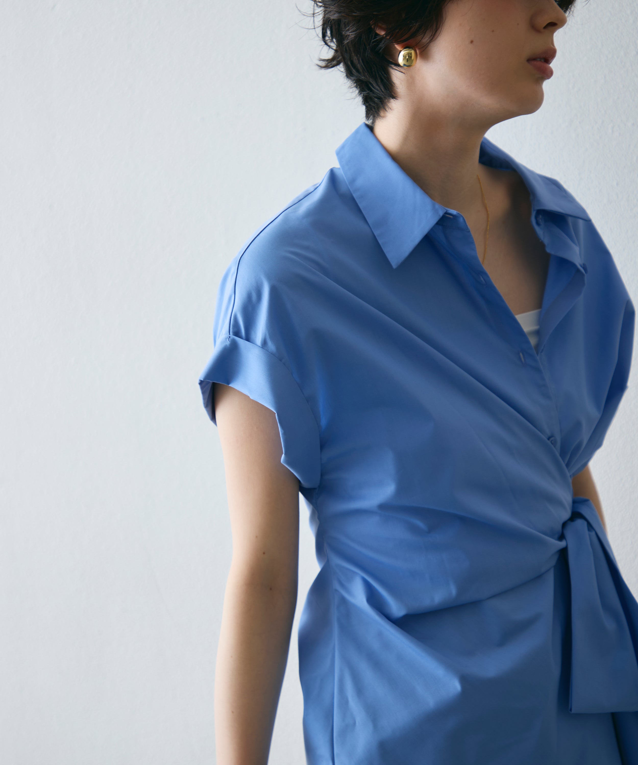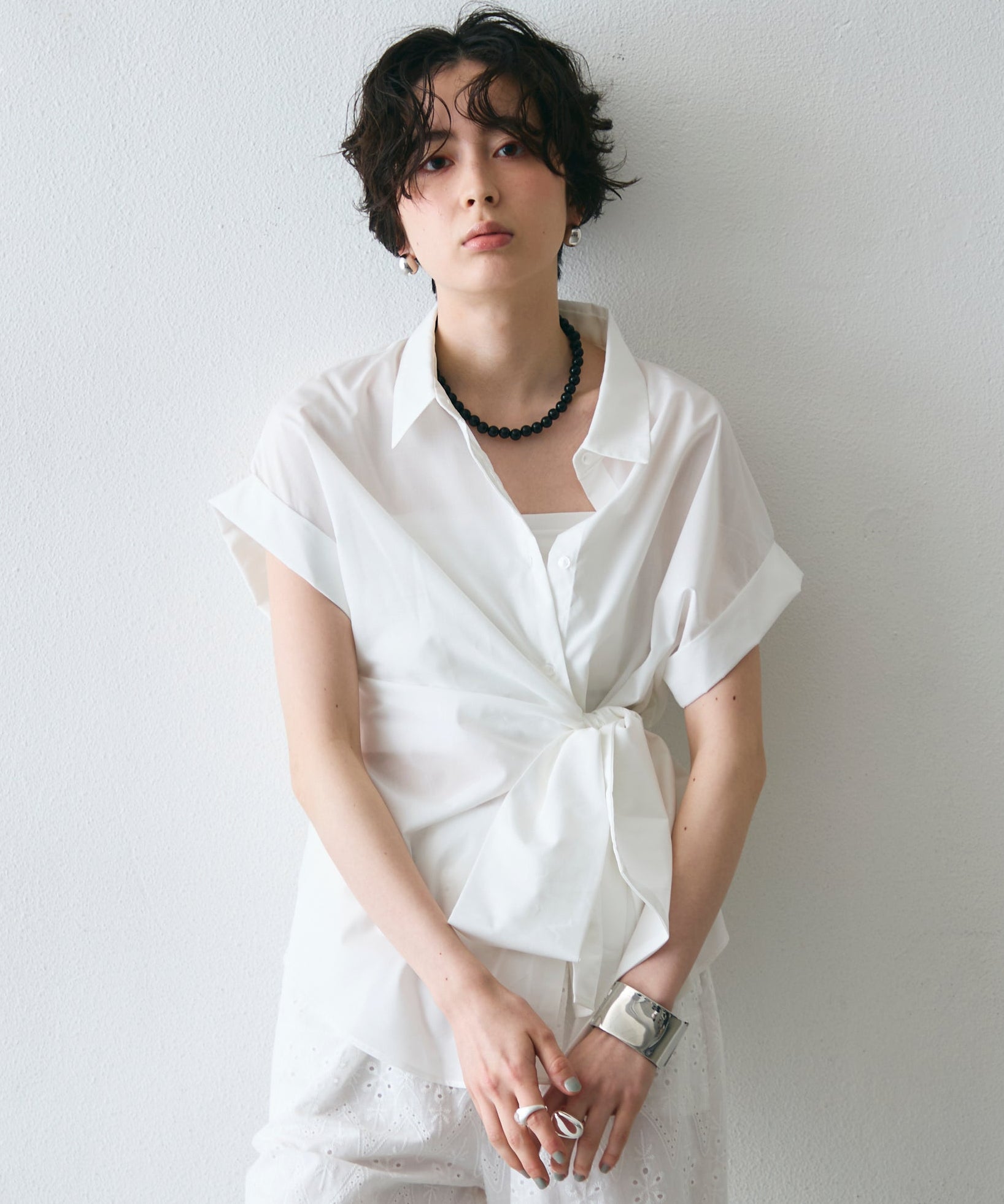 脇のリボンディテールがさりげないアクセントになるフレンチスリーブシャツ