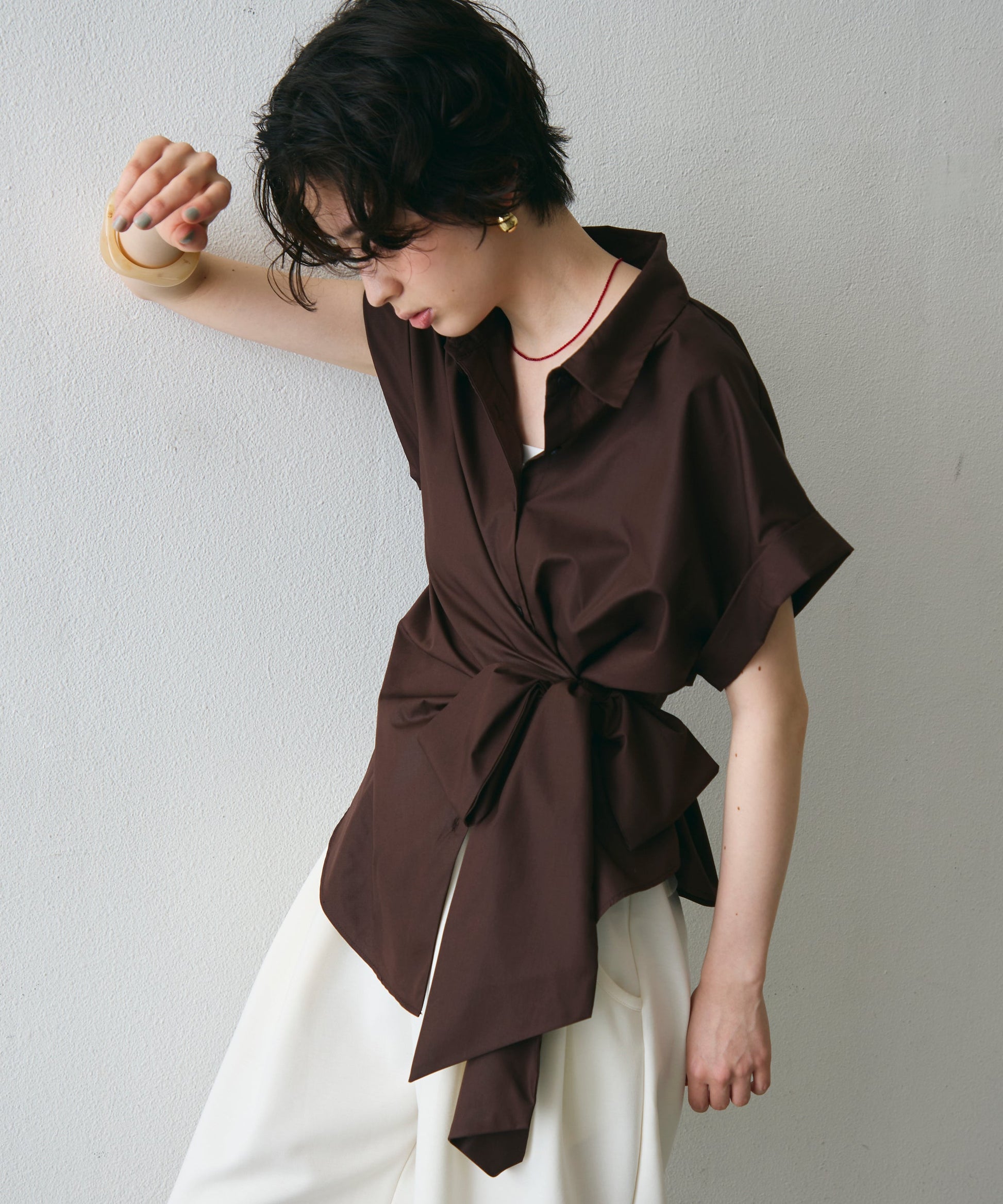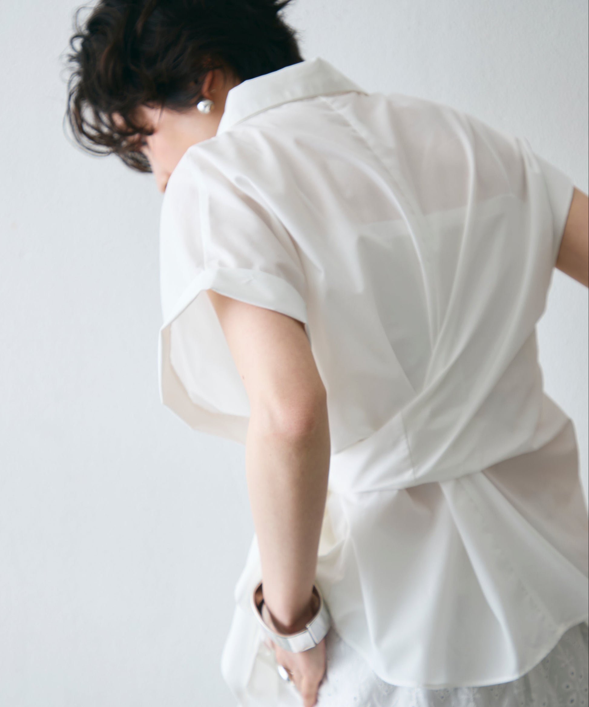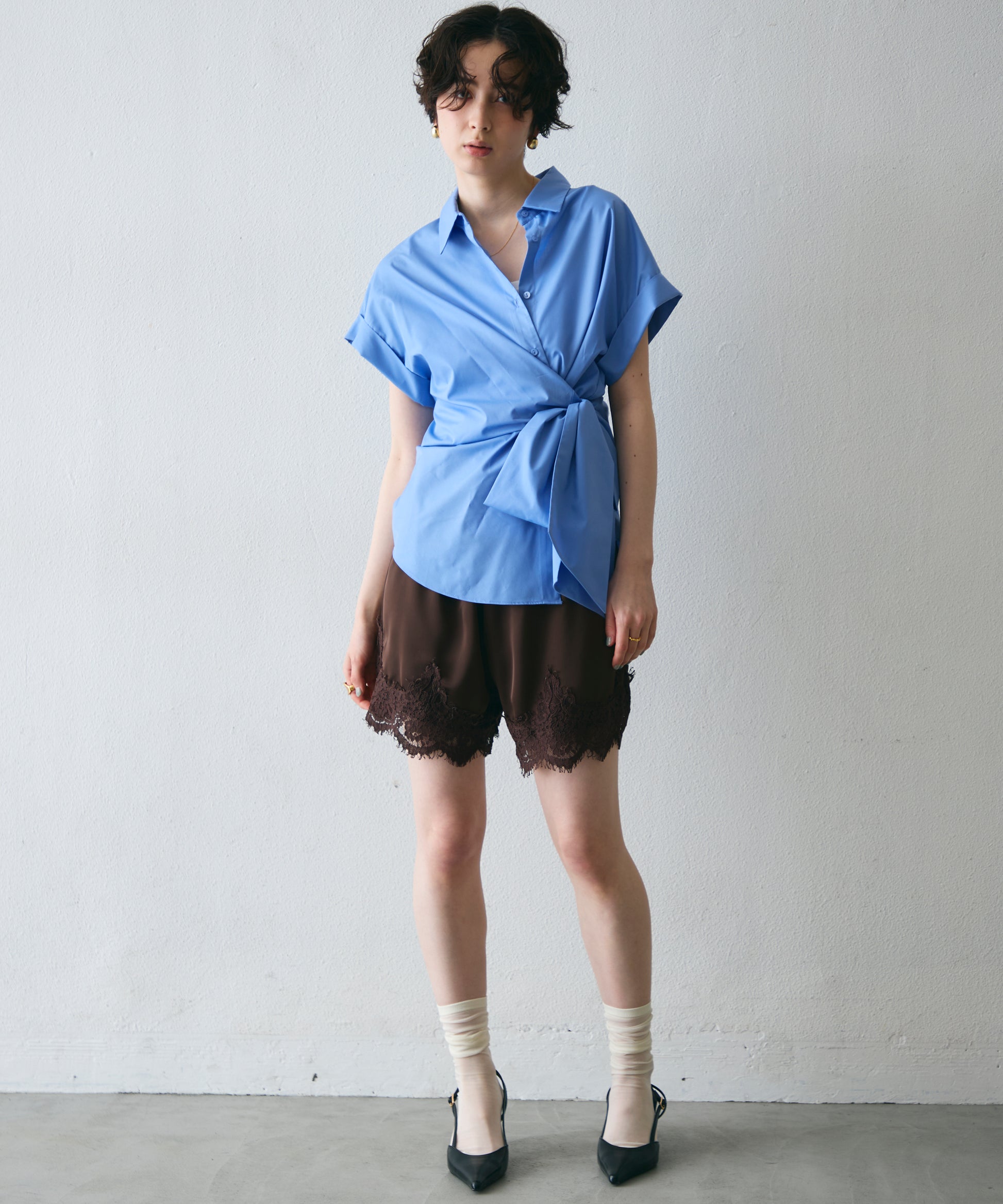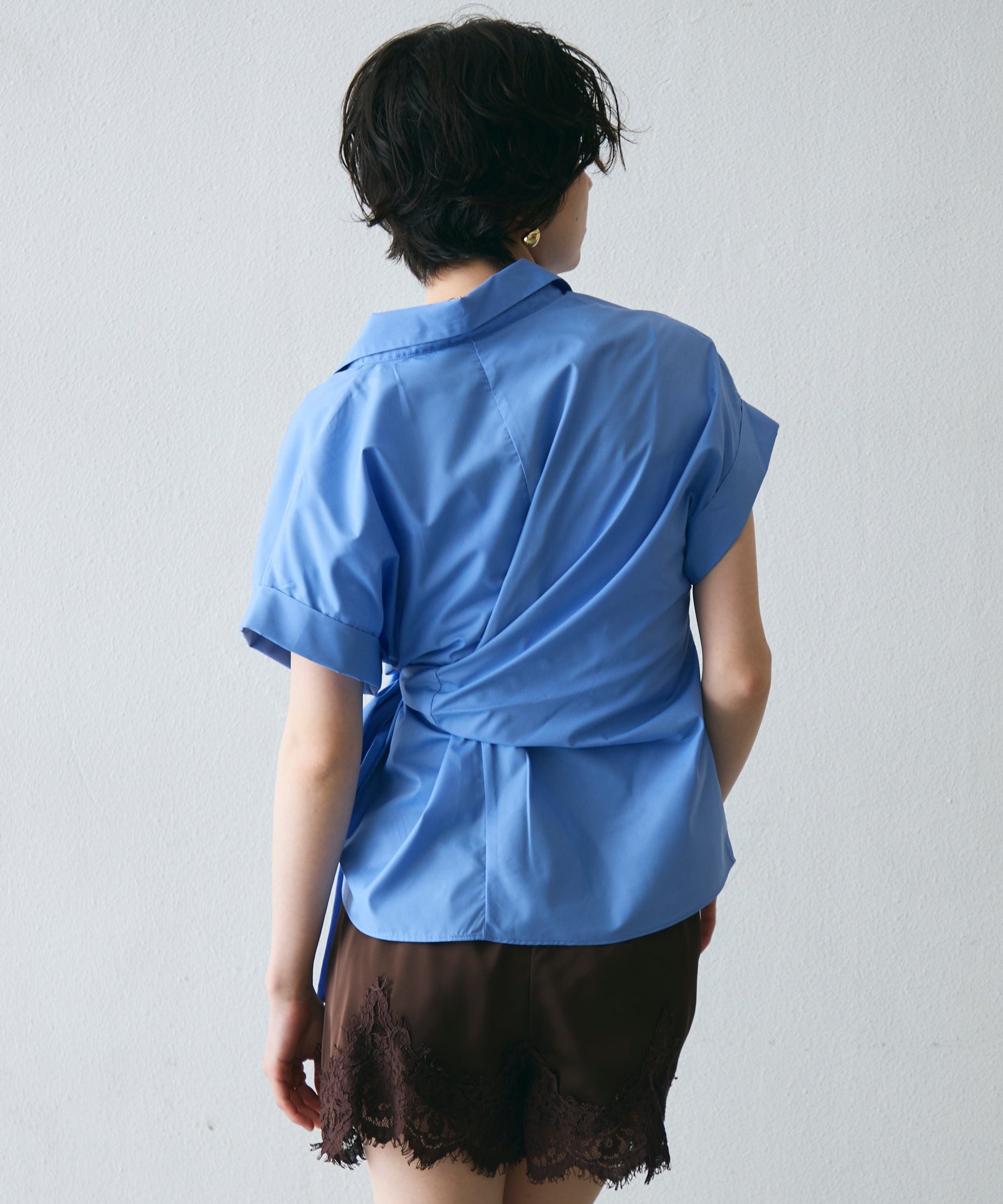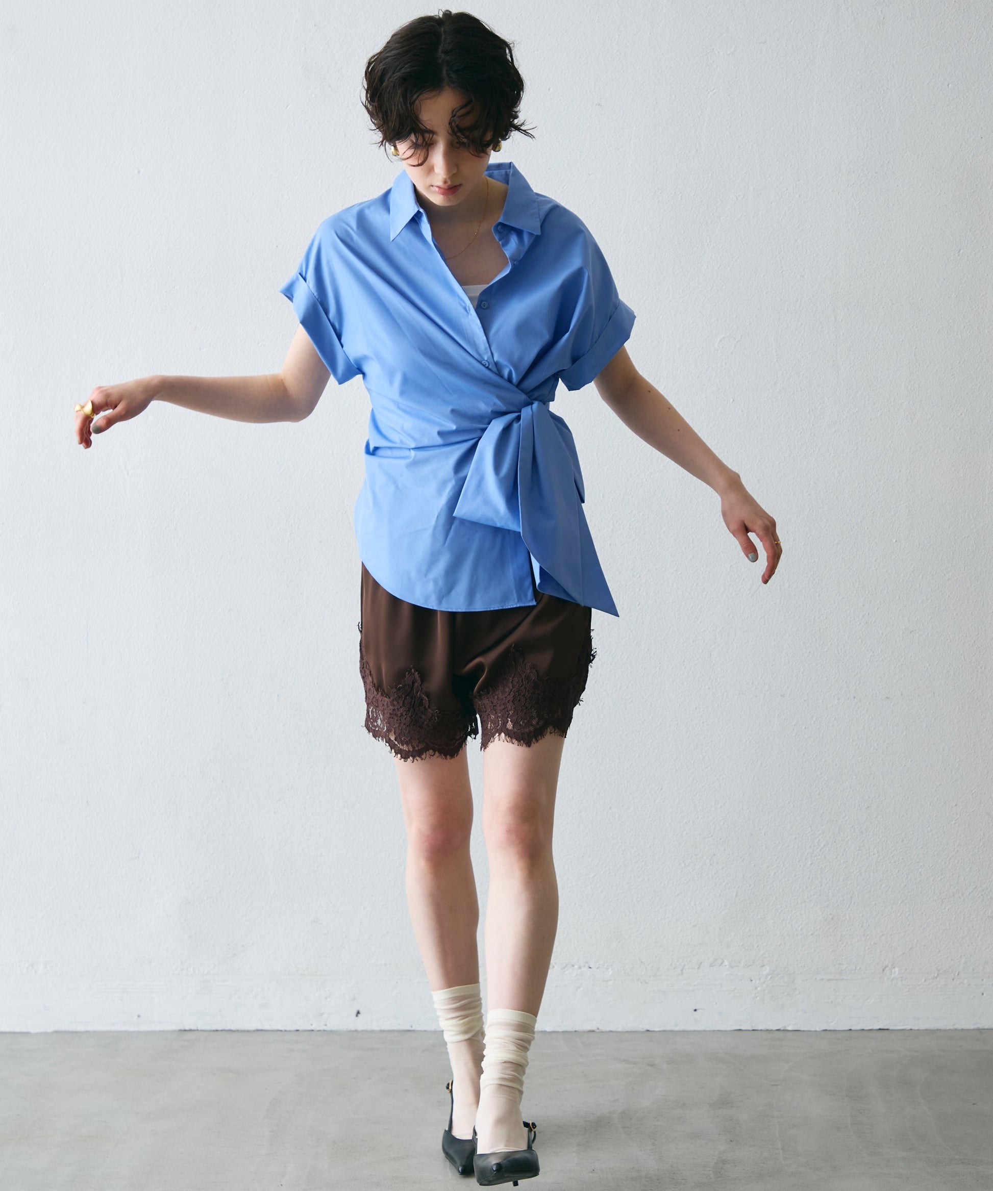 脇のリボンディテールがさりげないアクセントになるフレンチスリーブシャツ