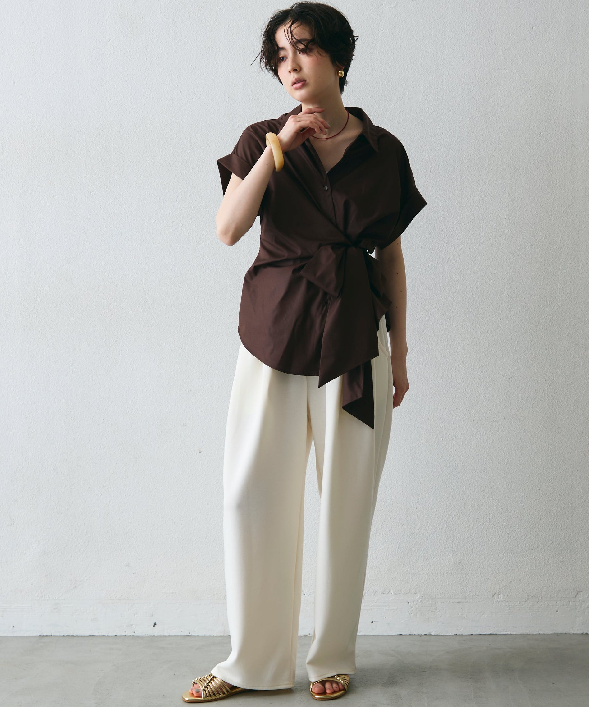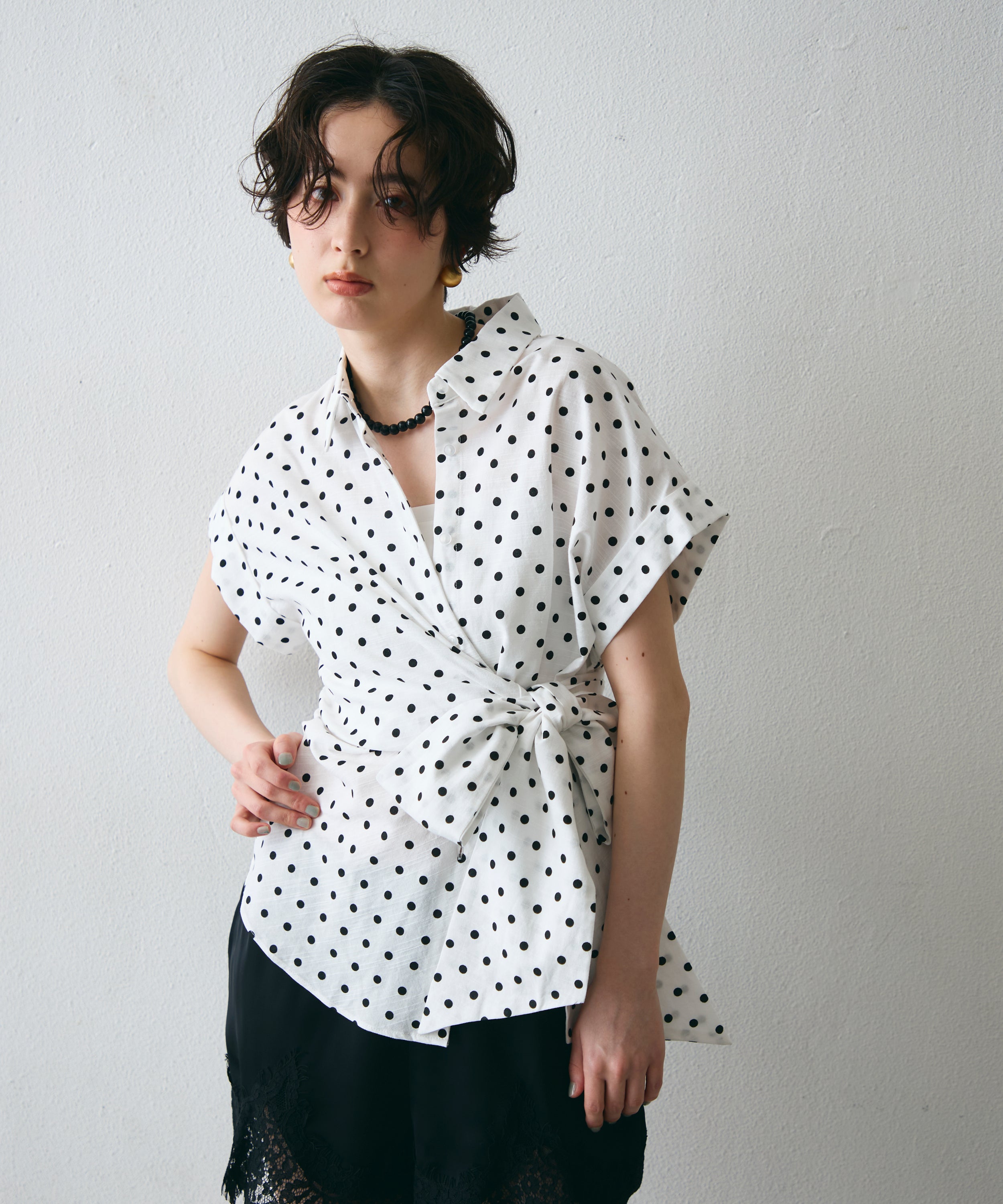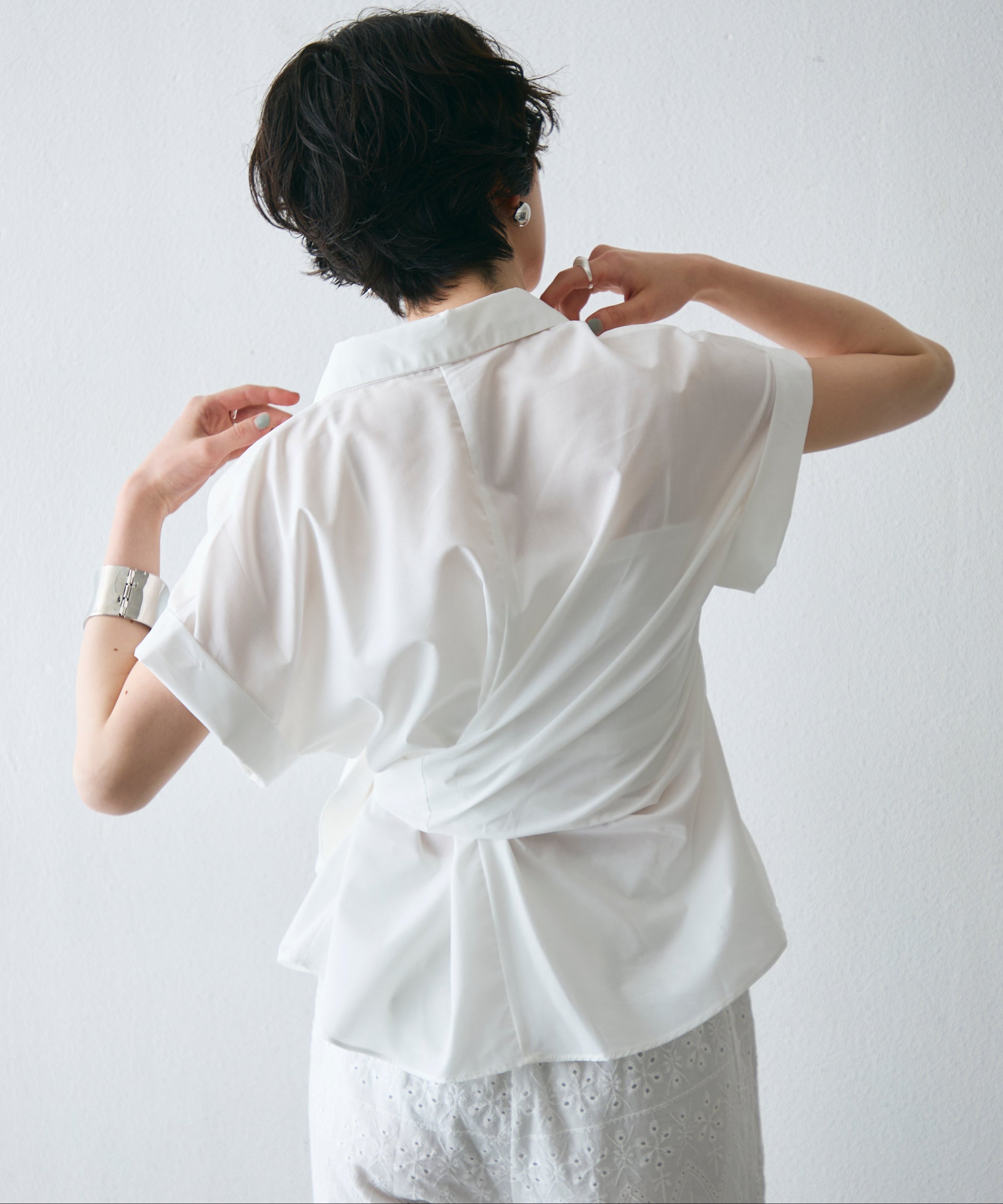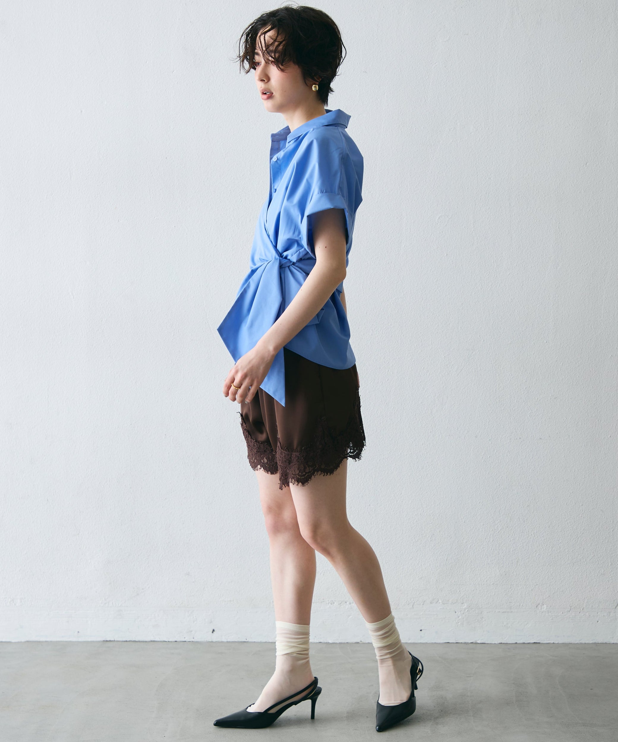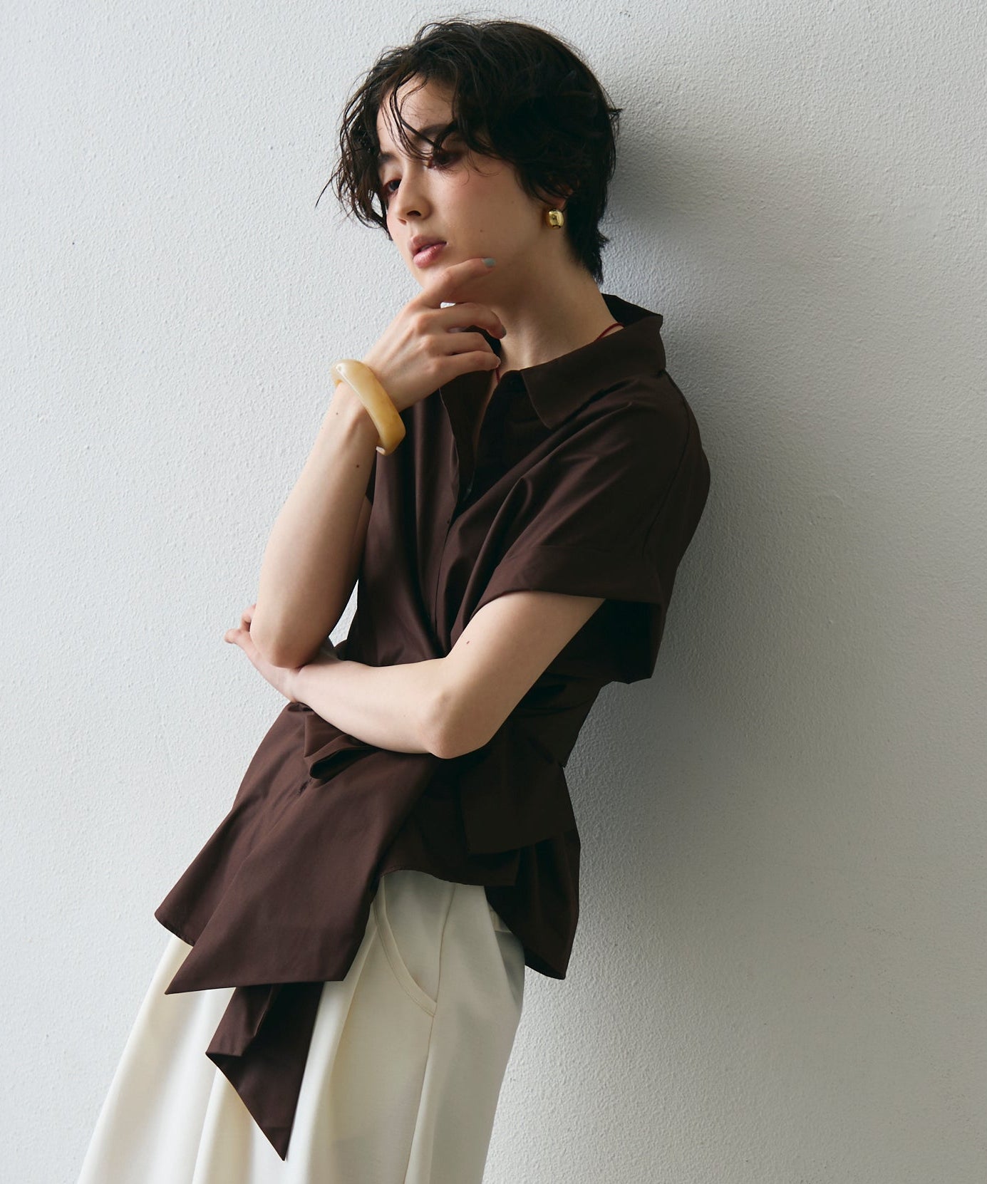 脇のリボンディテールがさりげないアクセントになるフレンチスリーブシャツ