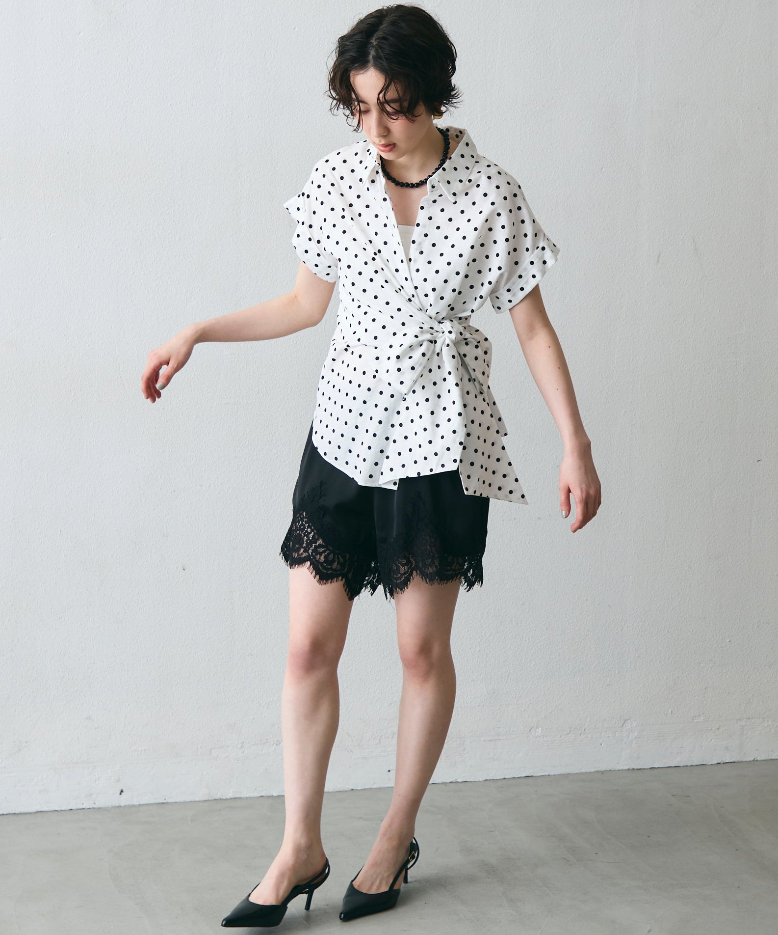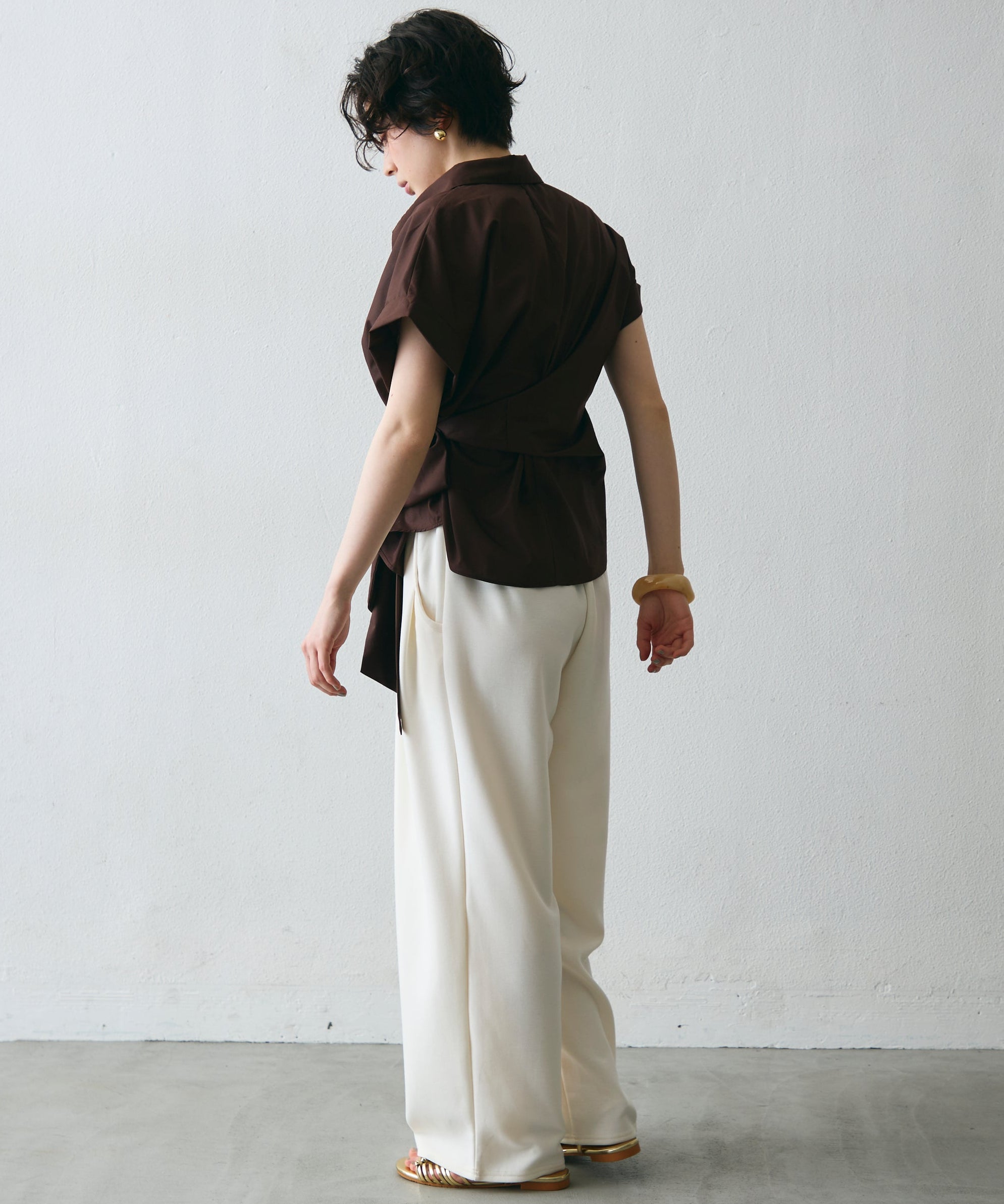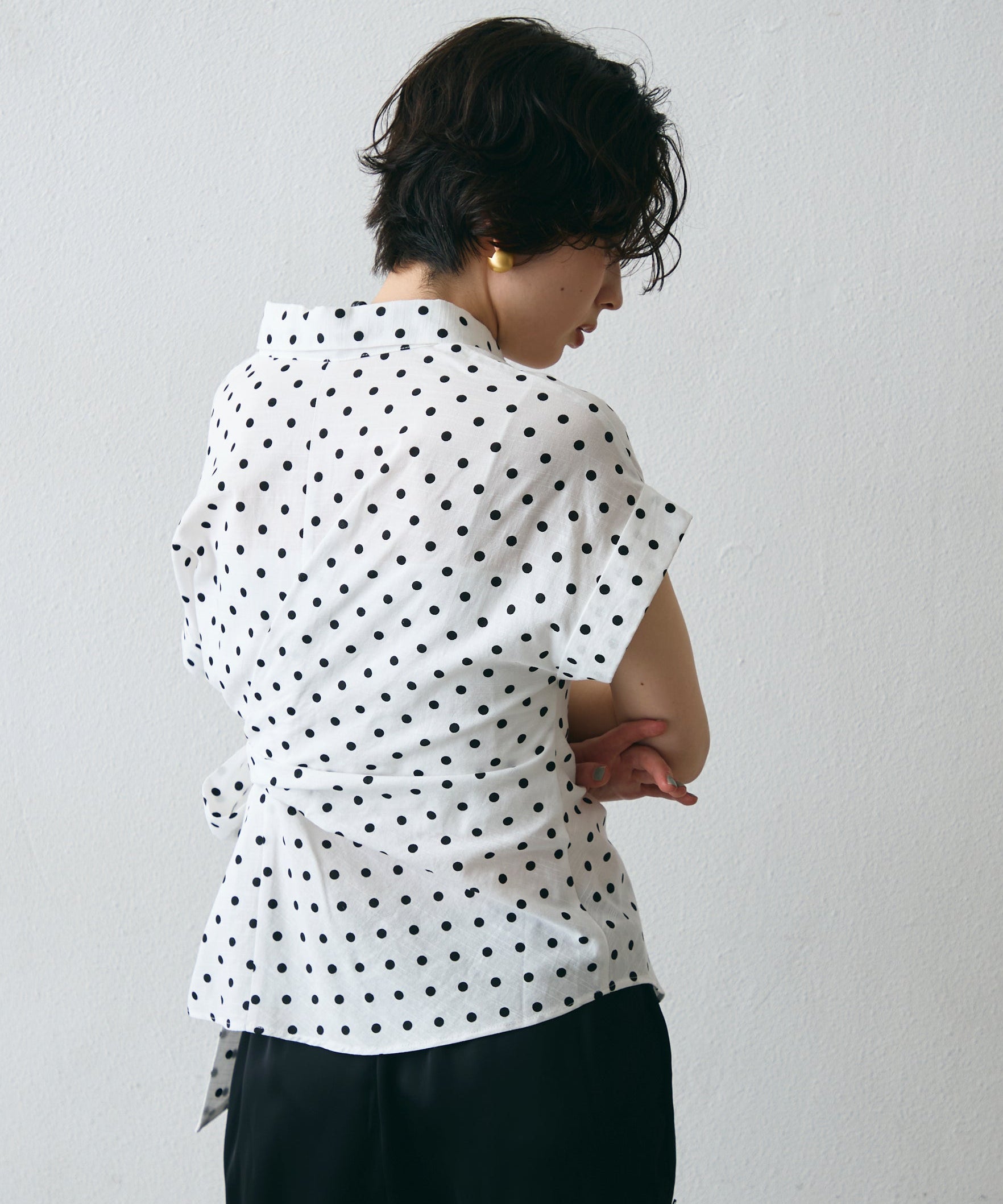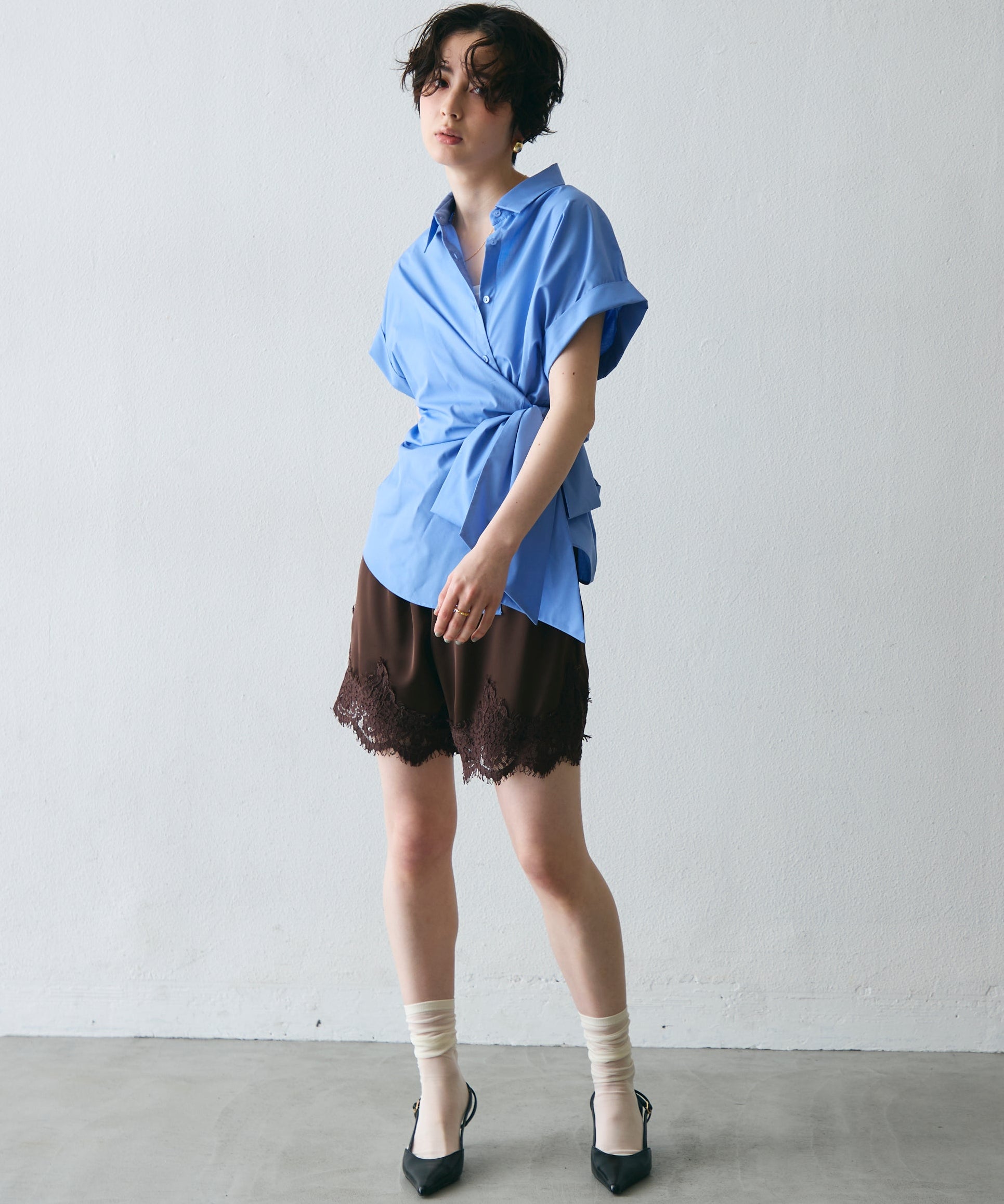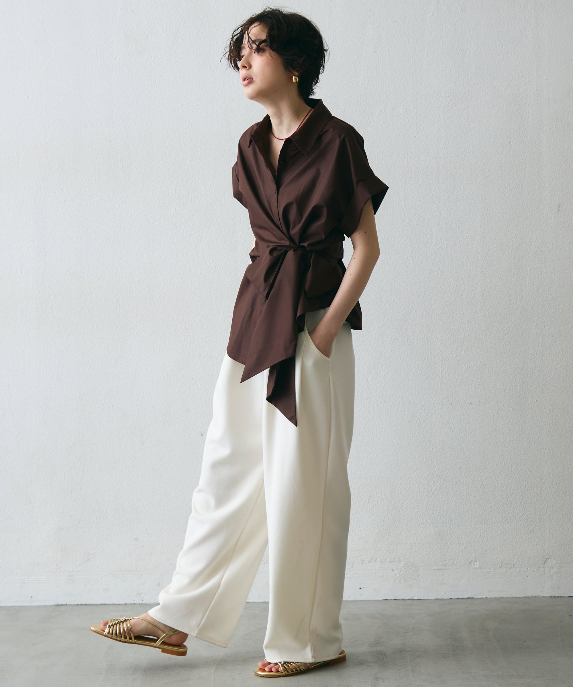 脇のリボンディテールがさりげないアクセントになるフレンチスリーブシャツ