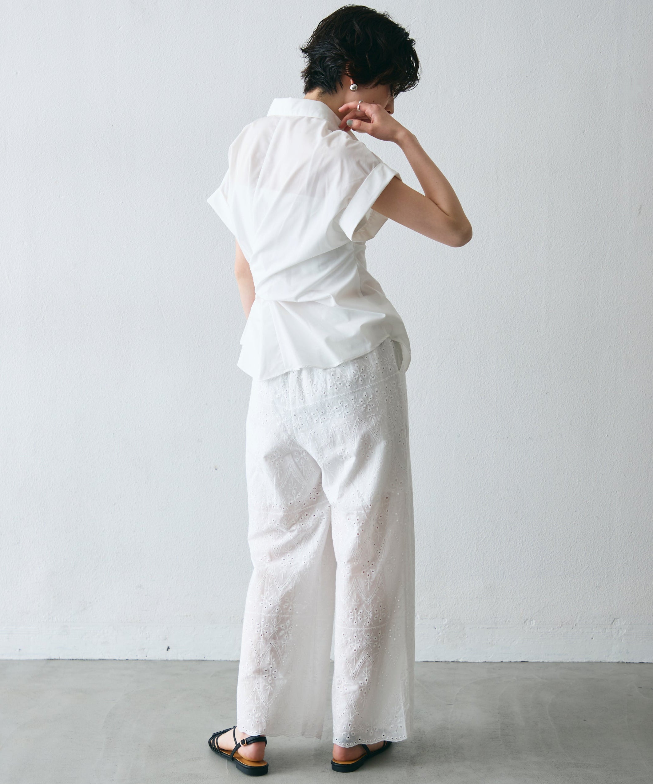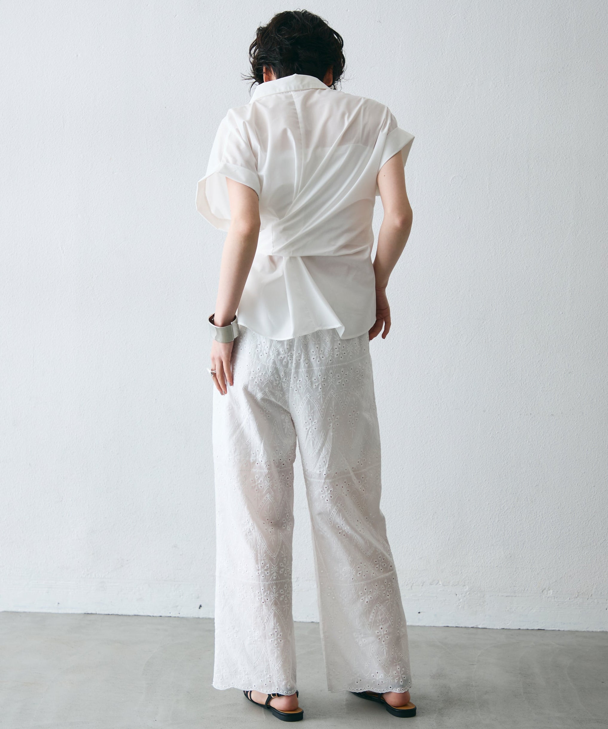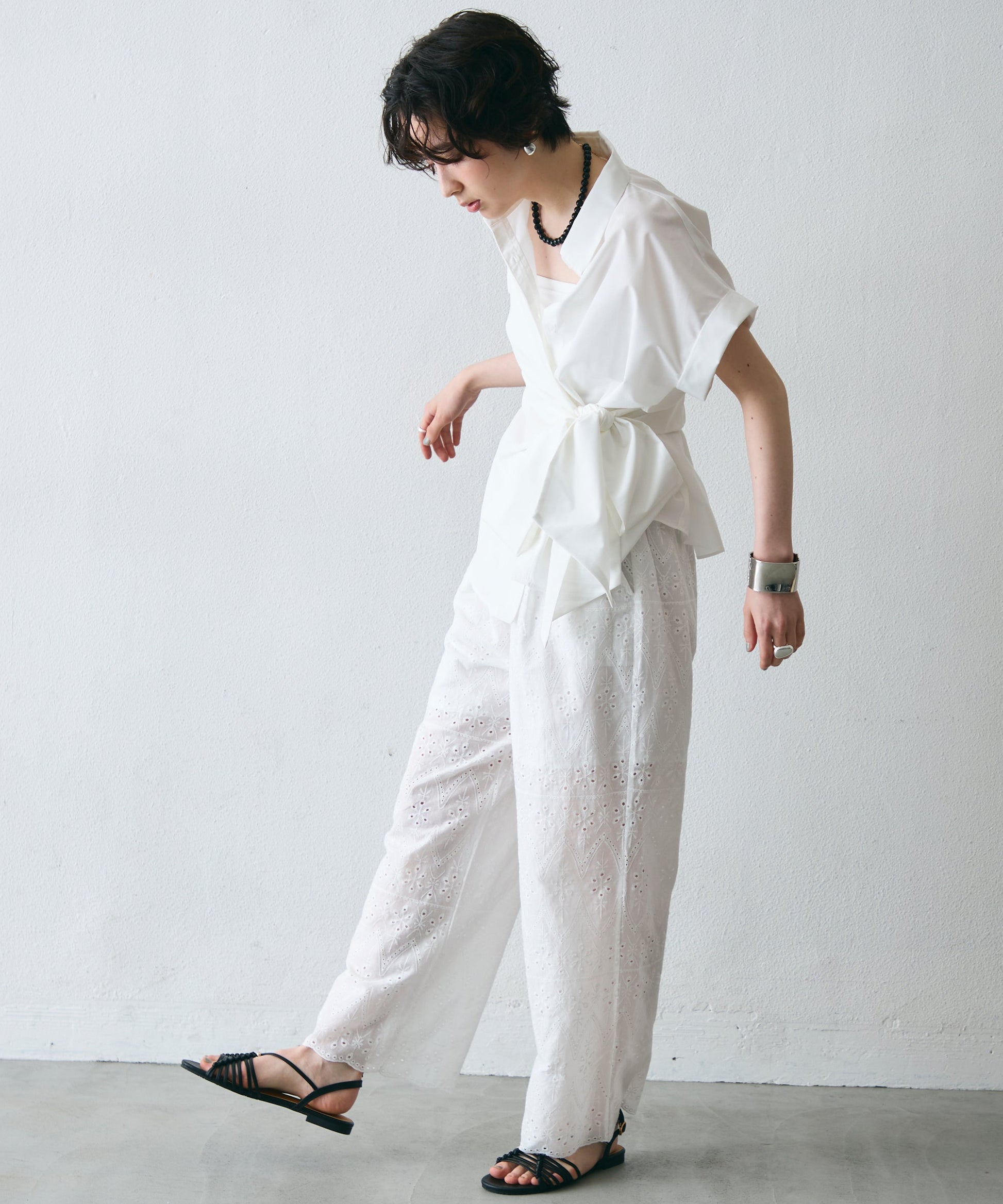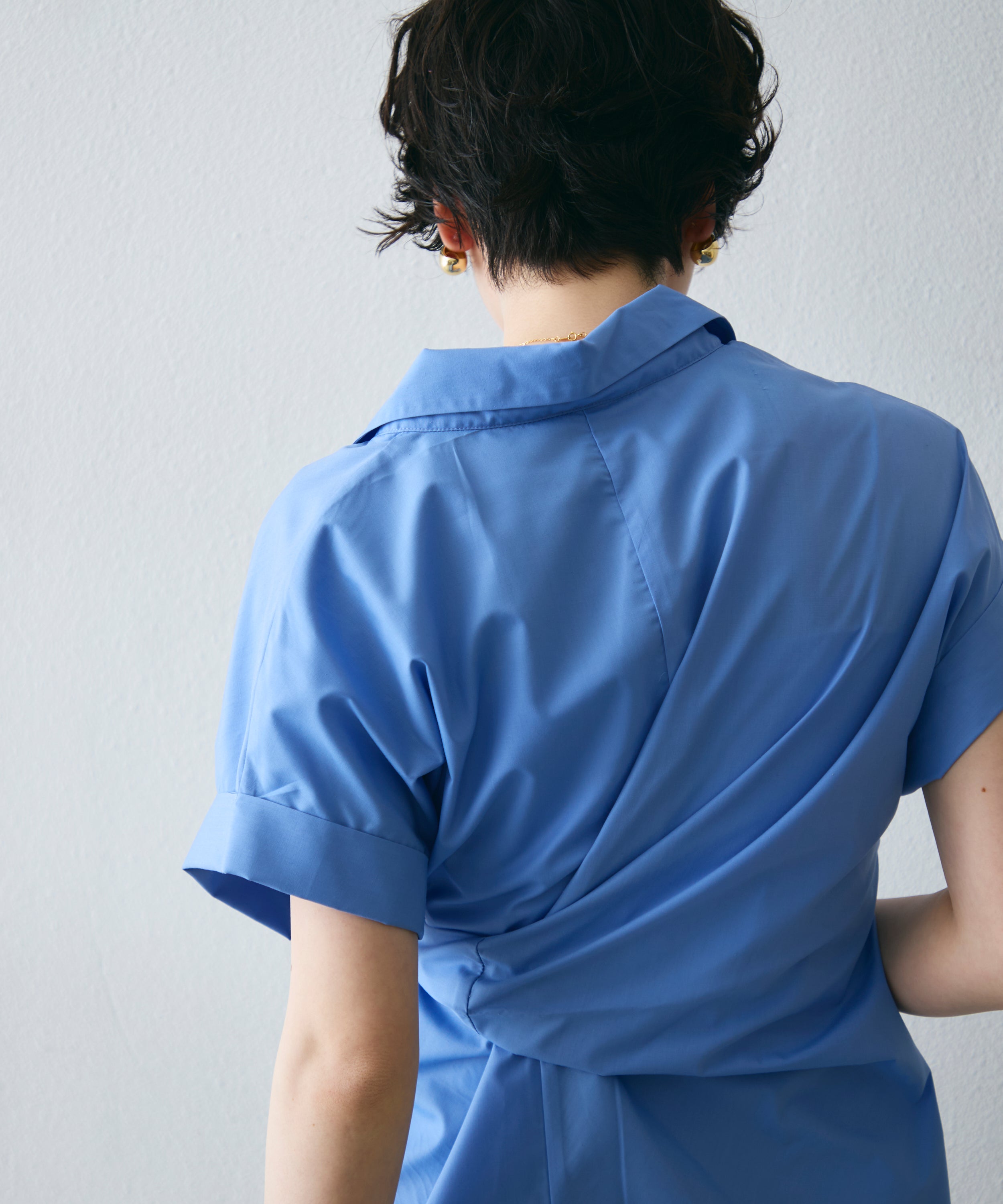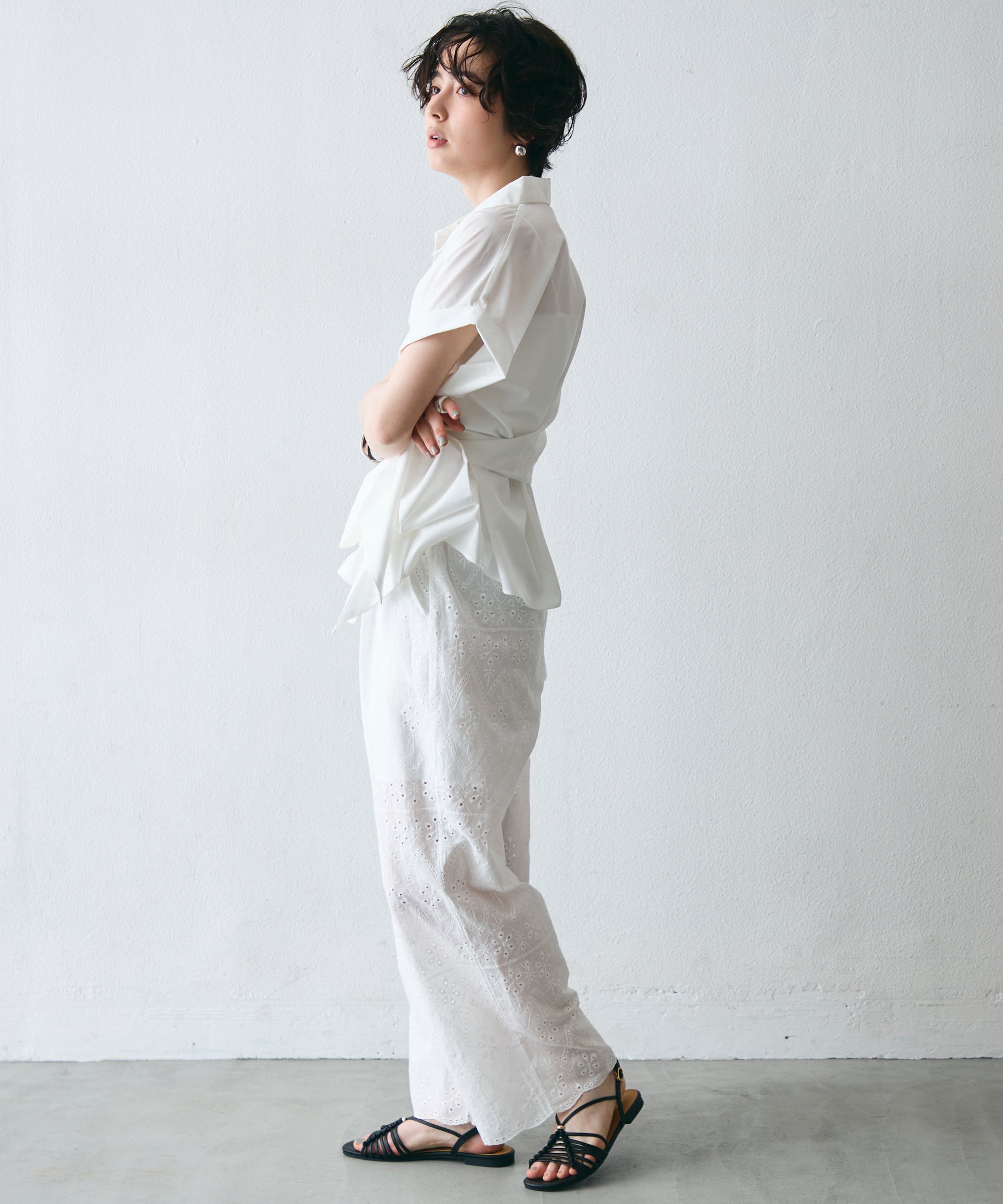 脇のリボンディテールがさりげないアクセントになるフレンチスリーブシャツ