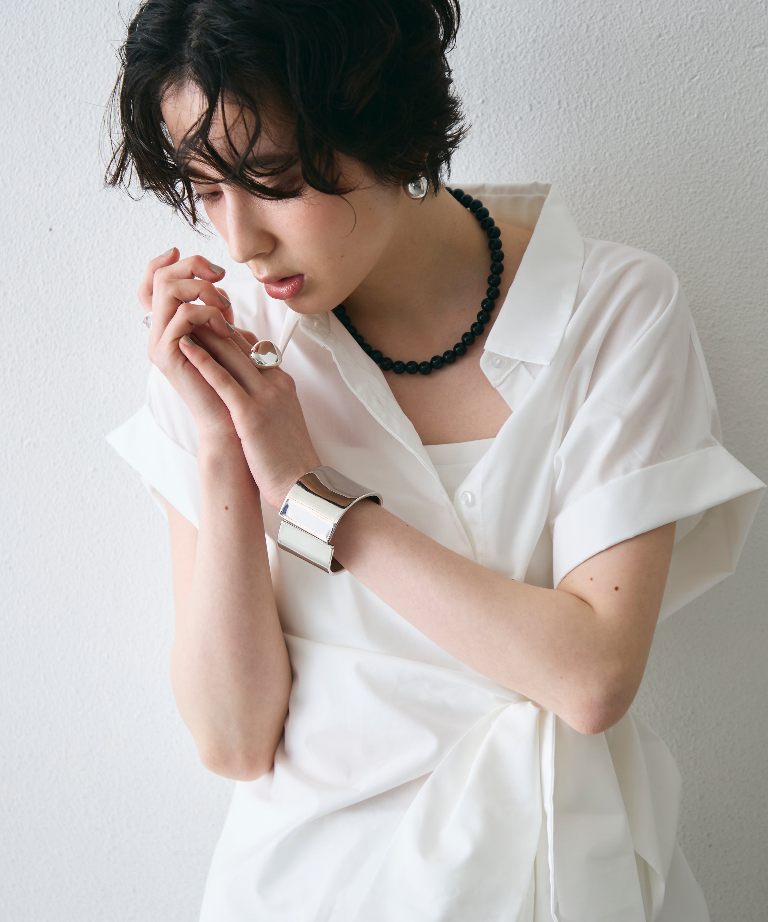 肩まわりをすっきり見せるシルエットで、1枚で上品なスタイルが完成。